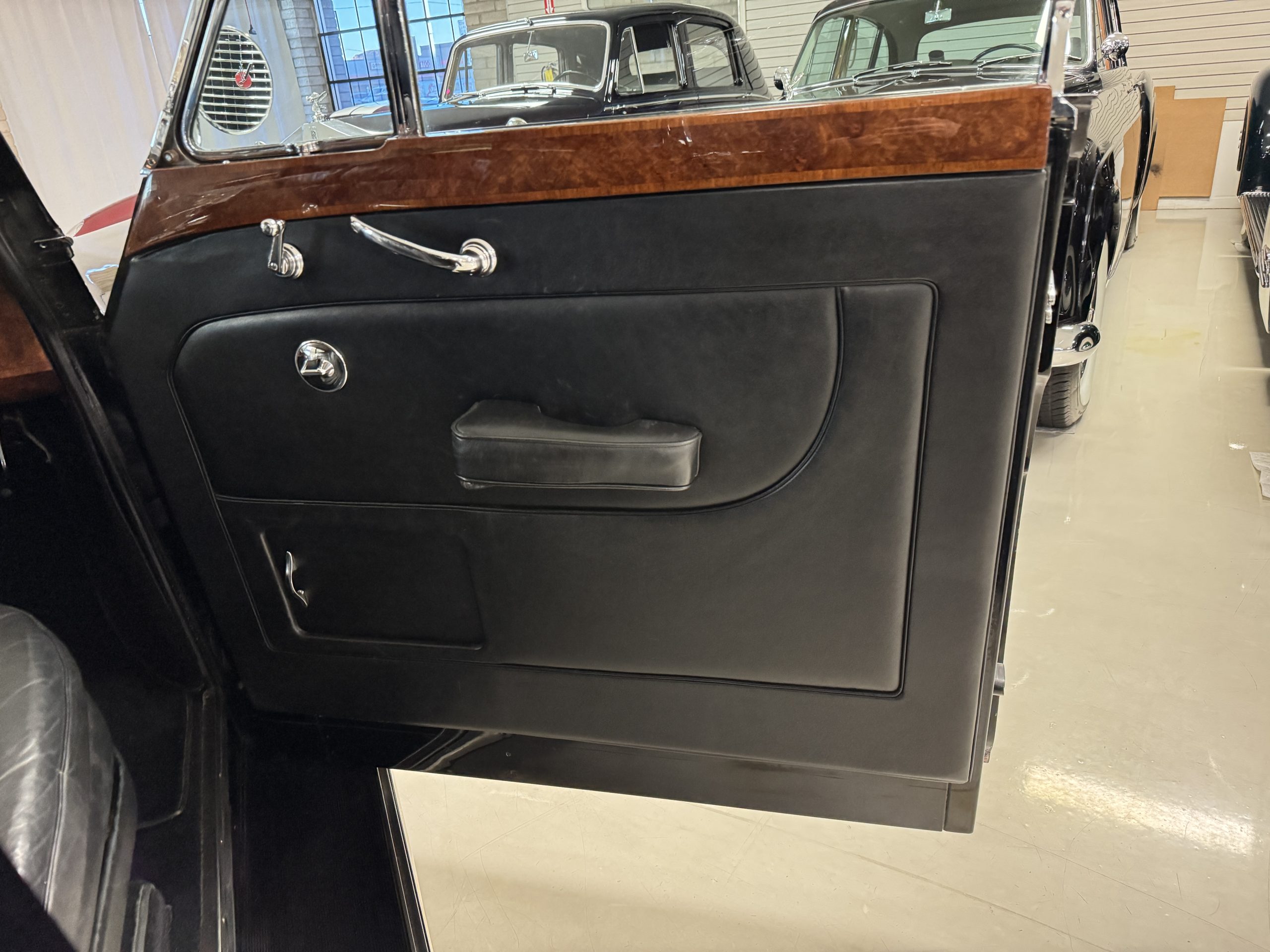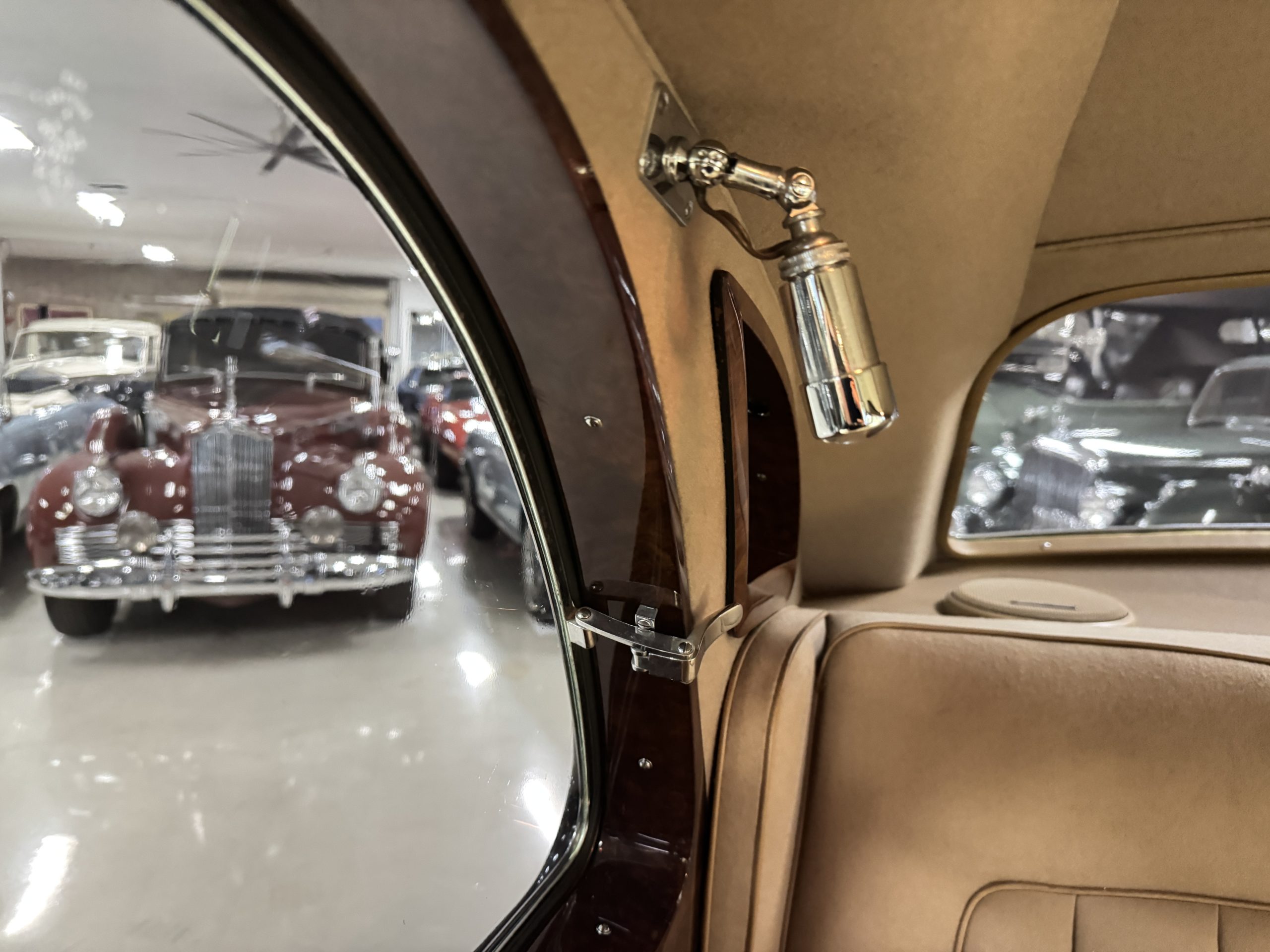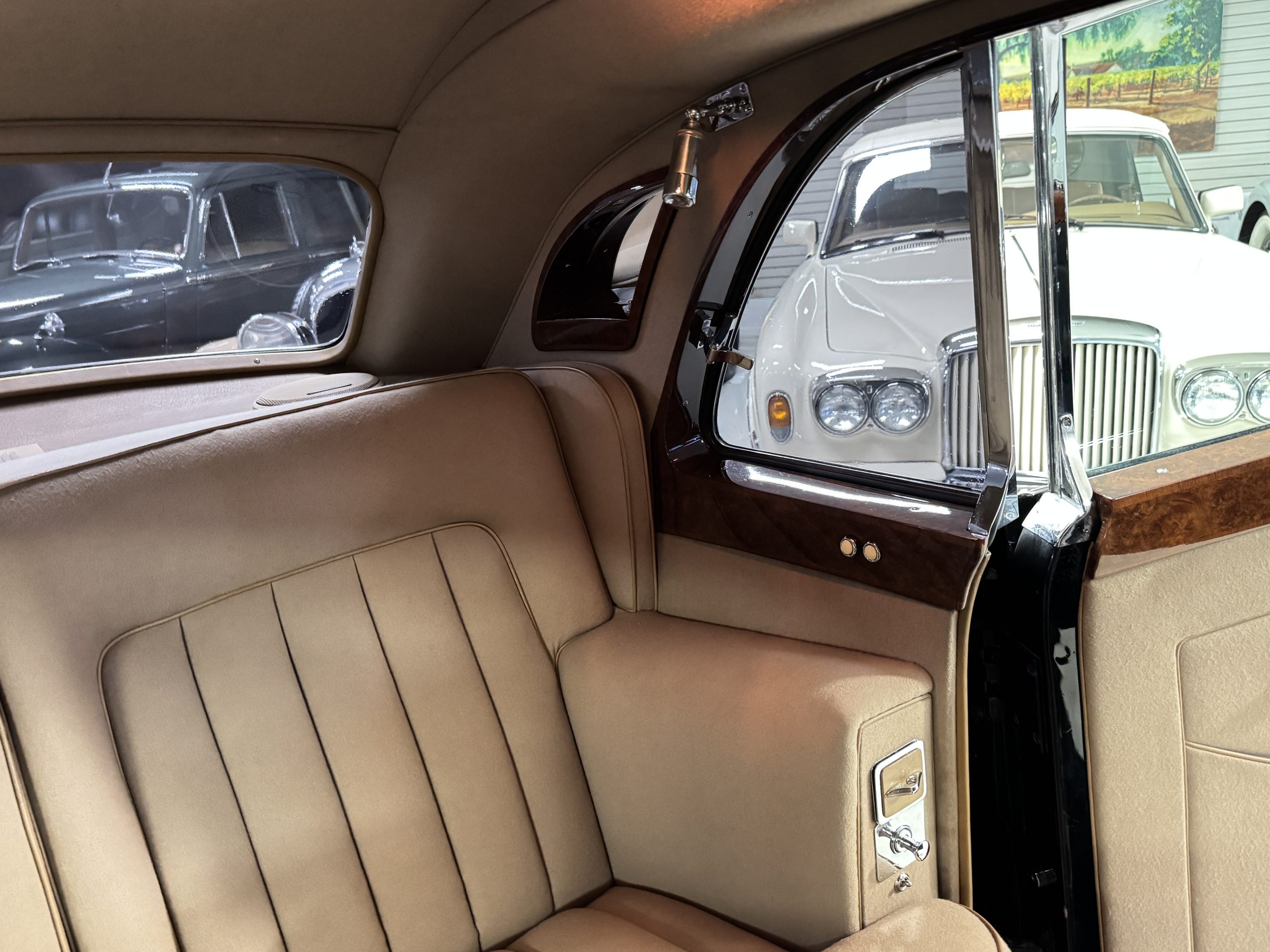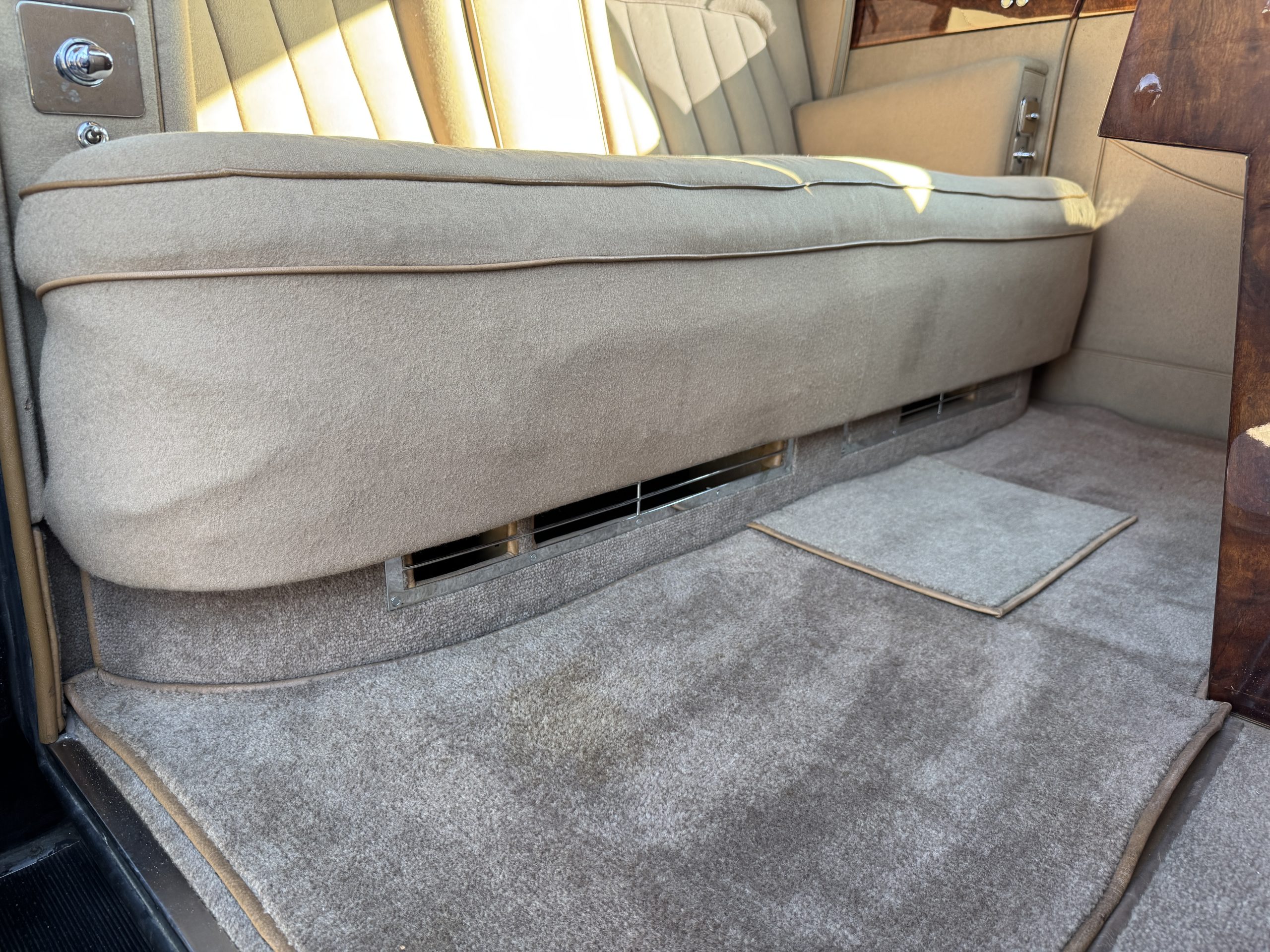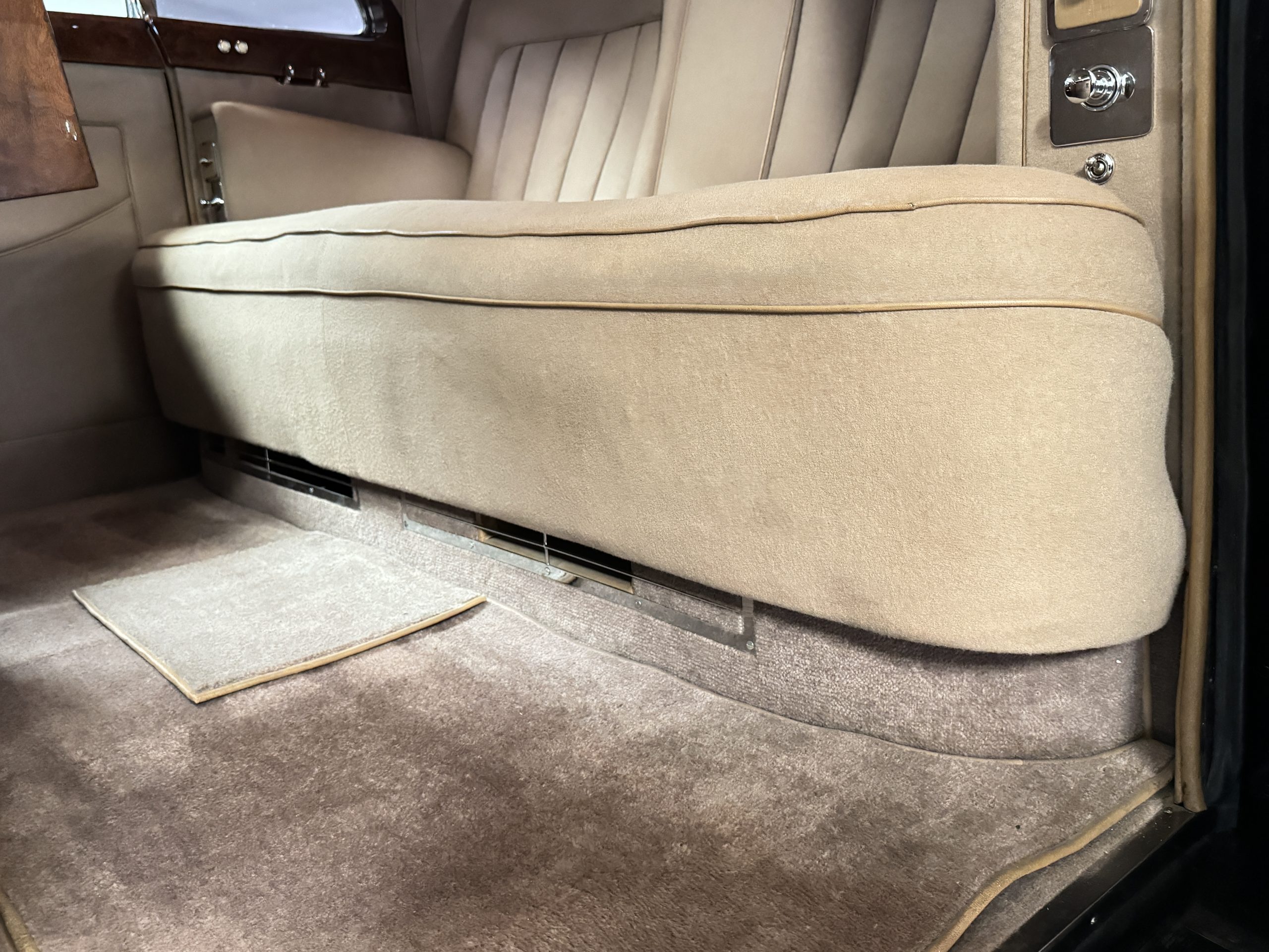 The interior is in overall beautiful condition.  All of the burl walnut trim has been painstakingly restored to showroom condition.  The chauffer’s compartment is finished in Black leather that is very soft and supple with normal creases with age.   The stereo has been updated with a more modern system.  The rear passenger compartment is all original tan wool broadcloth with complementary tan leather piping.  The upholstery is in excellent original condition with no soiling. The tan Wilton wool carpeting is also in very nice condition.  The center mirrored cocktail cabinet contains an original crystal decanter and two crystal glasses.  Above the cocktail cabinet is a separate compartment holding the Television.  Twin reading lamps, twin vanities and a Seth clock complete the amenities.  James Young coachbuilt Rolls-Royces always exhibit the most extraordinary book matched burlwood finishes.  This example, being built for their Earls Court exhibition, is just gorgeous.