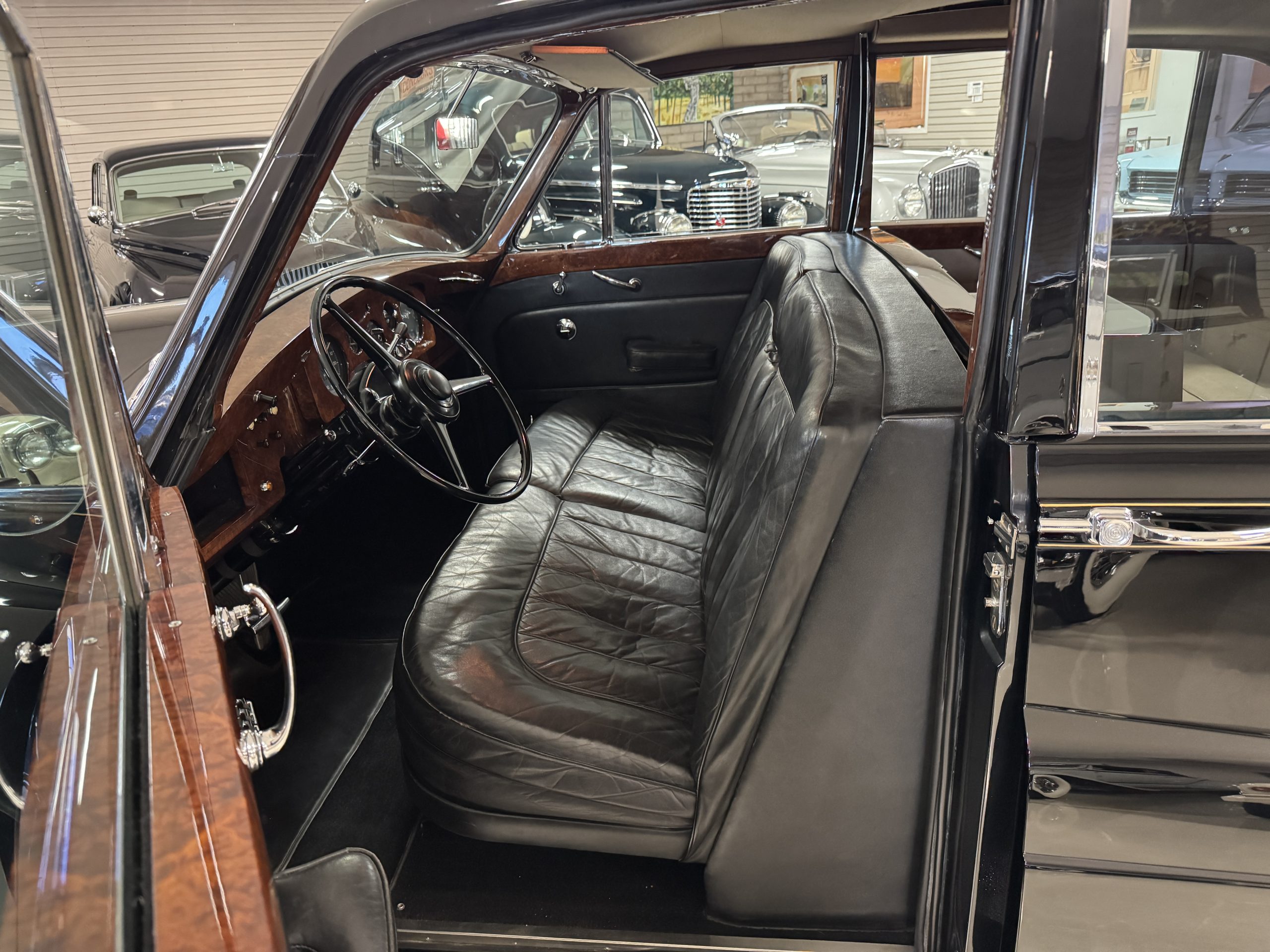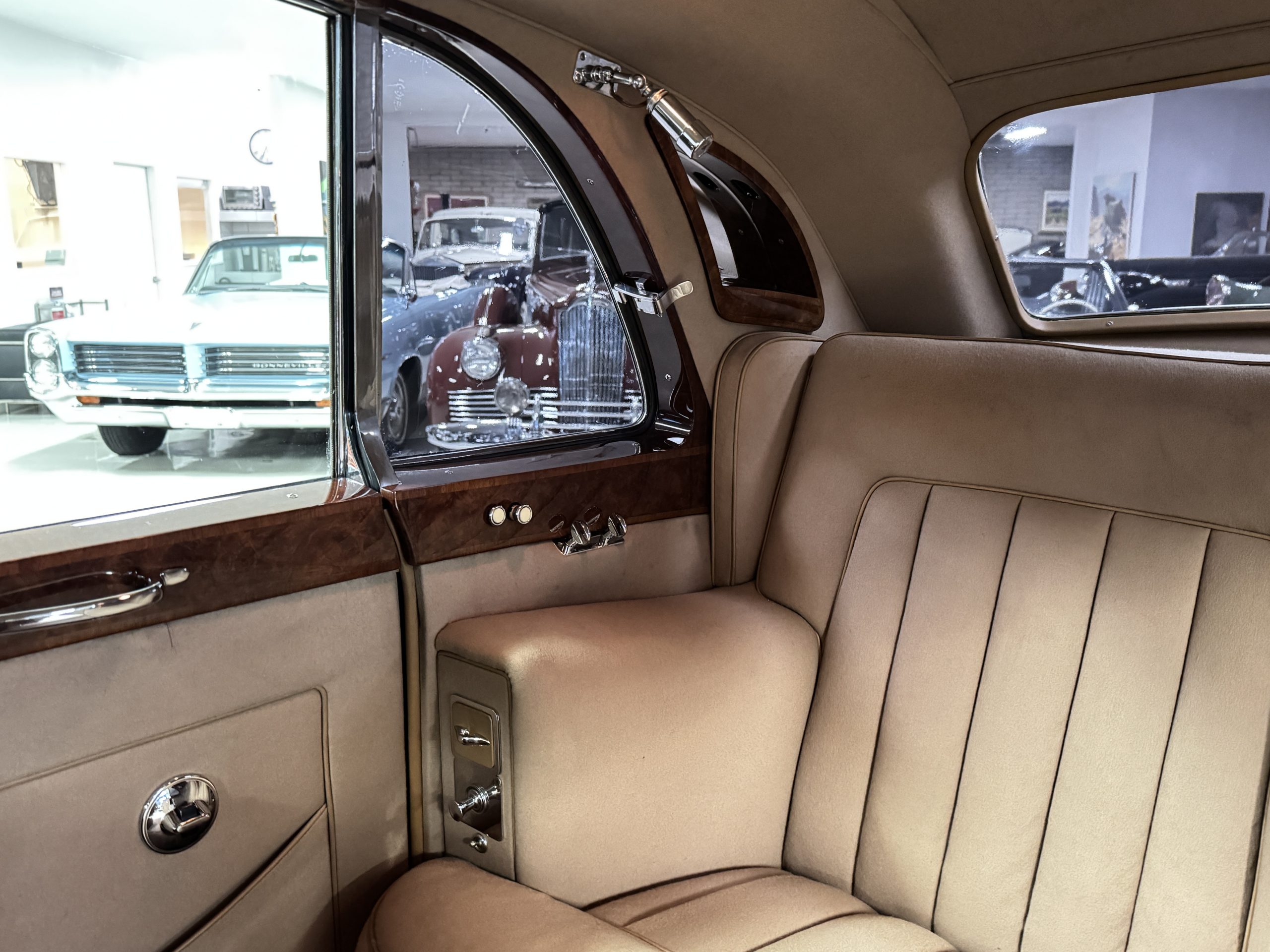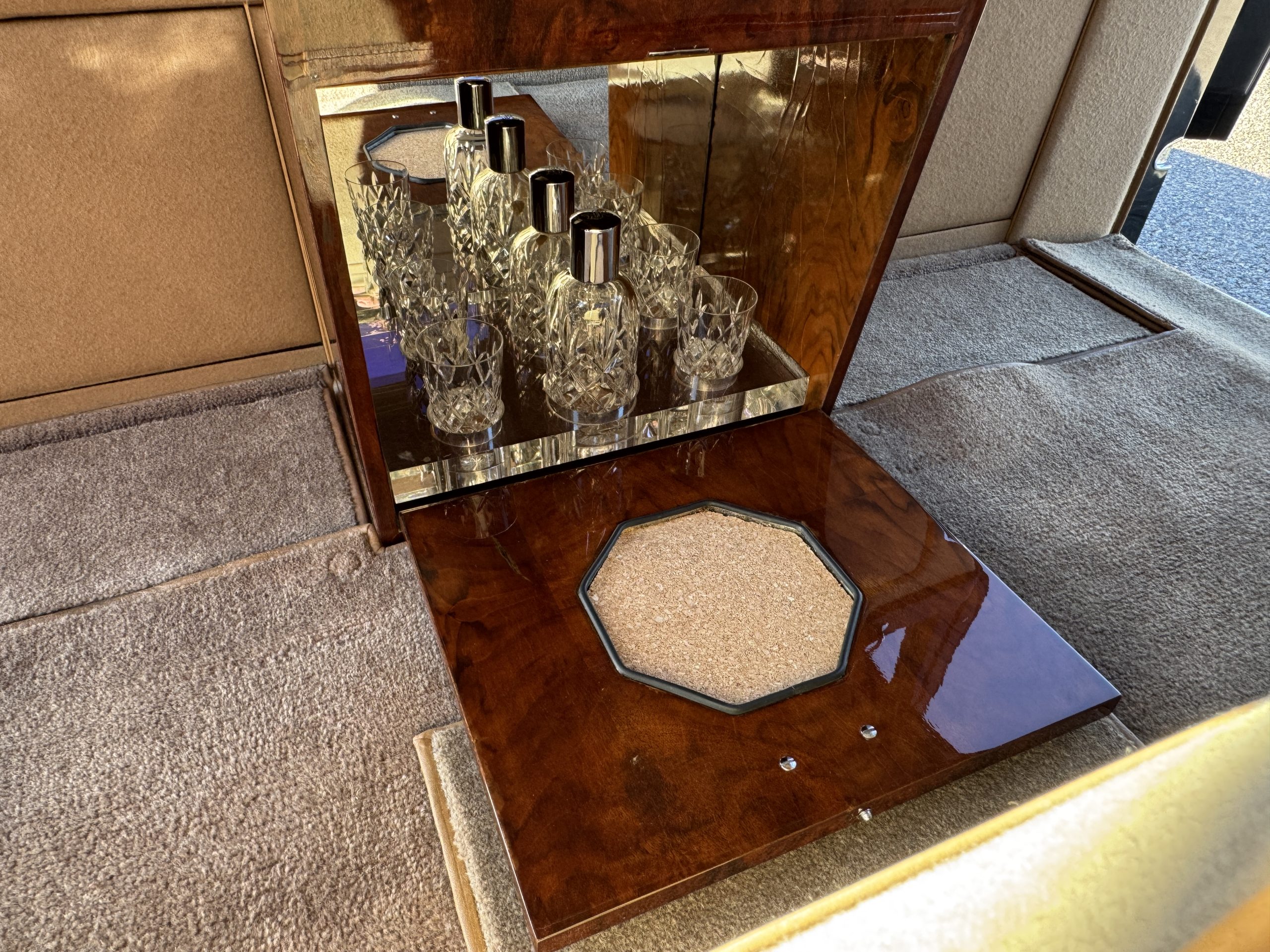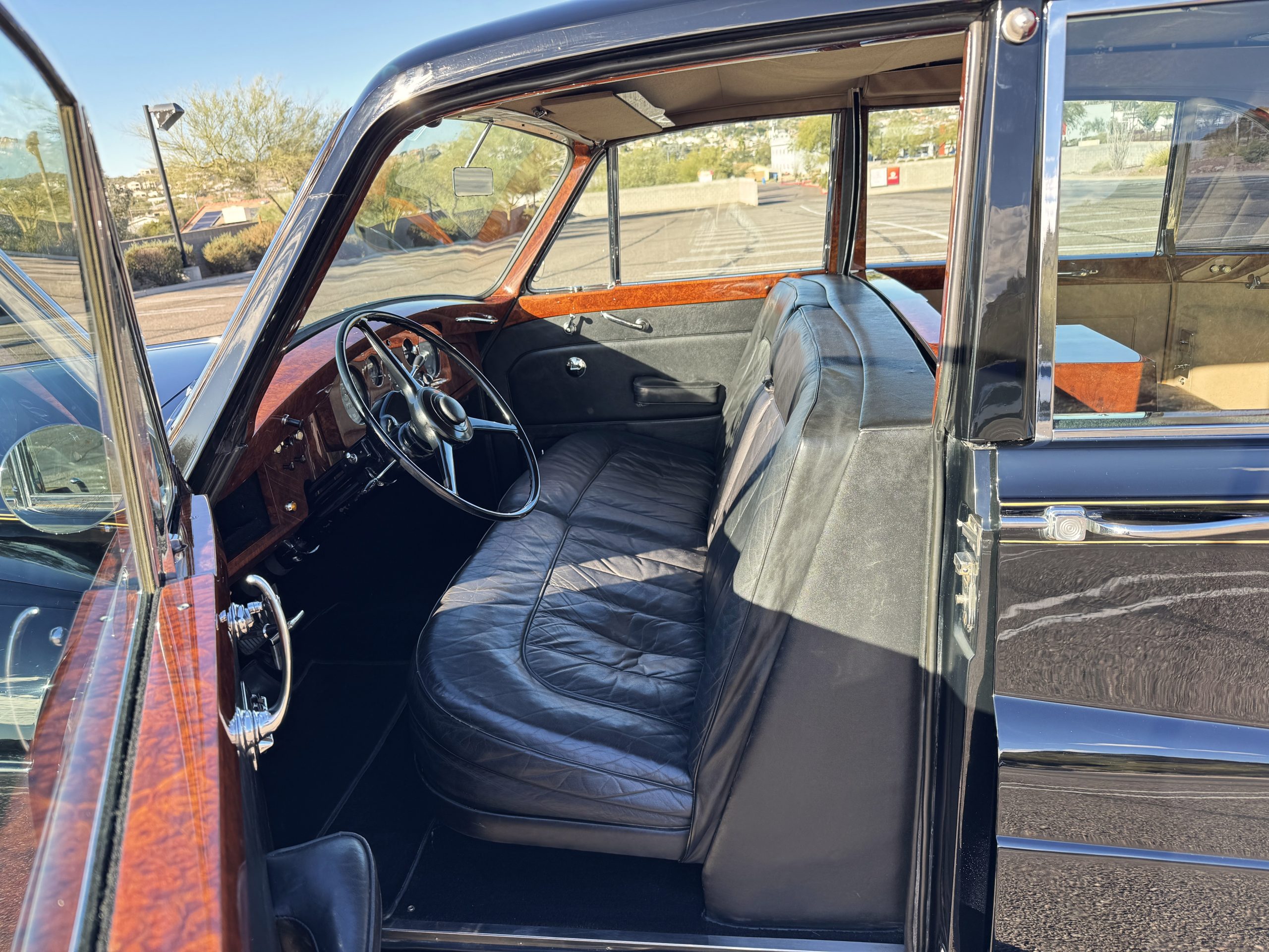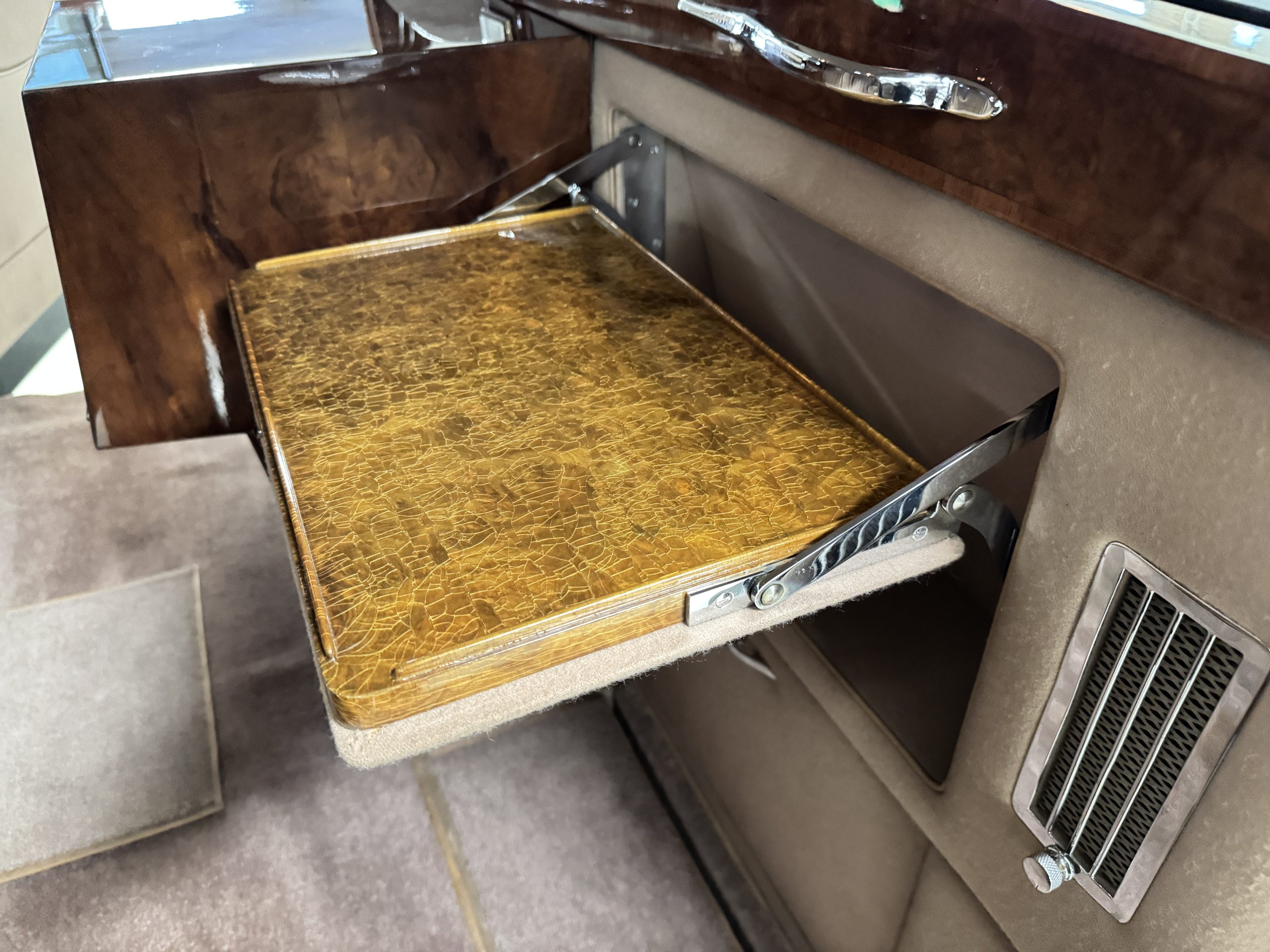 The interior is in overall beautiful condition.  All of the burl walnut trim has been painstakingly restored to showroom condition.  The chauffer’s compartment is finished in Black leather that is very soft and supple with normal creases with age.   The stereo has been updated with a more modern system.  The rear passenger compartment is all original tan wool broadcloth with complementary tan leather piping.  The upholstery is in excellent original condition with no soiling. The tan Wilton wool carpeting is also in very nice condition.  The center mirrored cocktail cabinet contains an original crystal decanter and two crystal glasses.  Above the cocktail cabinet is a separate compartment holding the Television.  Twin reading lamps, twin vanities and a Seth clock complete the amenities.  James Young coachbuilt Rolls-Royces always exhibit the most extraordinary book matched burlwood finishes.  This example, being built for their Earls Court exhibition, is just gorgeous.