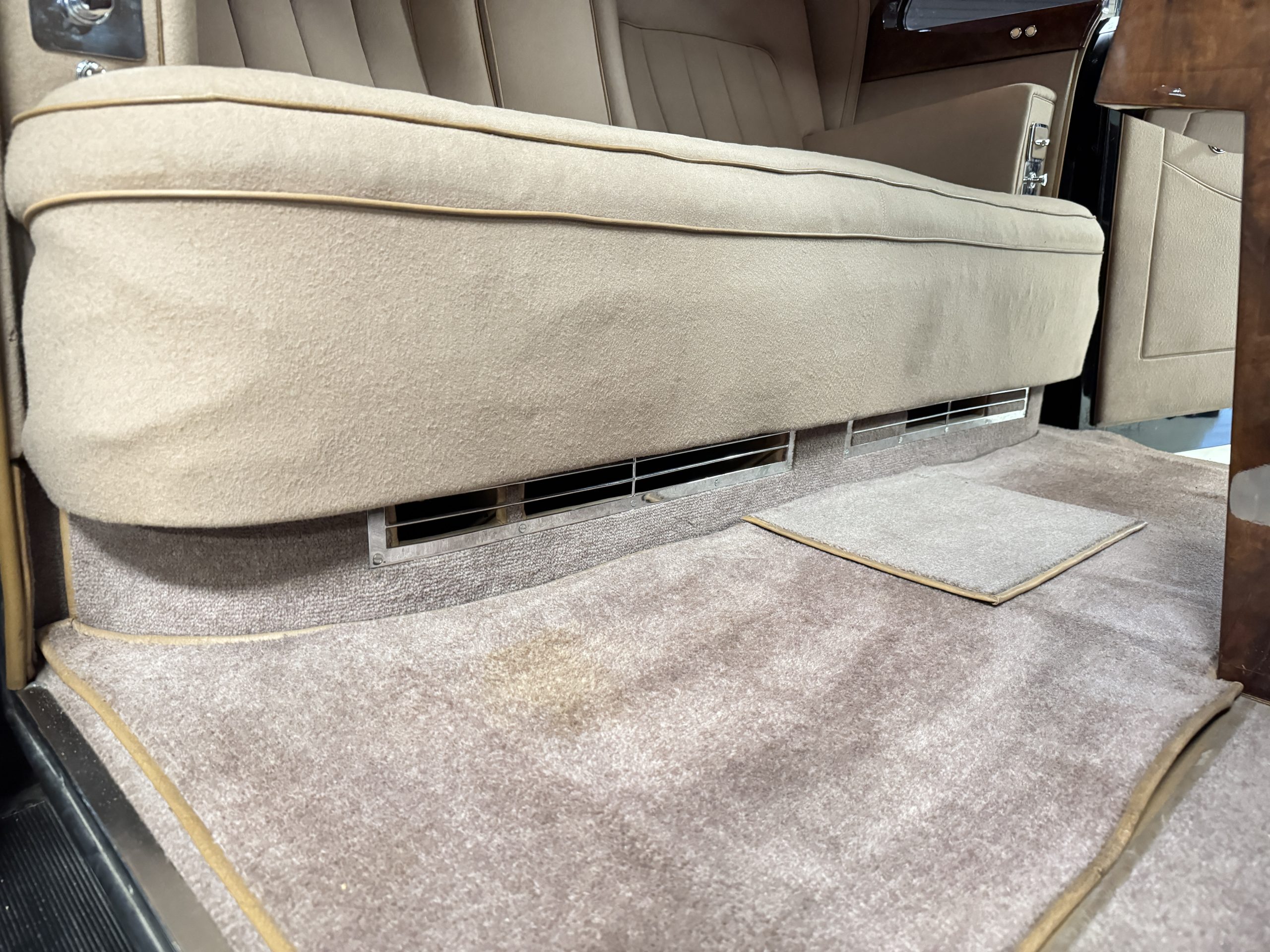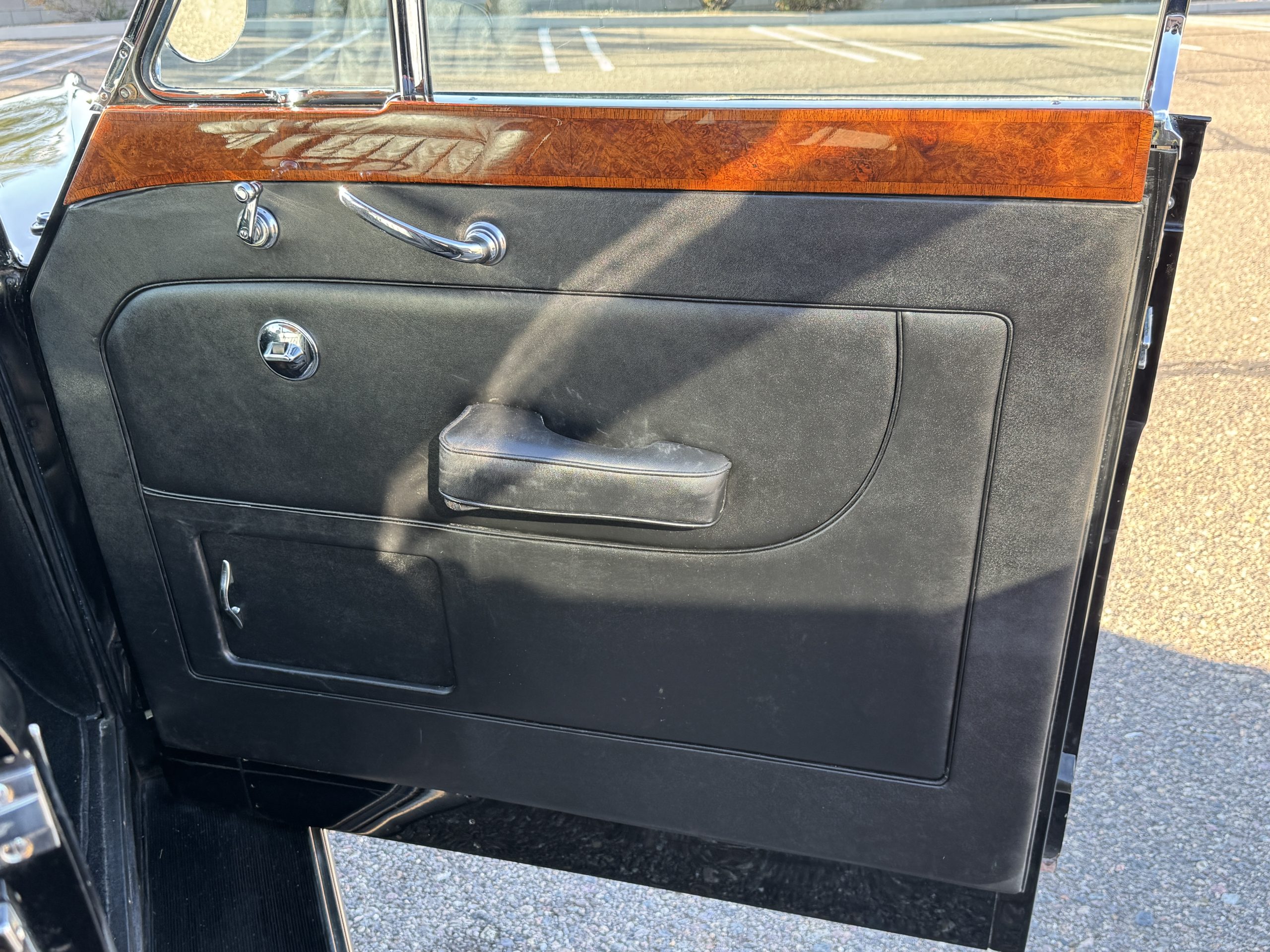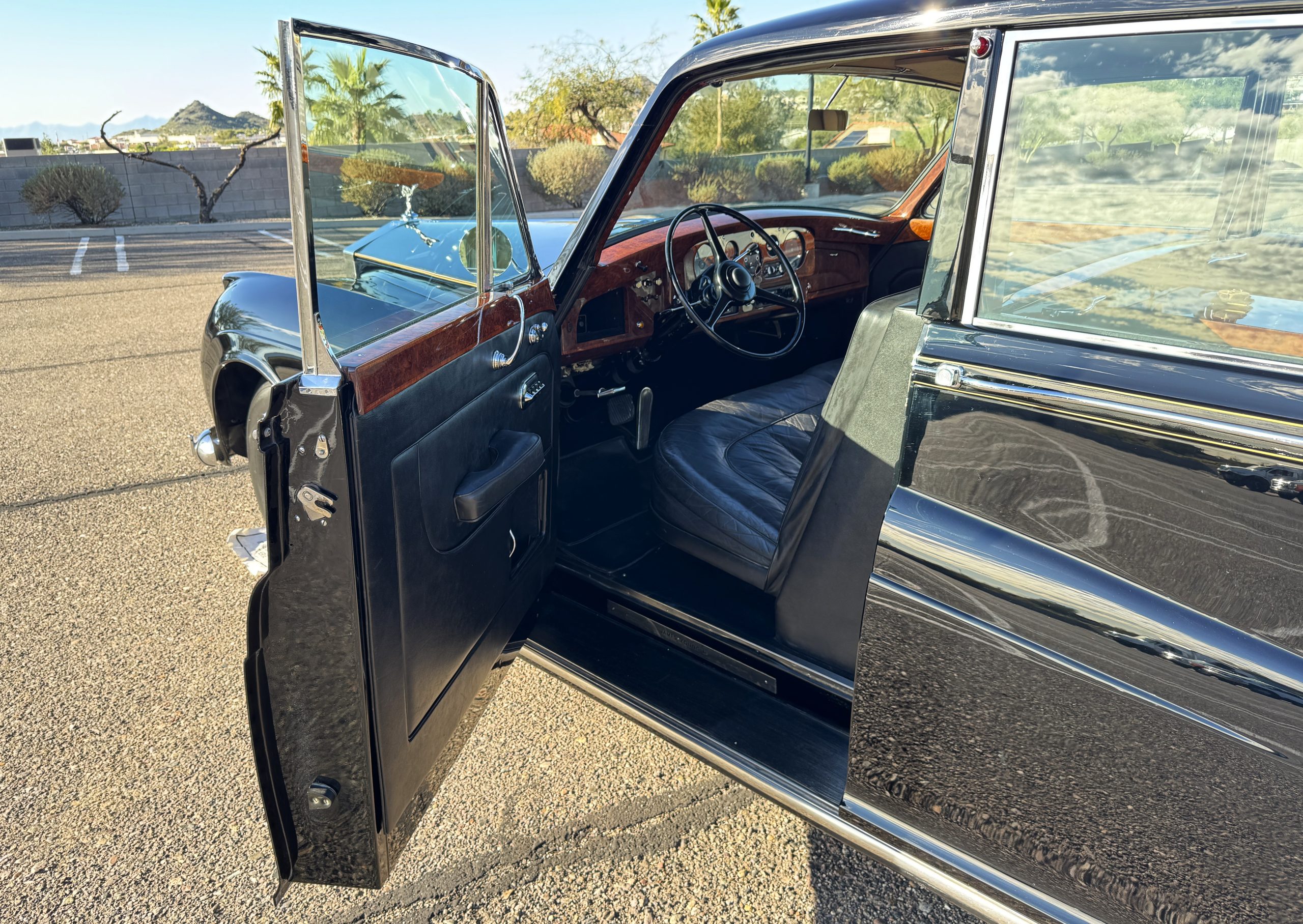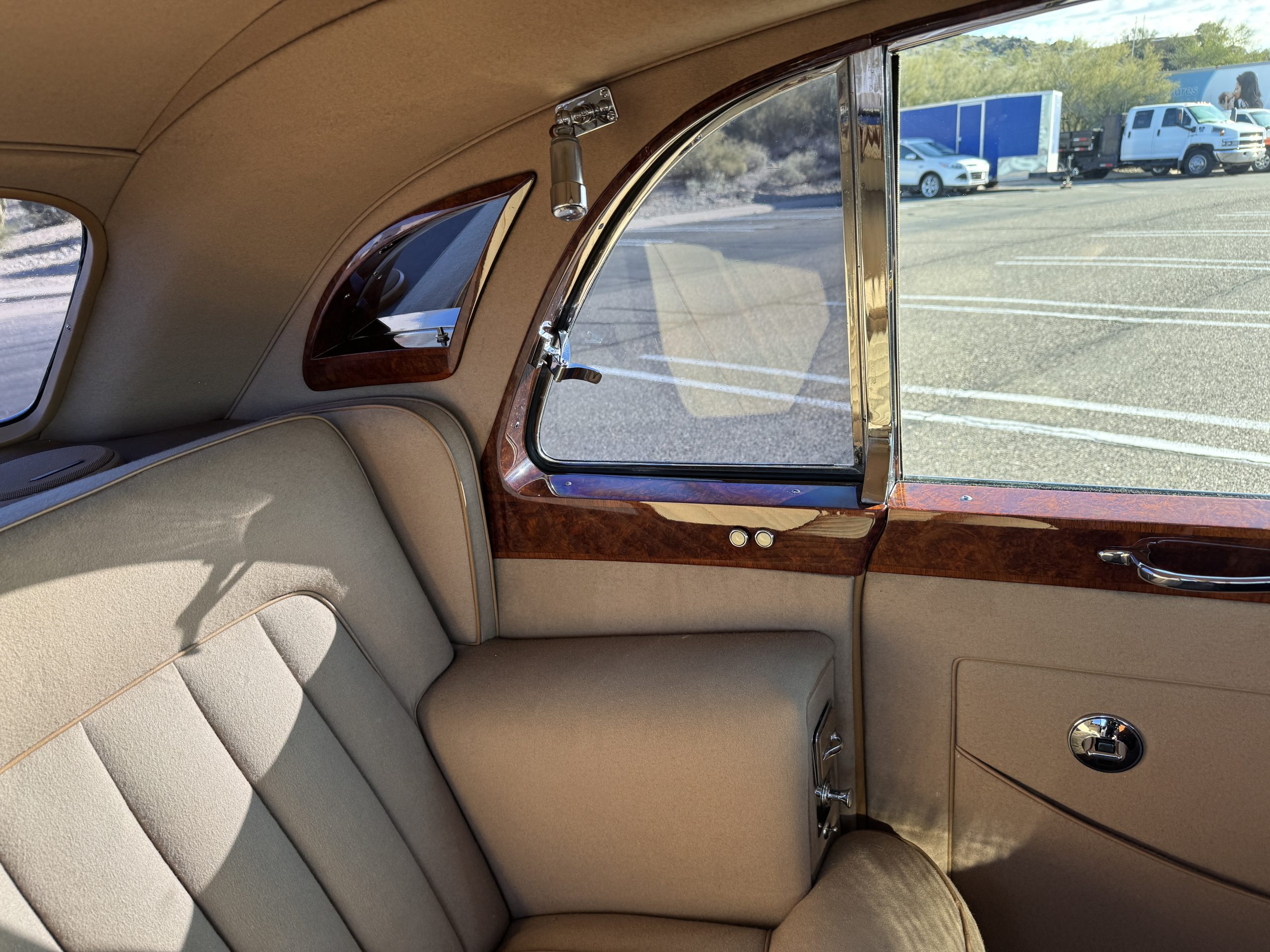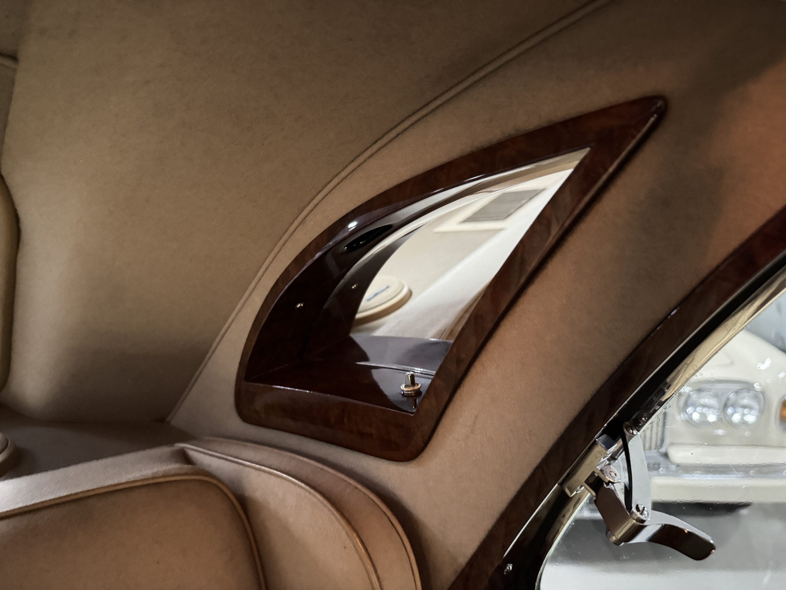 The interior is in overall beautiful condition.  All of the burl walnut trim has been painstakingly restored to showroom condition.  The chauffer’s compartment is finished in Black leather that is very soft and supple with normal creases with age.   The stereo has been updated with a more modern system.  The rear passenger compartment is all original tan wool broadcloth with complementary tan leather piping.  The upholstery is in excellent original condition with no soiling. The tan Wilton wool carpeting is also in very nice condition.  The center mirrored cocktail cabinet contains an original crystal decanter and two crystal glasses.  Above the cocktail cabinet is a separate compartment holding the Television.  Twin reading lamps, twin vanities and a Seth clock complete the amenities.  James Young coachbuilt Rolls-Royces always exhibit the most extraordinary book matched burlwood finishes.  This example, being built for their Earls Court exhibition, is just gorgeous.