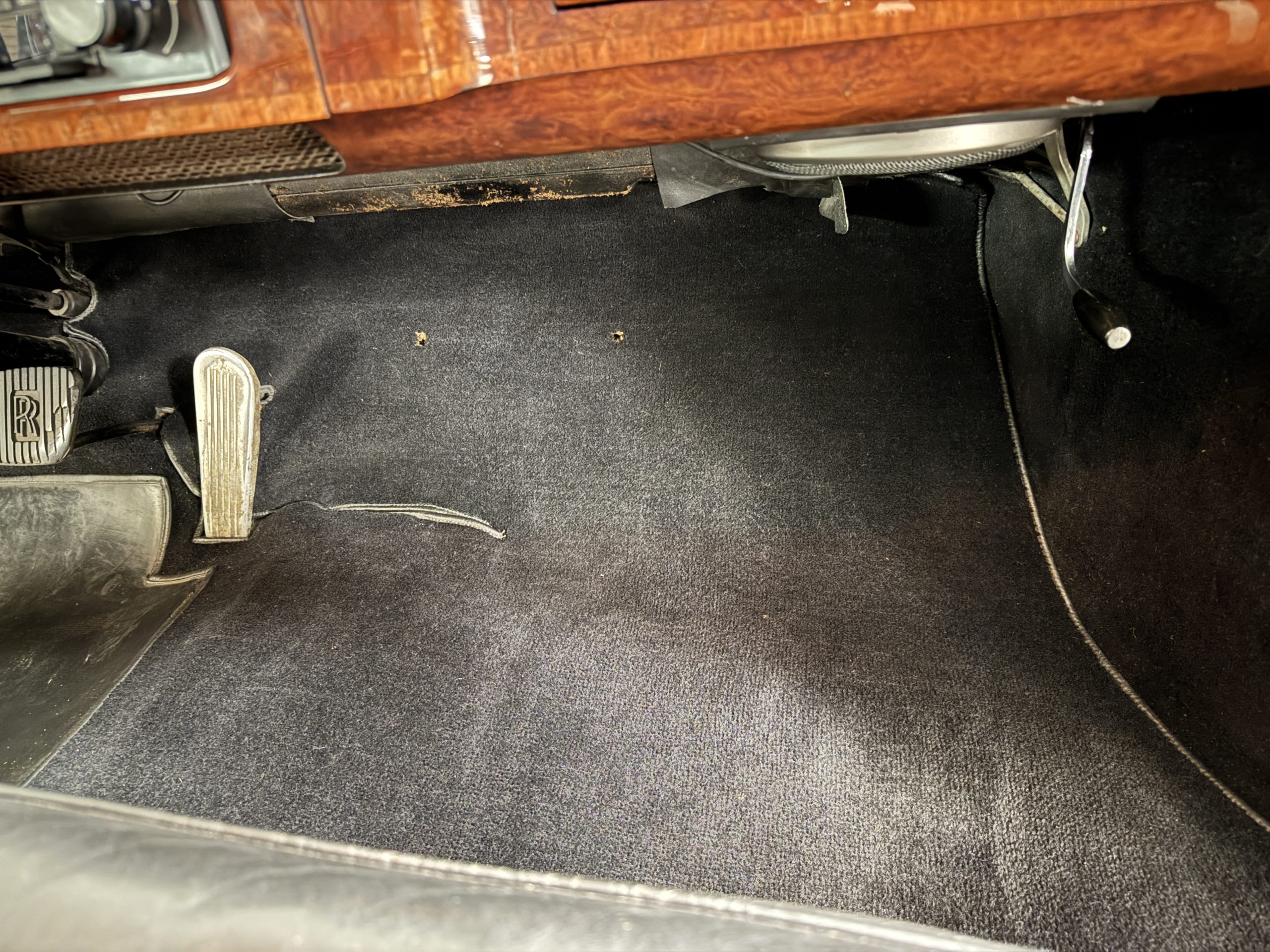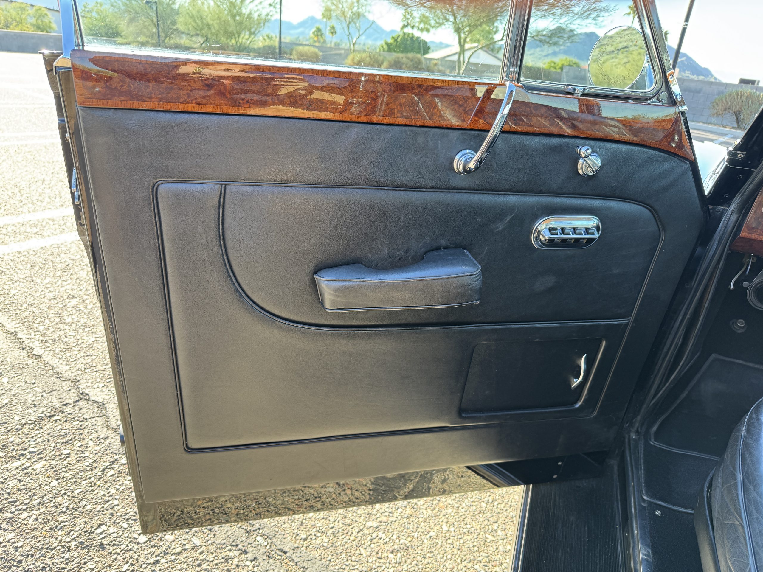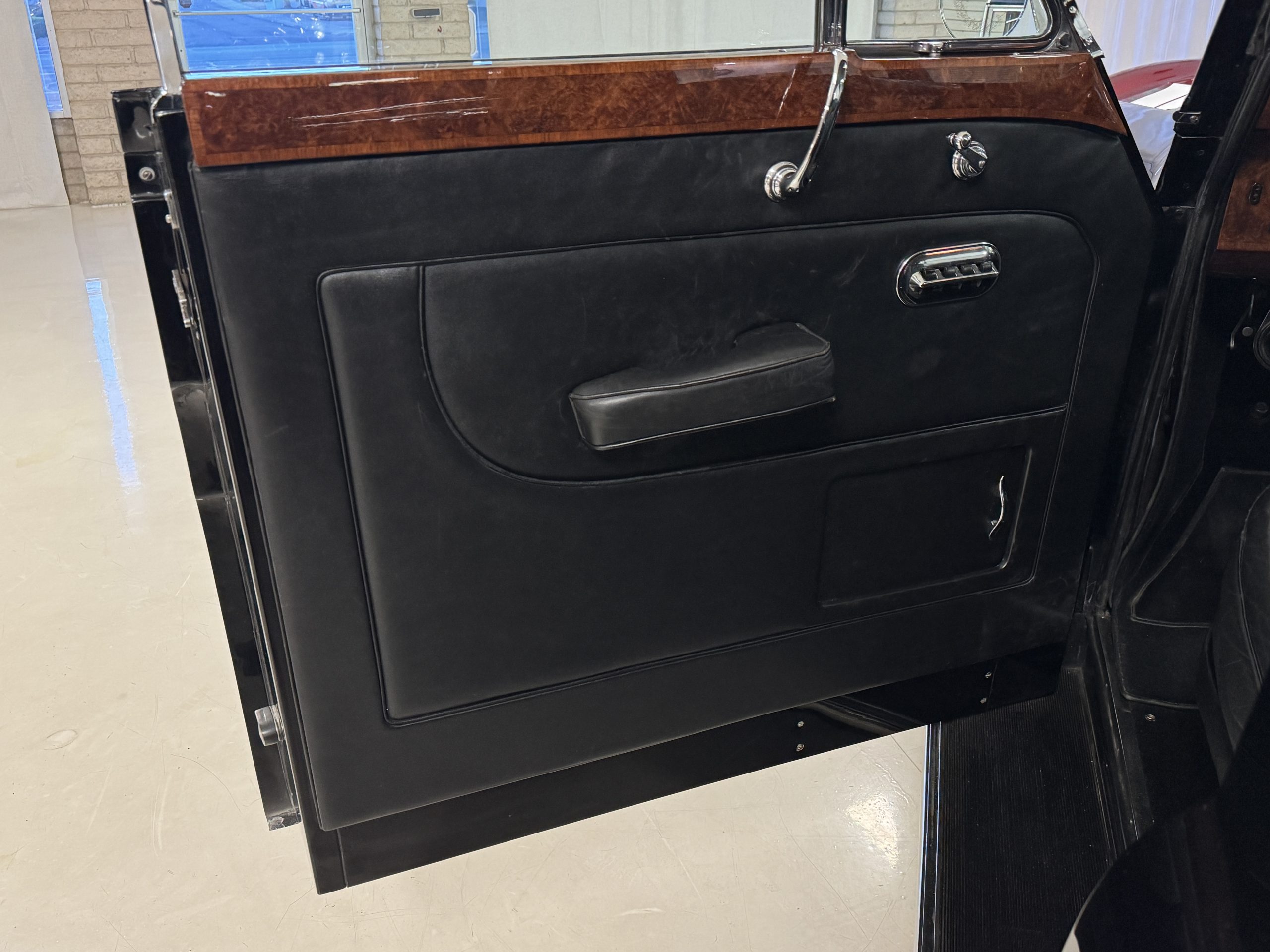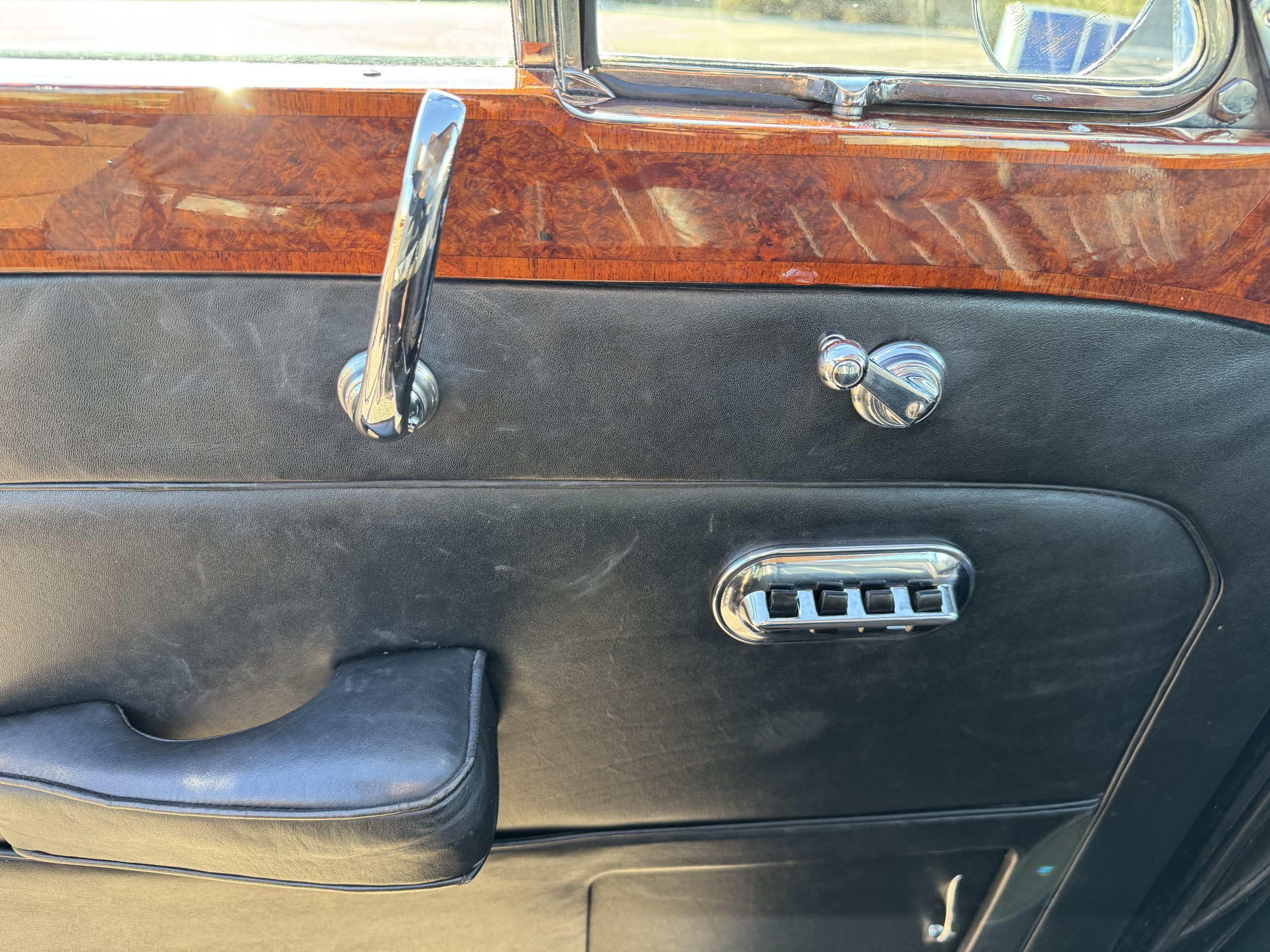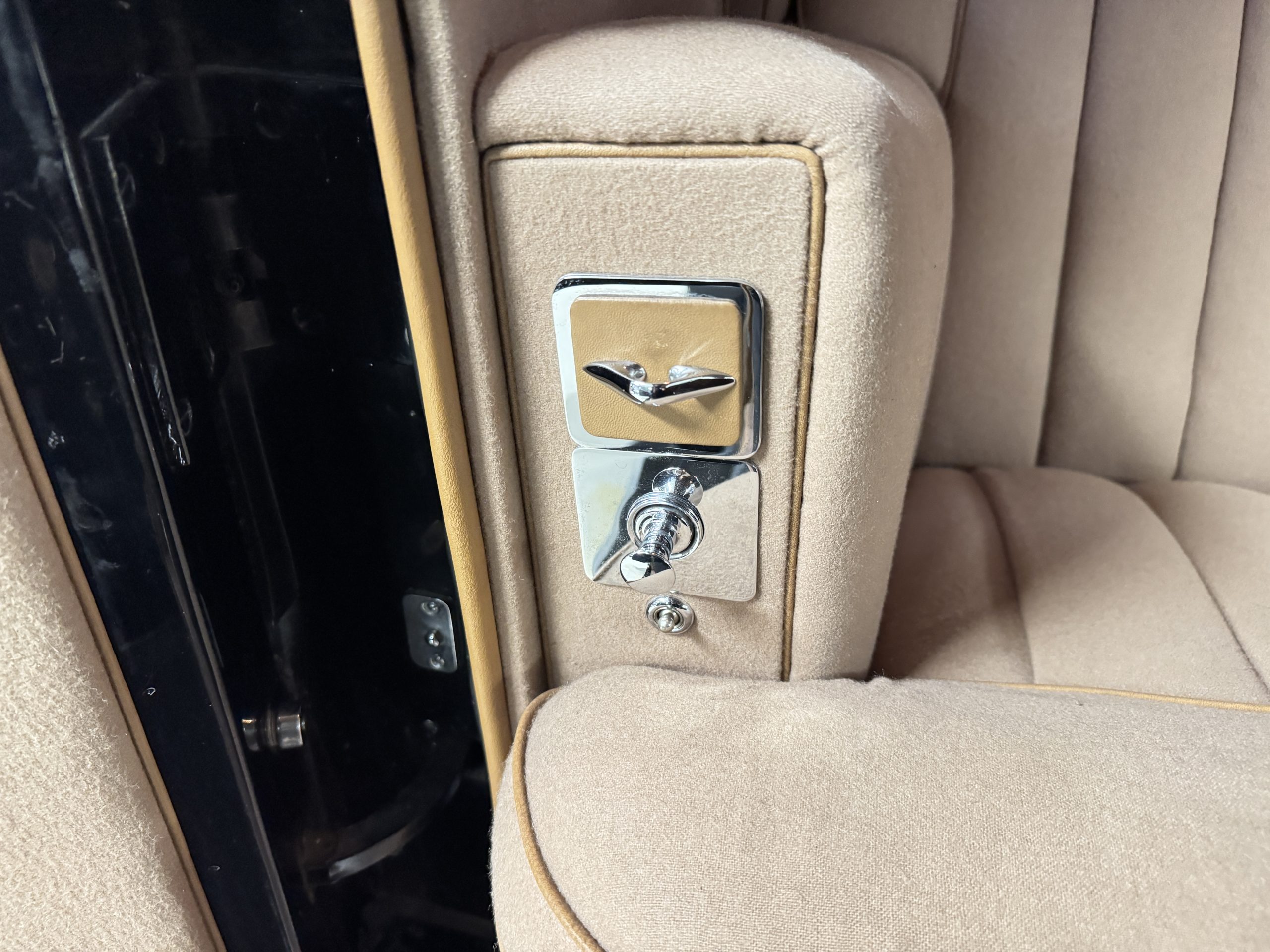 The interior is in overall beautiful condition.  All of the burl walnut trim has been painstakingly restored to showroom condition.  The chauffer’s compartment is finished in Black leather that is very soft and supple with normal creases with age.   The stereo has been updated with a more modern system.  The rear passenger compartment is all original tan wool broadcloth with complementary tan leather piping.  The upholstery is in excellent original condition with no soiling. The tan Wilton wool carpeting is also in very nice condition.  The center mirrored cocktail cabinet contains an original crystal decanter and two crystal glasses.  Above the cocktail cabinet is a separate compartment holding the Television.  Twin reading lamps, twin vanities and a Seth clock complete the amenities.  James Young coachbuilt Rolls-Royces always exhibit the most extraordinary book matched burlwood finishes.  This example, being built for their Earls Court exhibition, is just gorgeous.