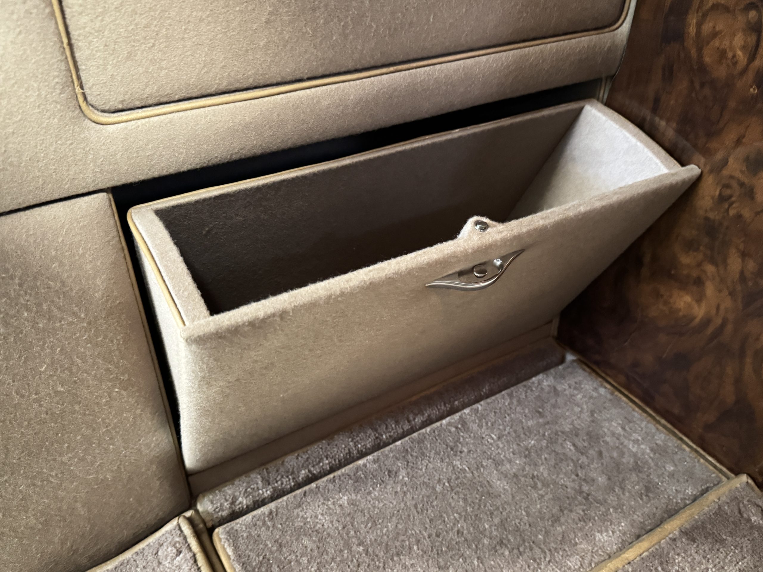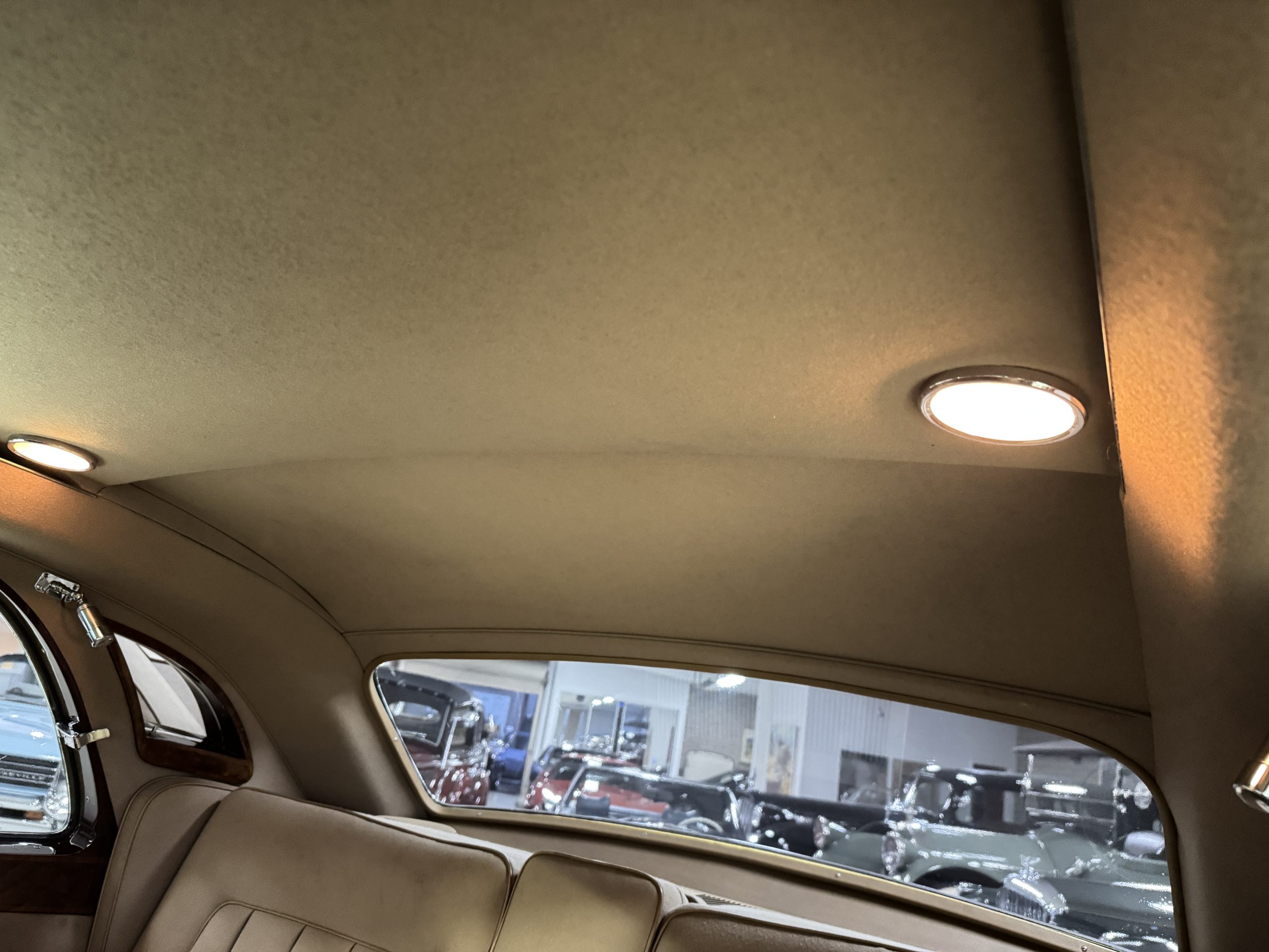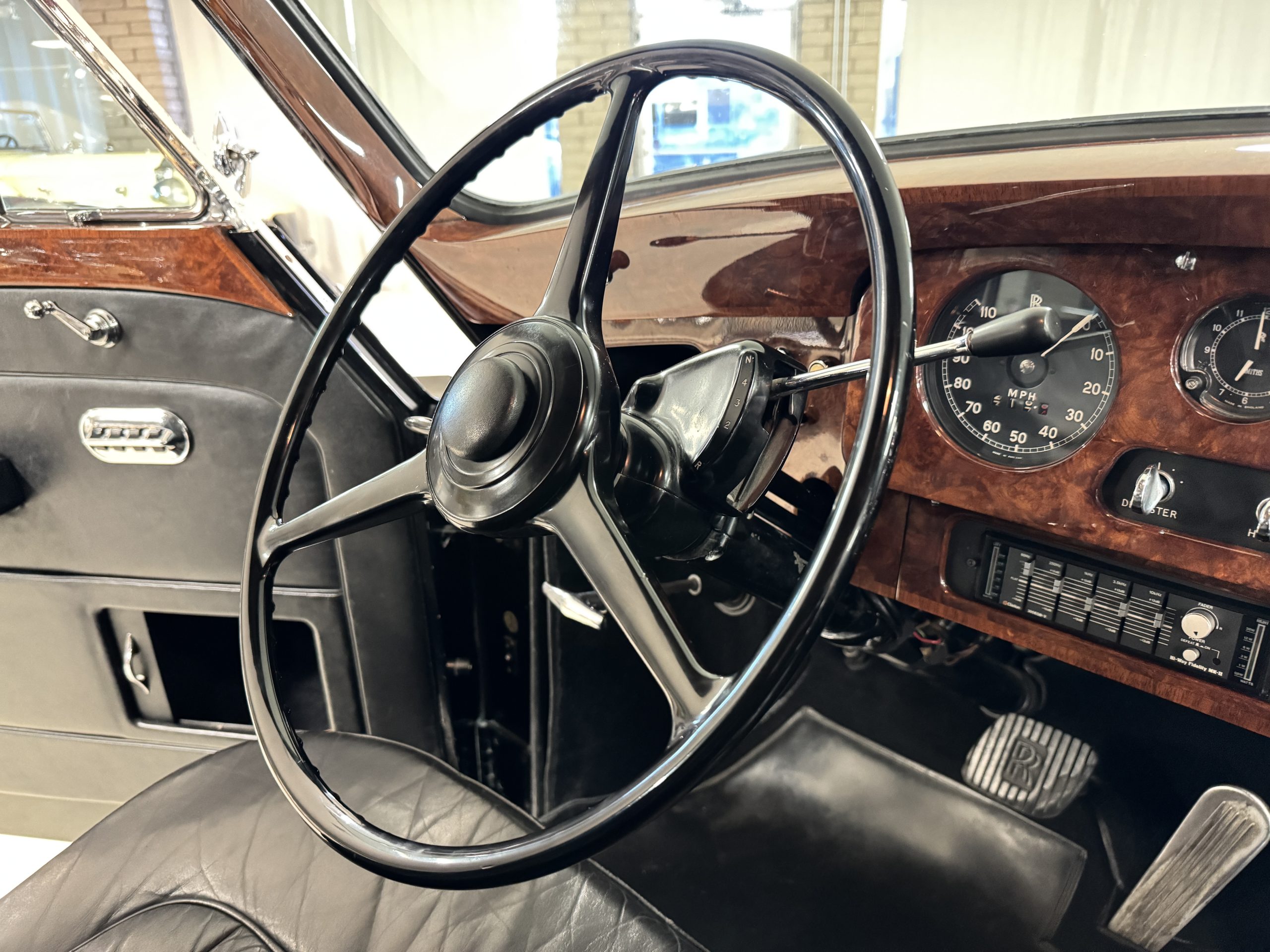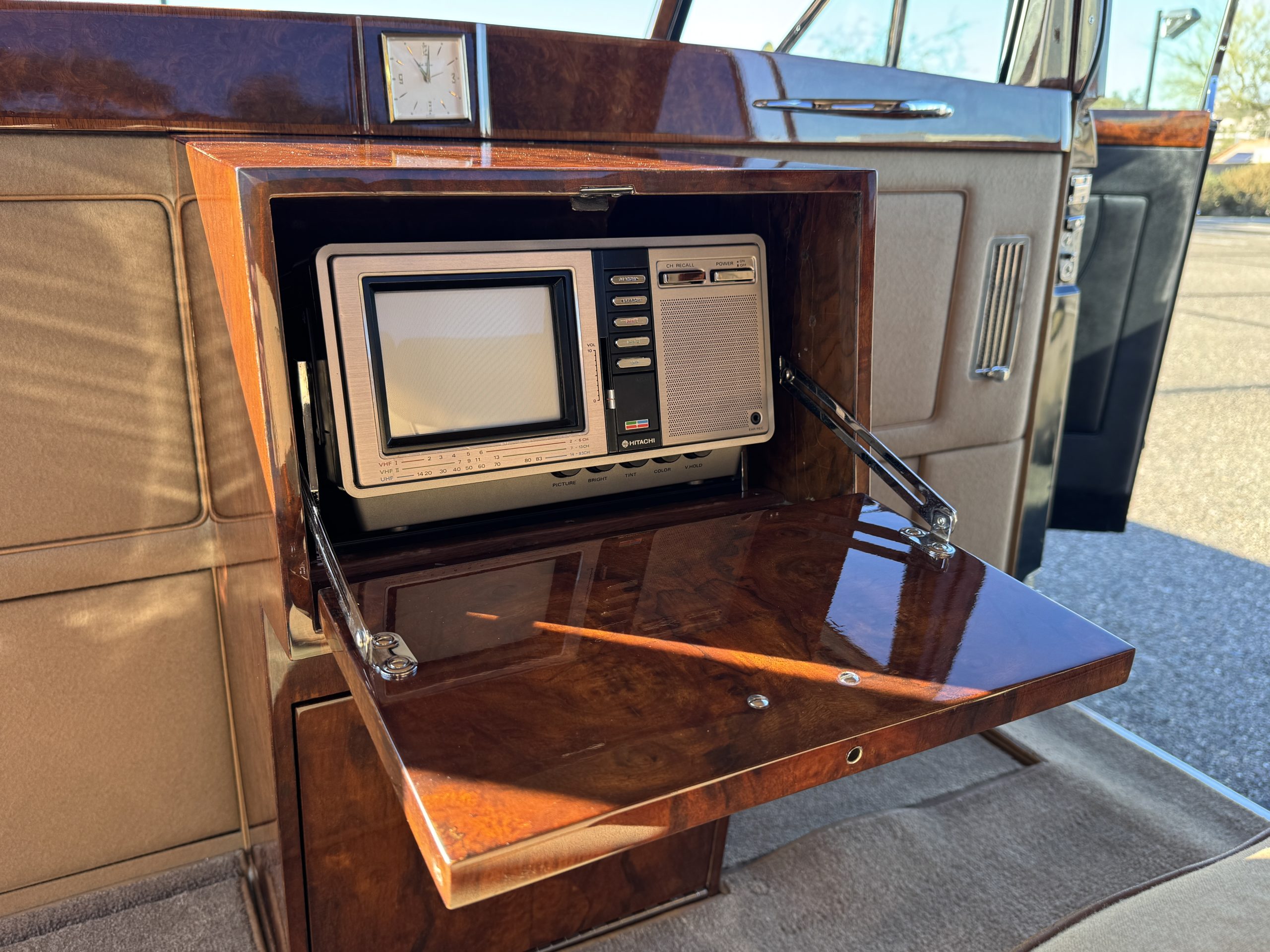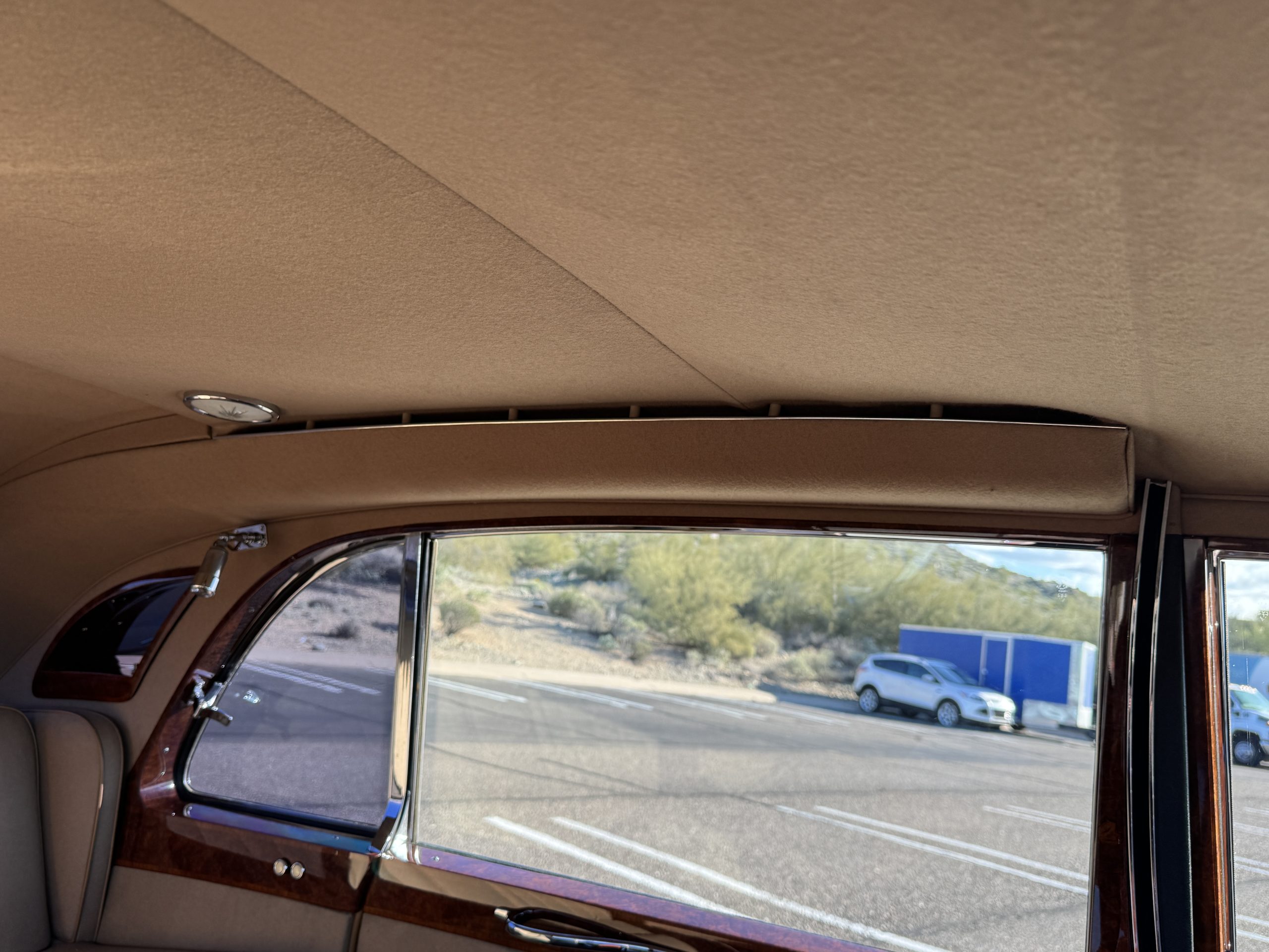 The interior is in overall beautiful condition.  All of the burl walnut trim has been painstakingly restored to showroom condition.  The chauffer’s compartment is finished in Black leather that is very soft and supple with normal creases with age.   The stereo has been updated with a more modern system.  The rear passenger compartment is all original tan wool broadcloth with complementary tan leather piping.  The upholstery is in excellent original condition with no soiling. The tan Wilton wool carpeting is also in very nice condition.  The center mirrored cocktail cabinet contains an original crystal decanter and two crystal glasses.  Above the cocktail cabinet is a separate compartment holding the Television.  Twin reading lamps, twin vanities and a Seth clock complete the amenities.  James Young coachbuilt Rolls-Royces always exhibit the most extraordinary book matched burlwood finishes.  This example, being built for their Earls Court exhibition, is just gorgeous.