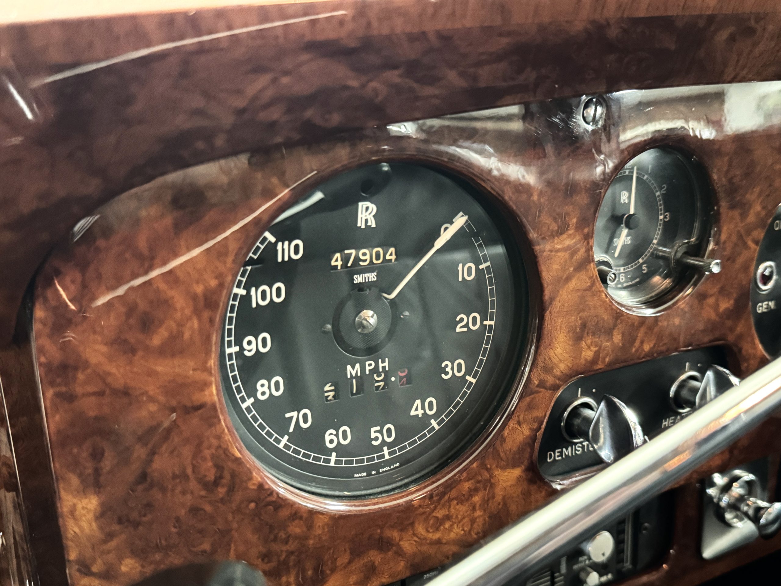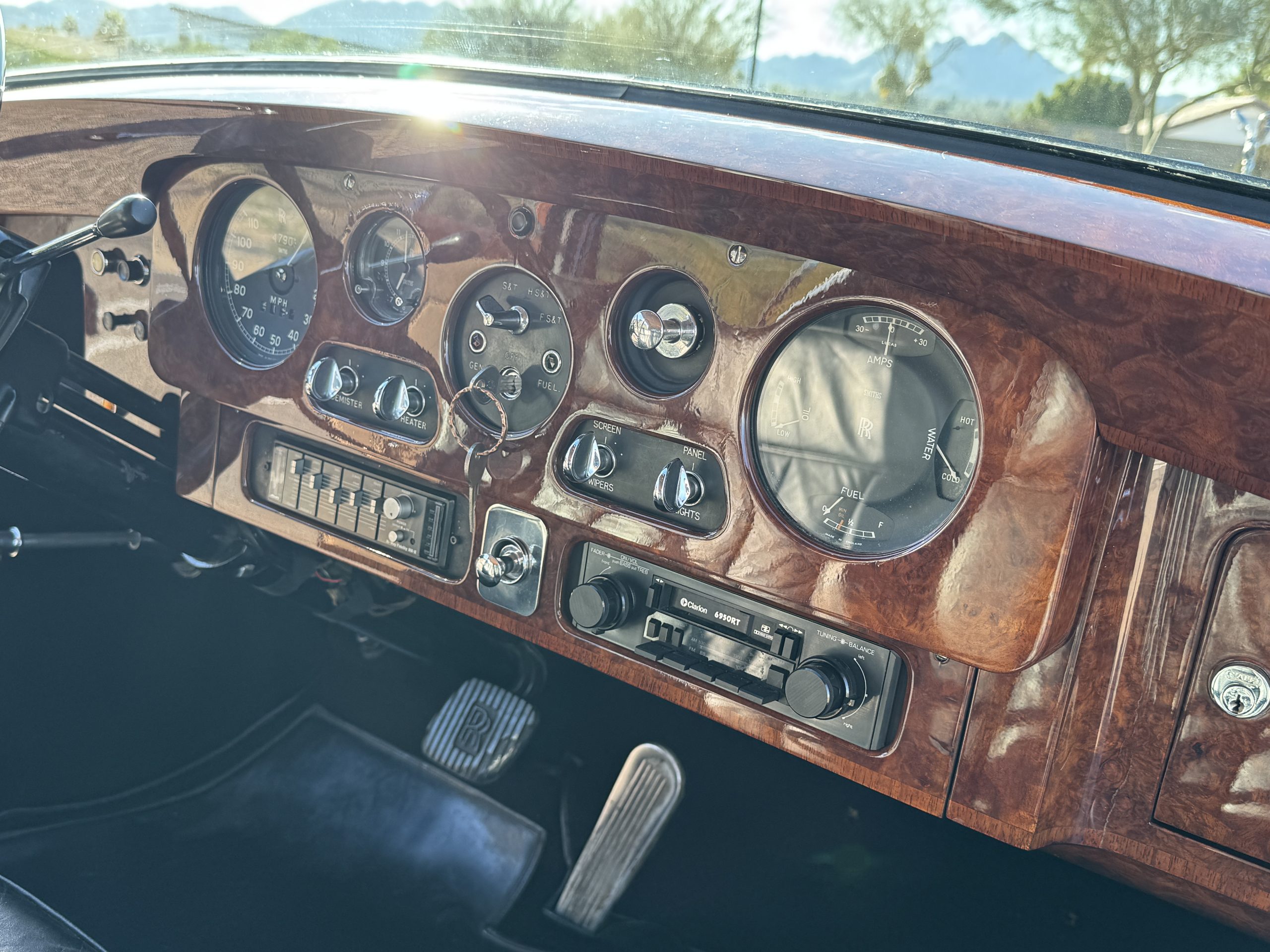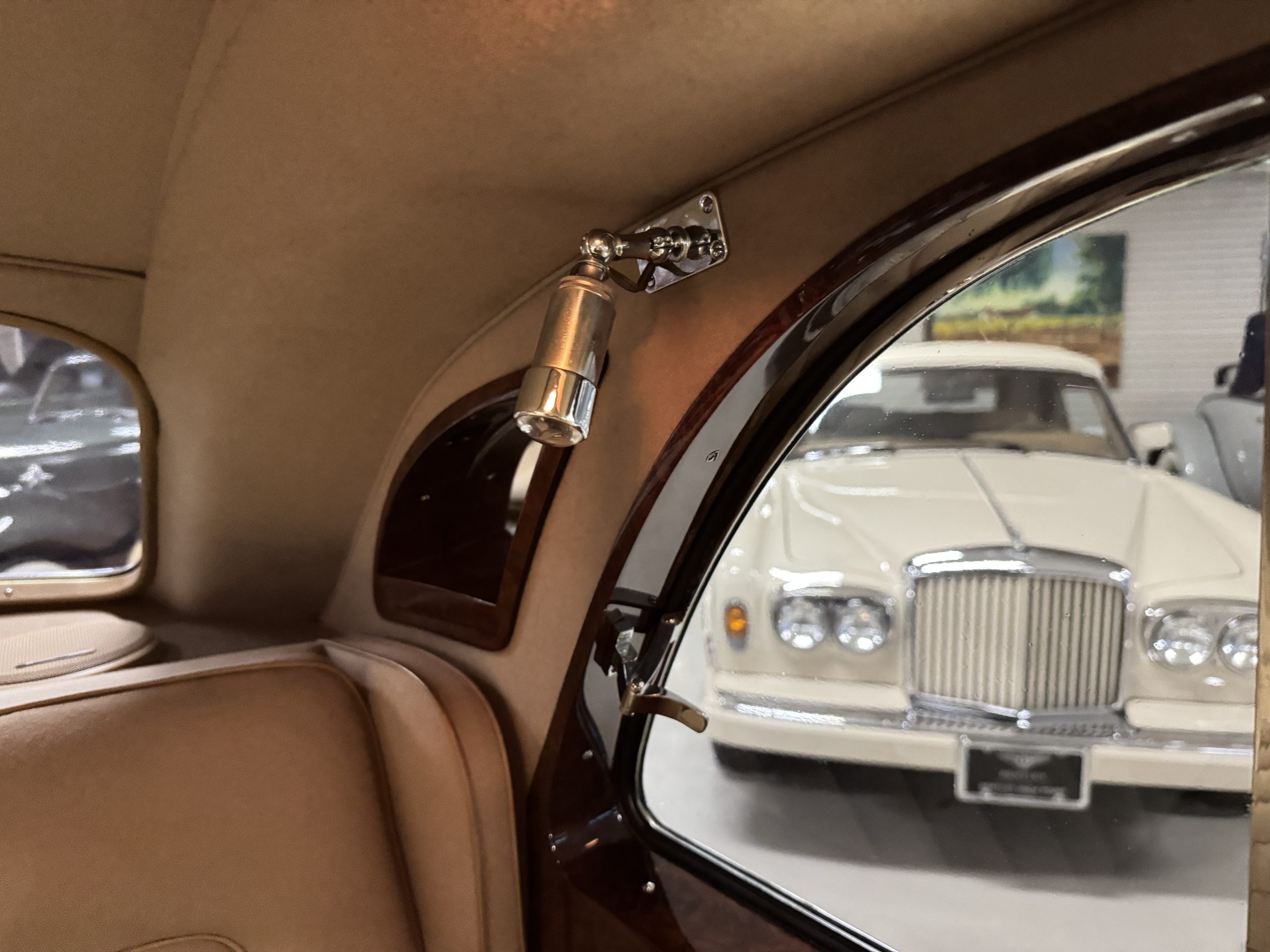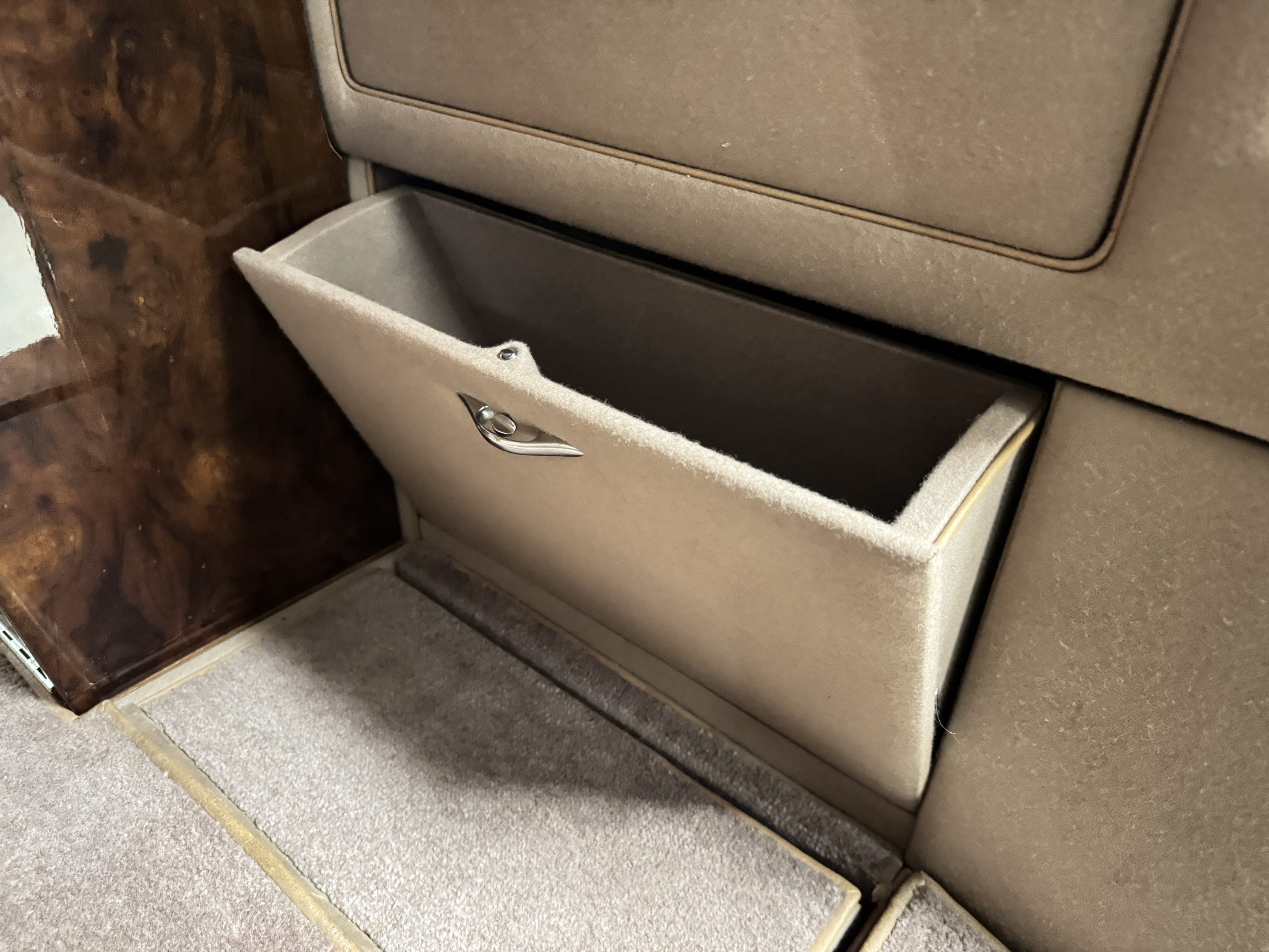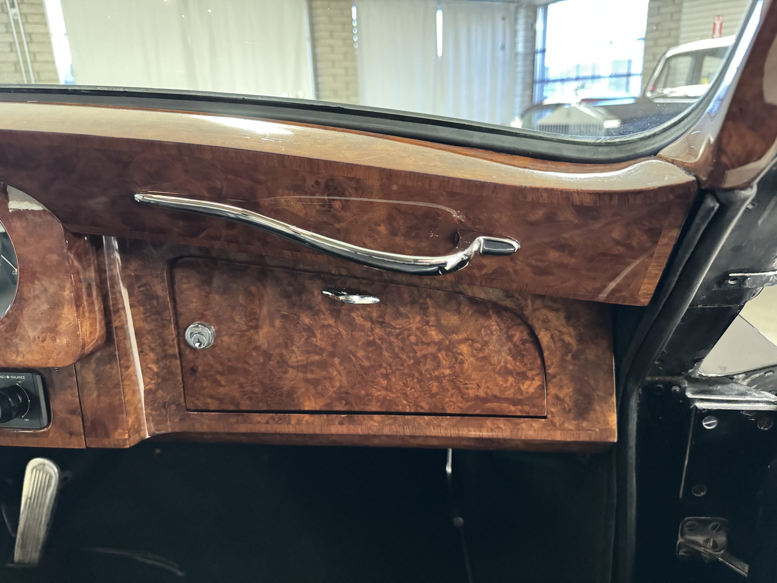 The interior is in overall beautiful condition.  All of the burl walnut trim has been painstakingly restored to showroom condition.  The chauffer’s compartment is finished in Black leather that is very soft and supple with normal creases with age.   The stereo has been updated with a more modern system.  The rear passenger compartment is all original tan wool broadcloth with complementary tan leather piping.  The upholstery is in excellent original condition with no soiling. The tan Wilton wool carpeting is also in very nice condition.  The center mirrored cocktail cabinet contains an original crystal decanter and two crystal glasses.  Above the cocktail cabinet is a separate compartment holding the Television.  Twin reading lamps, twin vanities and a Seth clock complete the amenities.  James Young coachbuilt Rolls-Royces always exhibit the most extraordinary book matched burlwood finishes.  This example, being built for their Earls Court exhibition, is just gorgeous.