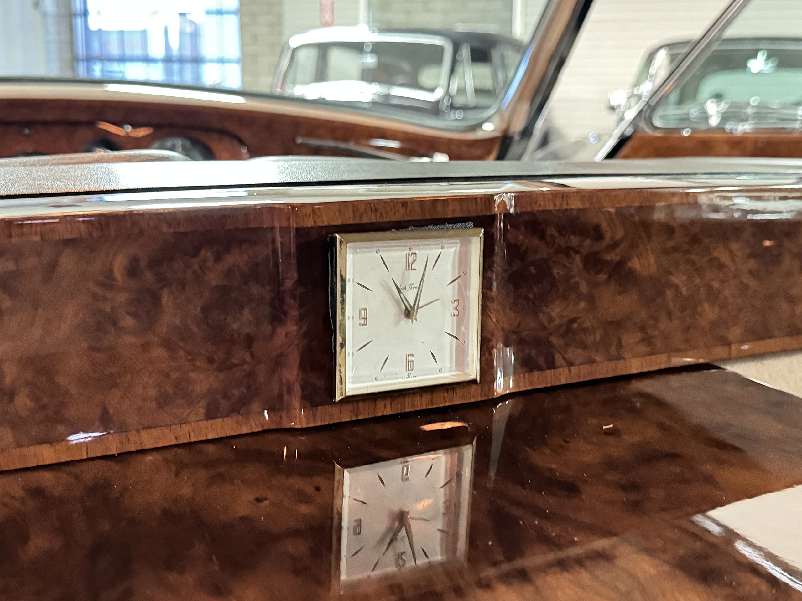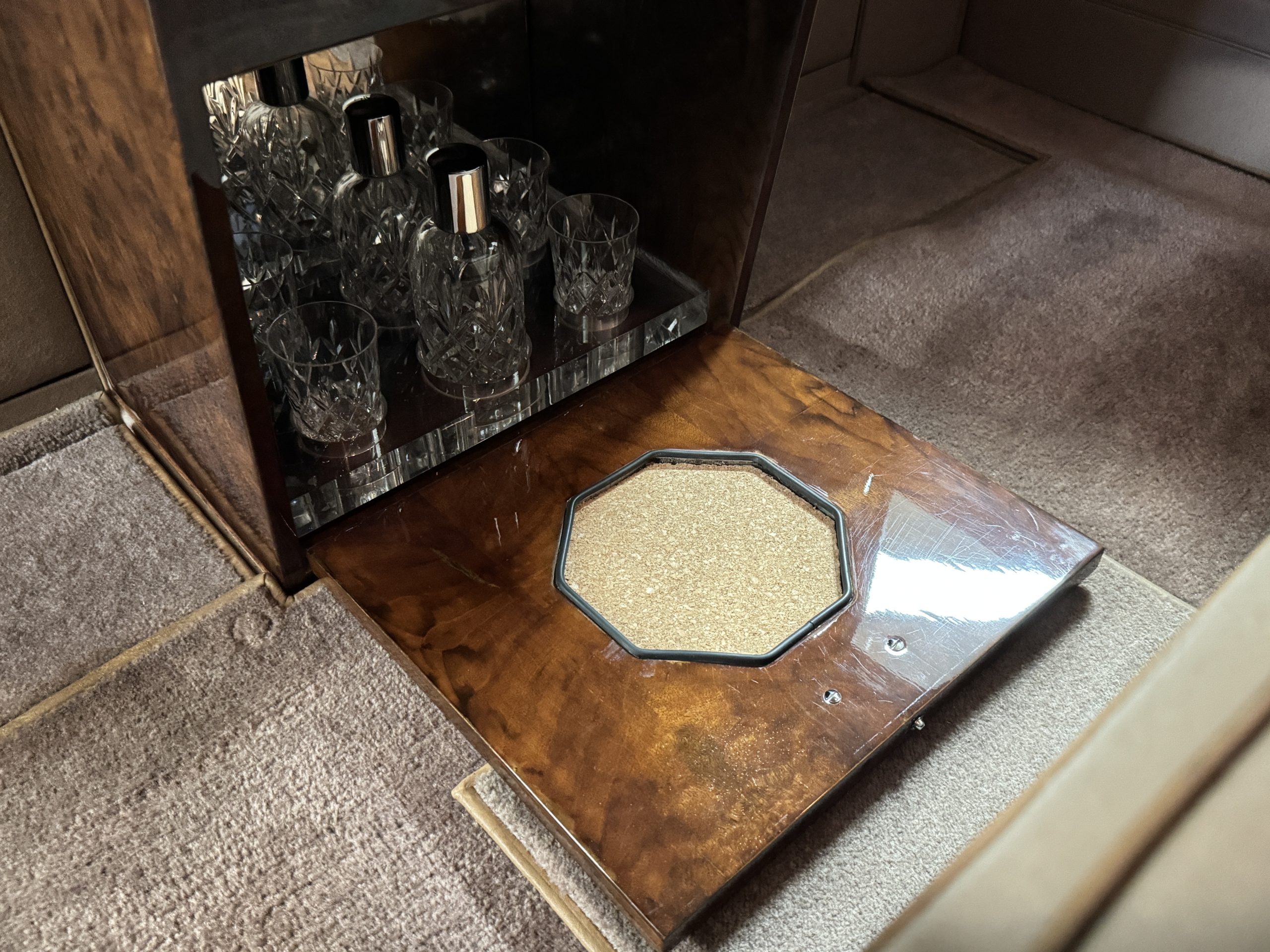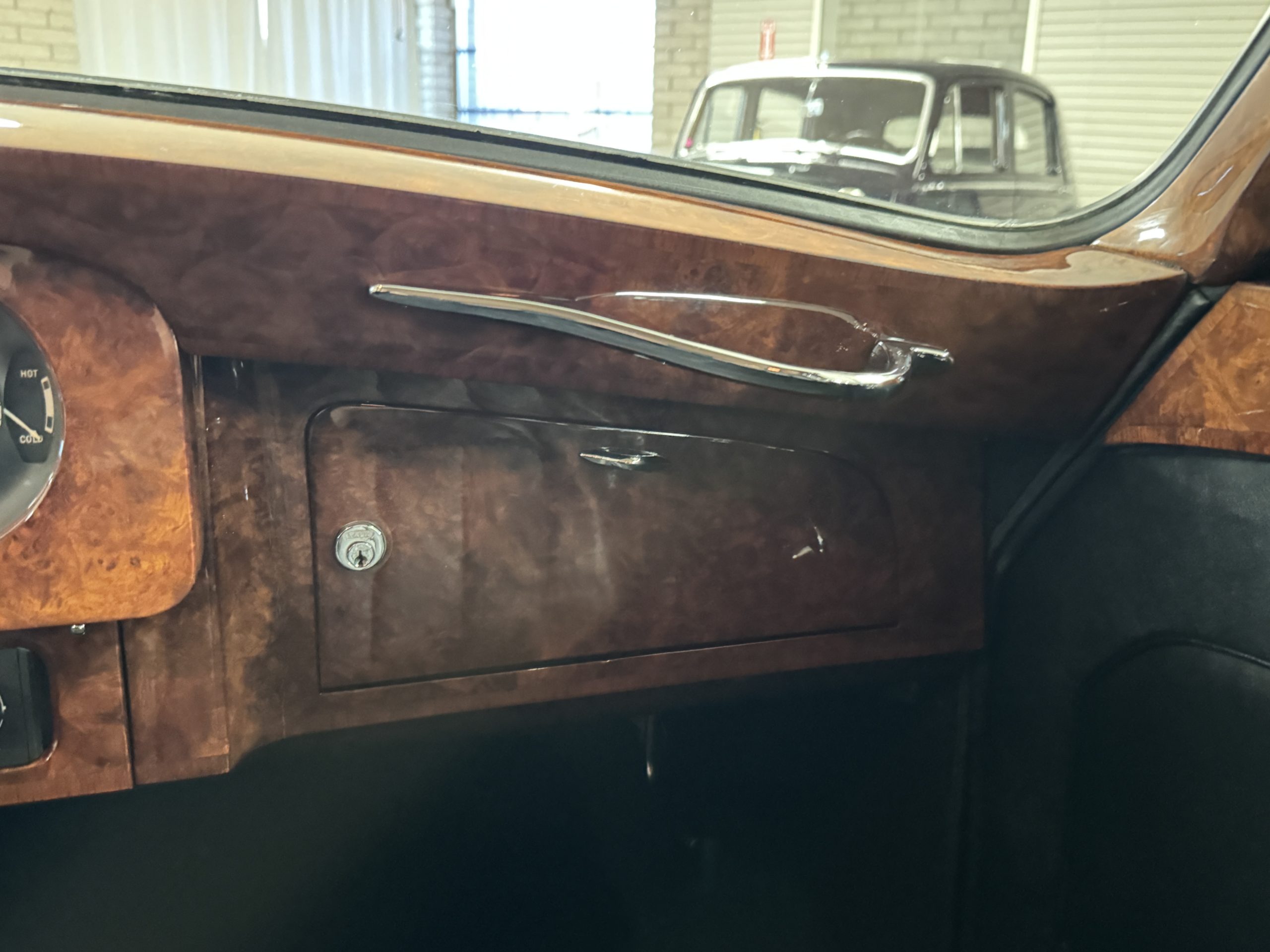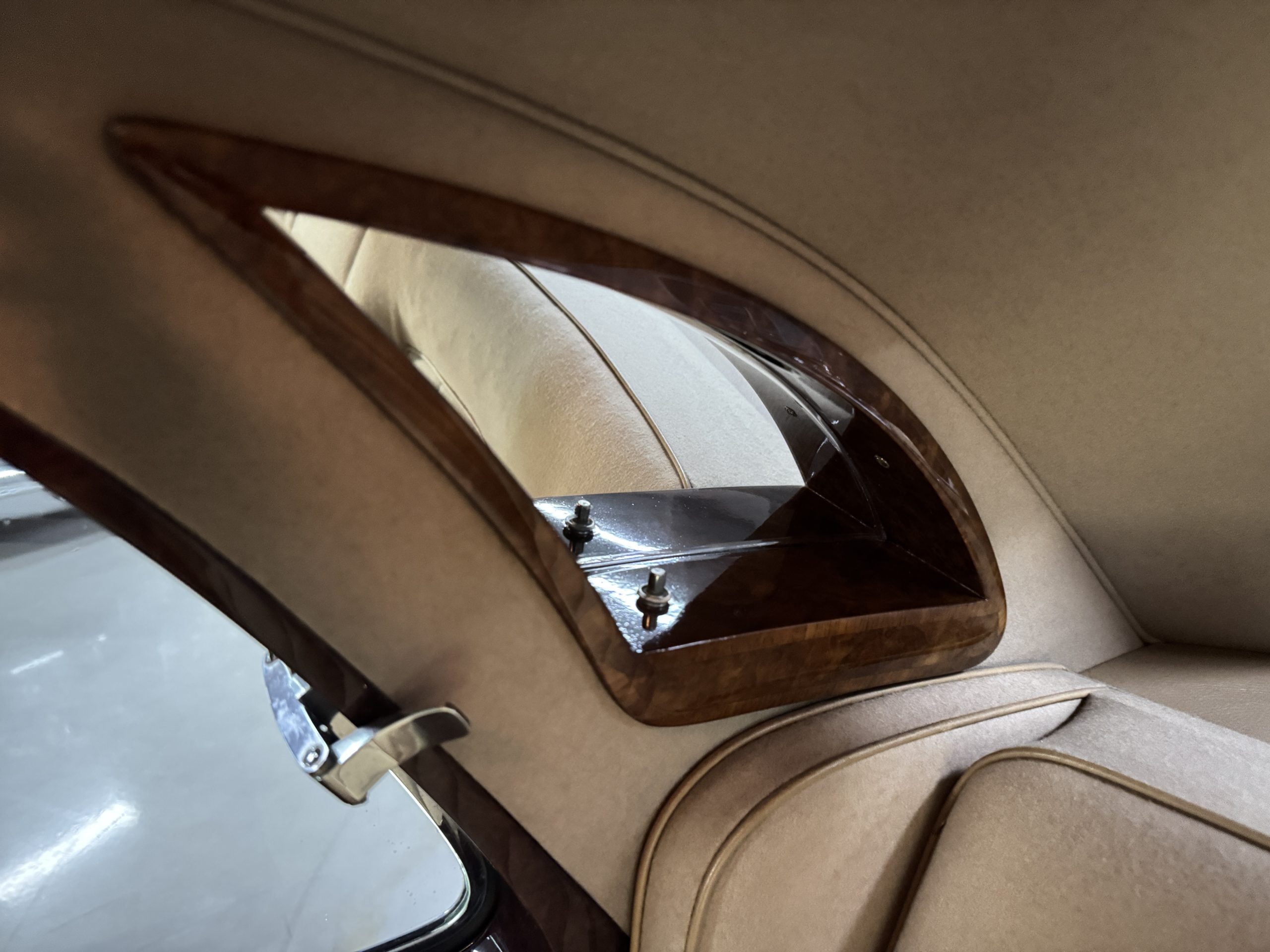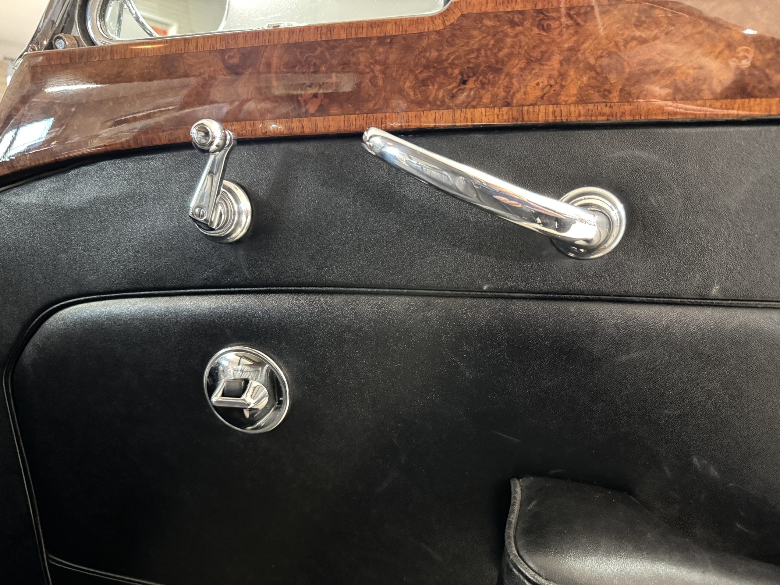 The interior is in overall beautiful condition.  All of the burl walnut trim has been painstakingly restored to showroom condition.  The chauffer’s compartment is finished in Black leather that is very soft and supple with normal creases with age.   The stereo has been updated with a more modern system.  The rear passenger compartment is all original tan wool broadcloth with complementary tan leather piping.  The upholstery is in excellent original condition with no soiling. The tan Wilton wool carpeting is also in very nice condition.  The center mirrored cocktail cabinet contains an original crystal decanter and two crystal glasses.  Above the cocktail cabinet is a separate compartment holding the Television.  Twin reading lamps, twin vanities and a Seth clock complete the amenities.  James Young coachbuilt Rolls-Royces always exhibit the most extraordinary book matched burlwood finishes.  This example, being built for their Earls Court exhibition, is just gorgeous.