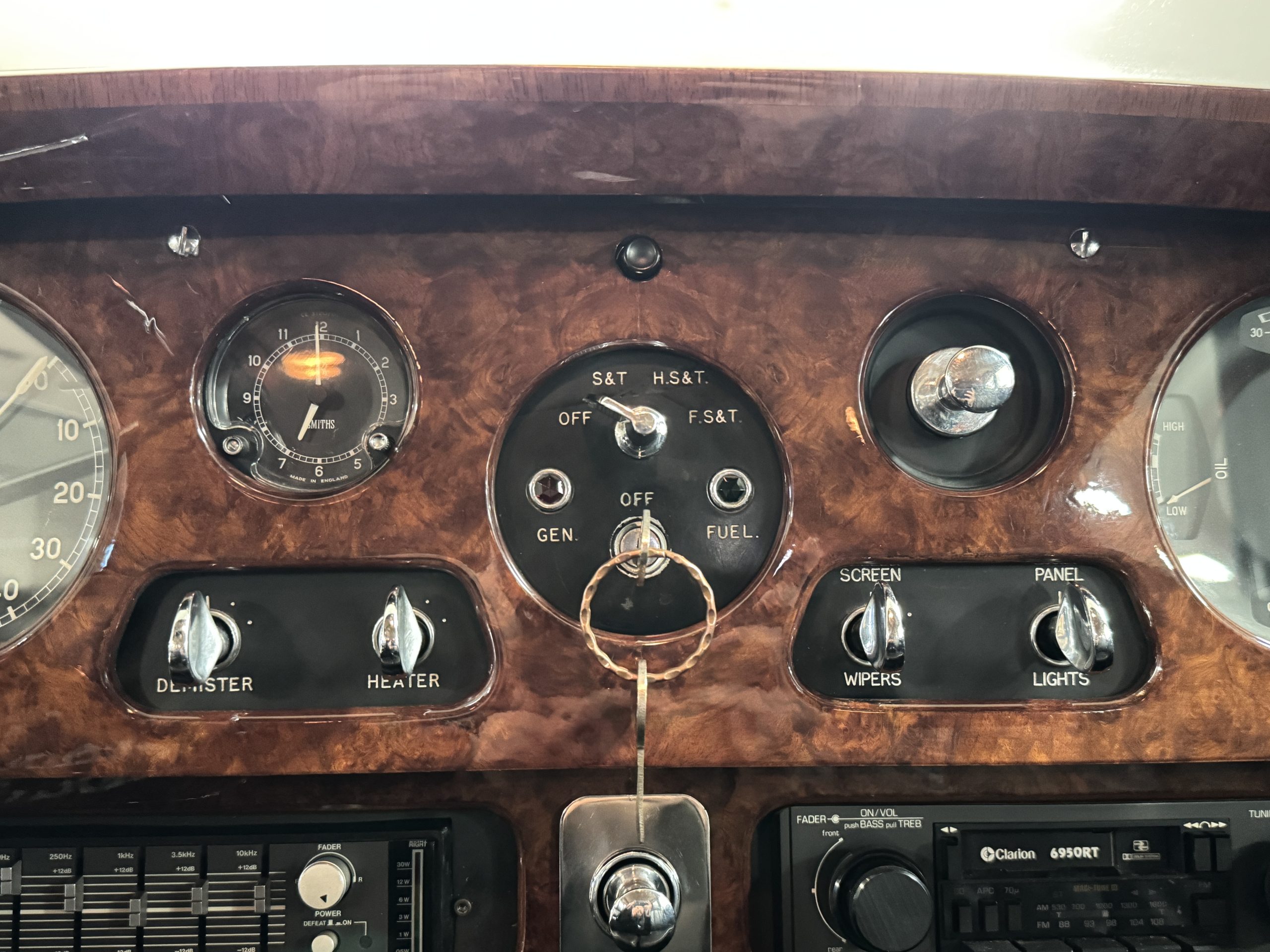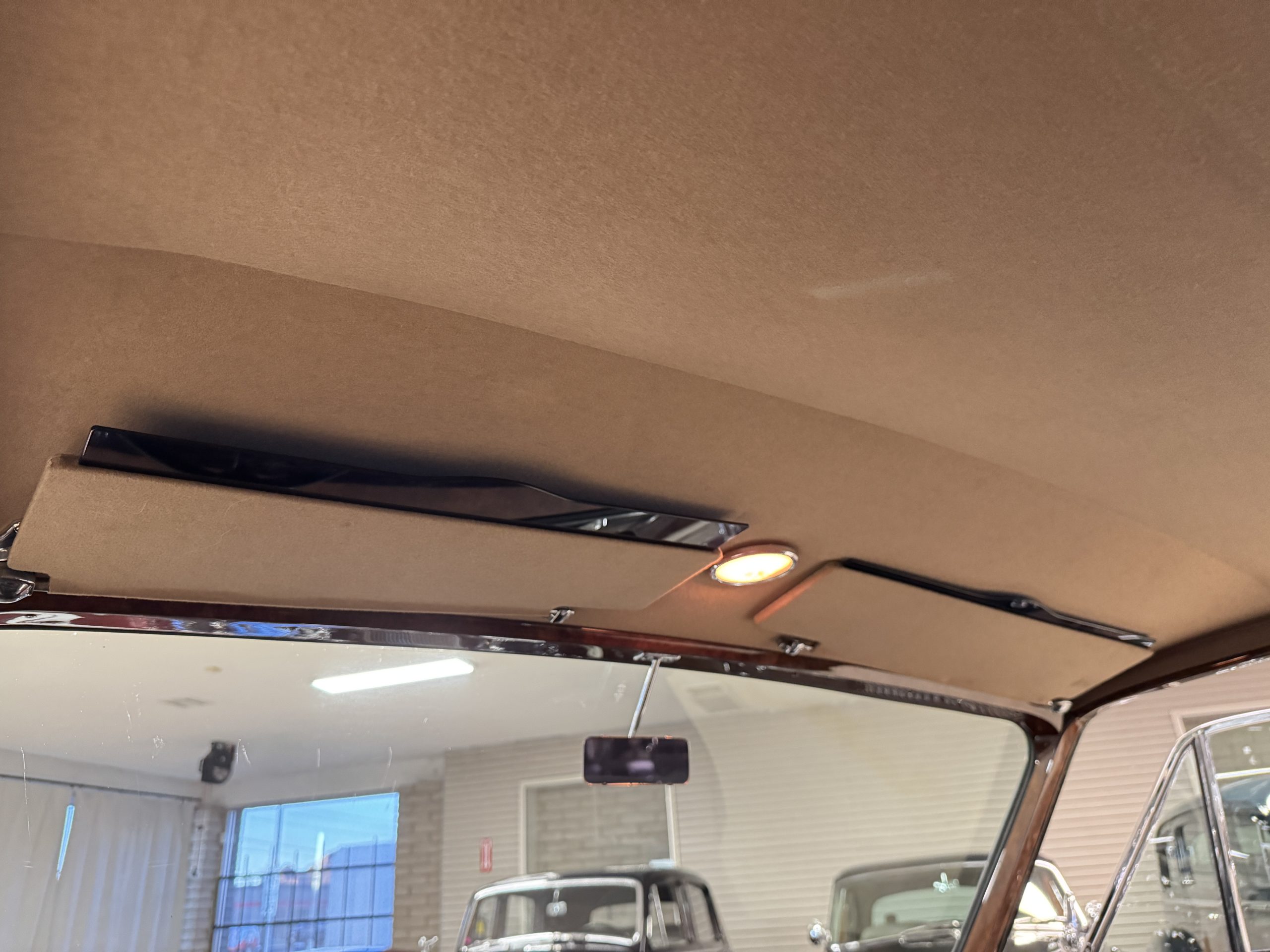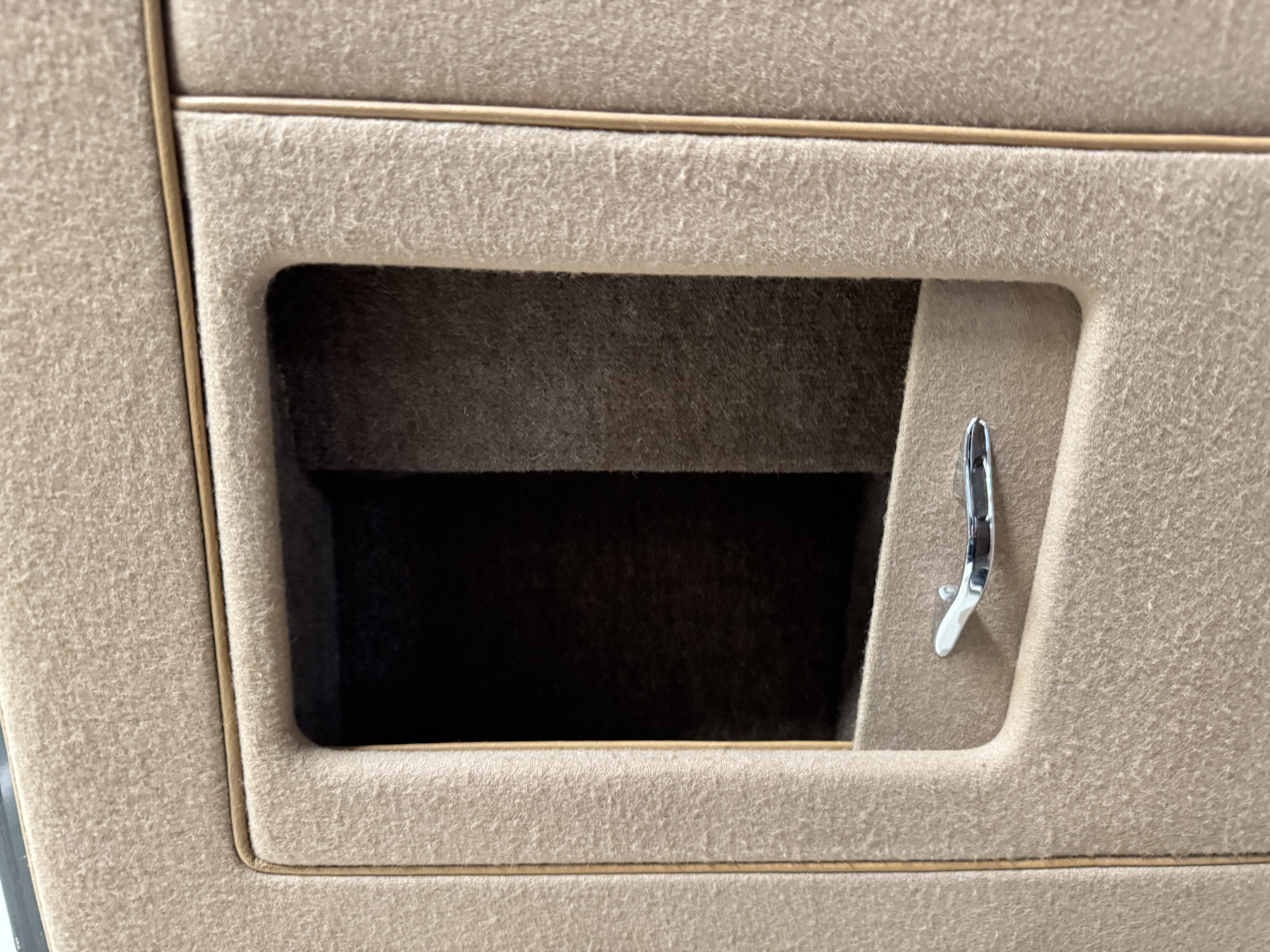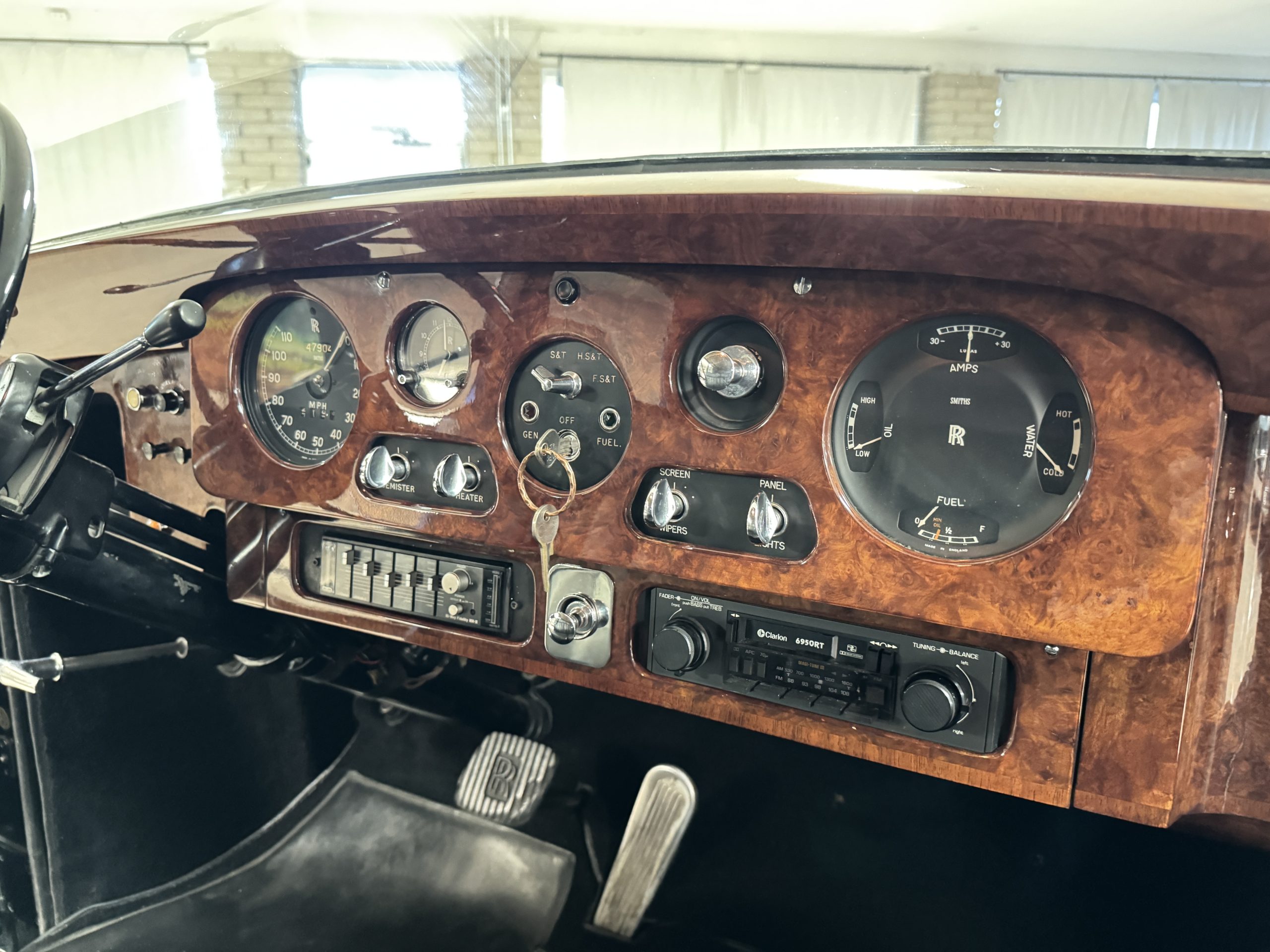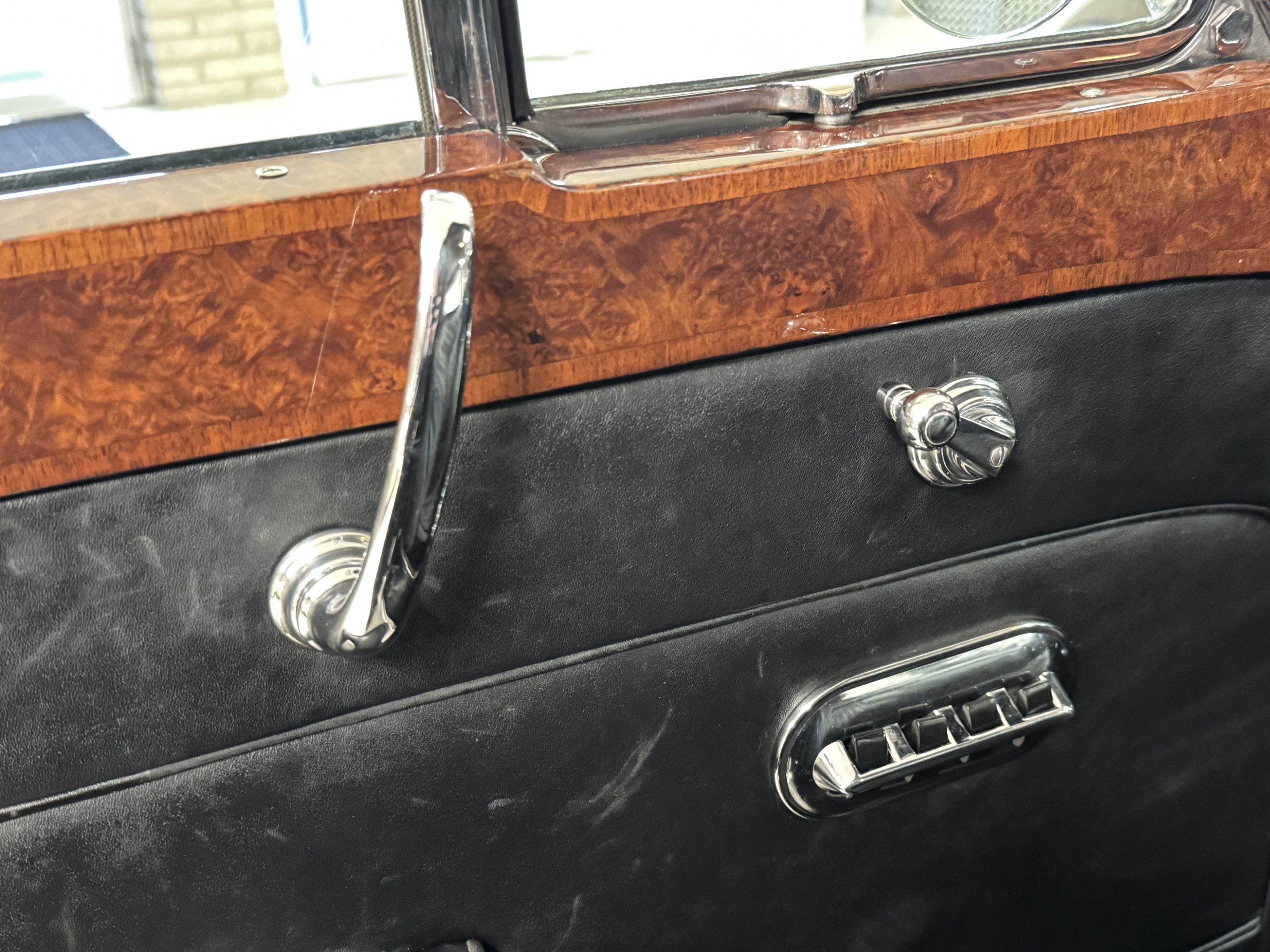 The interior is in overall beautiful condition.  All of the burl walnut trim has been painstakingly restored to showroom condition.  The chauffer’s compartment is finished in Black leather that is very soft and supple with normal creases with age.   The stereo has been updated with a more modern system.  The rear passenger compartment is all original tan wool broadcloth with complementary tan leather piping.  The upholstery is in excellent original condition with no soiling. The tan Wilton wool carpeting is also in very nice condition.  The center mirrored cocktail cabinet contains an original crystal decanter and two crystal glasses.  Above the cocktail cabinet is a separate compartment holding the Television.  Twin reading lamps, twin vanities and a Seth clock complete the amenities.  James Young coachbuilt Rolls-Royces always exhibit the most extraordinary book matched burlwood finishes.  This example, being built for their Earls Court exhibition, is just gorgeous.