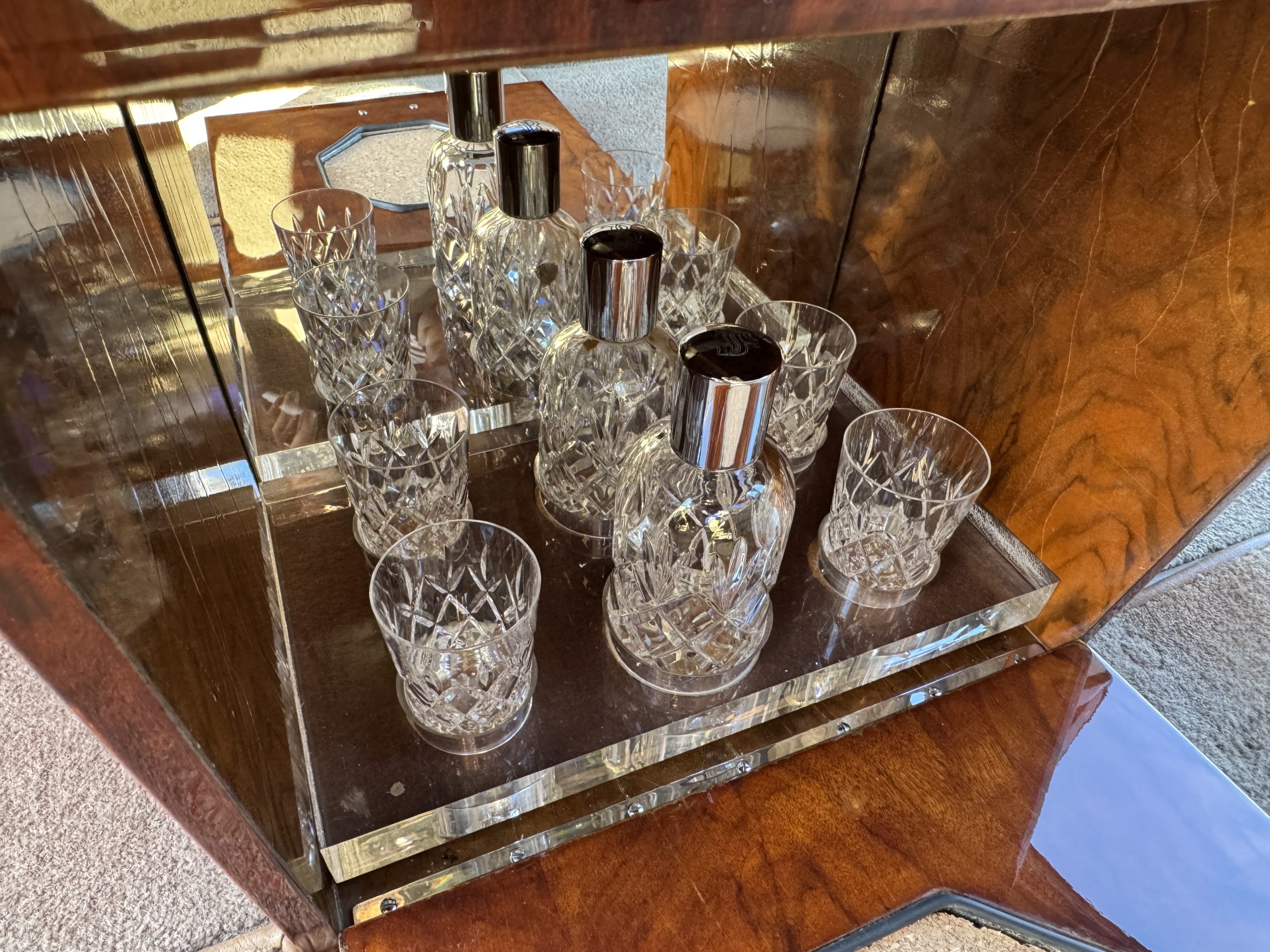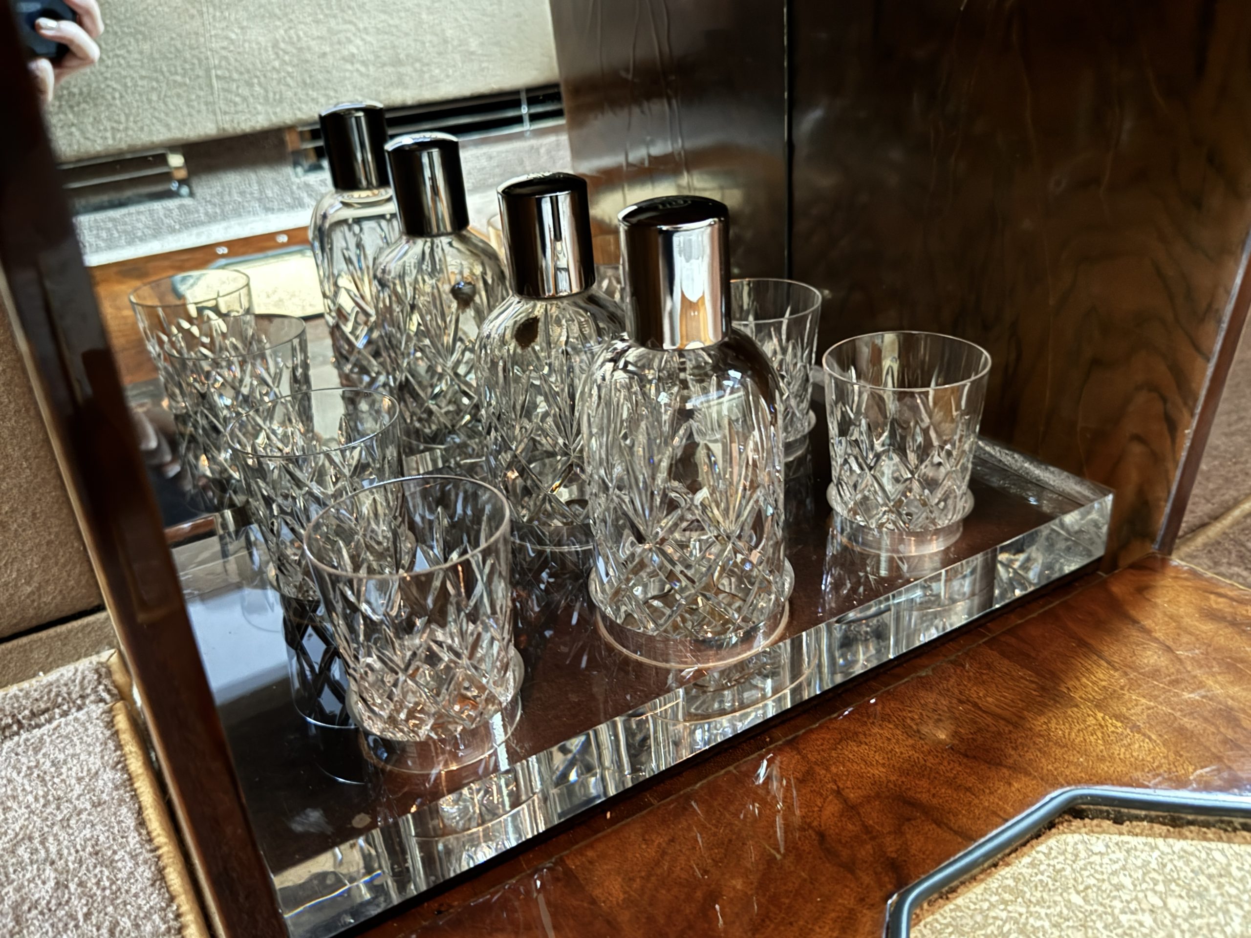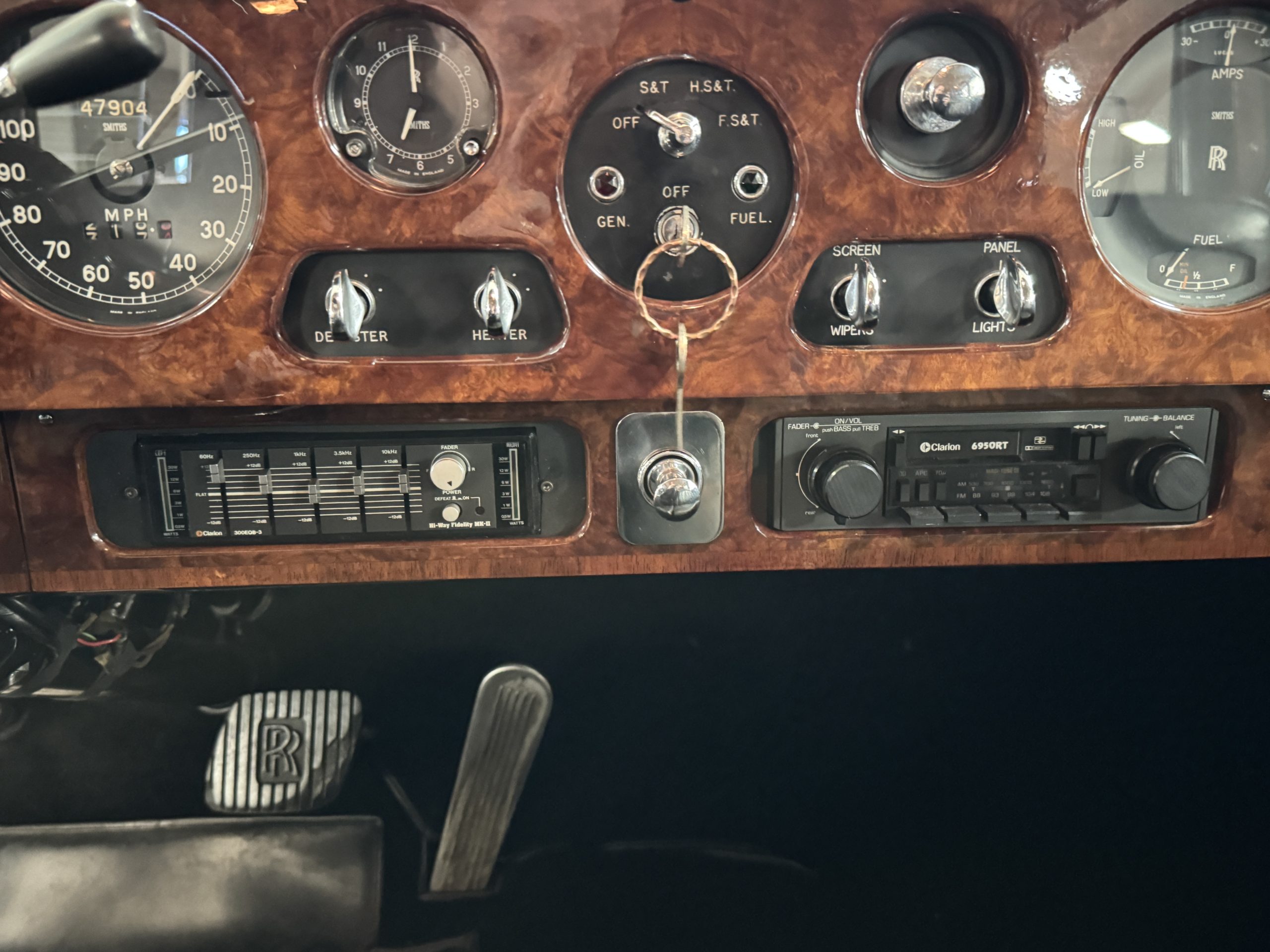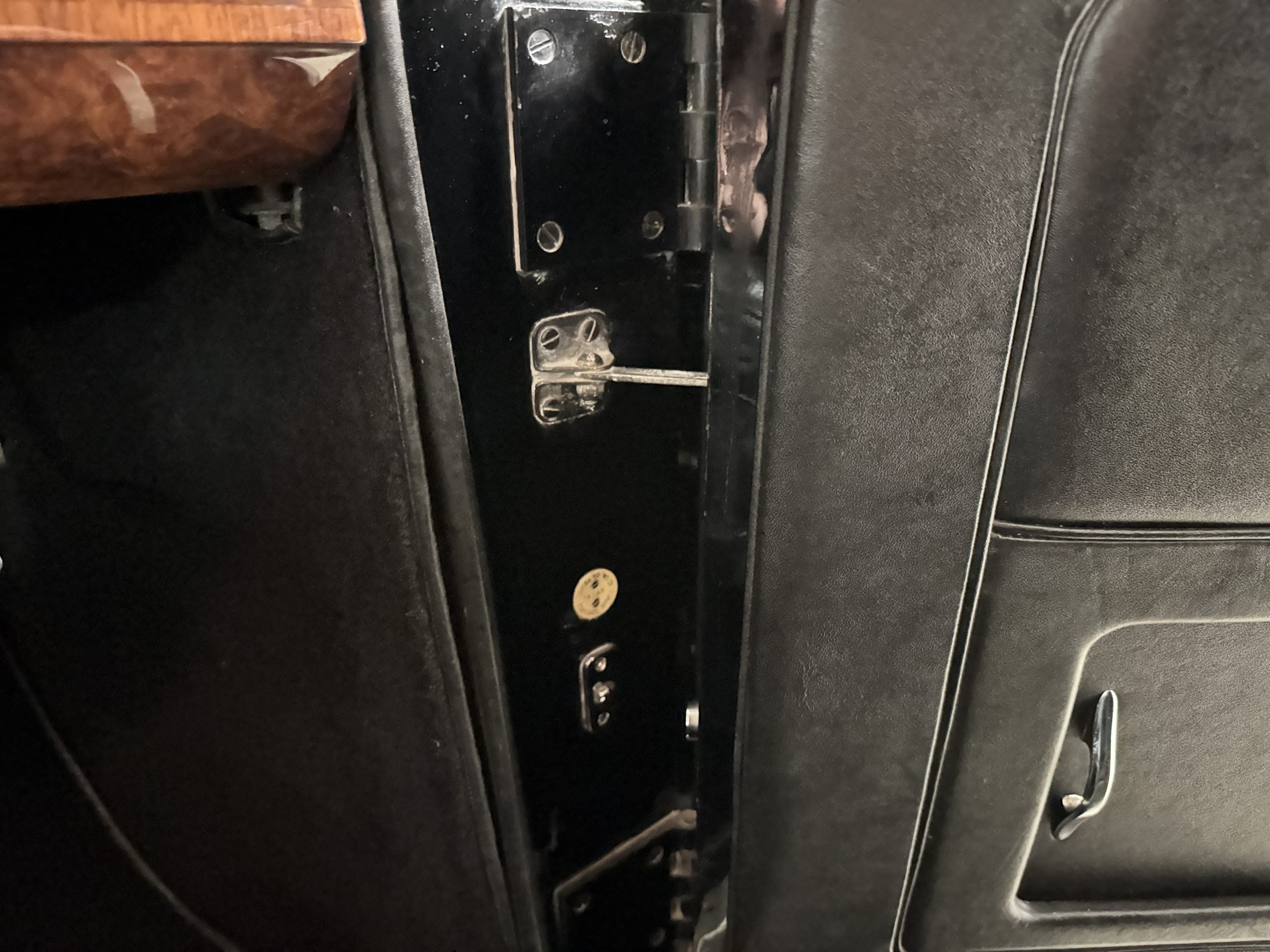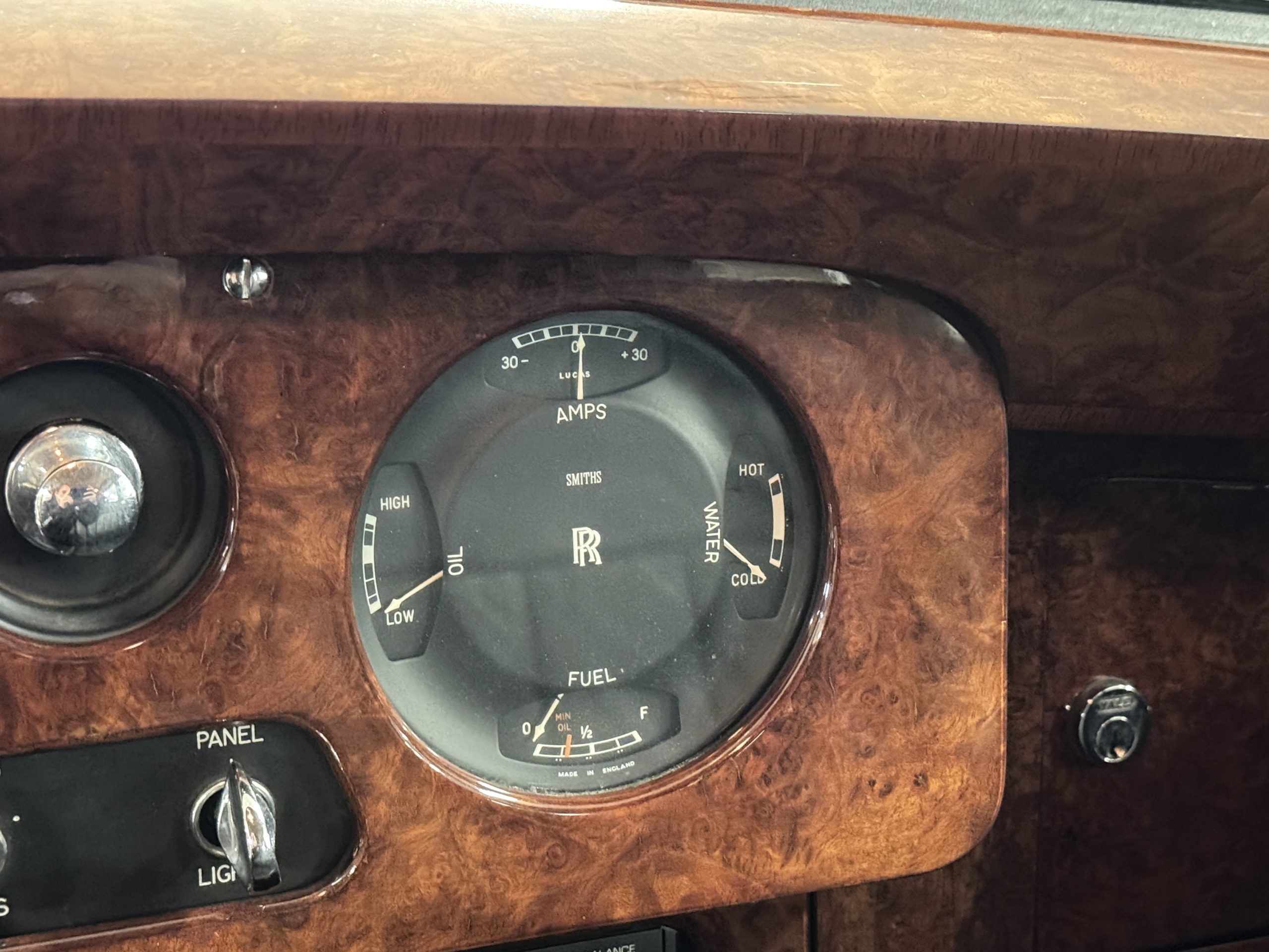 The interior is in overall beautiful condition.  All of the burl walnut trim has been painstakingly restored to showroom condition.  The chauffer’s compartment is finished in Black leather that is very soft and supple with normal creases with age.   The stereo has been updated with a more modern system.  The rear passenger compartment is all original tan wool broadcloth with complementary tan leather piping.  The upholstery is in excellent original condition with no soiling. The tan Wilton wool carpeting is also in very nice condition.  The center mirrored cocktail cabinet contains an original crystal decanter and two crystal glasses.  Above the cocktail cabinet is a separate compartment holding the Television.  Twin reading lamps, twin vanities and a Seth clock complete the amenities.  James Young coachbuilt Rolls-Royces always exhibit the most extraordinary book matched burlwood finishes.  This example, being built for their Earls Court exhibition, is just gorgeous.
