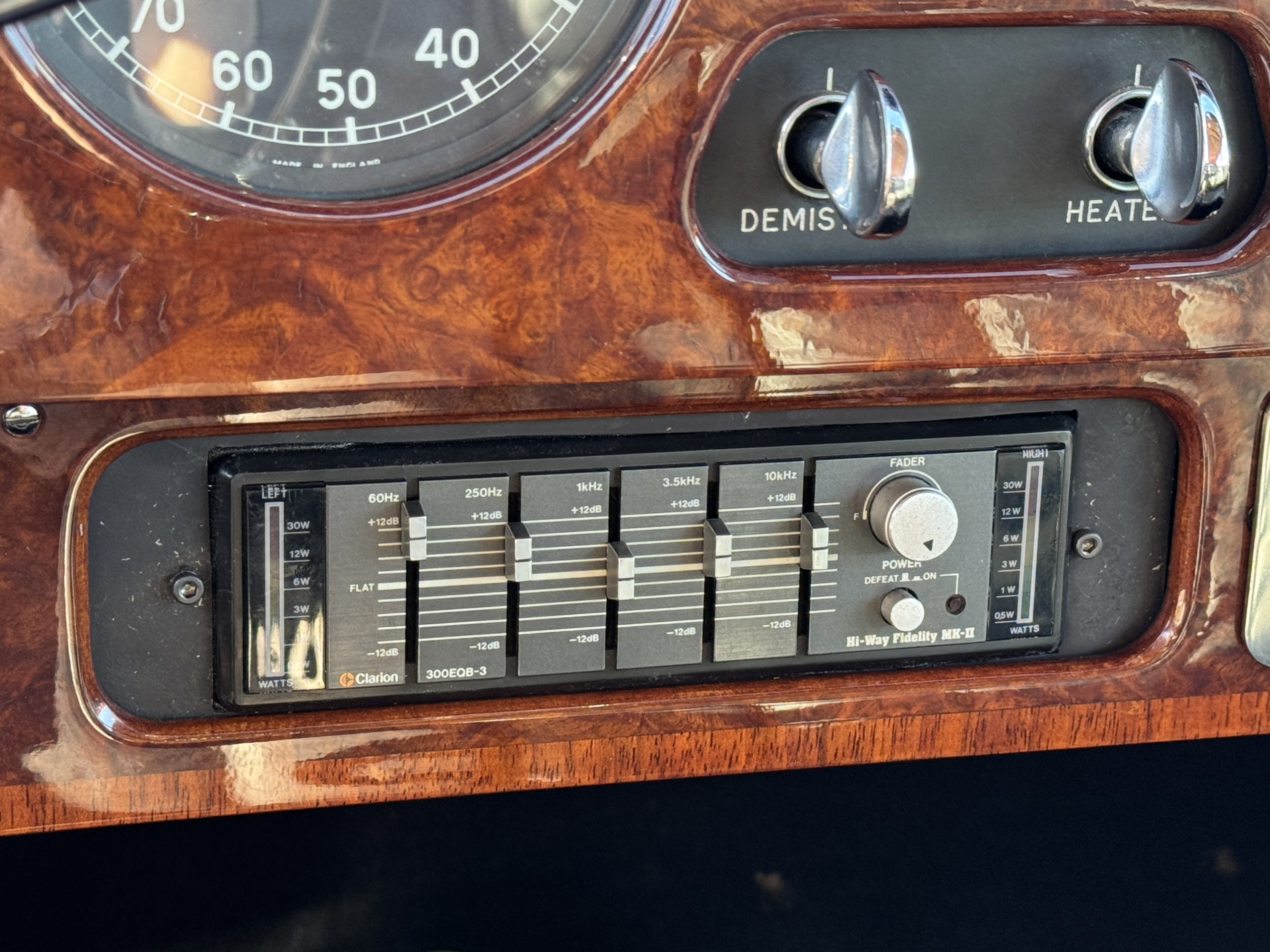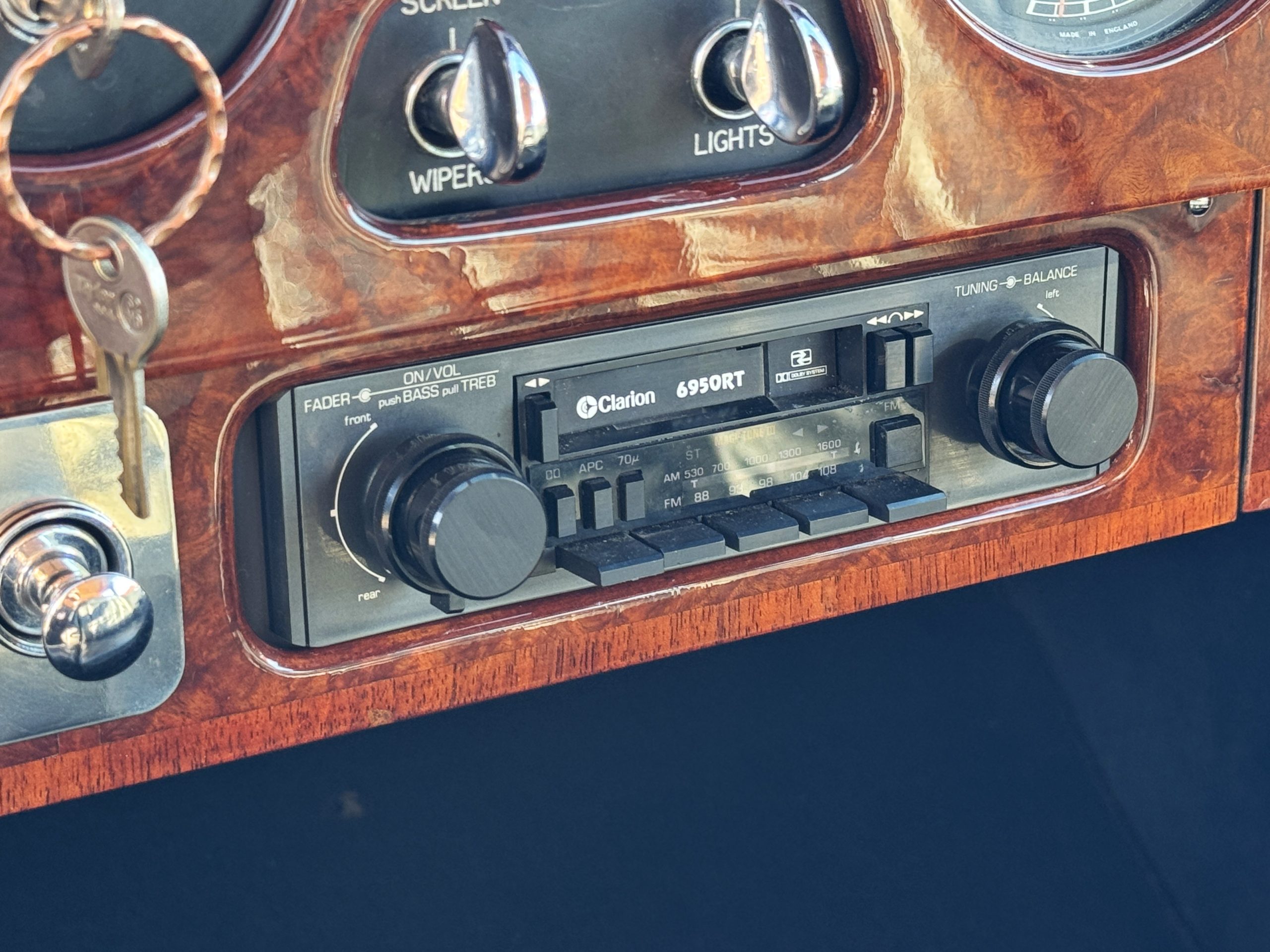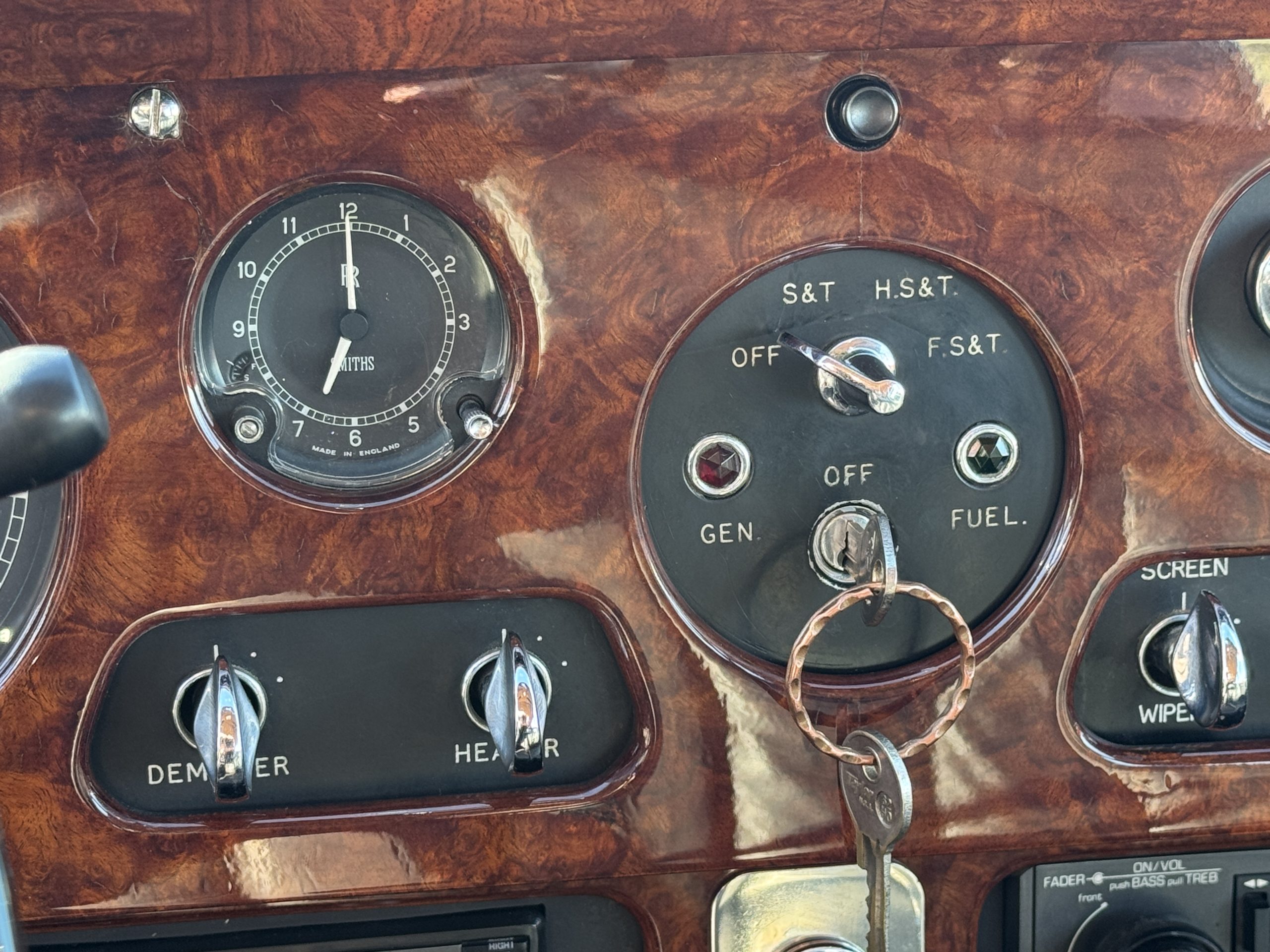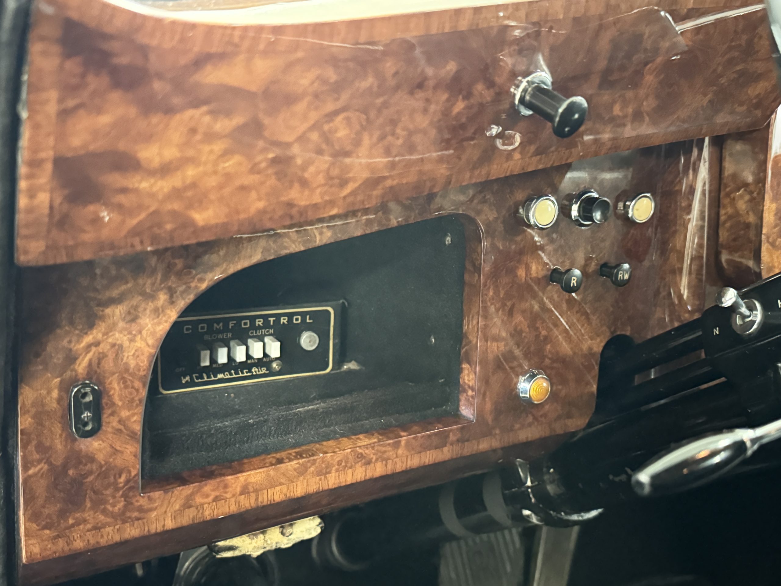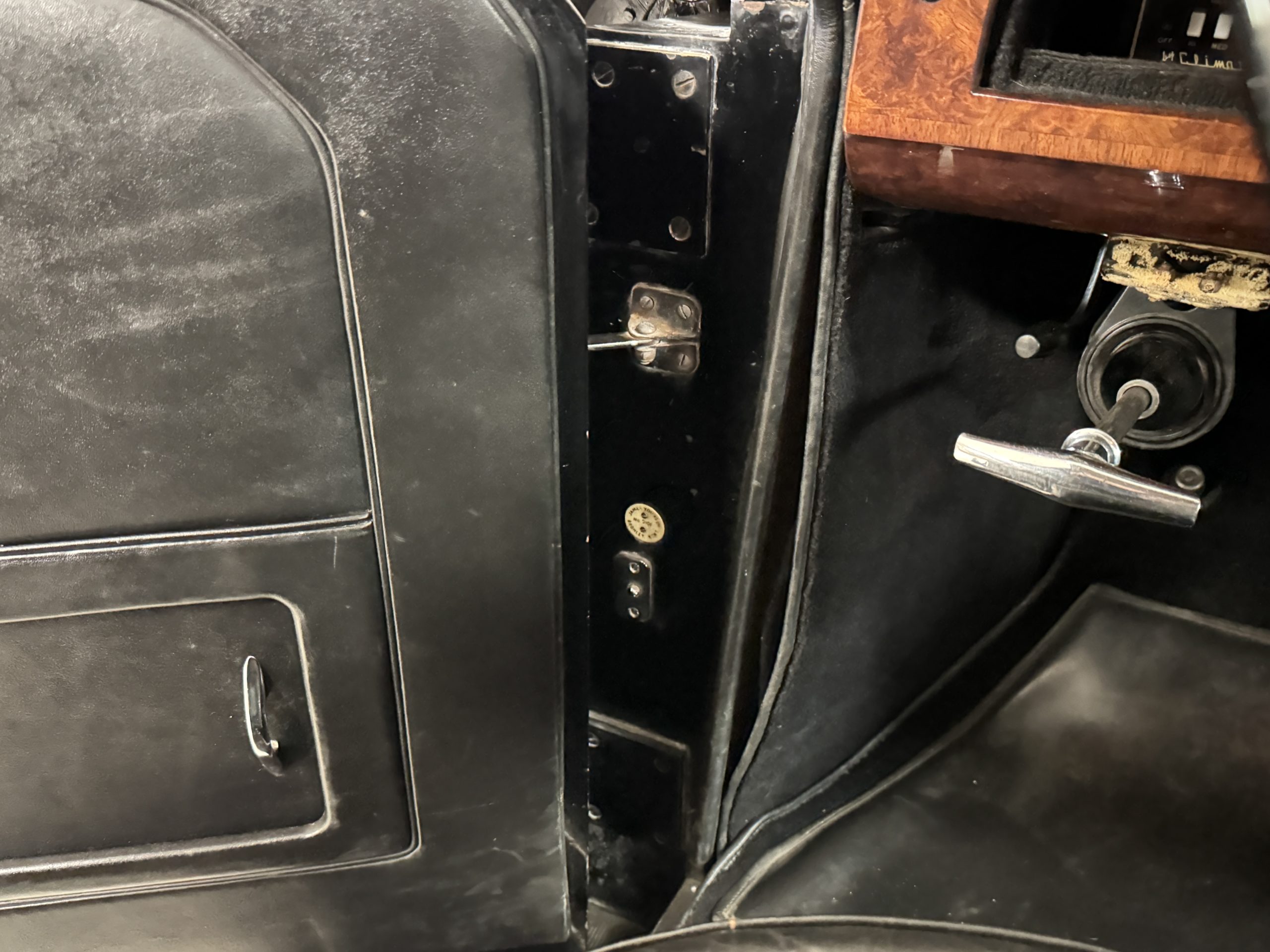 The interior is in overall beautiful condition.  All of the burl walnut trim has been painstakingly restored to showroom condition.  The chauffer’s compartment is finished in Black leather that is very soft and supple with normal creases with age.   The stereo has been updated with a more modern system.  The rear passenger compartment is all original tan wool broadcloth with complementary tan leather piping.  The upholstery is in excellent original condition with no soiling. The tan Wilton wool carpeting is also in very nice condition.  The center mirrored cocktail cabinet contains an original crystal decanter and two crystal glasses.  Above the cocktail cabinet is a separate compartment holding the Television.  Twin reading lamps, twin vanities and a Seth clock complete the amenities.  James Young coachbuilt Rolls-Royces always exhibit the most extraordinary book matched burlwood finishes.  This example, being built for their Earls Court exhibition, is just gorgeous.