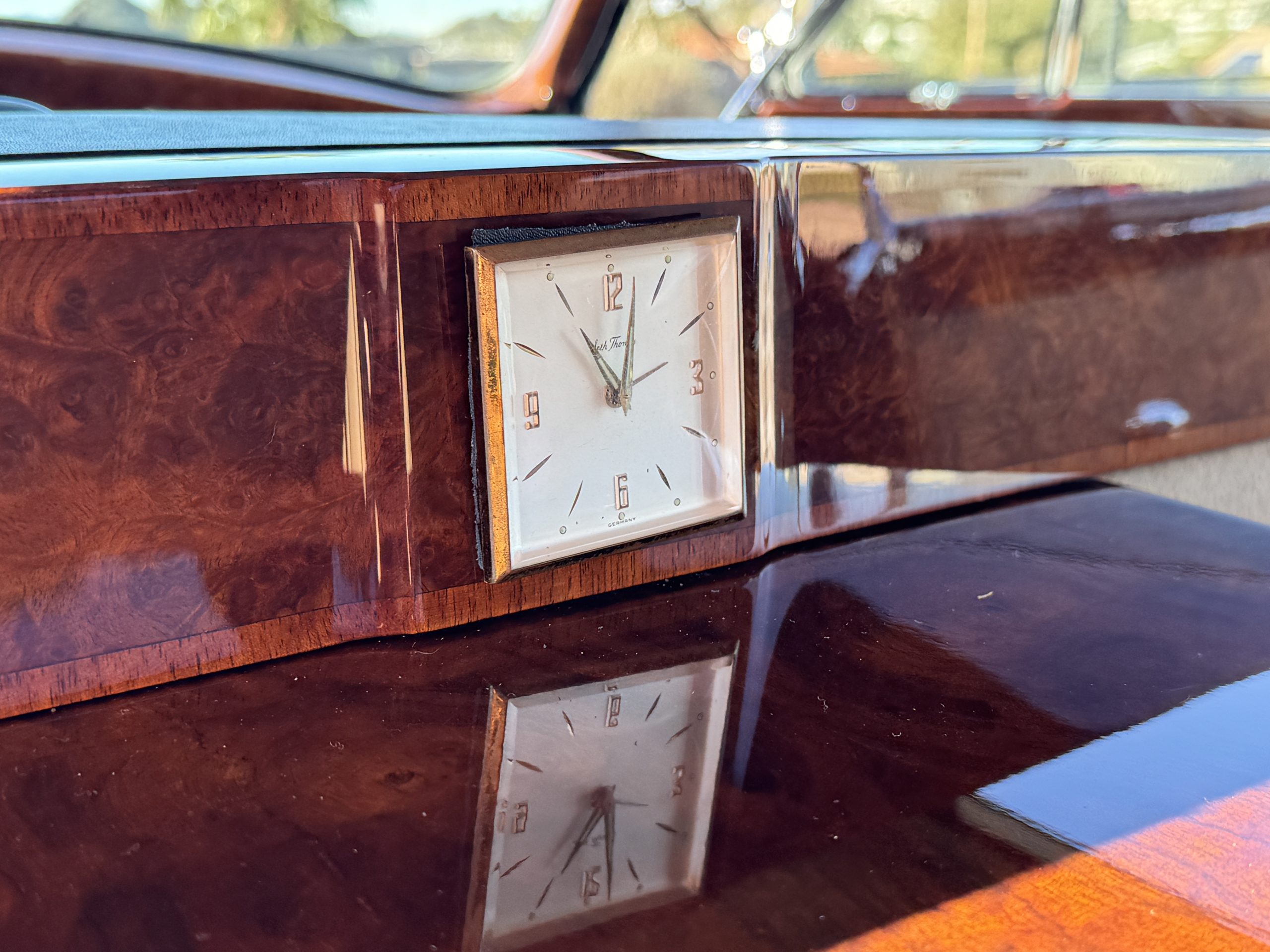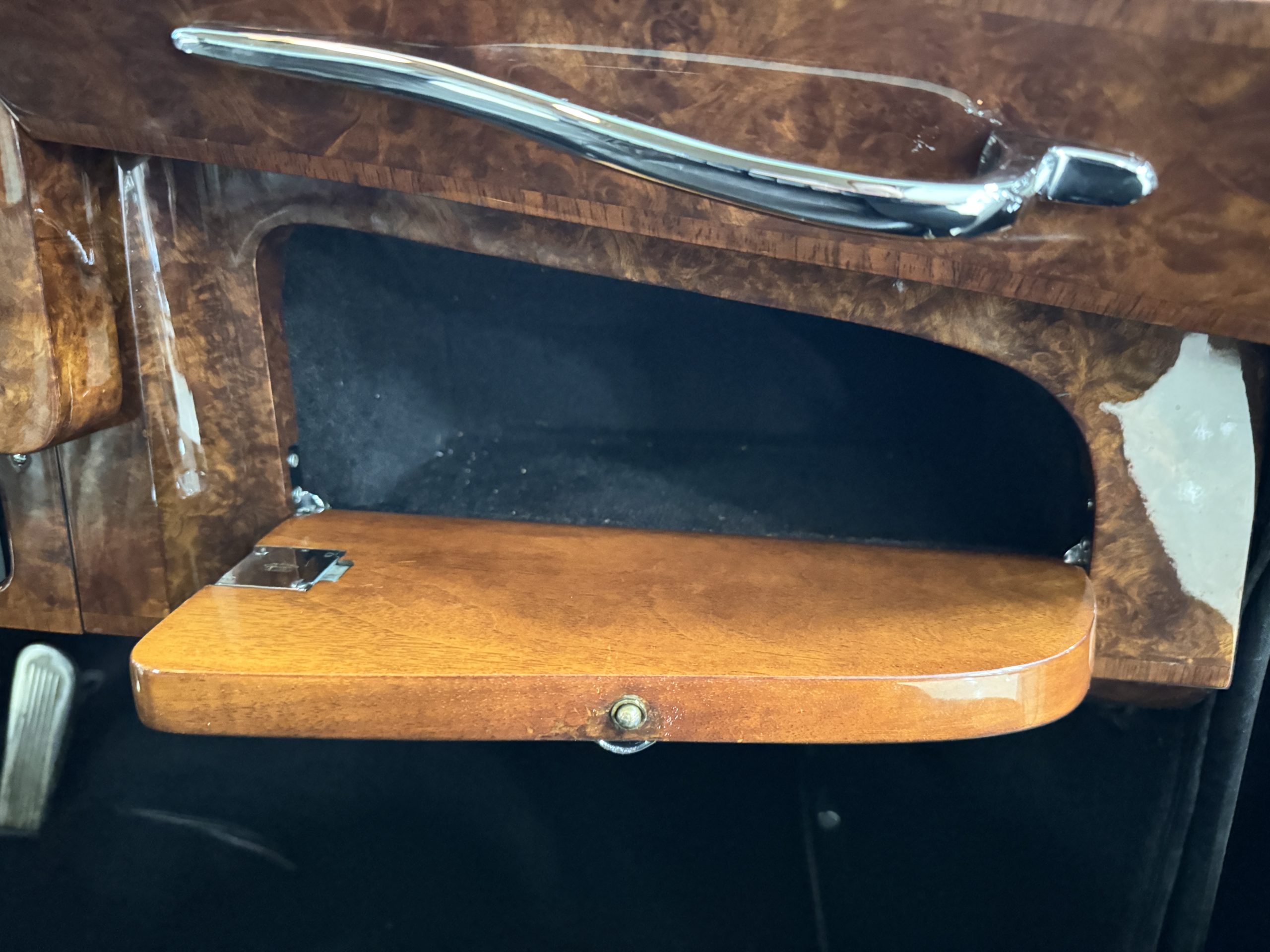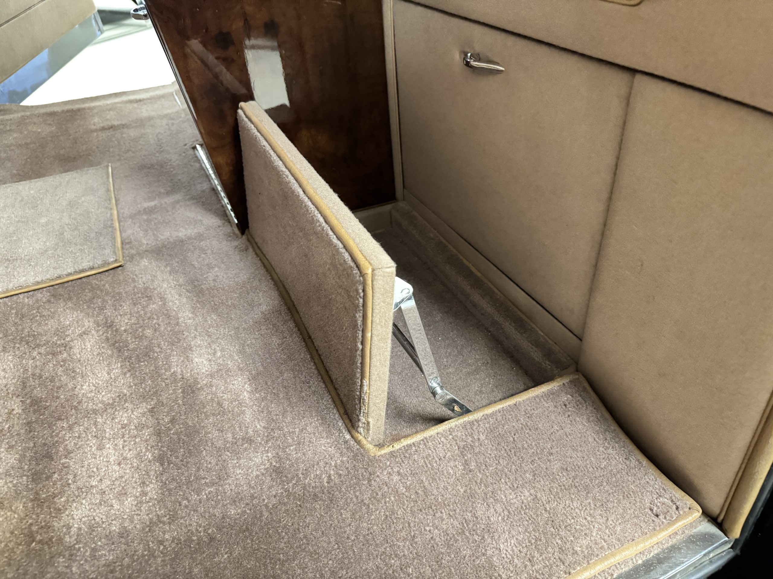 The interior is in overall beautiful condition. All of the burl walnut trim has been painstakingly restored to showroom condition. The chauffer’s compartment is finished in Black leather that is very soft and supple with normal creases with age. The stereo has been updated with a more modern system. The rear passenger compartment is all original tan wool broadcloth with complementary tan leather piping. The upholstery is in excellent original condition with no soiling. The two rear facing jump seats allow for a total of seven passengers. The tan Wilton wool carpeting is also in very nice condition. The center mirrored cocktail cabinet contains an original crystal decanter and two crystal glasses. Above the cocktail cabinet is a separate compartment holding the Television. Twin reading lamps, twin vanities and a Seth clock complete the amenities. James Young coachbuilt Rolls-Royces always exhibit the most extraordinary book matched burlwood finishes. This example, being built for their Earls Court exhibition, is just gorgeous.
