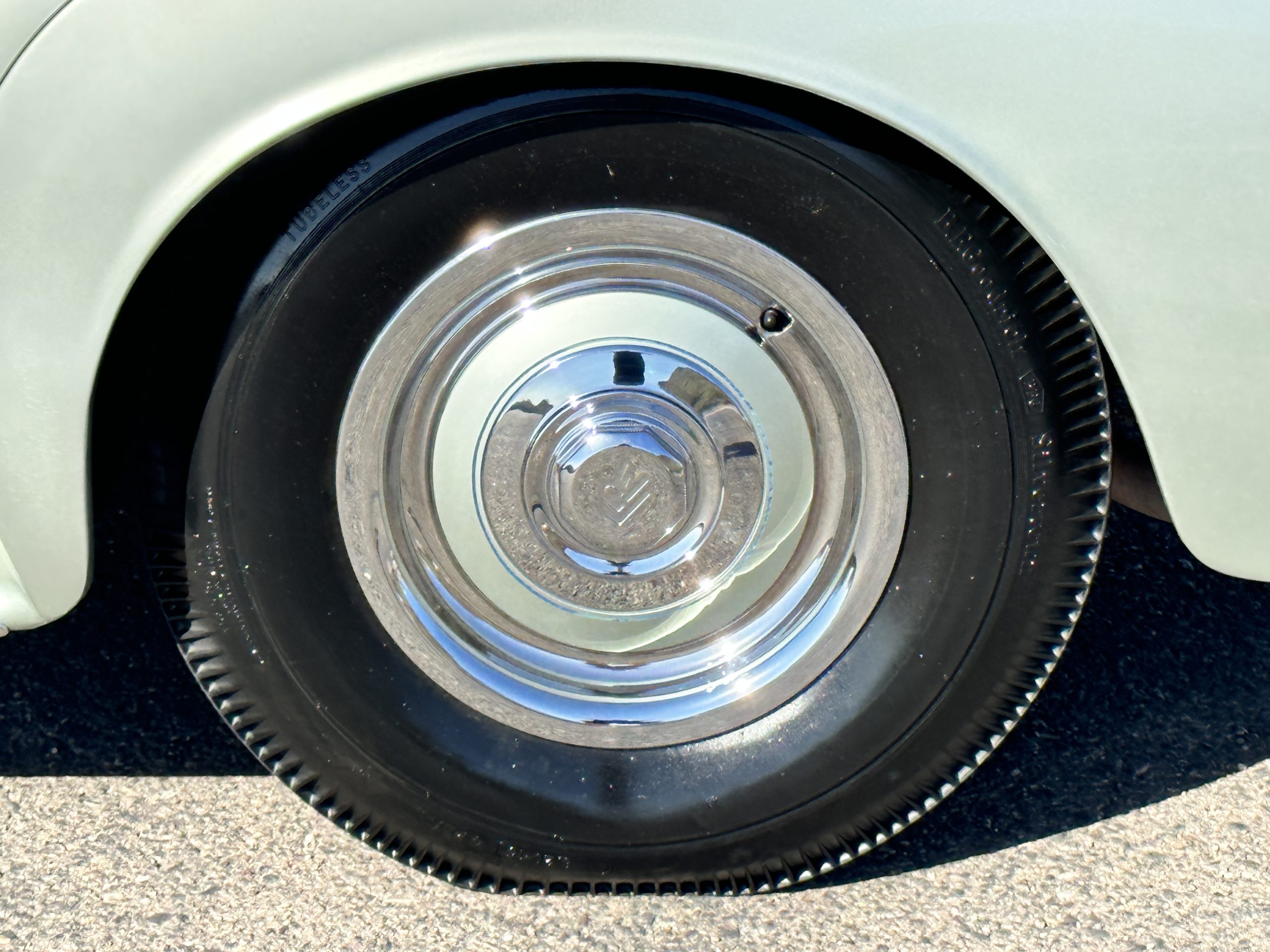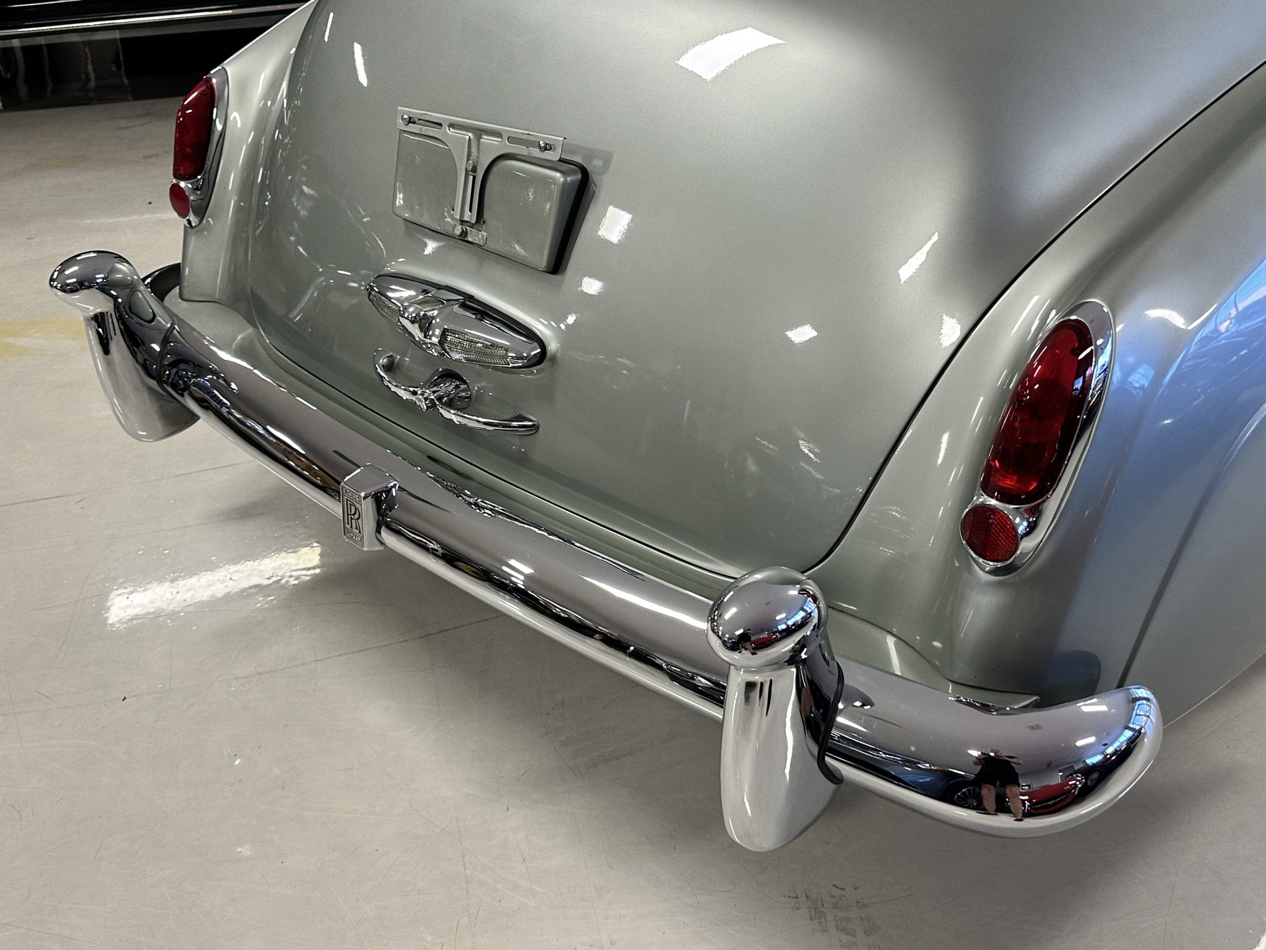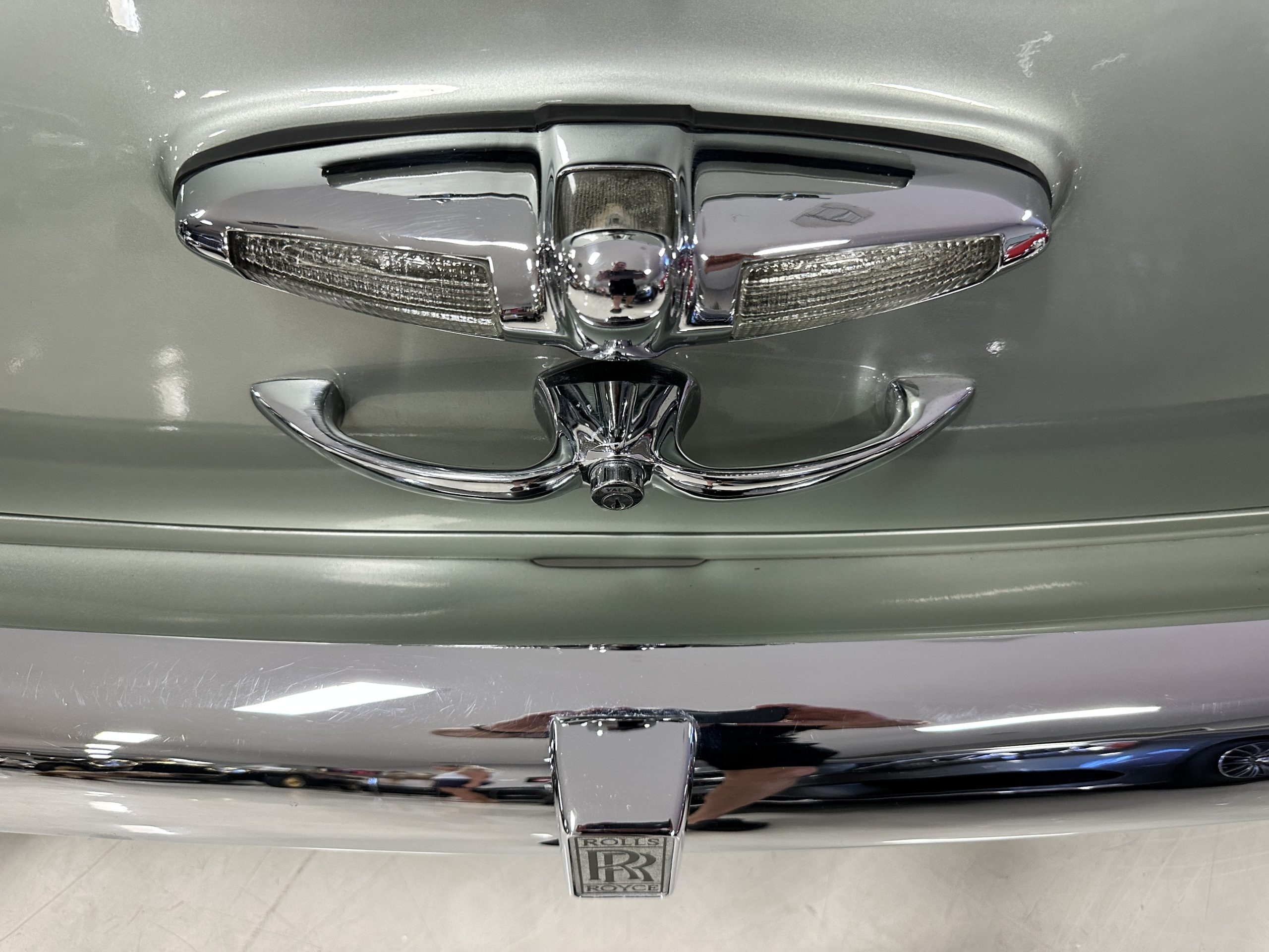 The Shell Gray metallic paint is nearly perfect. The shine and luster are excellent with very few imperfections. The paint is what we would consider concours for such an original motorcar. The Shell Gray is complemented with a proper beautiful blue pinstripe. The chrome and stainless steel are also excellent. We love the black walled tires, which just look right on this Rolls.