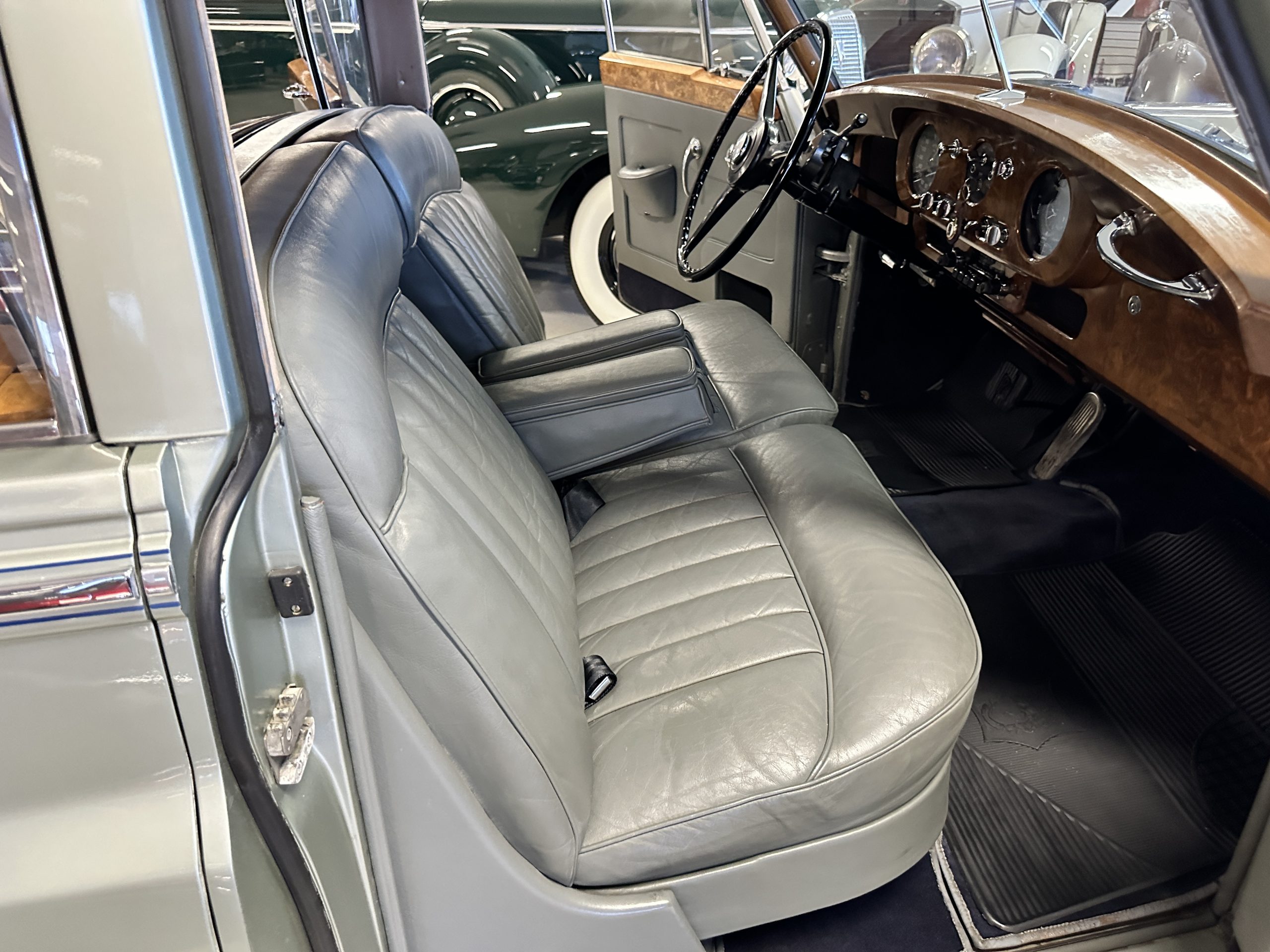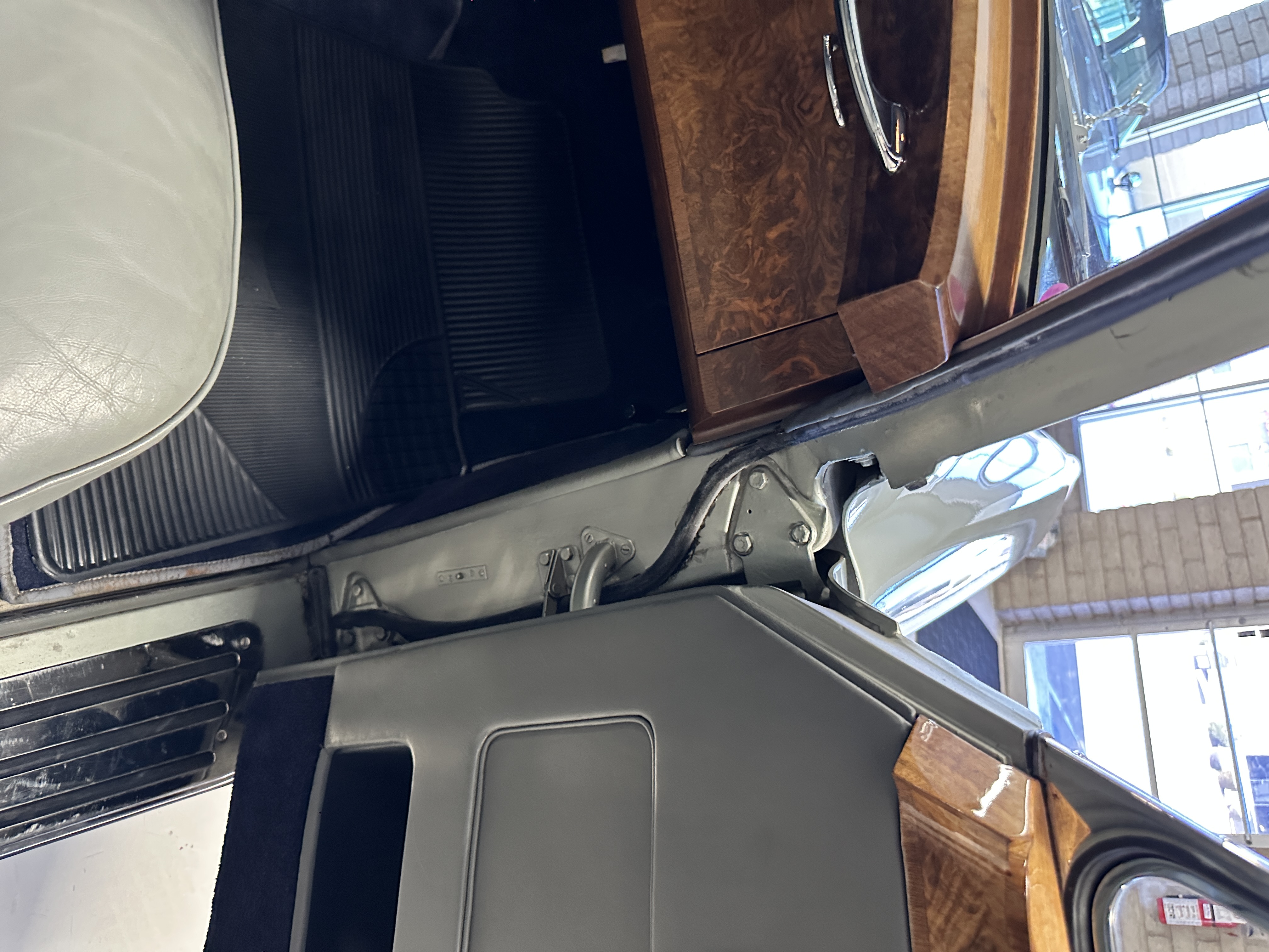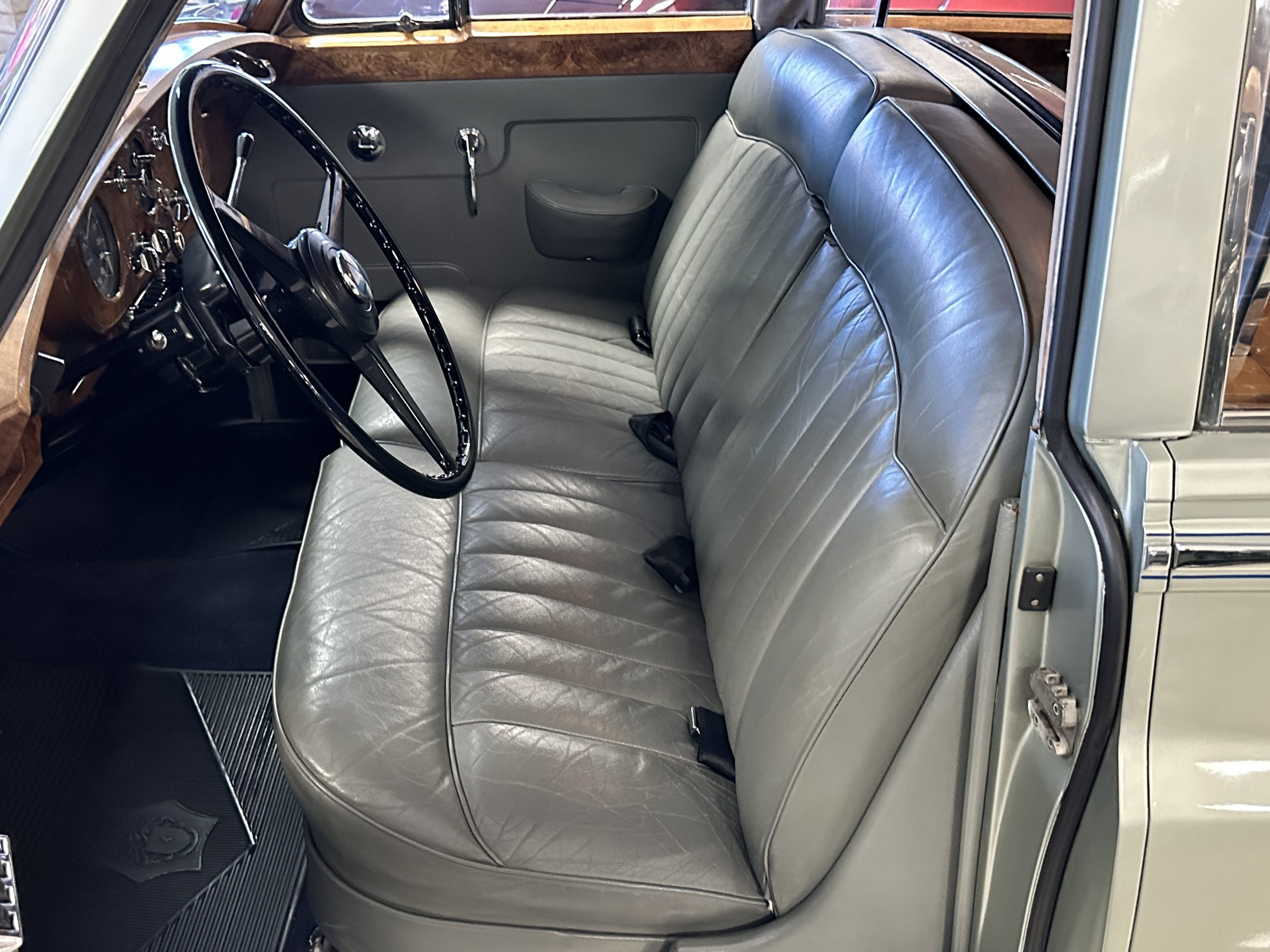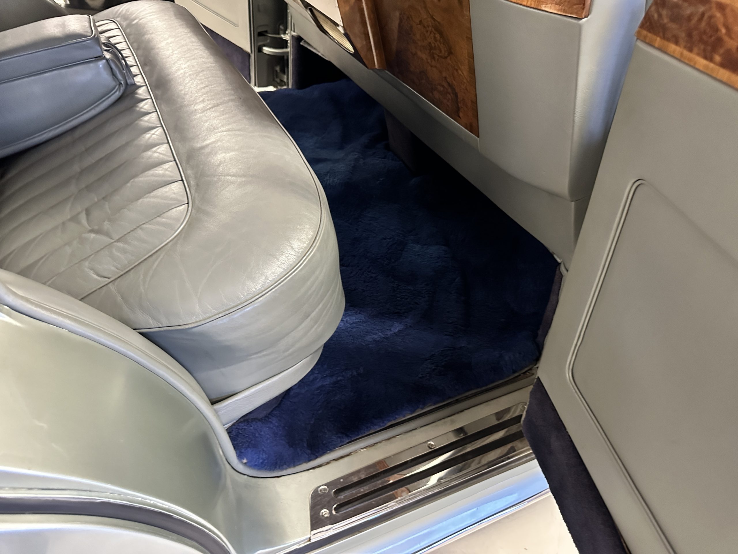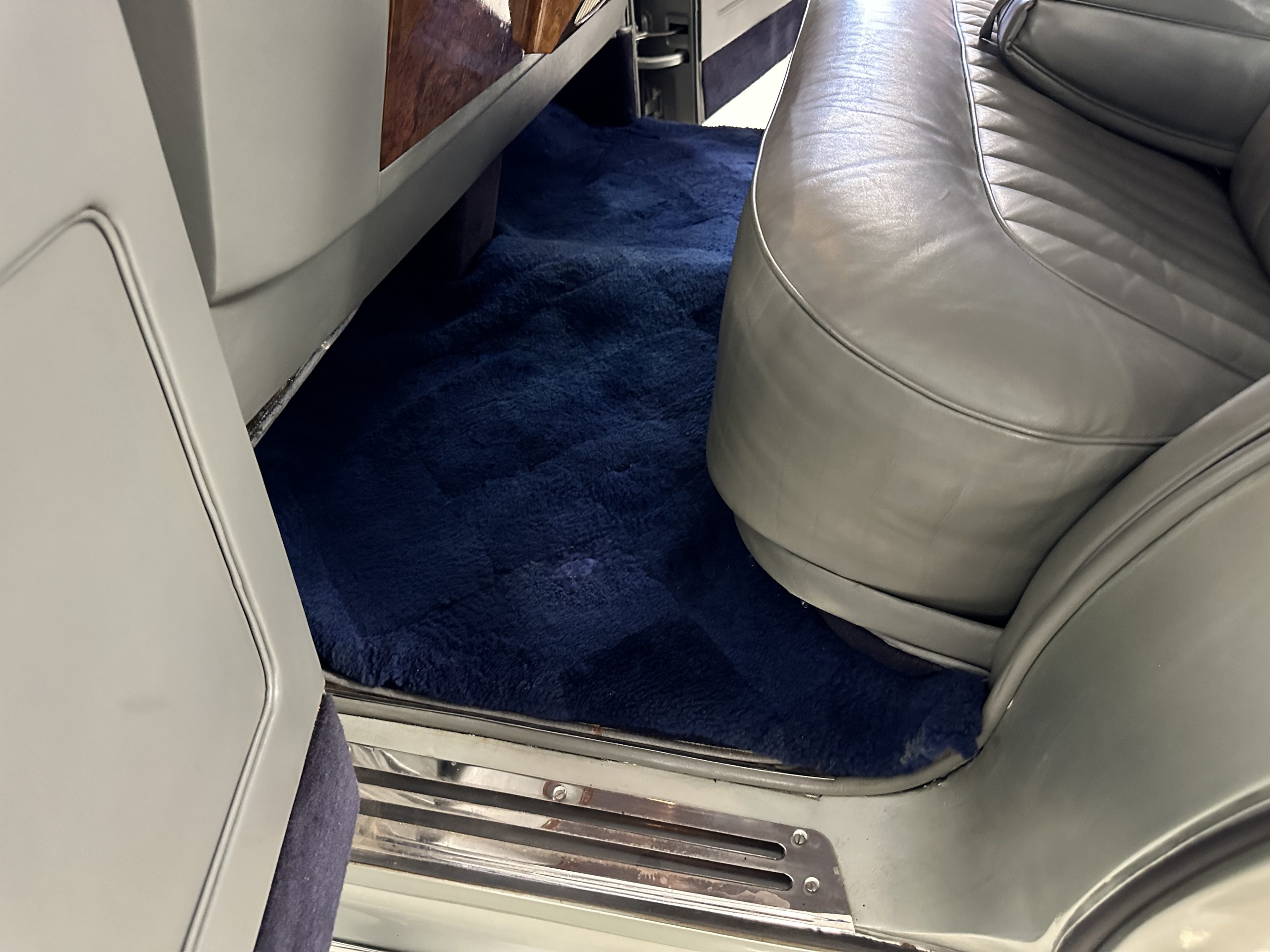 The Gray Leather interior is beautiful today and is very soft and supple. The leather was replaced in 1988 when Mrs. Roger restored her Rolls. The leather is in very nice condition today with only normal creases from occasional use and loved maintenance. The burl Walnut wood throughout was refinished in 1988 and looks fantastic today. The original Blue Wilton wool carpeting in the front compartment could benefit from replacement as it is original and shows wear. The rear passenger compartment features a lovely original sheepskin mouton overlay with a special diamond pattern.
