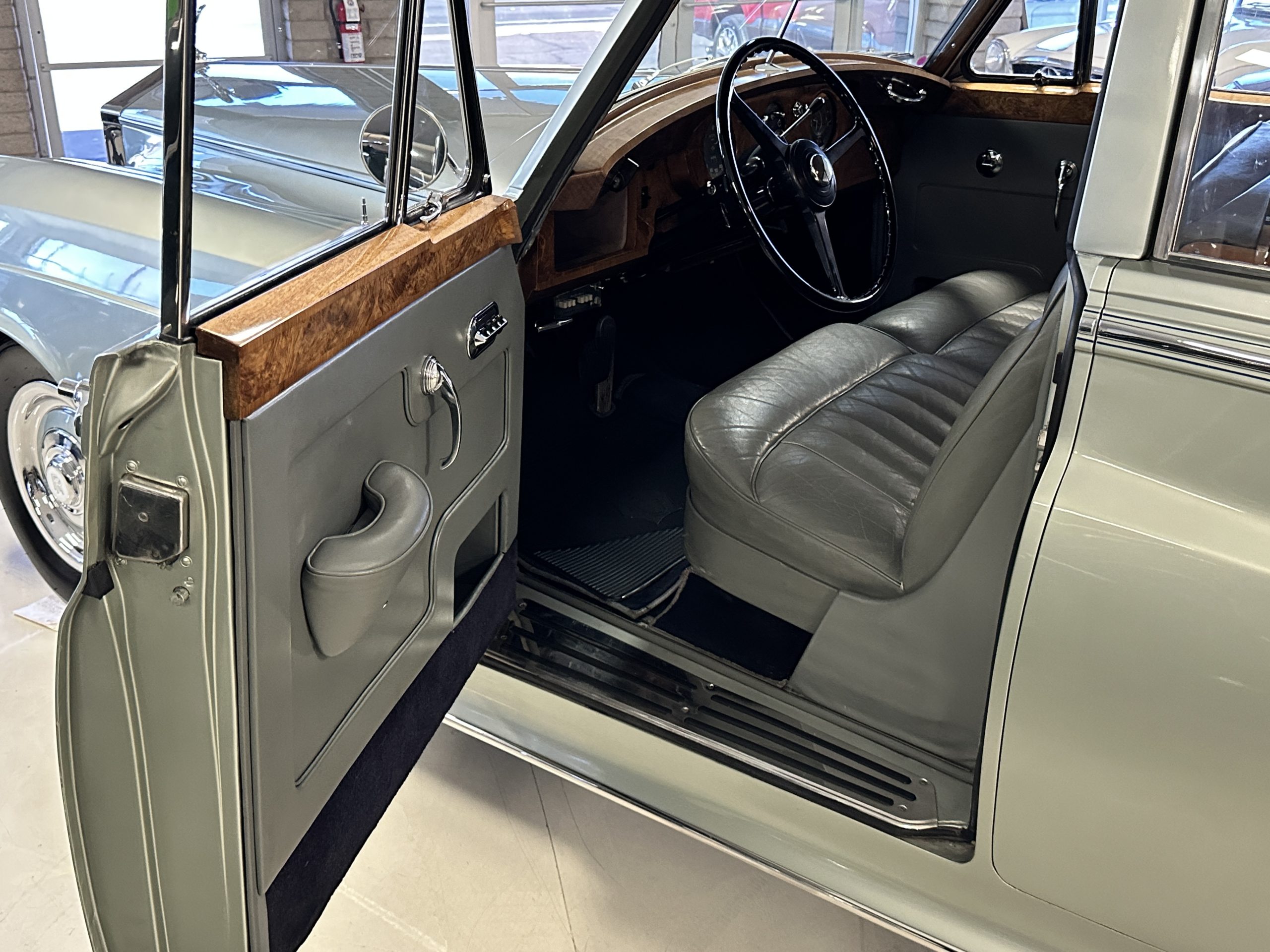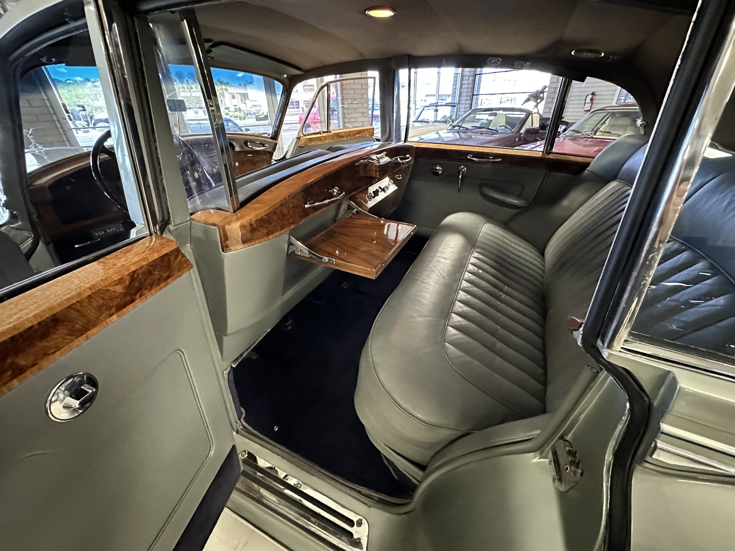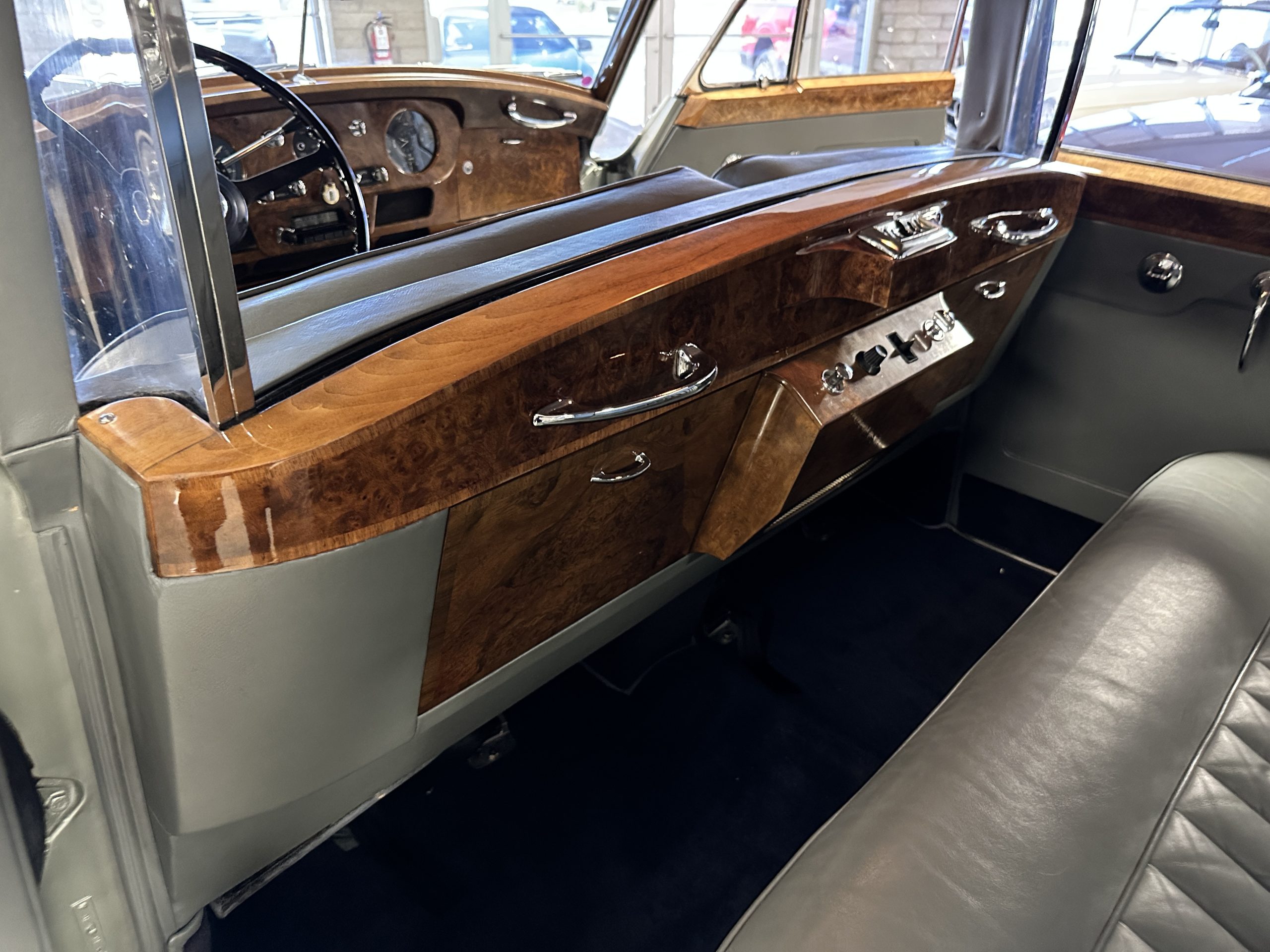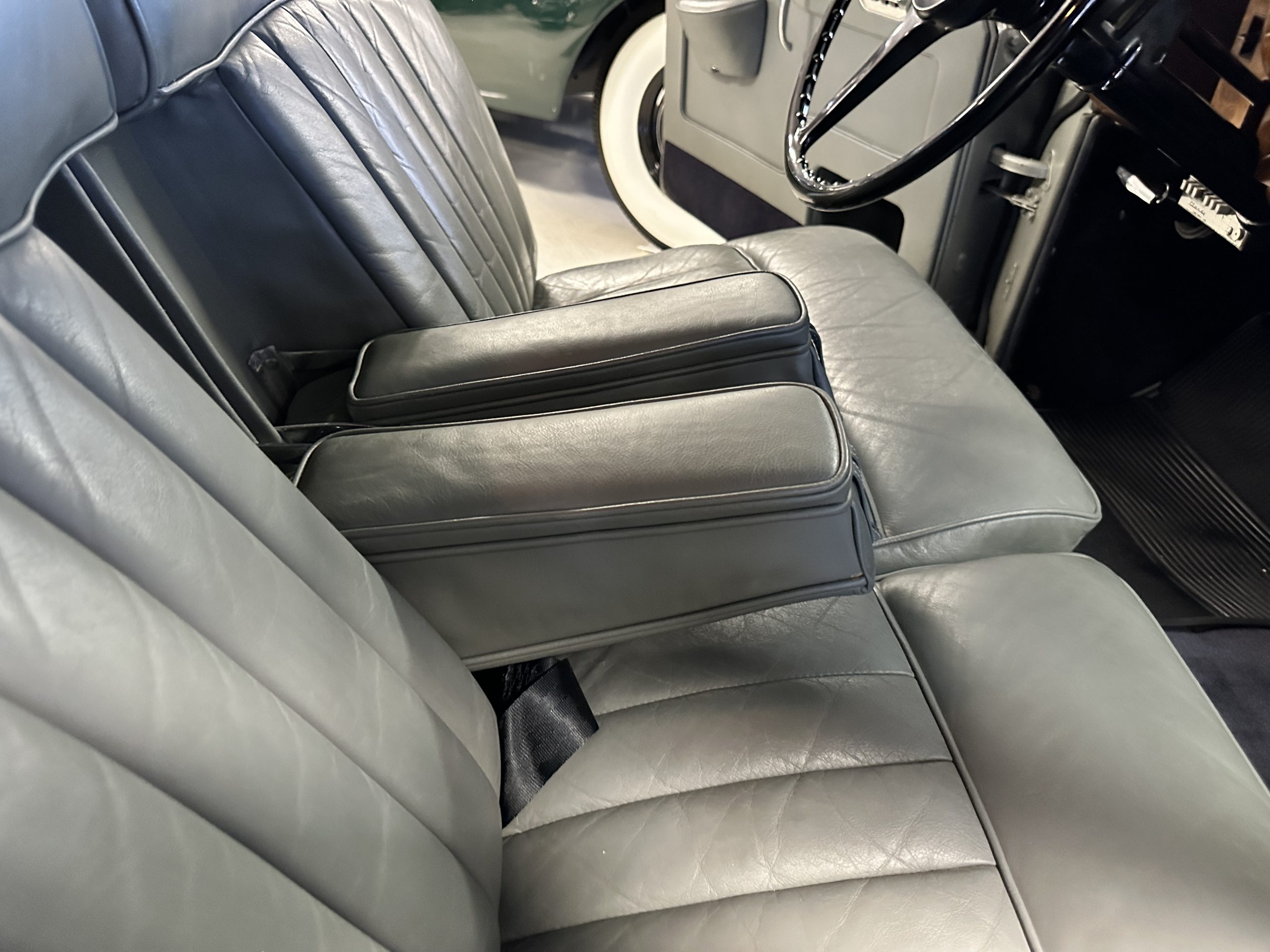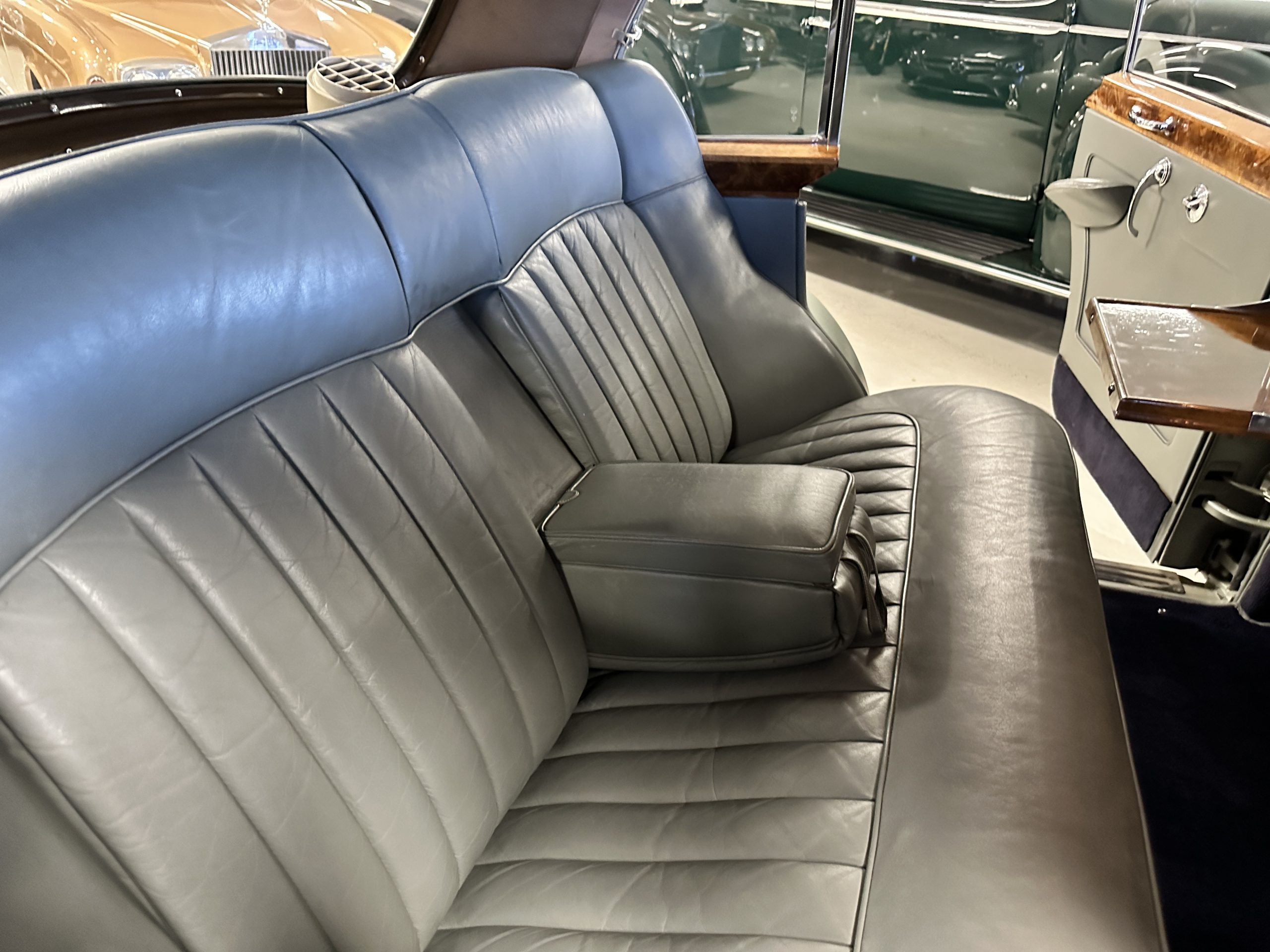 The Gray Leather interior is beautiful today and is very soft and supple. The leather was replaced in 1988 when Mrs. Roger restored her Rolls. The leather is in very nice condition today with only normal creases from occasional use and loved maintenance. The burl Walnut wood throughout was refinished in 1988 and looks fantastic today. The original Blue Wilton wool carpeting in the front compartment could benefit from replacement as it is original and shows wear. The rear passenger compartment features a lovely original sheepskin mouton overlay with a special diamond pattern.