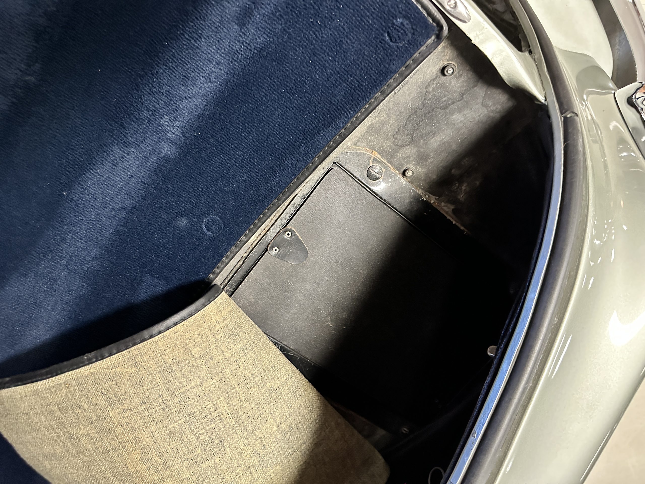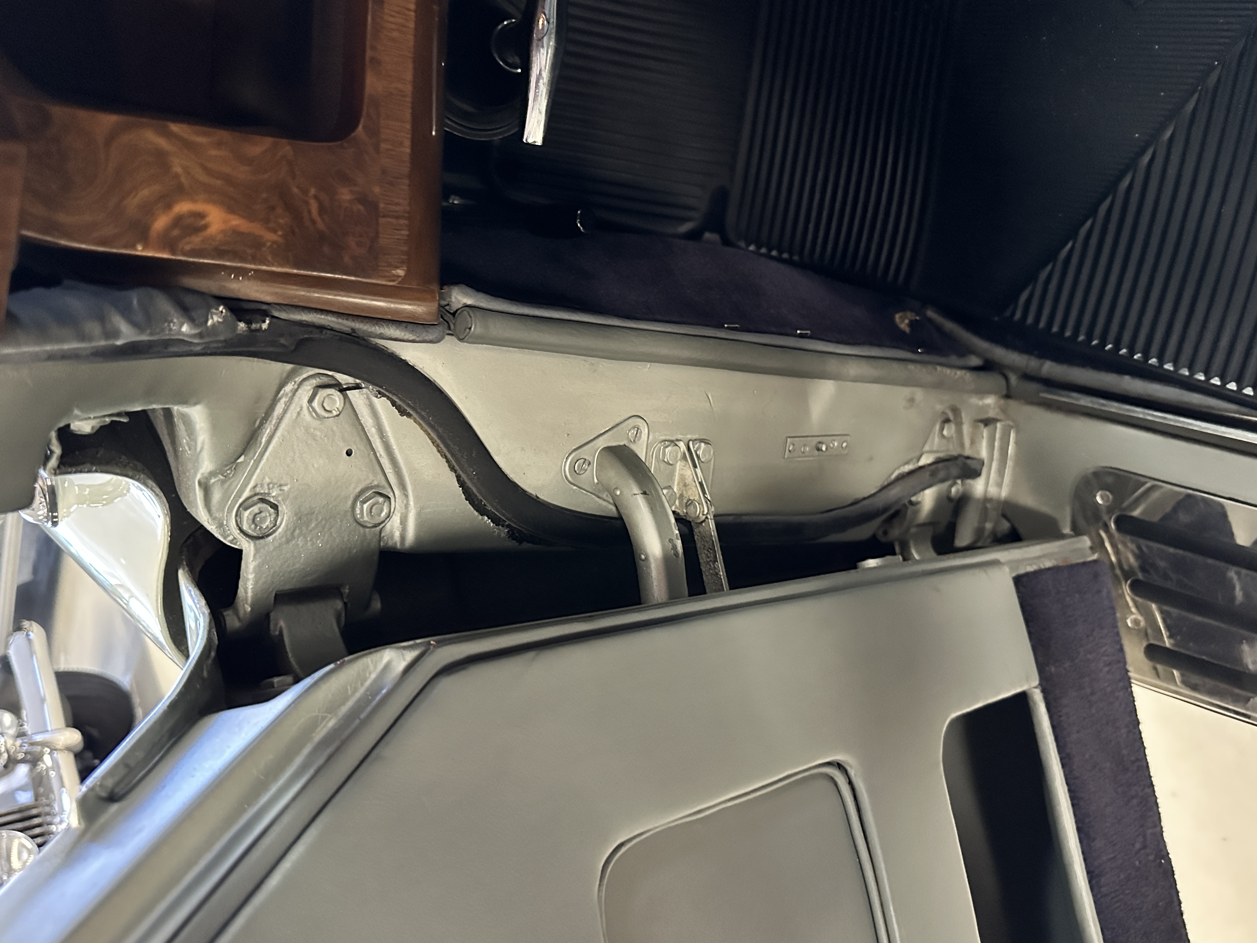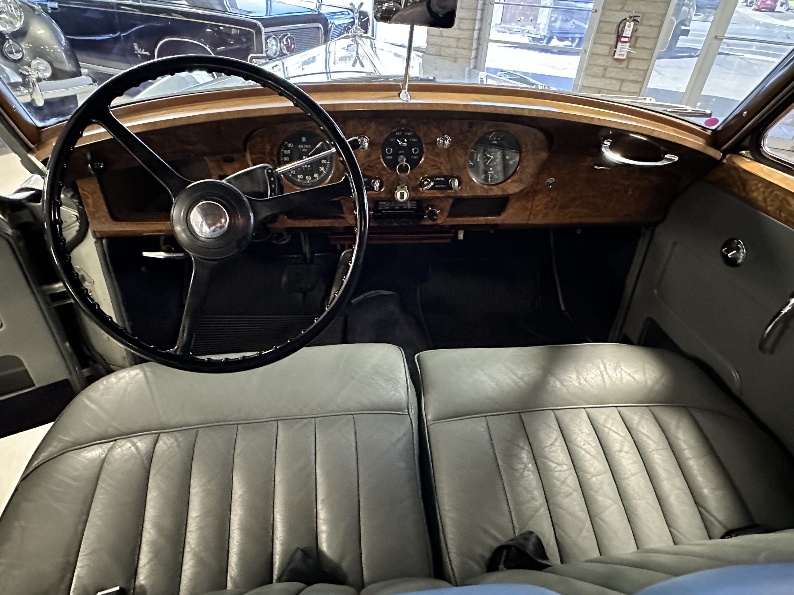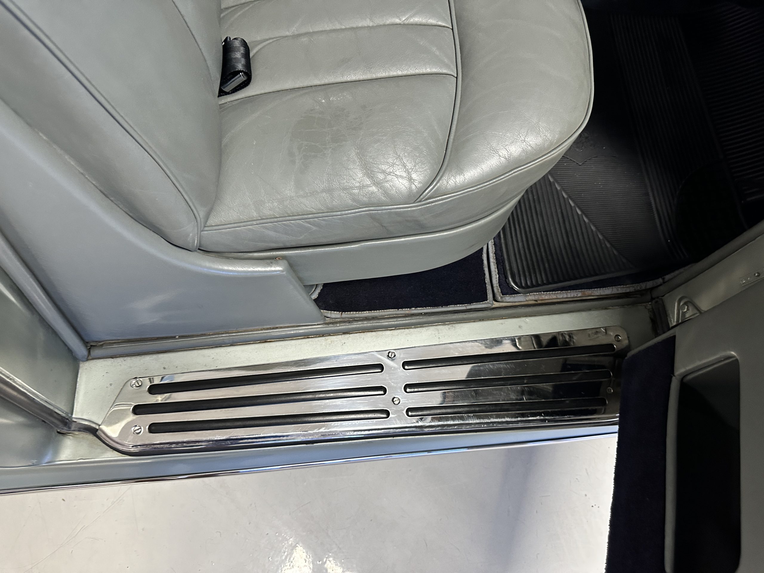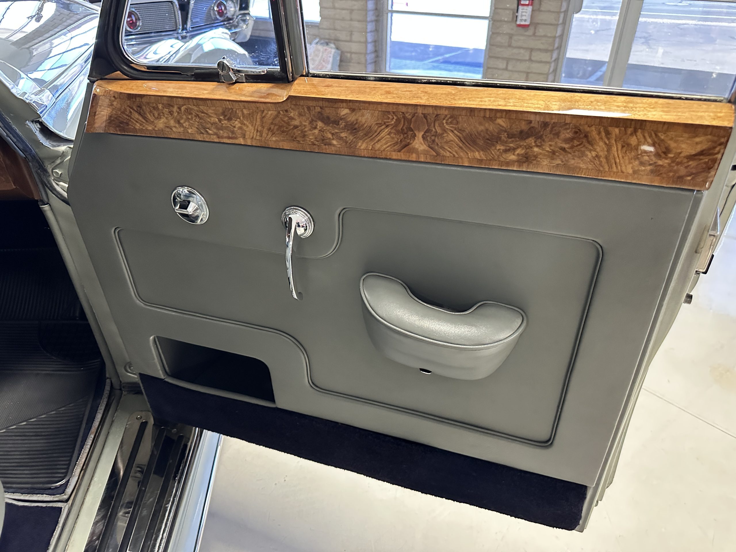 The Gray Leather interior is beautiful today and is very soft and supple. The leather was replaced in 1988 when Mrs. Roger restored her Rolls. The leather is in very nice condition today with only normal creases from occasional use and loved maintenance. The burl Walnut wood throughout was refinished in 1988 and looks fantastic today. The original Blue Wilton wool carpeting in the front compartment could benefit from replacement as it is original and shows wear. The rear passenger compartment features a lovely original sheepskin mouton overlay with a special diamond pattern.