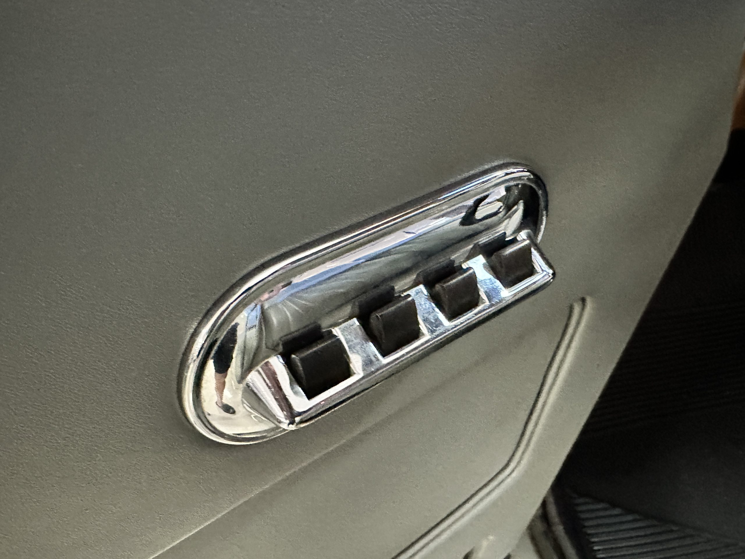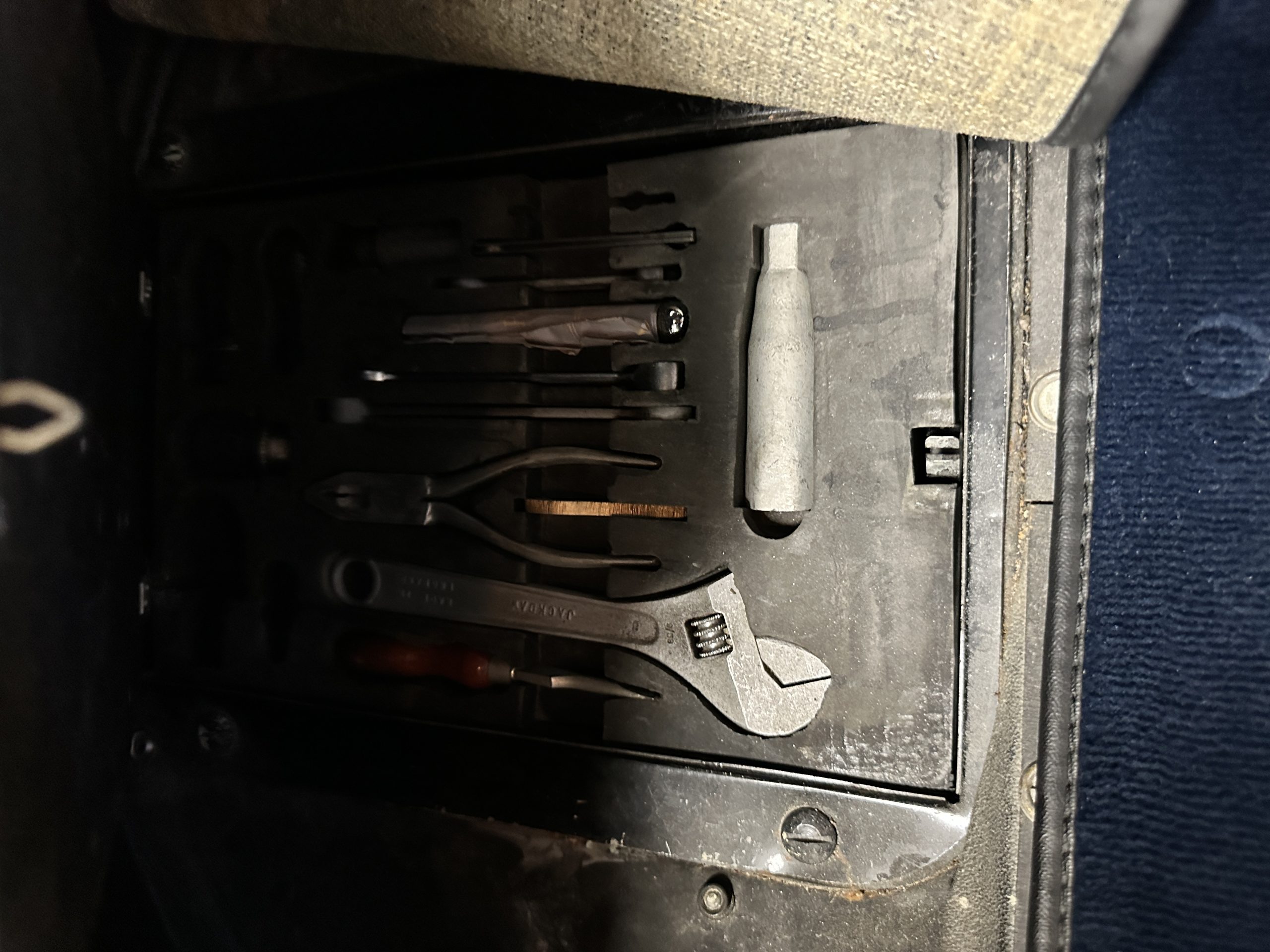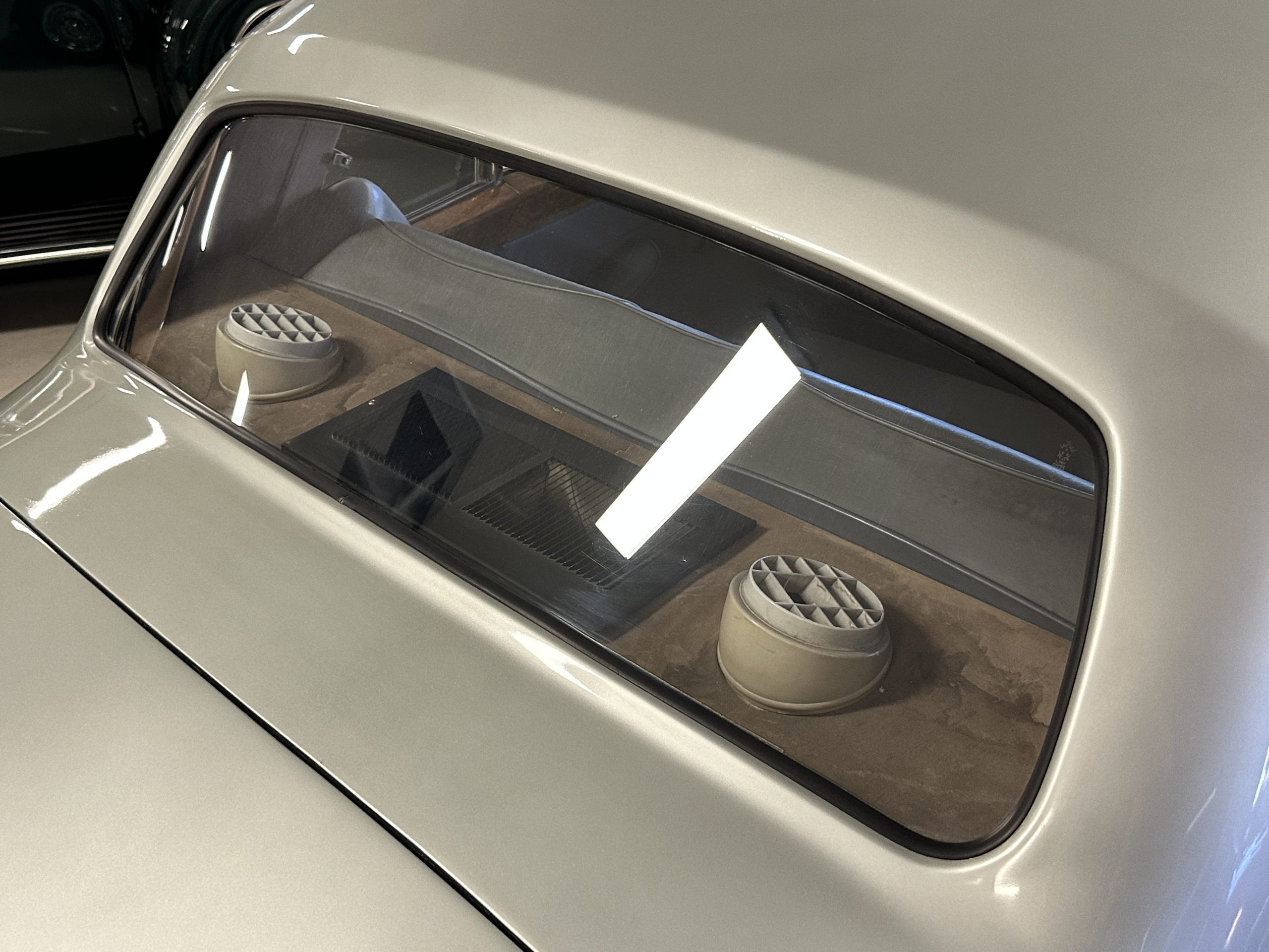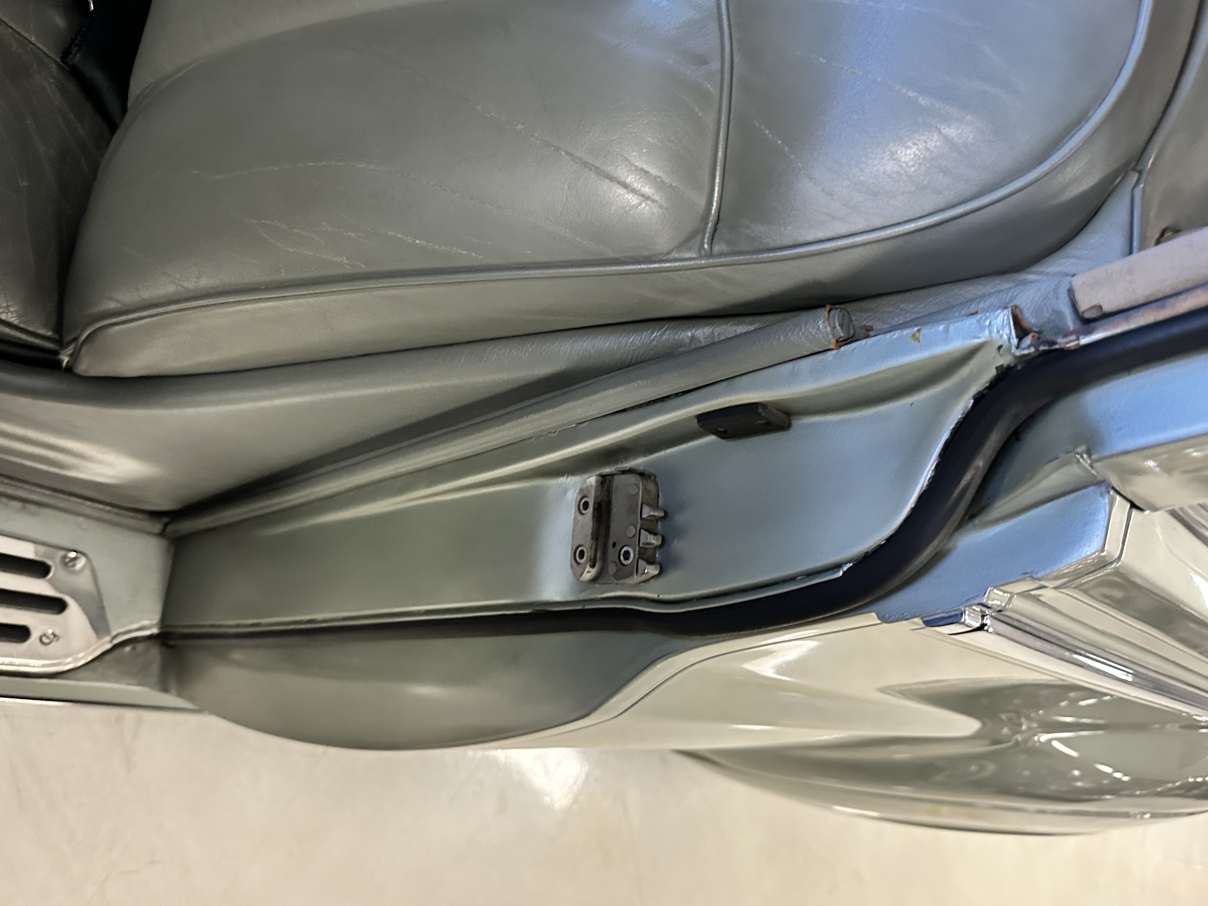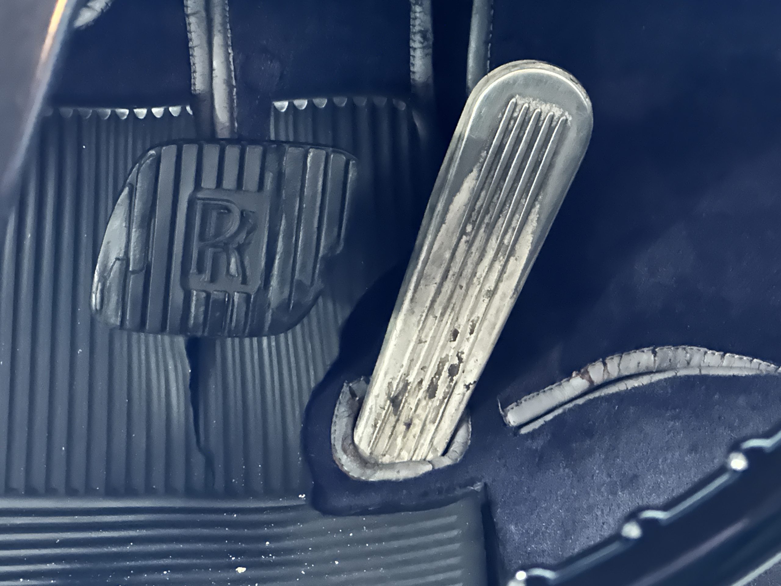 The Gray Leather interior is beautiful today and is very soft and supple. The leather was replaced in 1988 when Mrs. Roger restored her Rolls. The leather is in very nice condition today with only normal creases from occasional use and loved maintenance. The burl Walnut wood throughout was refinished in 1988 and looks fantastic today. The original Blue Wilton wool carpeting in the front compartment could benefit from replacement as it is original and shows wear. The rear passenger compartment features a lovely original sheepskin mouton overlay with a special diamond pattern.