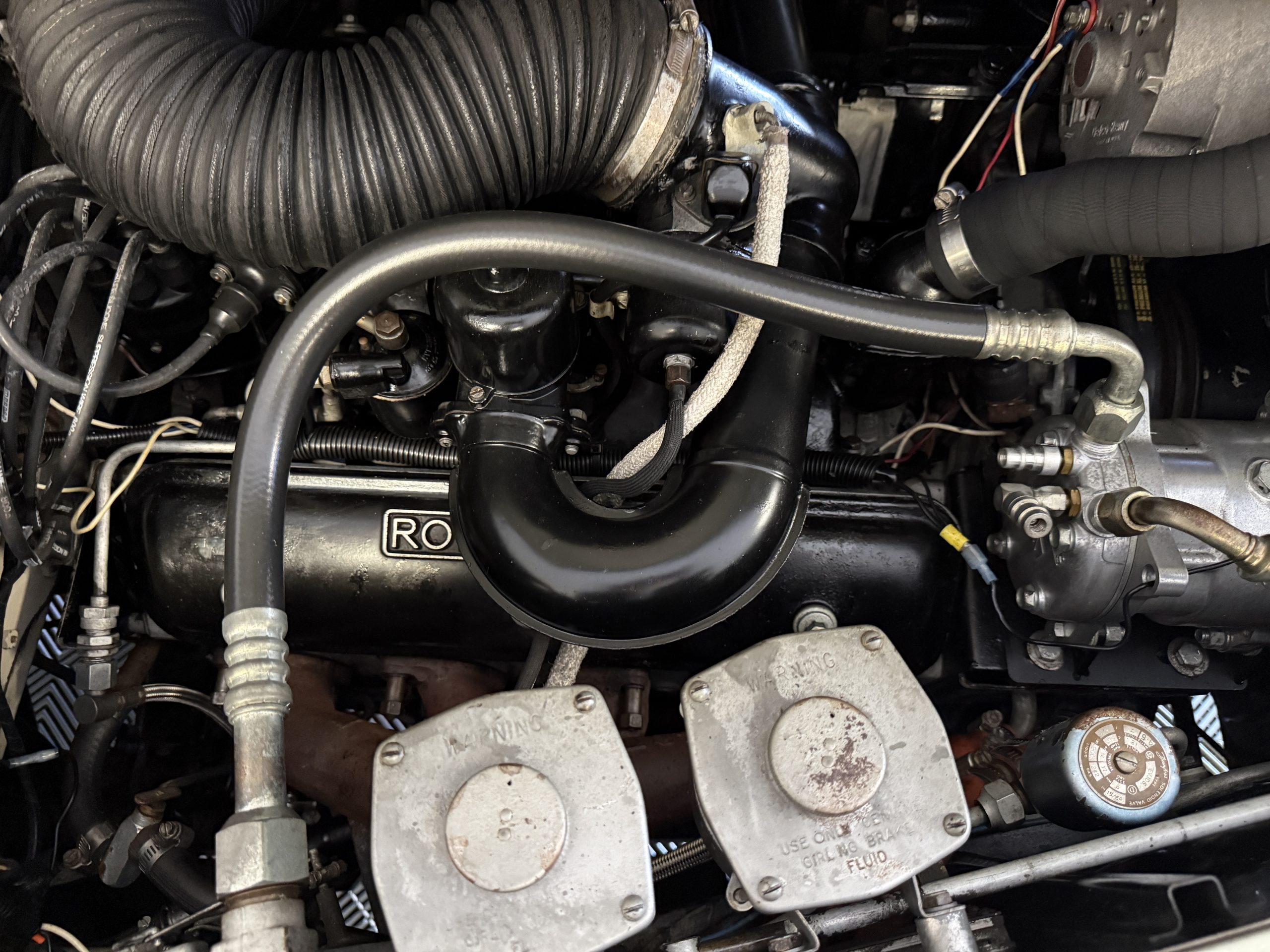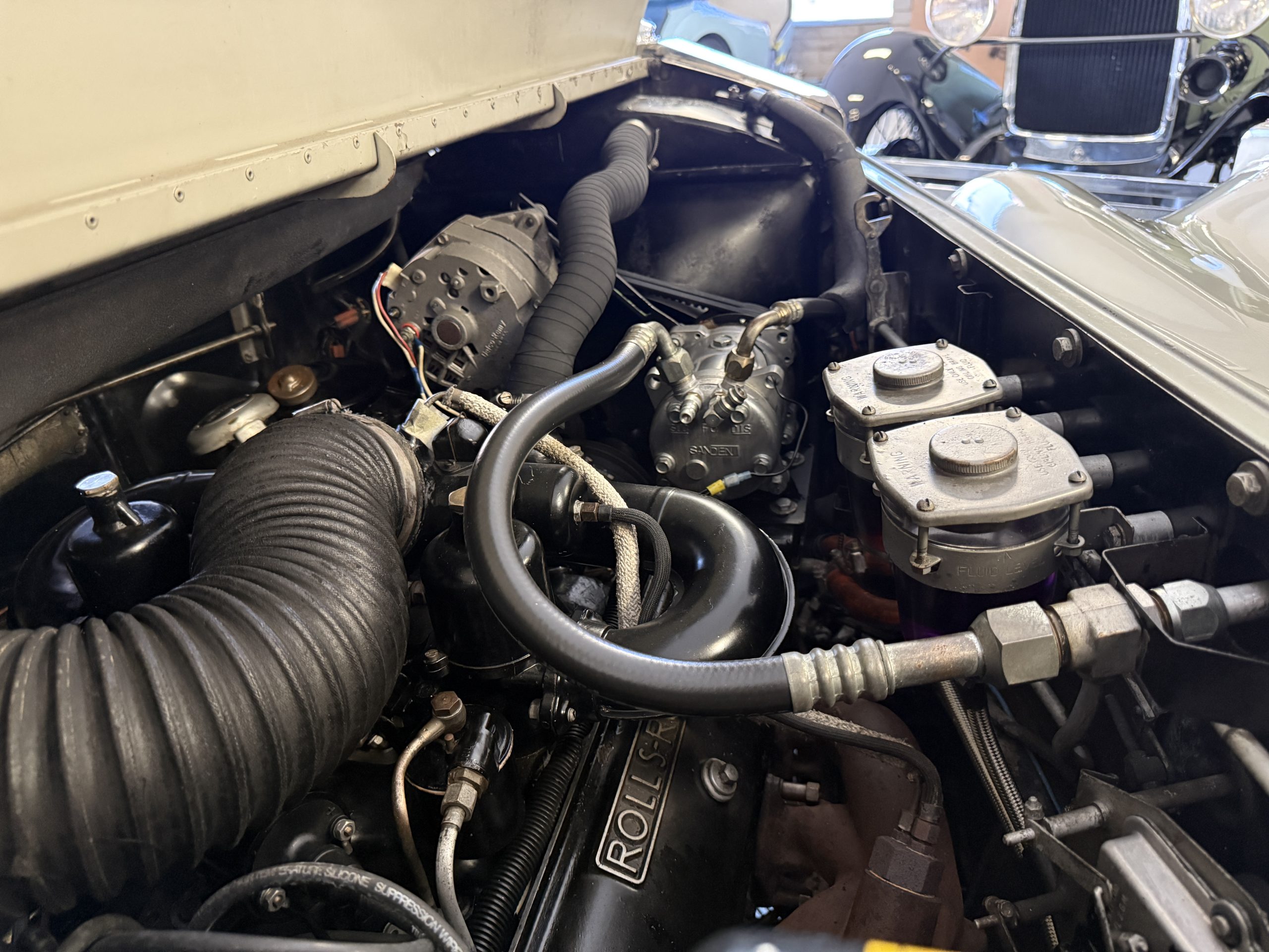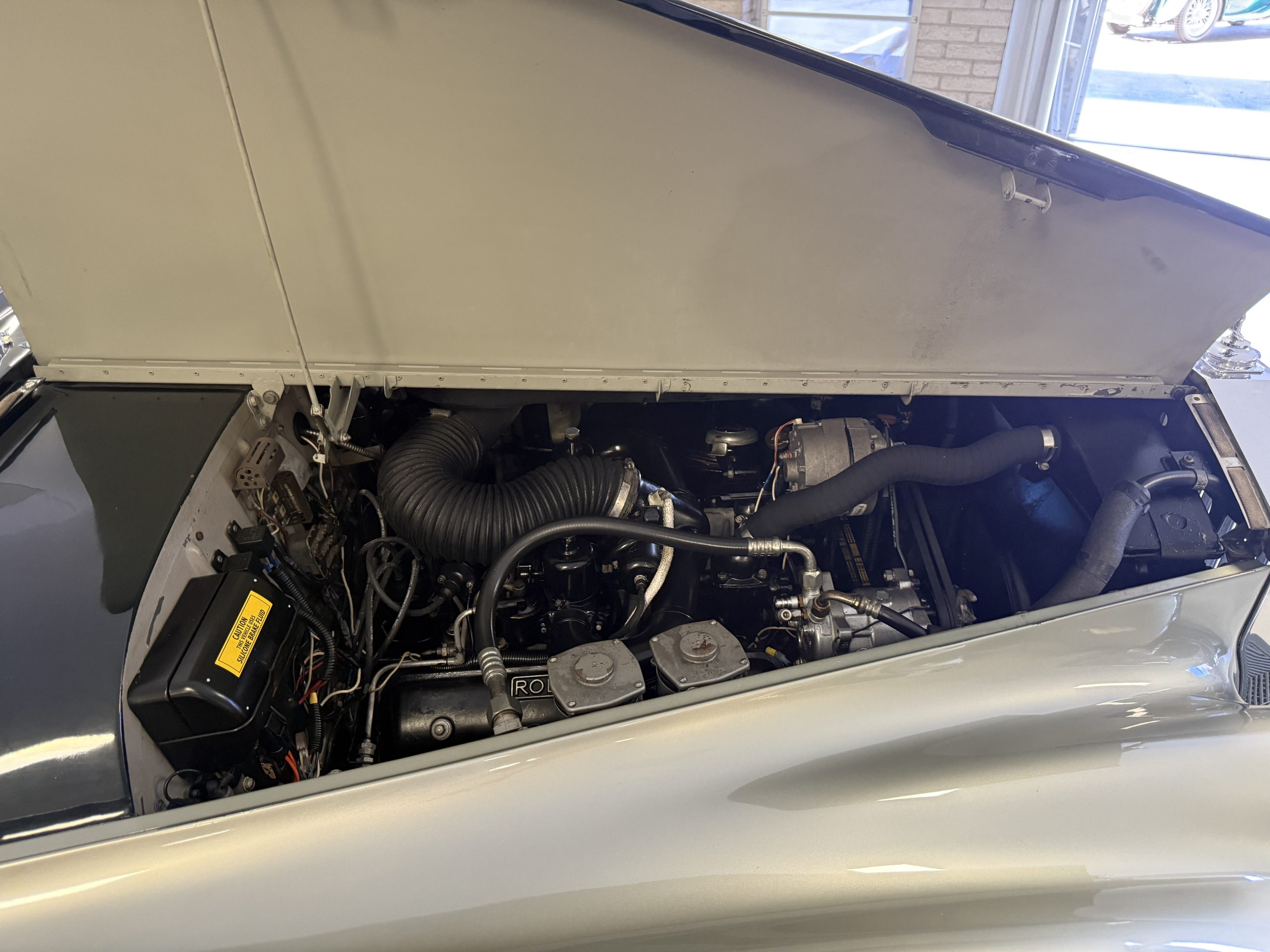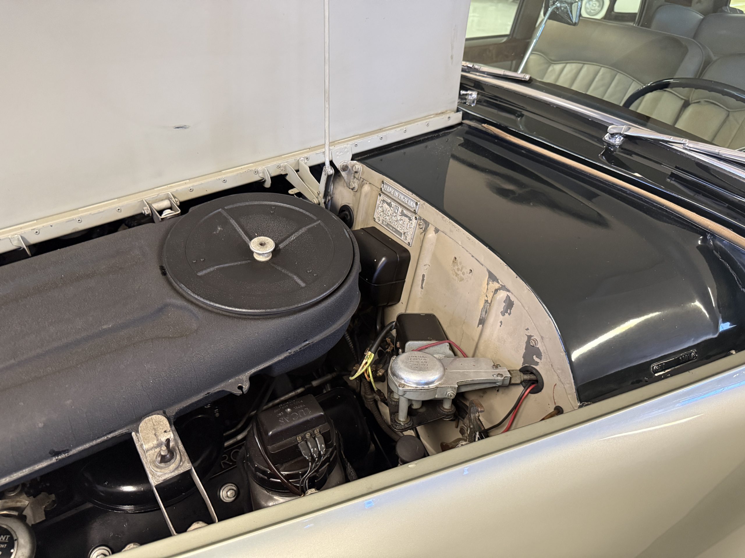 The Rolls-Royce is powered by the 6.2-liter V8 engine (engine number 271AS) paired with a four-speed GM Hydra-Matic automatic transmission, offering improved torque and smoother power delivery compared with earlier Silver Cloud models. The chassis incorporates power steering, front independent suspension with coil springs, and a rear live axle with semi-elliptical leaf springs, with four-wheel servo-assisted drum brakes deliver controlled stopping performance. The water pump, alternator and belts were replaced in 2017 and a complete brake service was completed in 2017. In 2013, the wiper motor was rebuilt and electric accessories were serviced which included wiring fixes for power windows, turn signals, foglights, door latches, bake lights and bulb replacements. The AC compressor was rebuilt in 2002. Chassis LSRA217 includes some service records, the original build sheets, chassis card, a spare tire and jack.