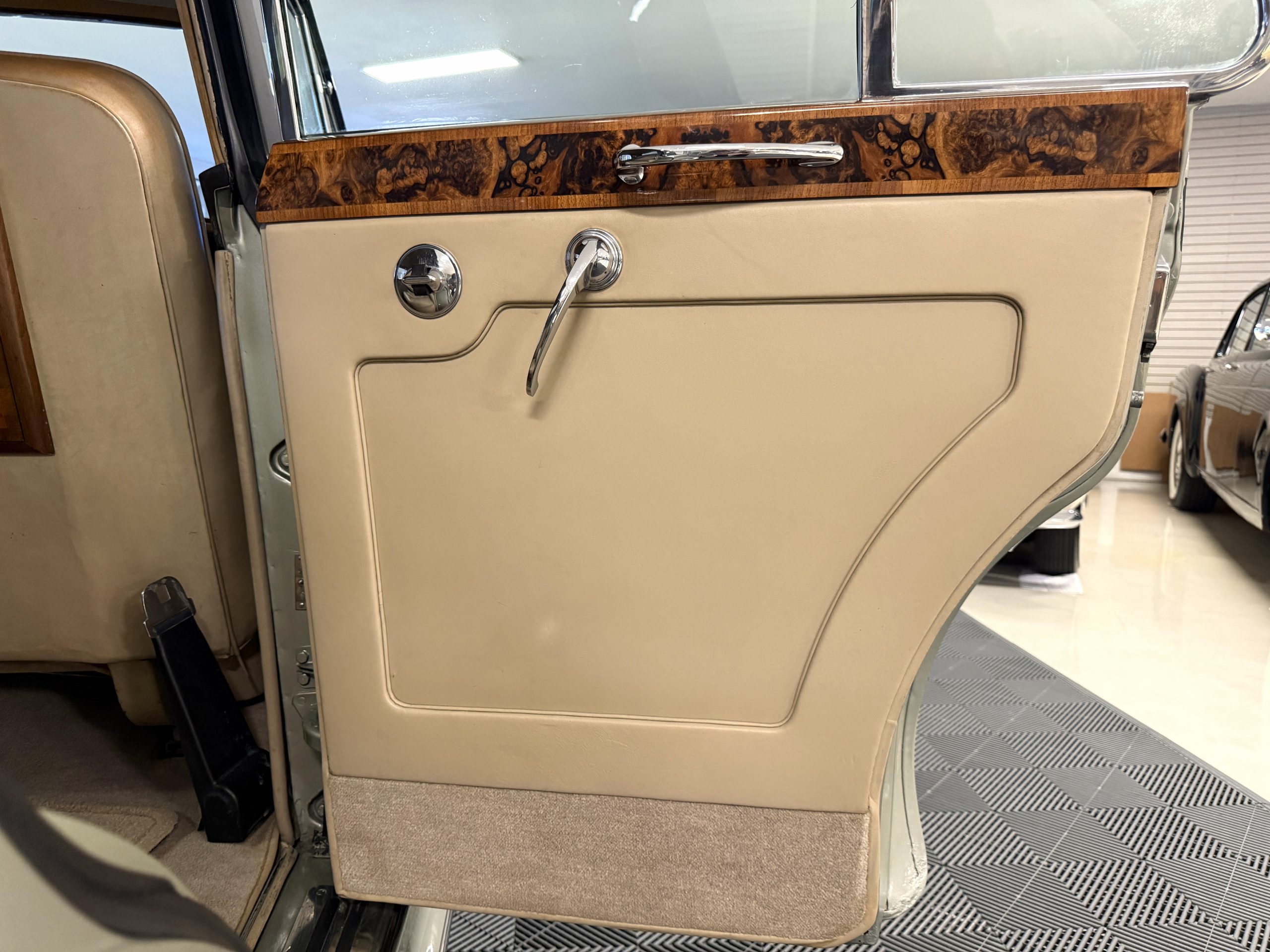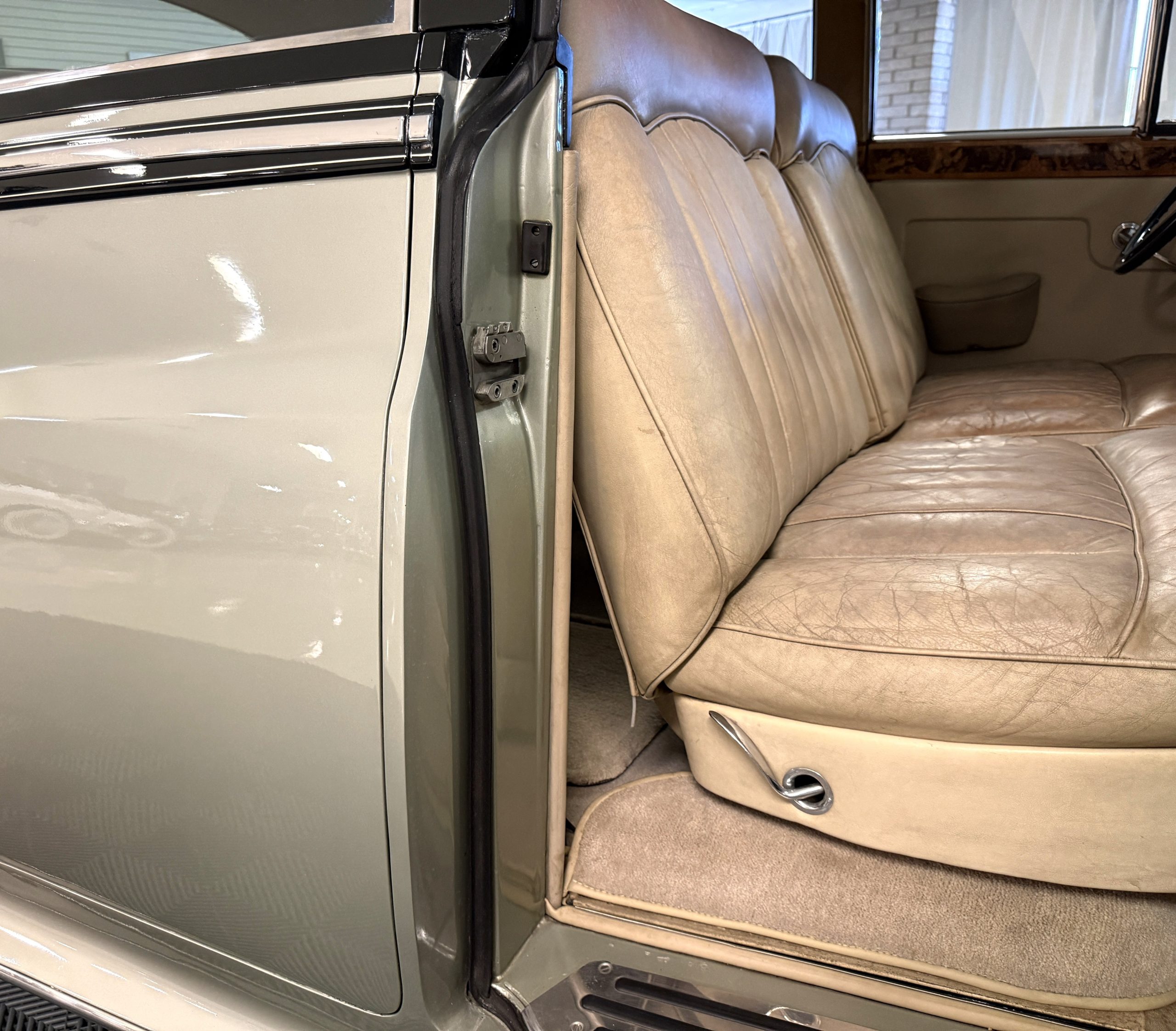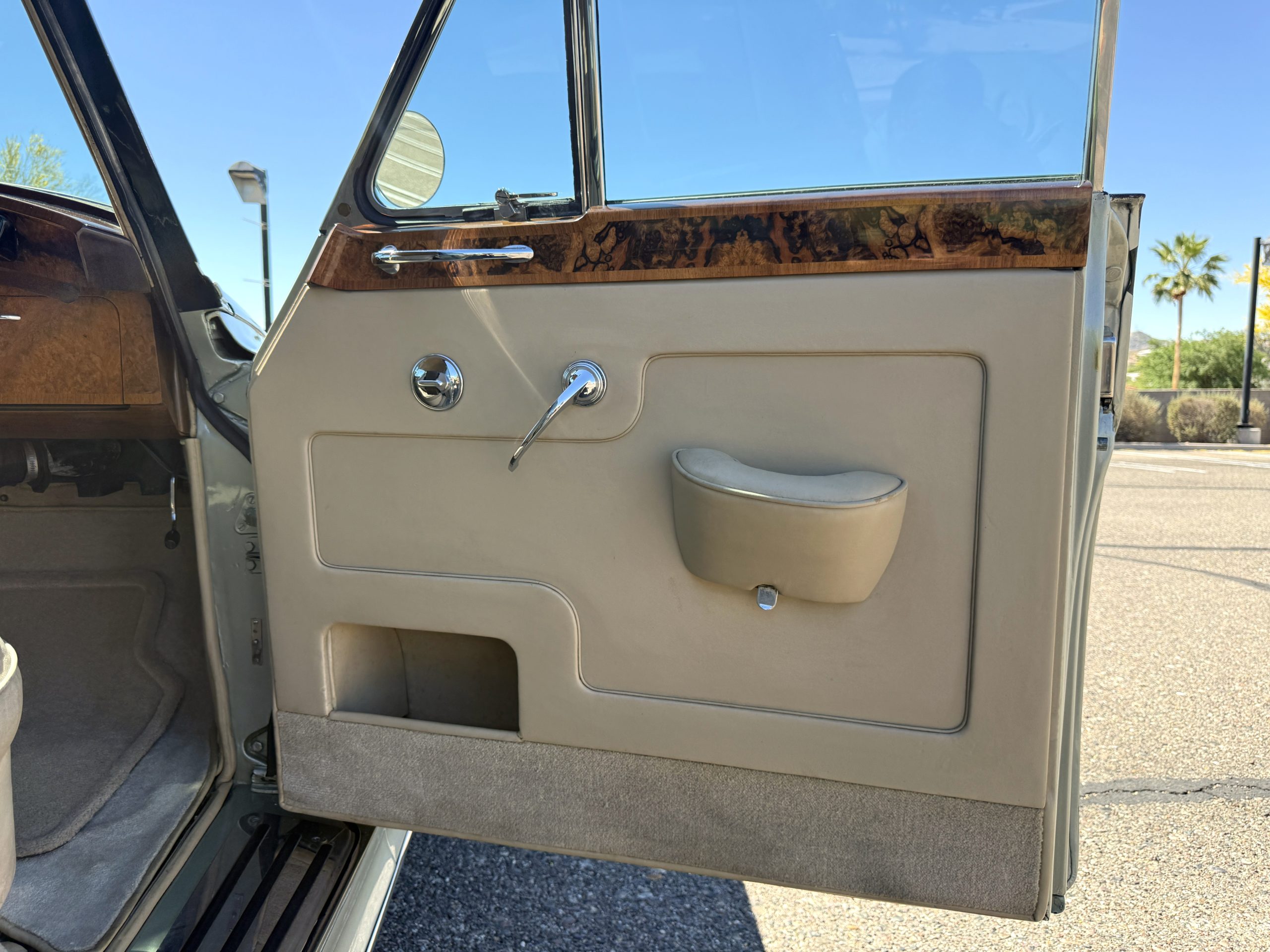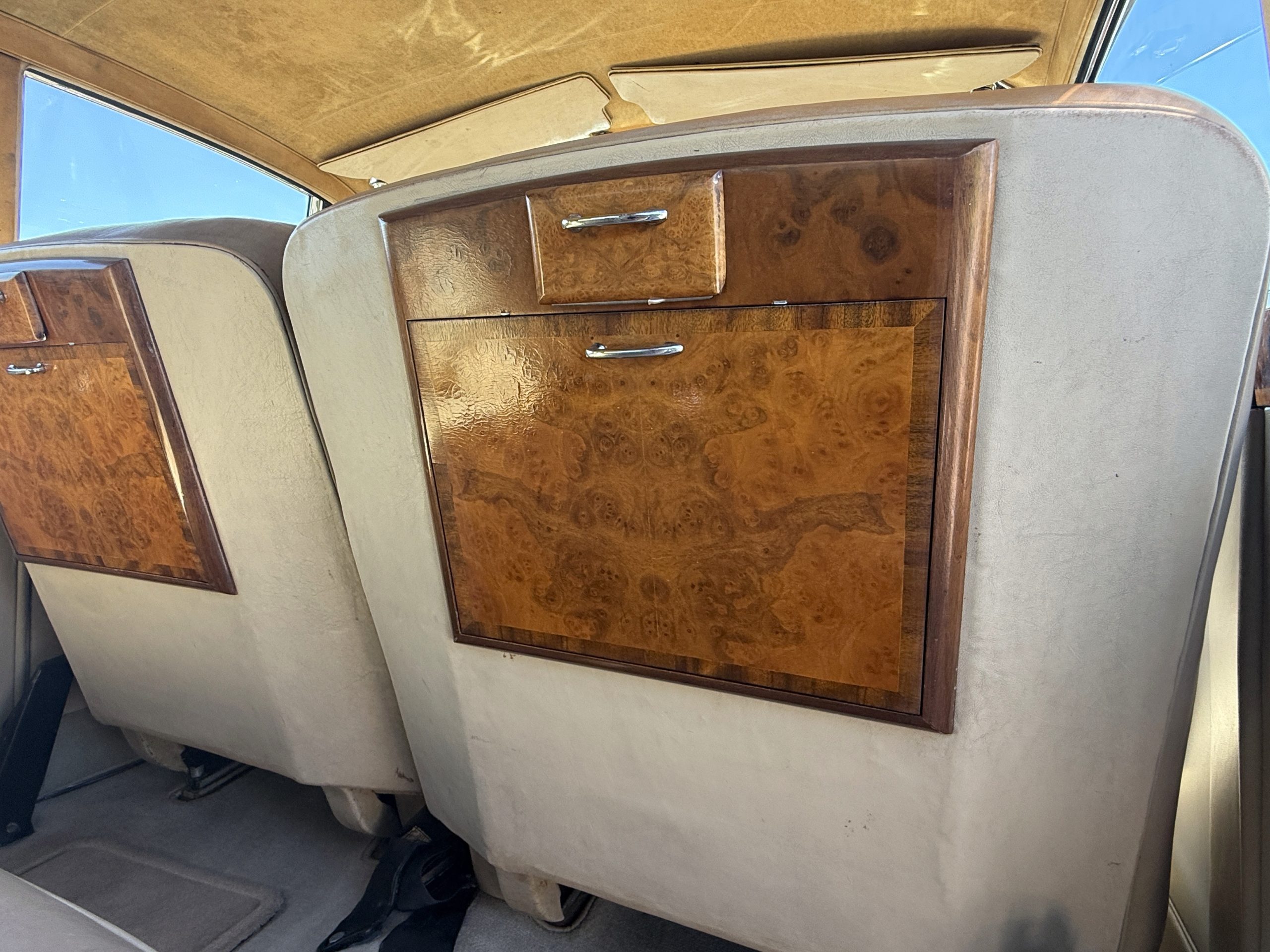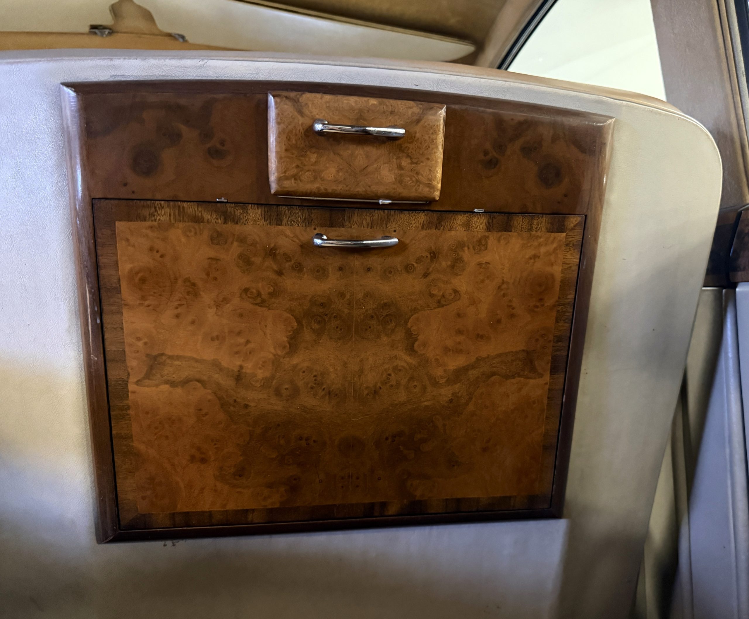 The Rolls-Royce interior is trimmed in original beige leather paired with beige wool carpeting that presents in good overall condition. The interior wood and carpeting were restored in 2001. There is wear consistent with age and use with one tear and some cracking in the driver’s side seat. This left-hand-drive U.S. example retains its original charm with burled walnut door cappings and dash panels that remain in great condition. Smiths instrumentation, factory amenities include air conditioning, power windows, and an AM/FM radio, while rear picnic tables finished in matching burl walnut continue to present in great condition and enhance the Silver Cloud’s traditional passenger comfort.