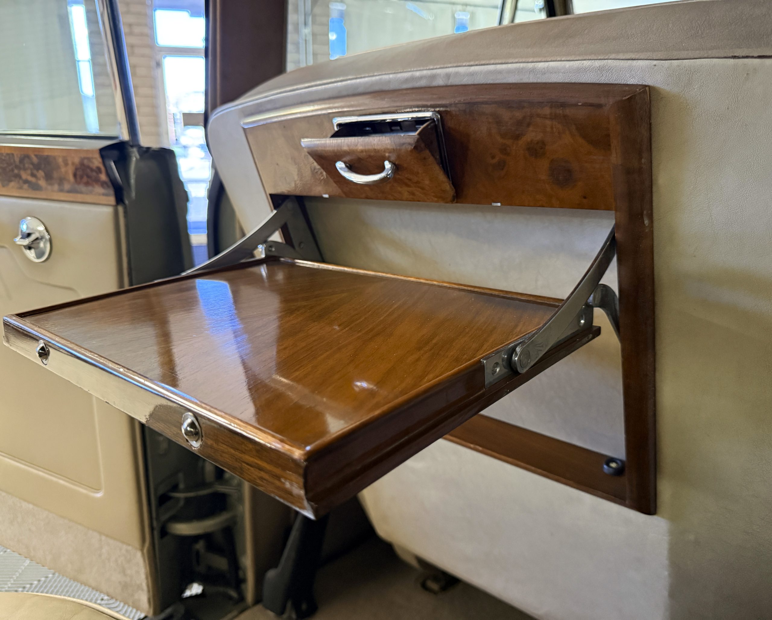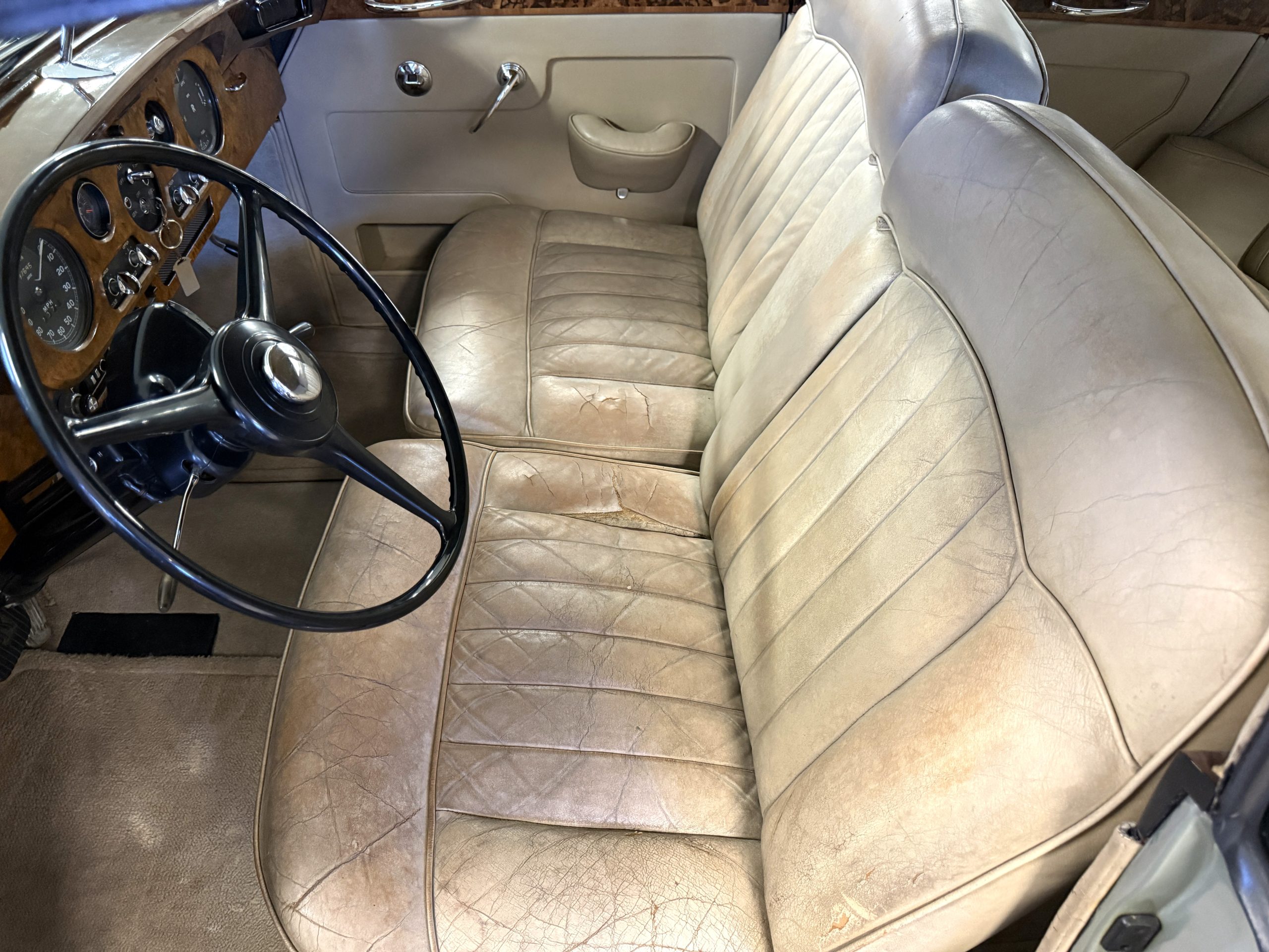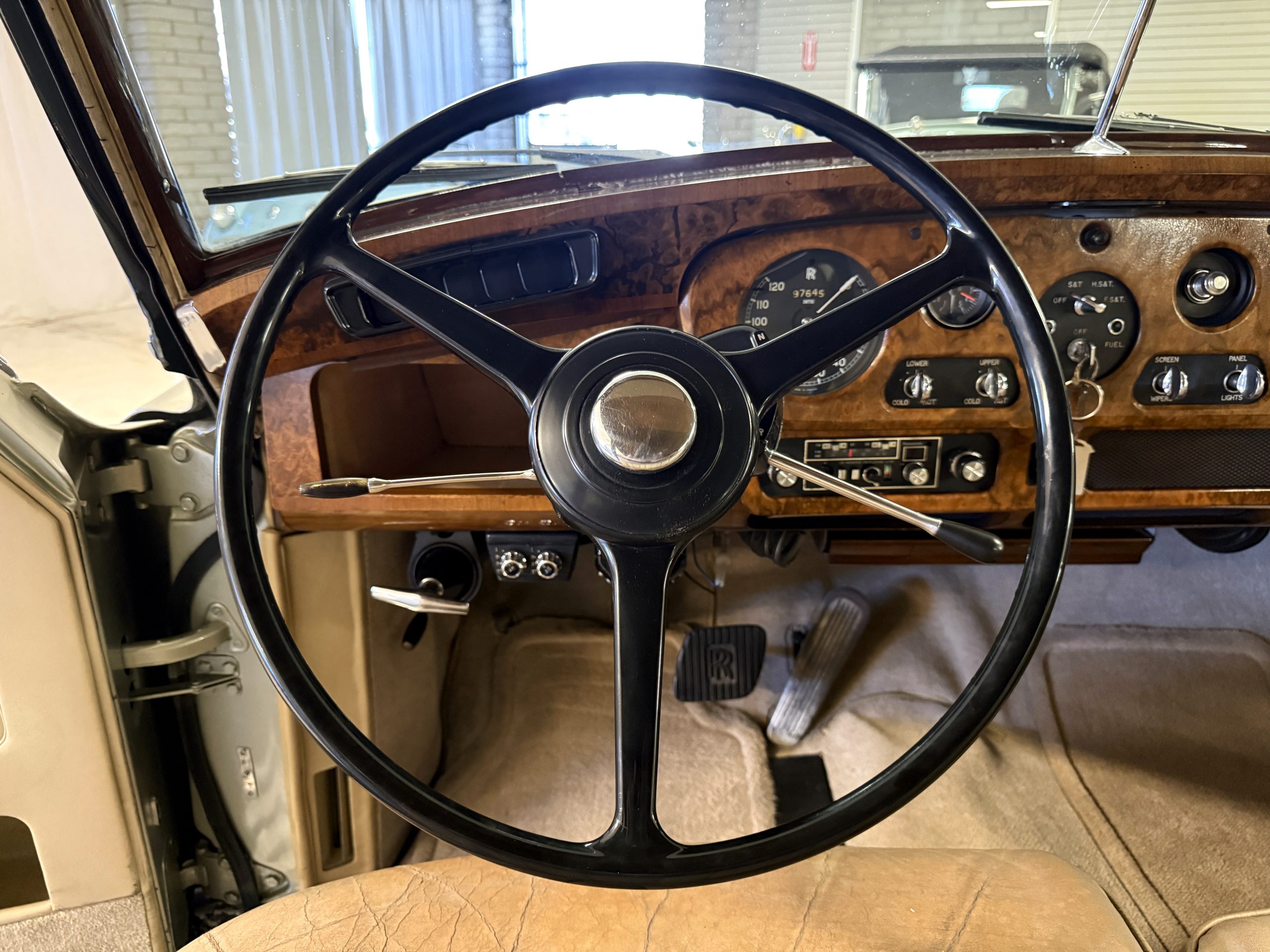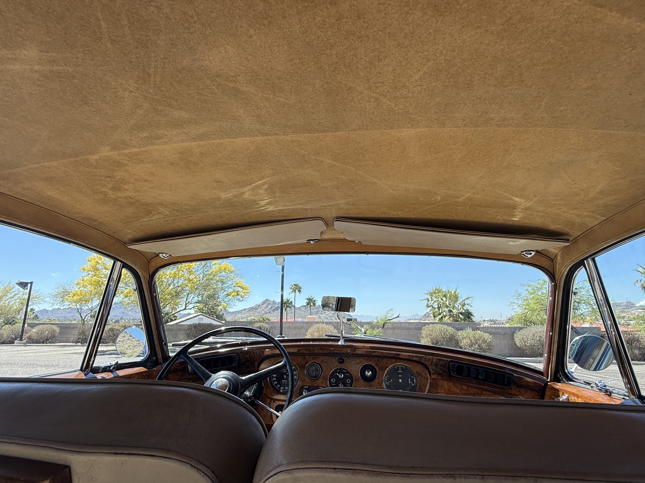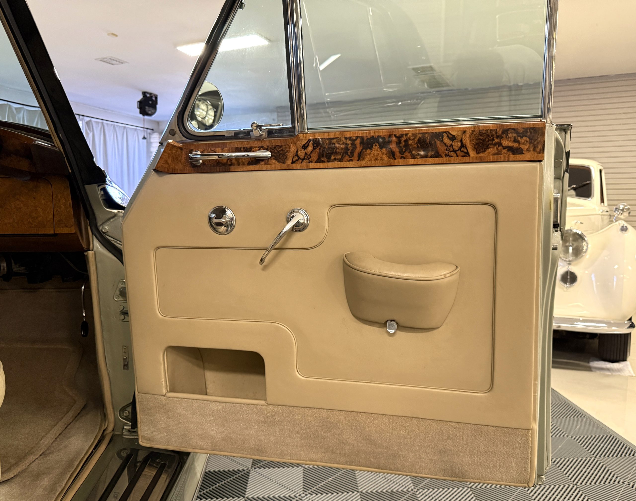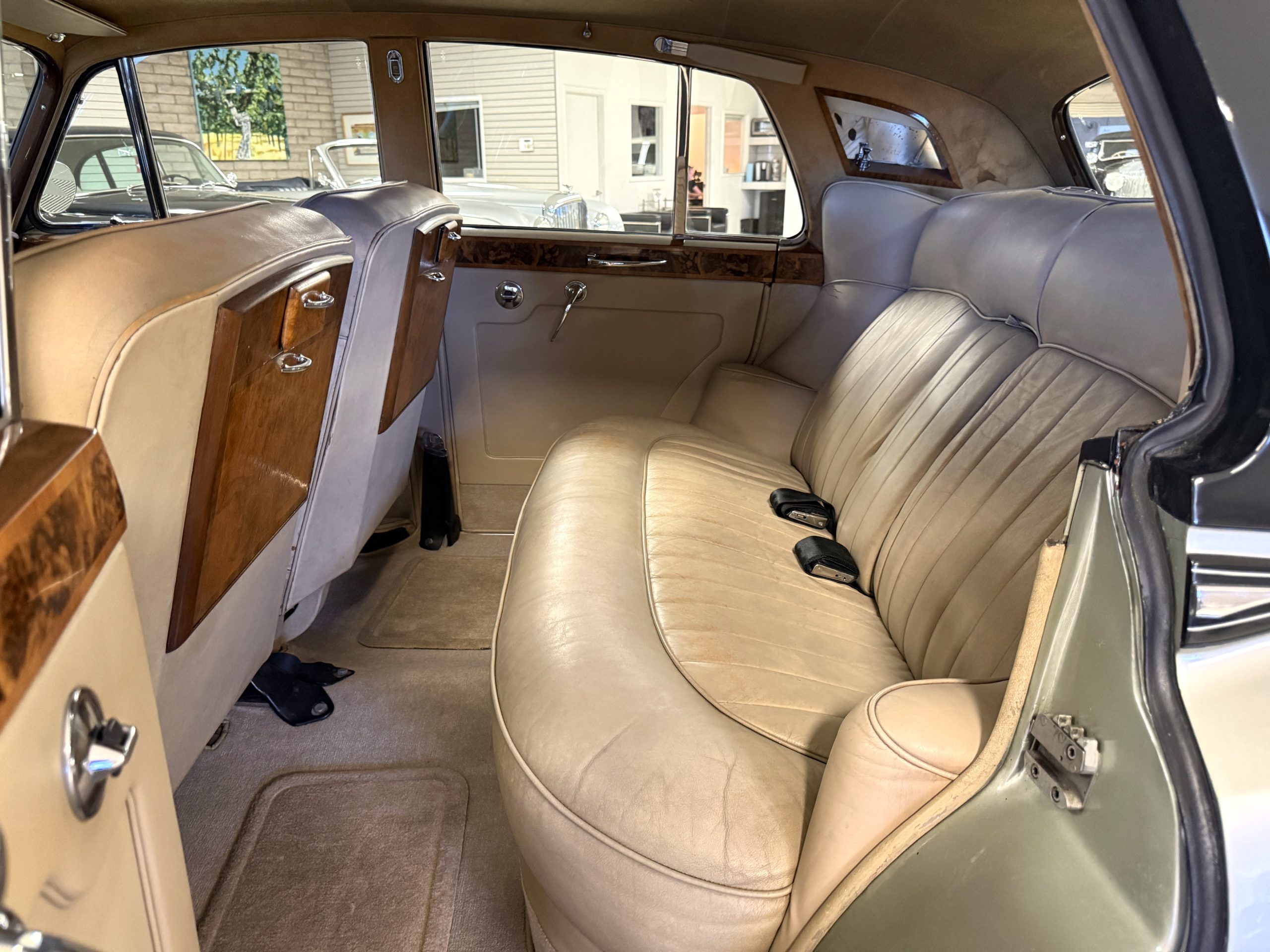 The Rolls-Royce interior is trimmed in original beige leather paired with beige wool carpeting that presents in good overall condition. The interior wood and carpeting were restored in 2001. There is wear consistent with age and use with one tear and some cracking in the driver’s side seat. This left-hand-drive U.S. example retains its original charm with burled walnut door cappings and dash panels that remain in great condition. Smiths instrumentation, factory amenities include air conditioning, power windows, and an AM/FM radio, while rear picnic tables finished in matching burl walnut continue to present in great condition and enhance the Silver Cloud’s traditional passenger comfort.