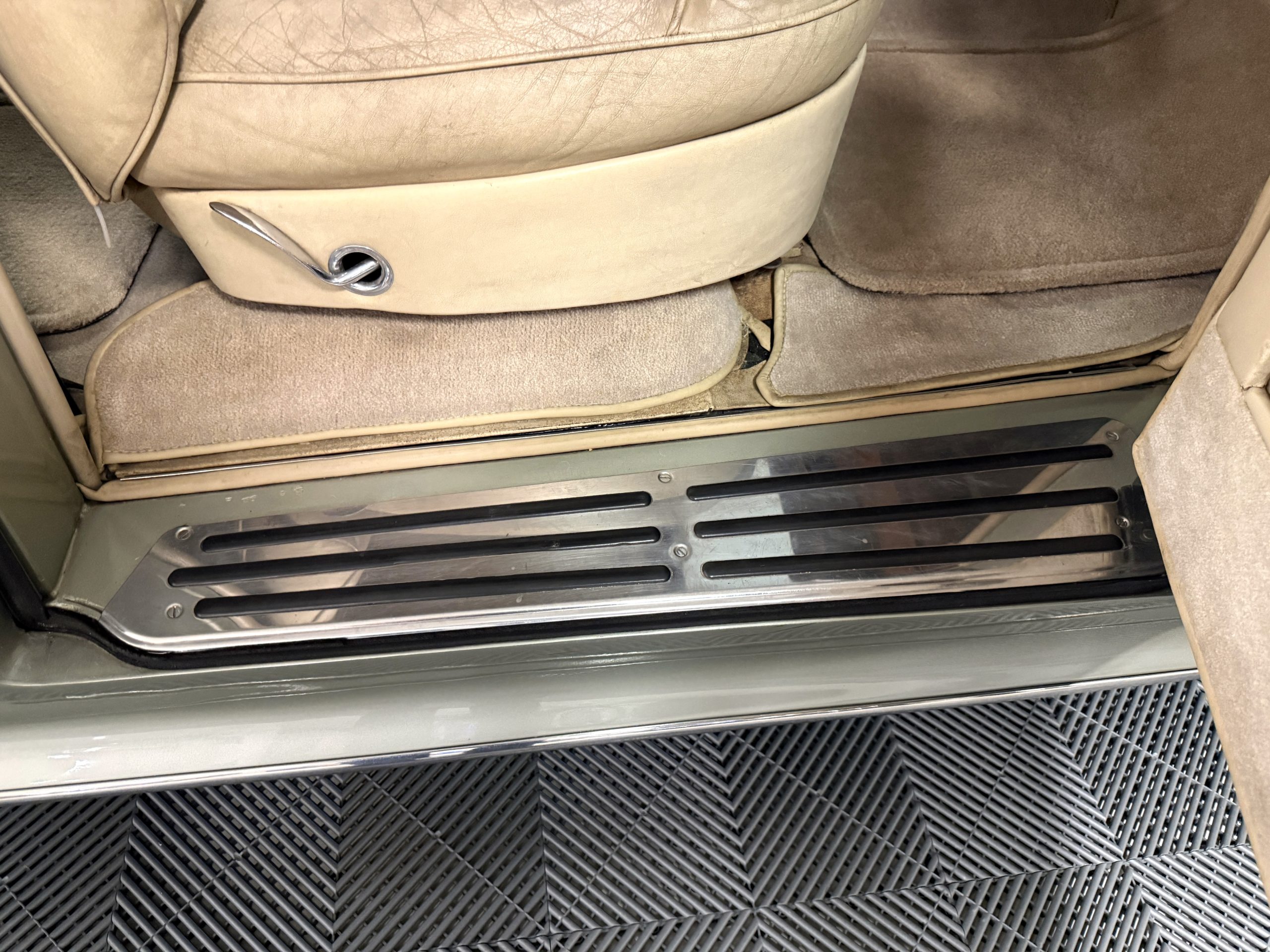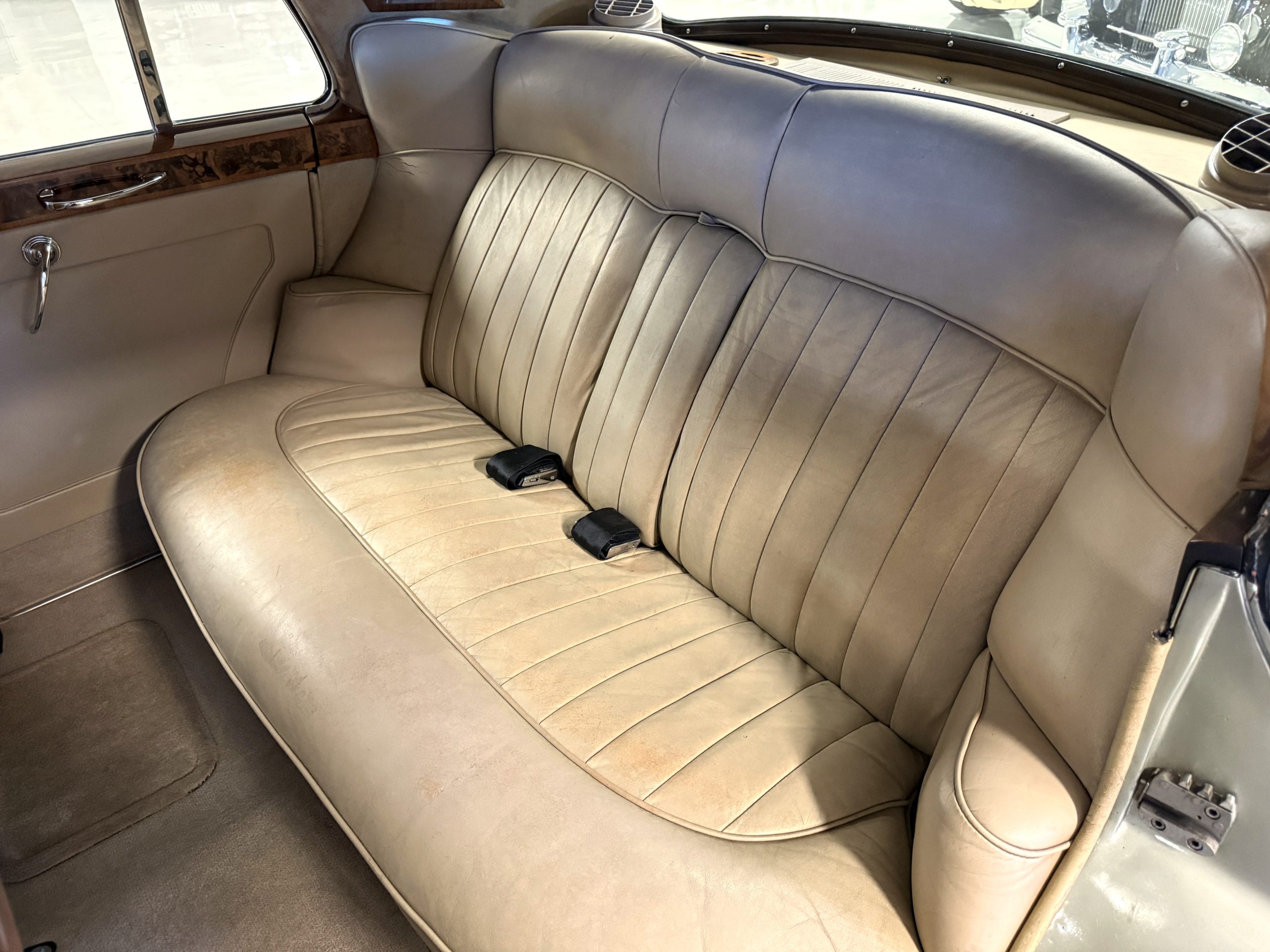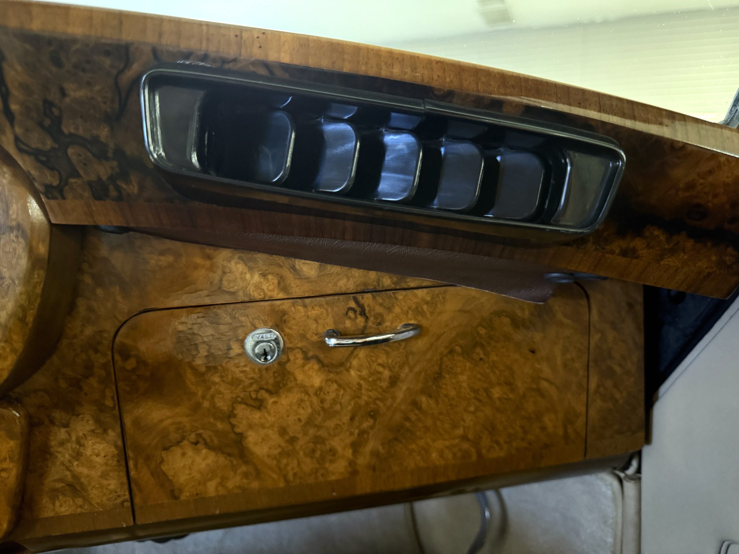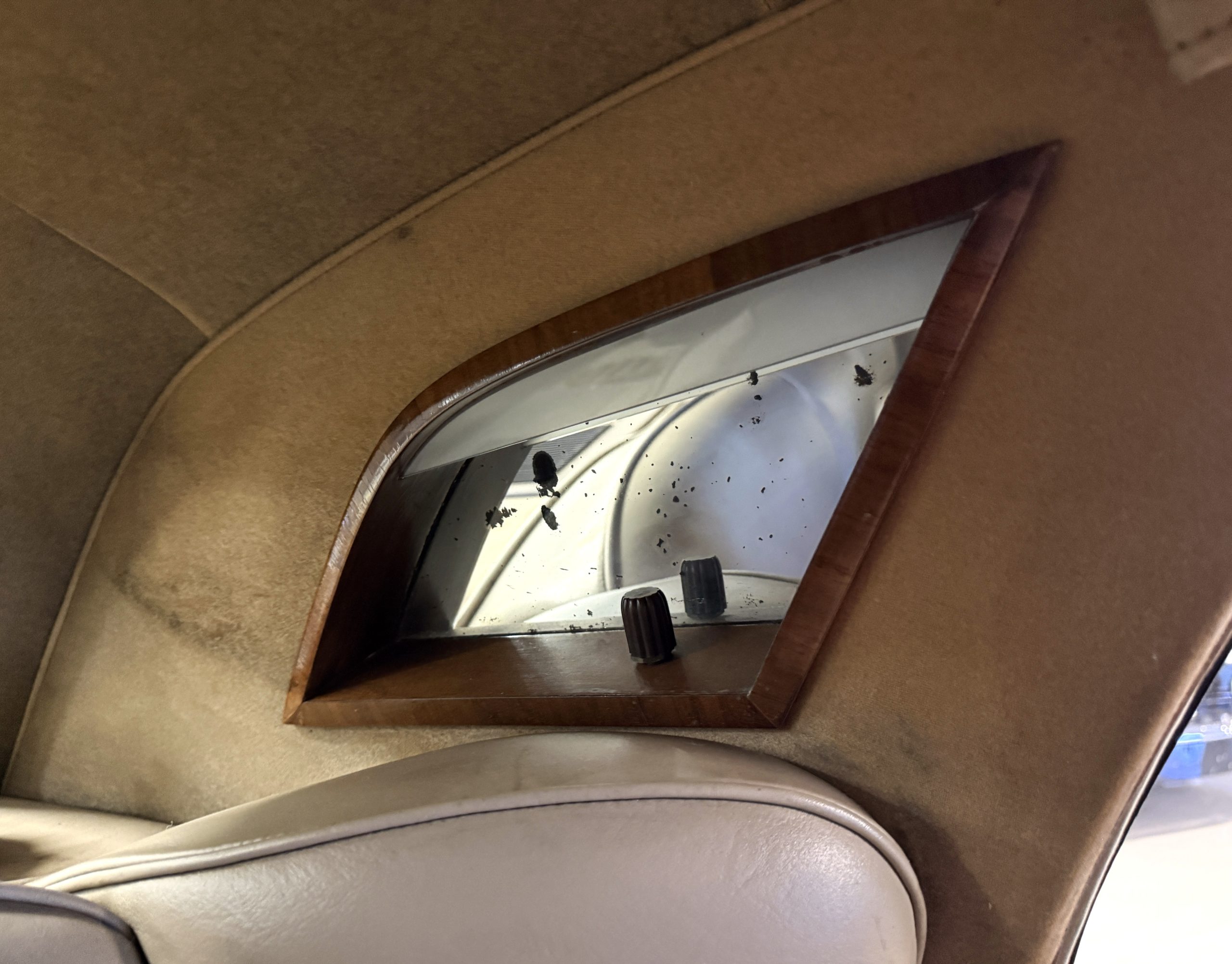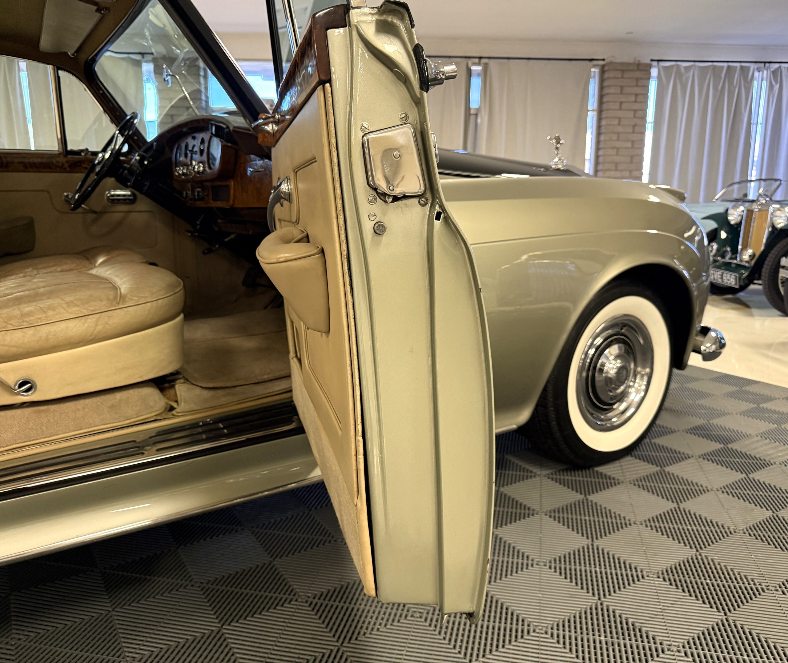 The Rolls-Royce interior is trimmed in original beige leather paired with beige wool carpeting that presents in good overall condition. The interior wood and carpeting were restored in 2001. There is wear consistent with age and use with one tear and some cracking in the driver’s side seat. This left-hand-drive U.S. example retains its original charm with burled walnut door cappings and dash panels that remain in great condition. Smiths instrumentation, factory amenities include air conditioning, power windows, and an AM/FM radio, while rear picnic tables finished in matching burl walnut continue to present in great condition and enhance the Silver Cloud’s traditional passenger comfort.