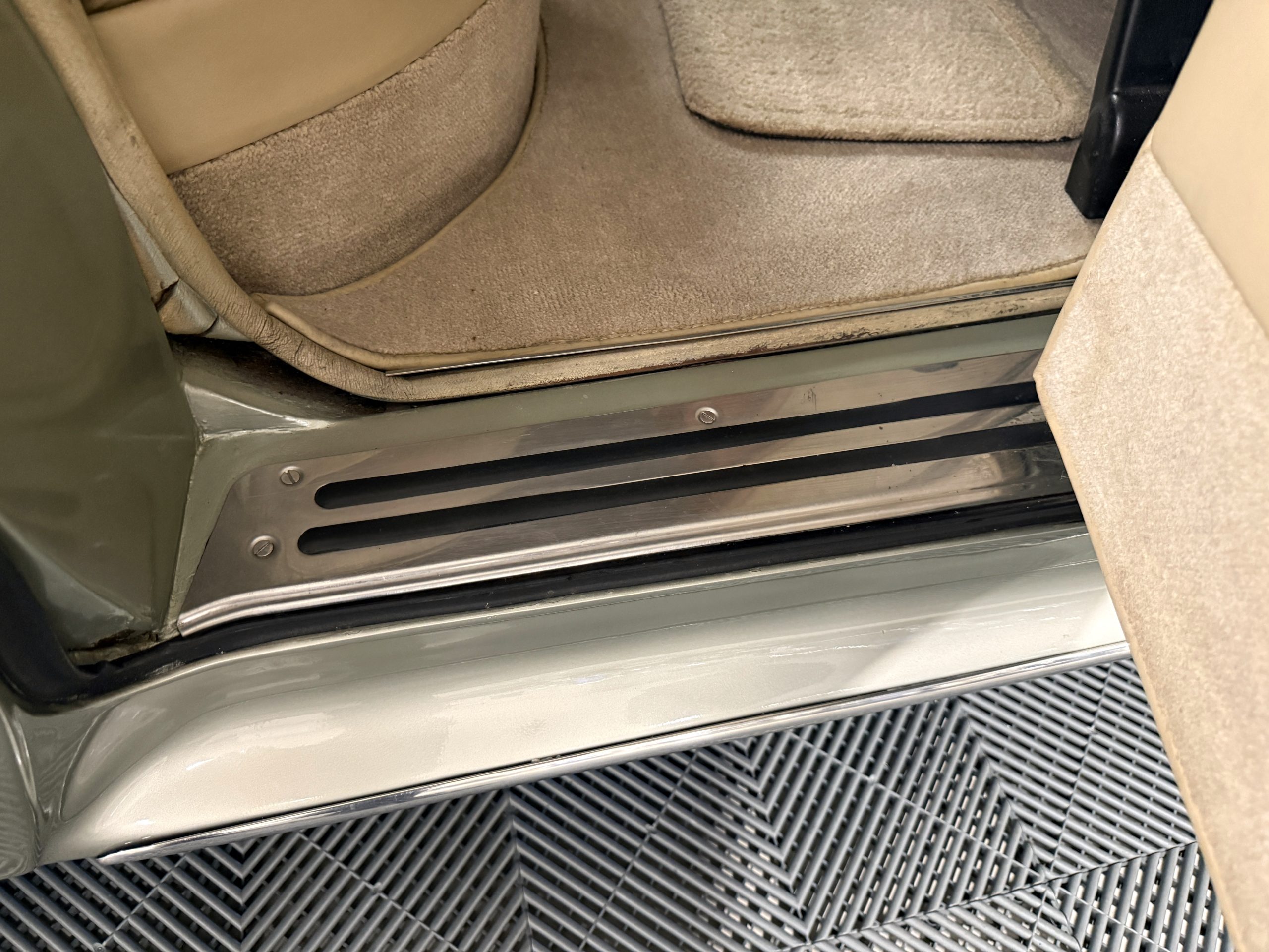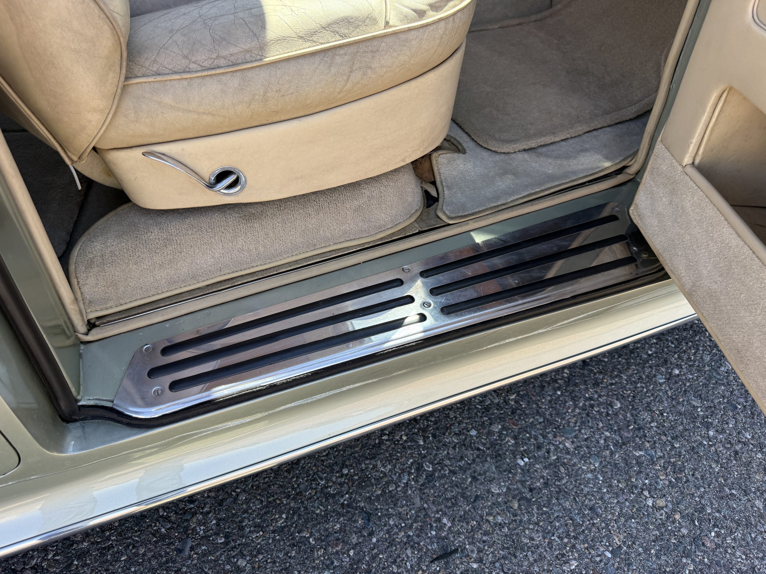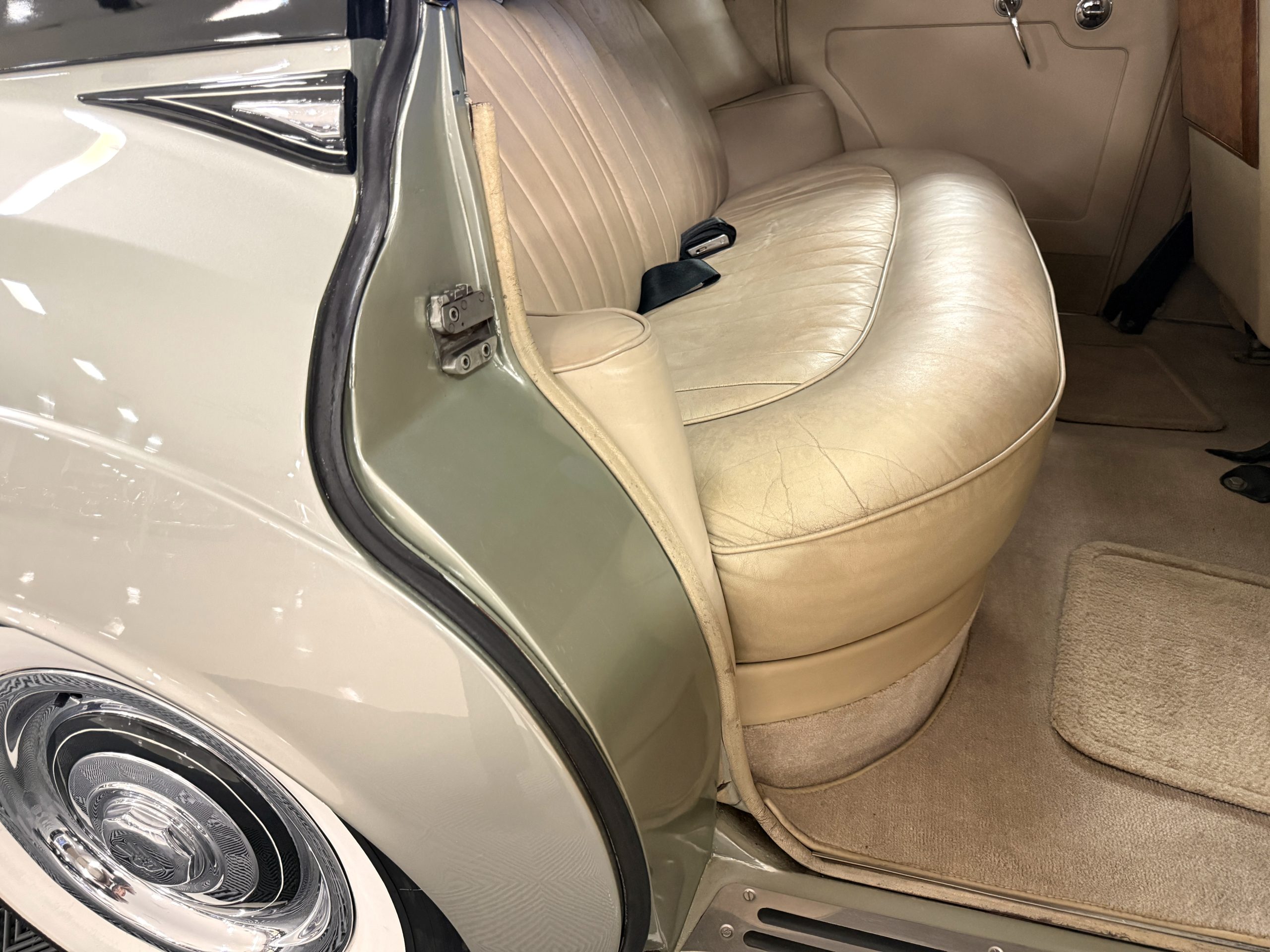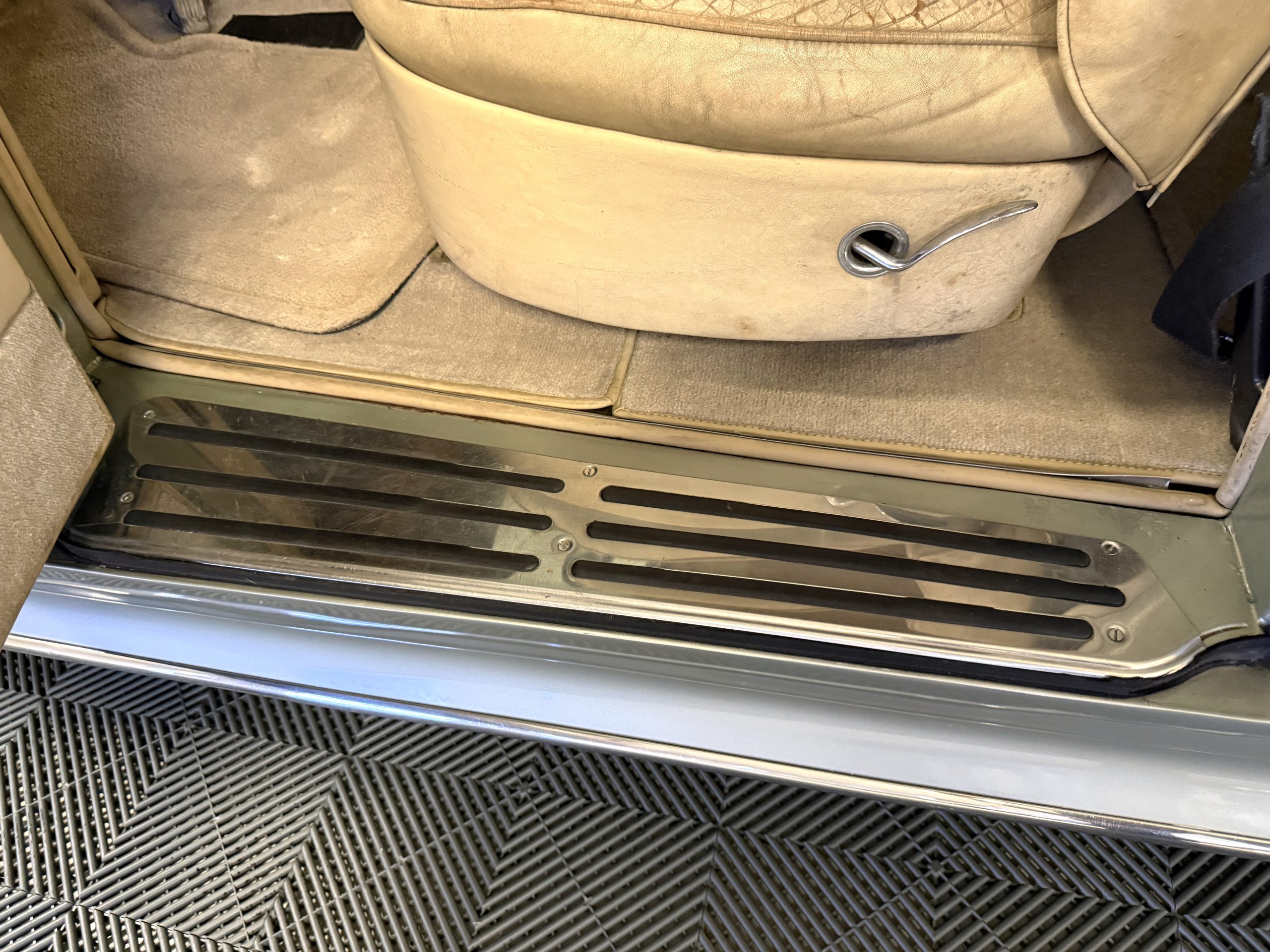 The Rolls-Royce is currently in velvet green over silver two tone with tan pinstriping that presents in great condition and shows good depth and luster. The prominent chrome grille, bumpers, Great Britain badge, and Spirit of Ecstasy remain bright and in very good condition. The cosmetic imperfections found are a slight dent on the rear driver-side swan neck overrider and dent on the roofline just above the windshield. The steel wheels finished in Velvet Green with Rolls-Royce logos present in good condition consistent with normal use and are mounted with wide whitewall tires in good condition but will need to be replaced due to age (2004). We are a dealer through Coker tire that the next owner can choose to use to purchase tires of their preference before delivery.