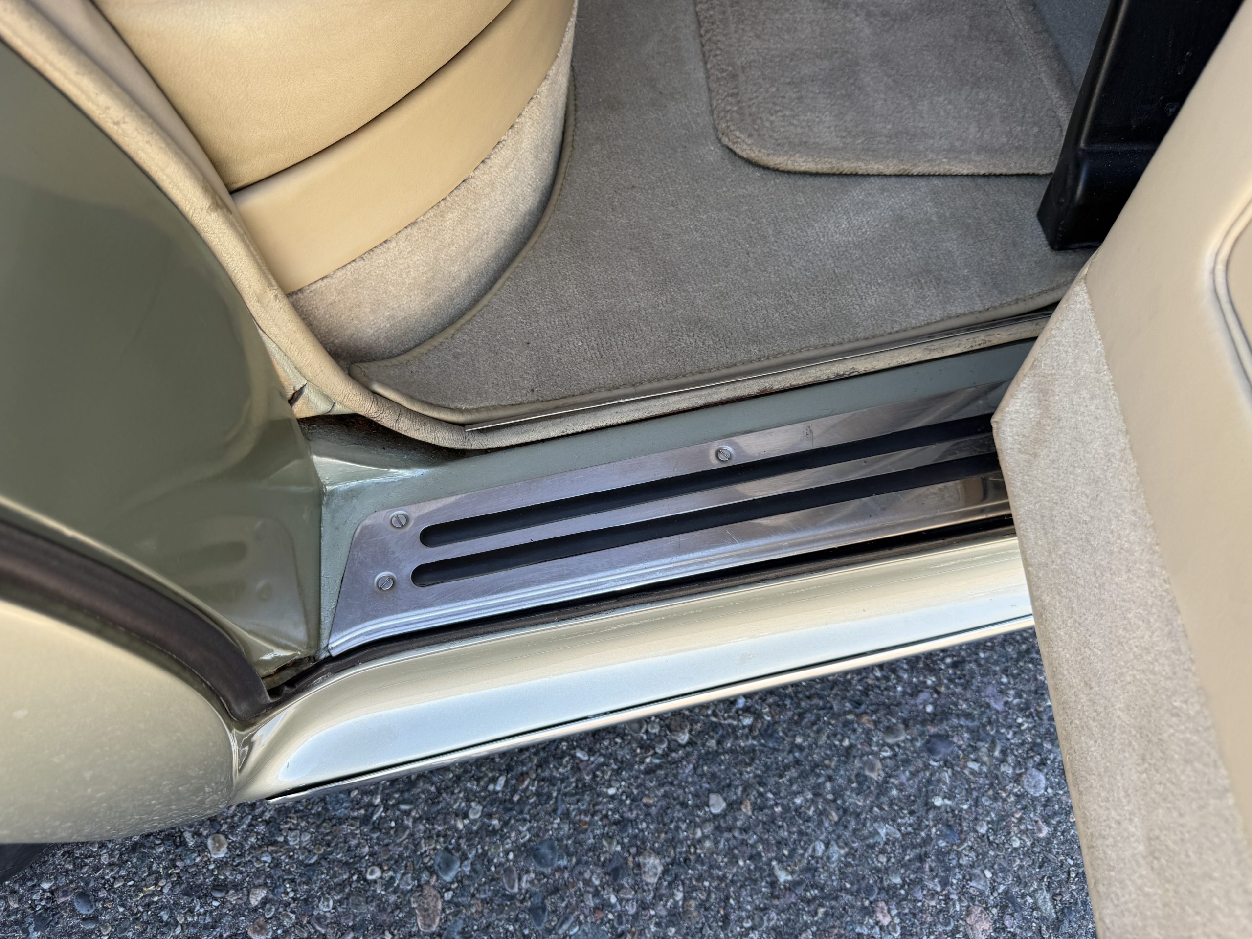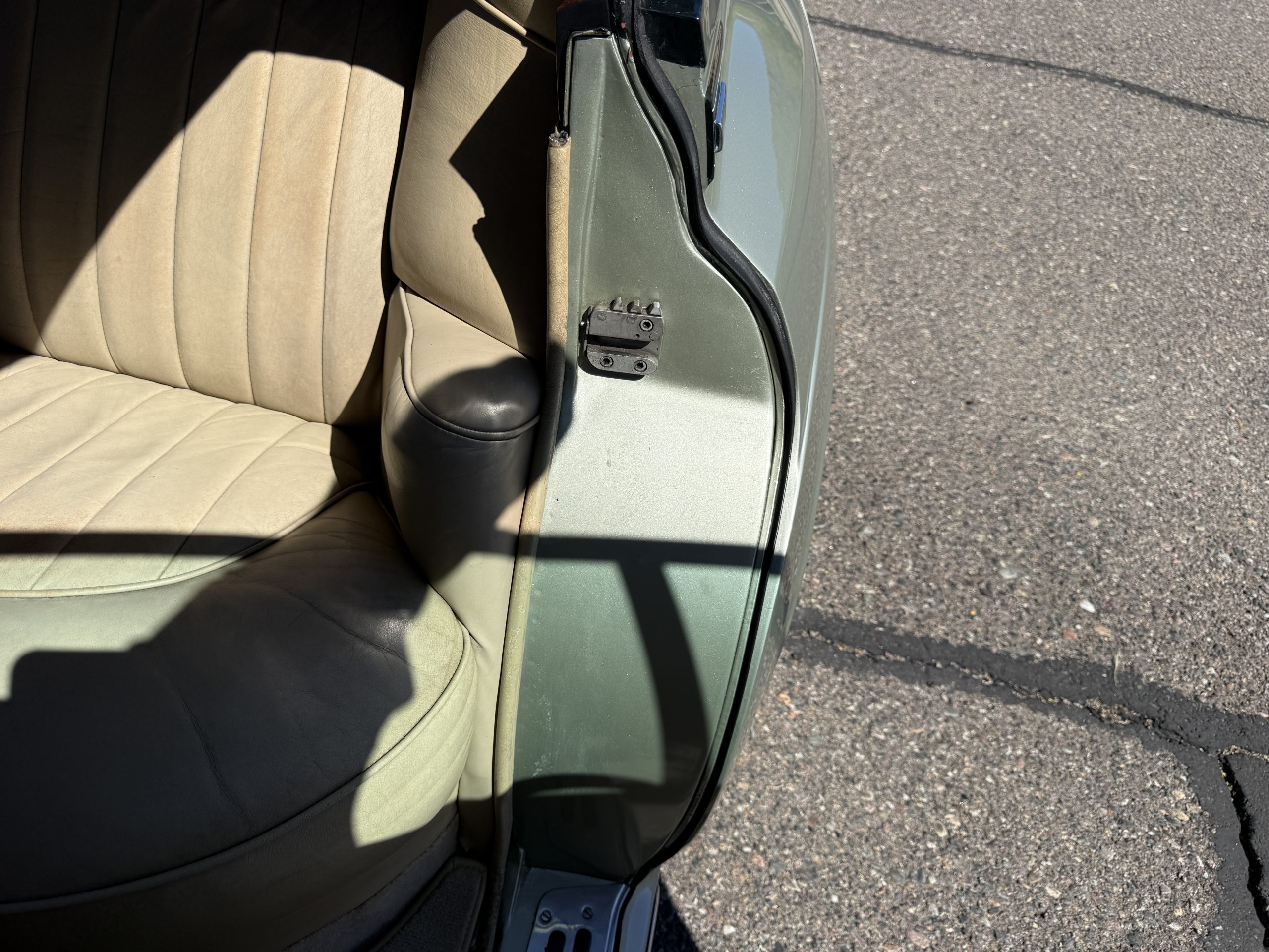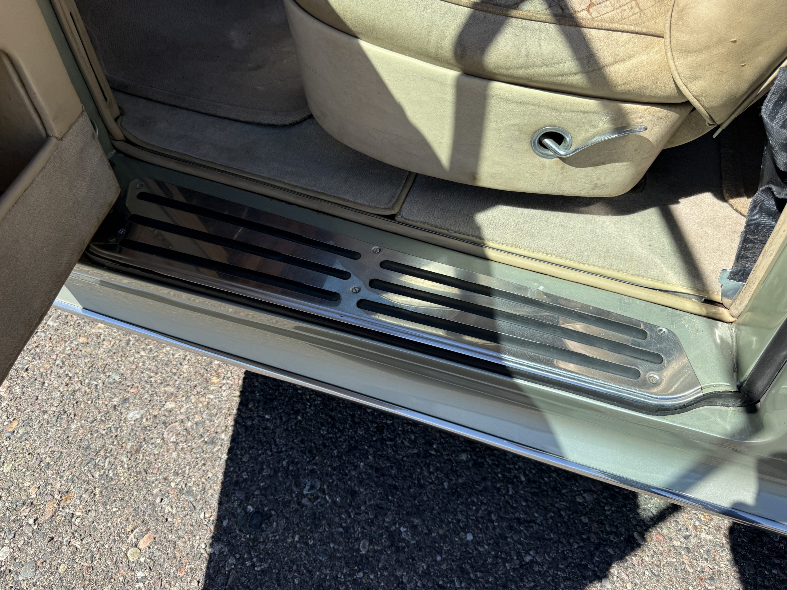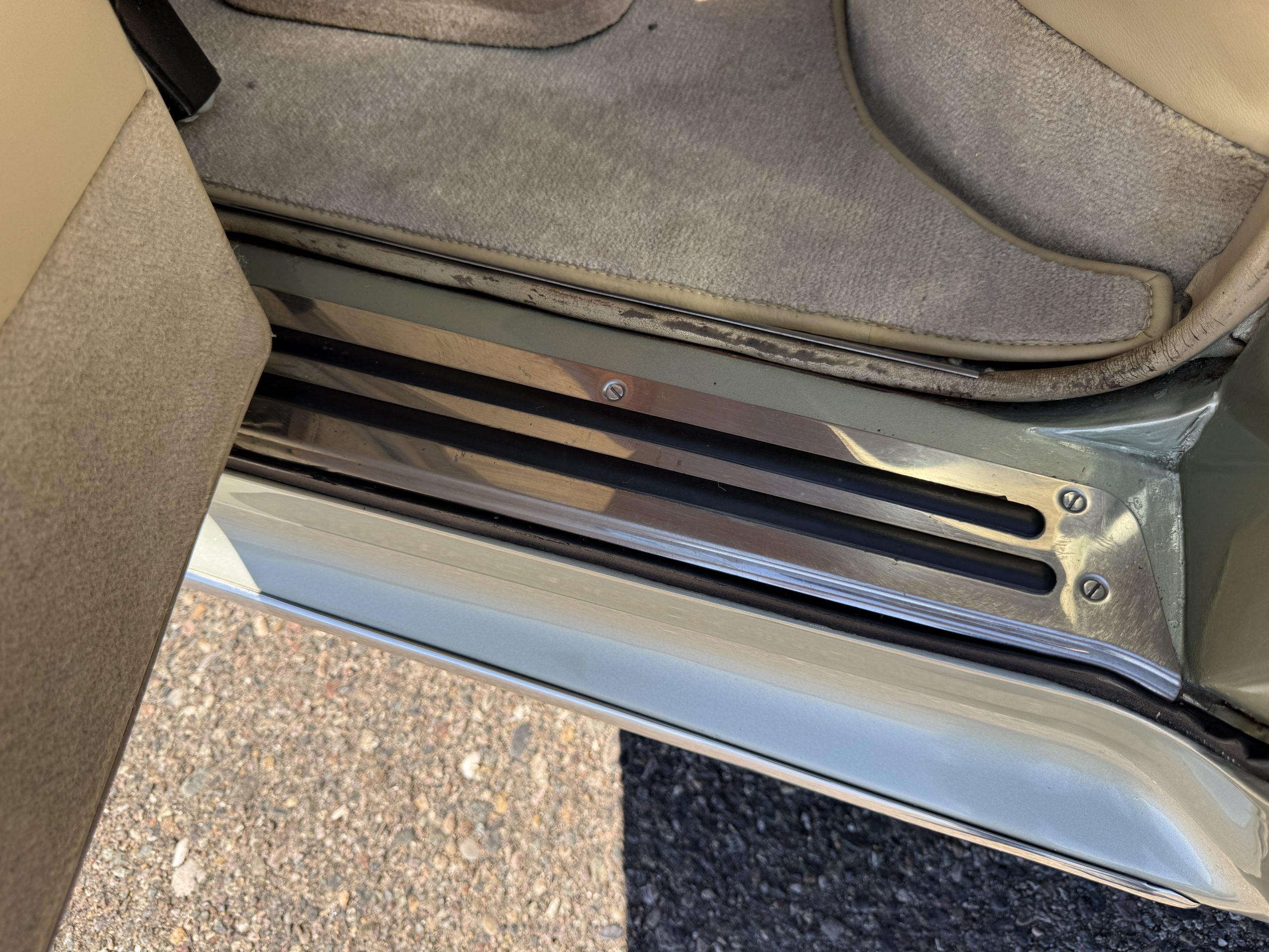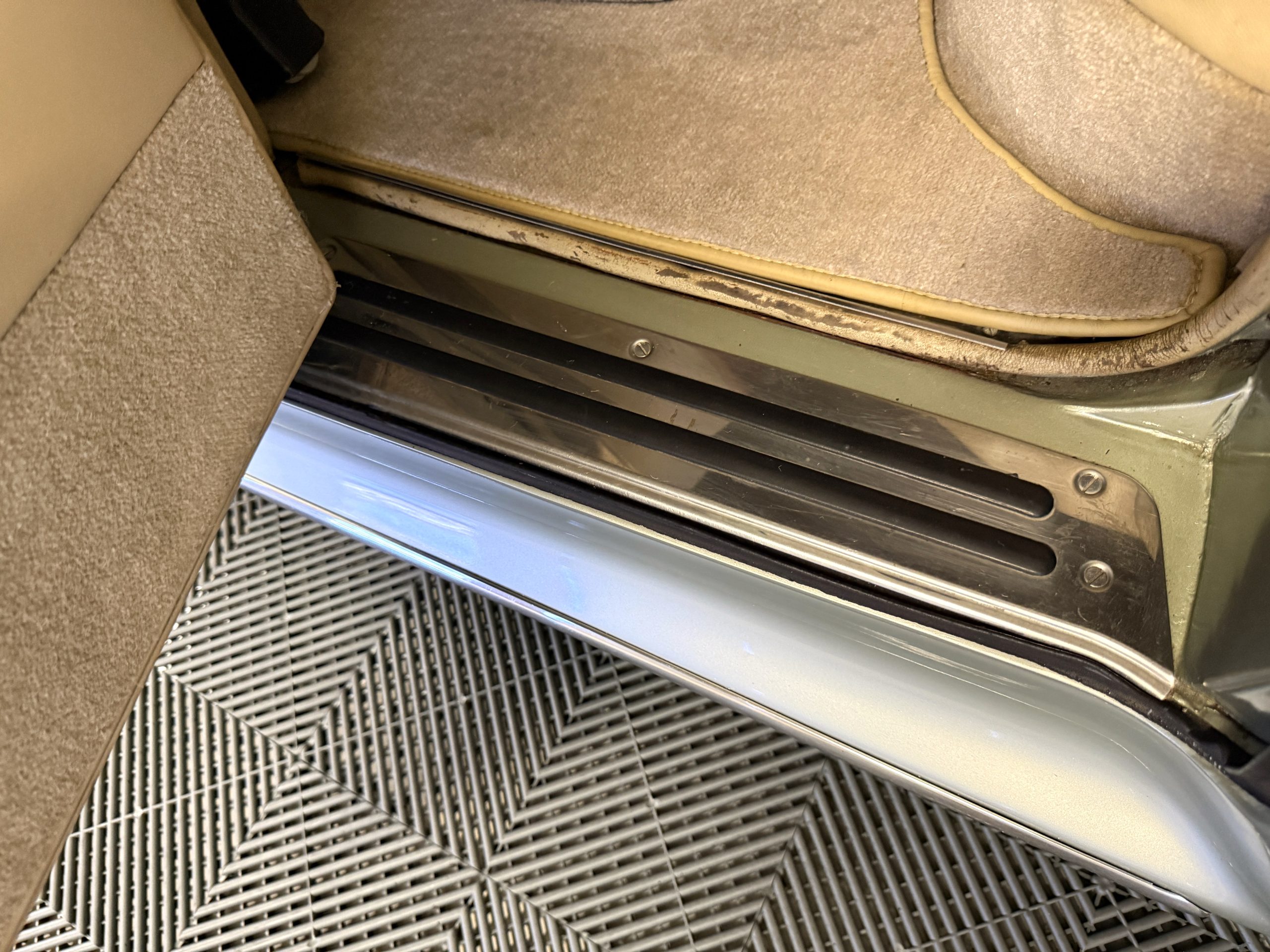 The Rolls-Royce is currently in velvet green over silver two tone with tan pinstriping that presents in great condition and shows good depth and luster. The prominent chrome grille, bumpers, Great Britain badge, and Spirit of Ecstasy remain bright and in very good condition. The cosmetic imperfections found are a slight dent on the rear driver-side swan neck overrider and dent on the roofline just above the windshield. The steel wheels finished in Velvet Green with Rolls-Royce logos present in good condition consistent with normal use and are mounted with wide whitewall tires in good condition but will need to be replaced due to age (2004). We are a dealer through Coker tire that the next owner can choose to use to purchase tires of their preference before delivery.