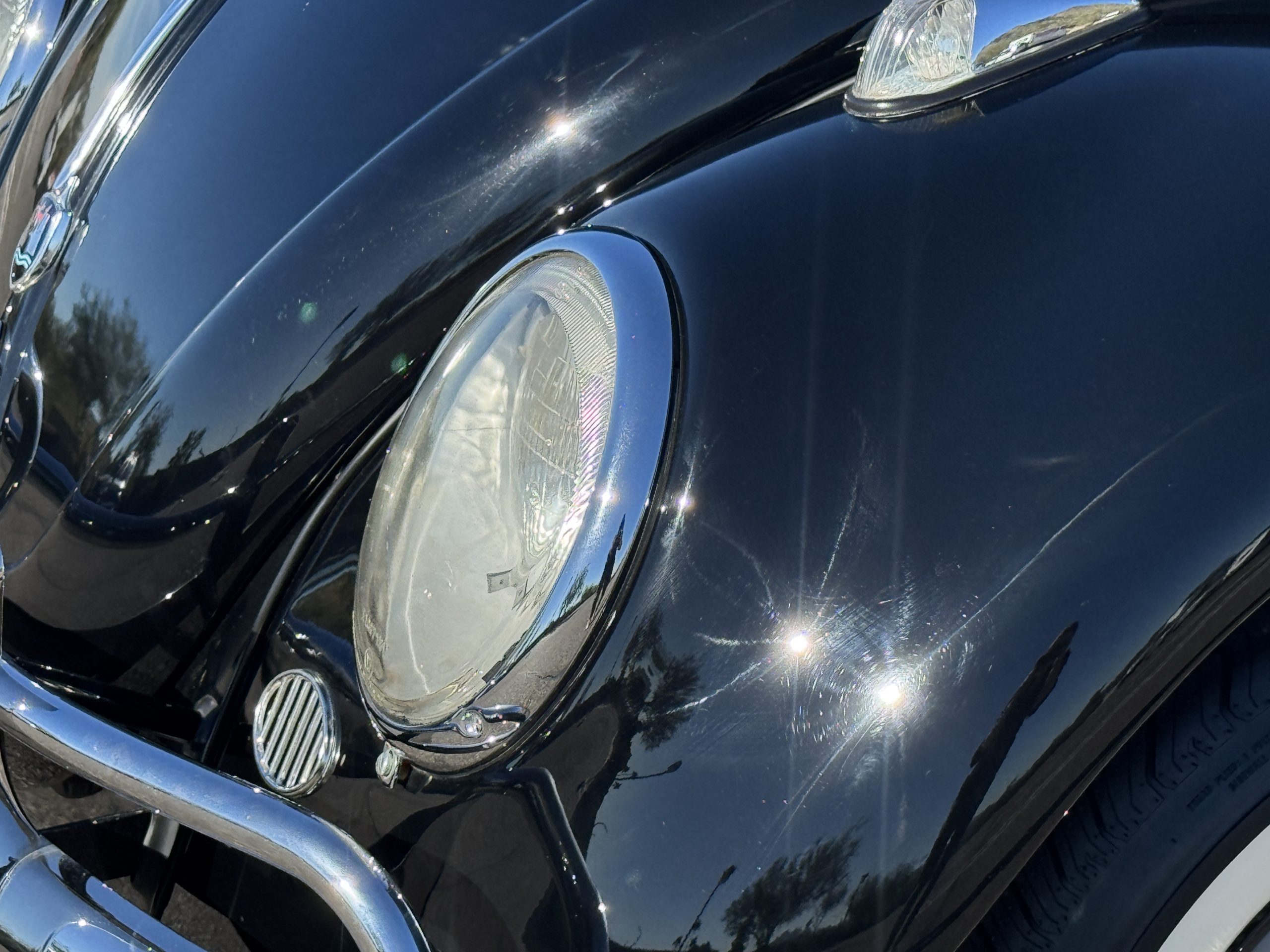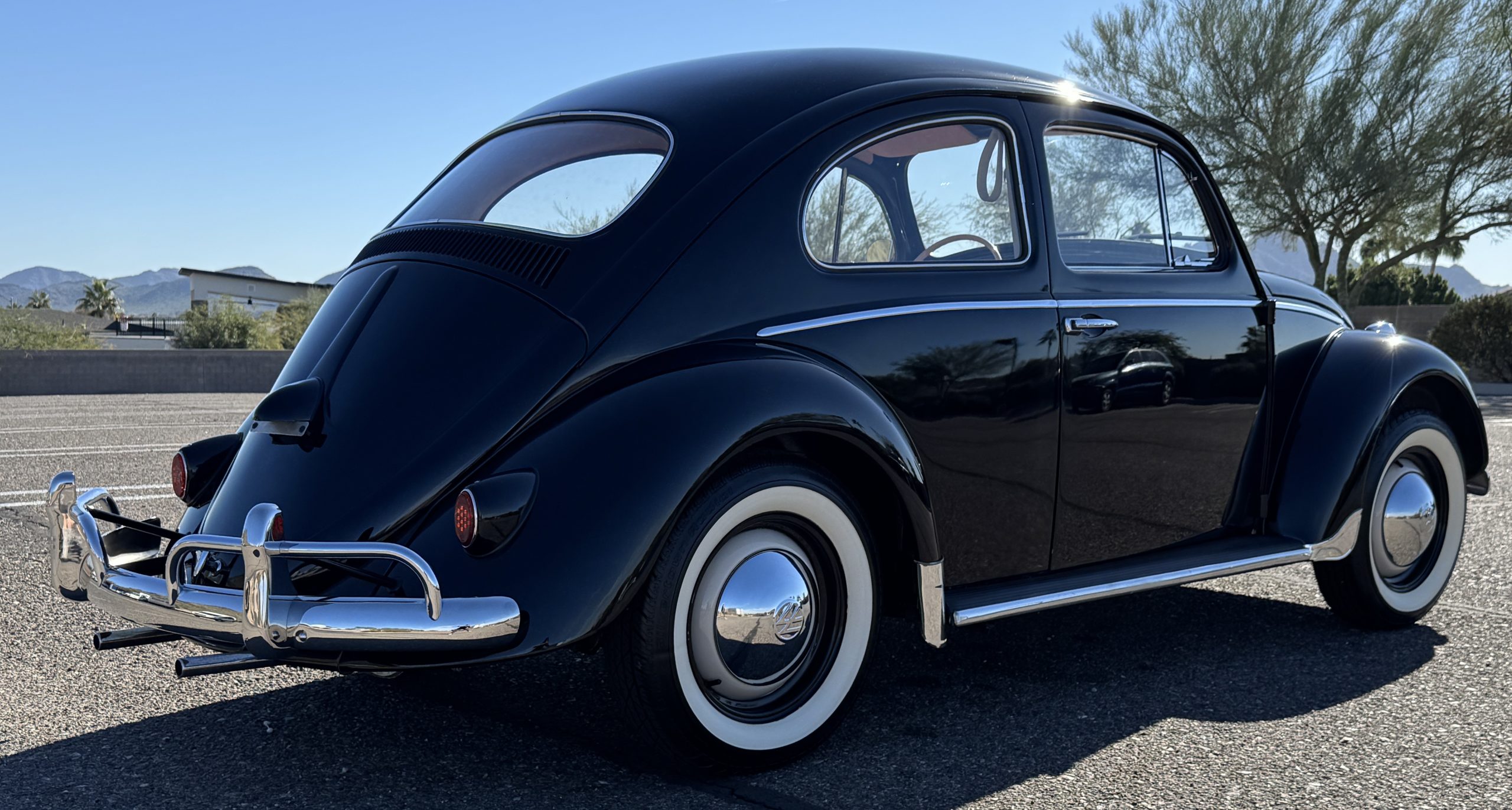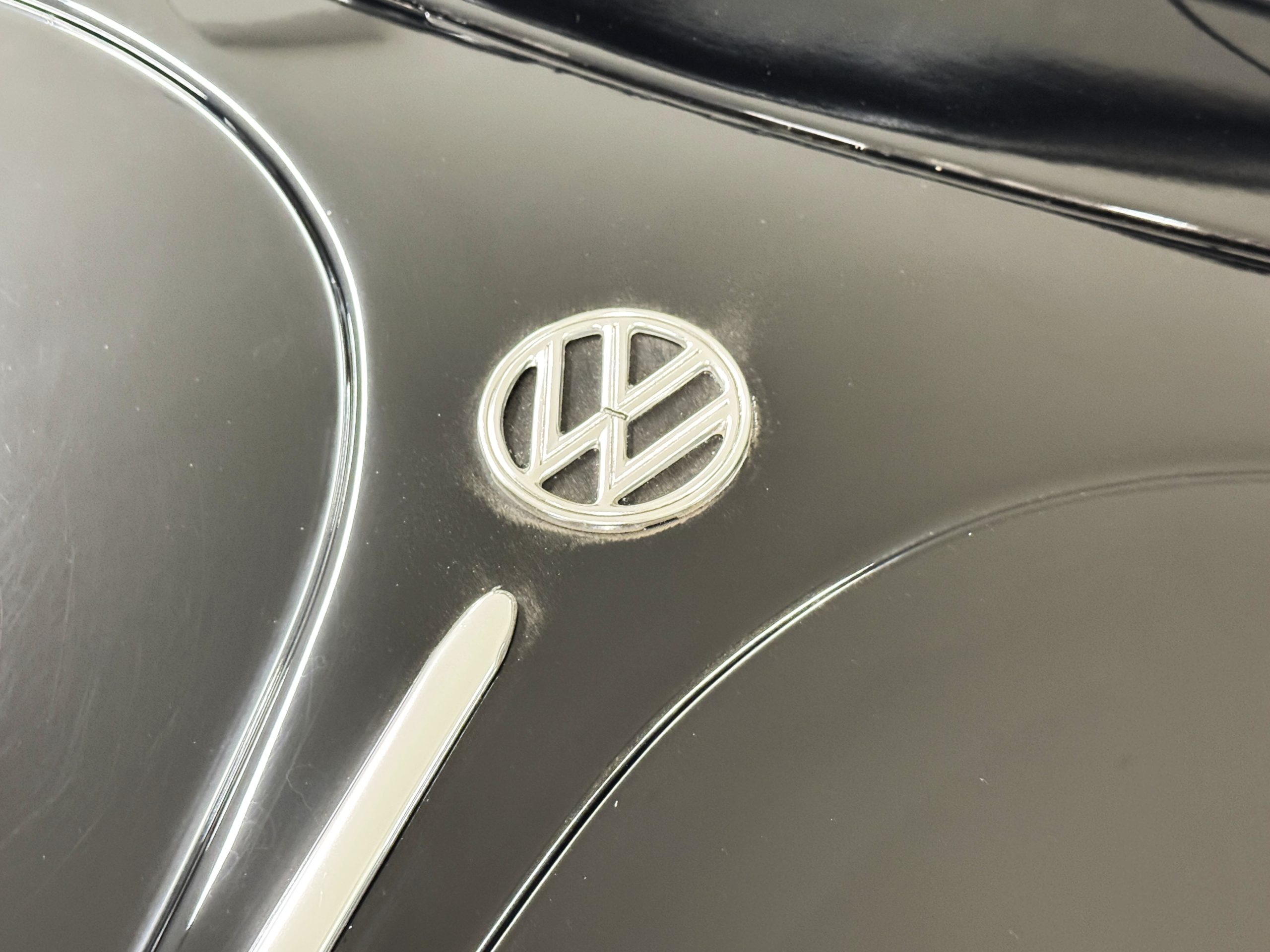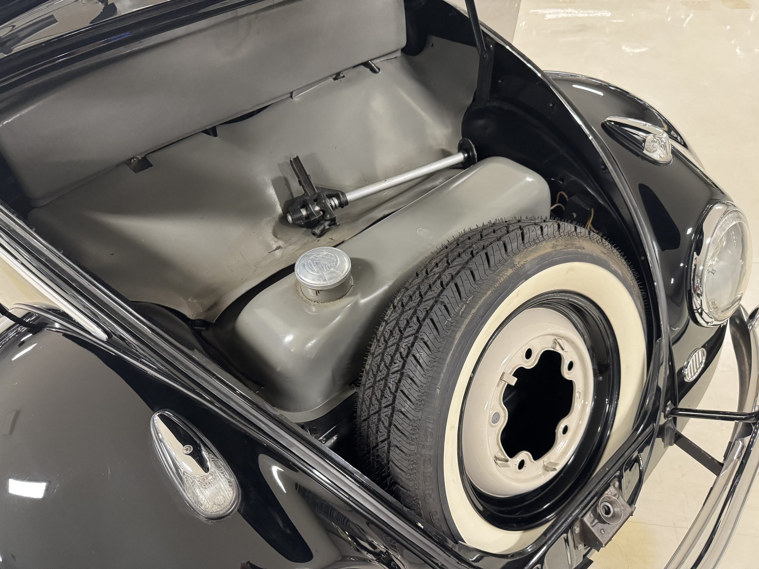 The exterior is finished in glossy black paint that presents with strong luster and consistent depth, showing only a few small rock chips in expected high-traffic areas. Chrome accents, including the front and rear bumpers and trim, remain in very good condition and complement the Wolfsburg crest hood emblem. Body panels are straight and well aligned, and the Beetle rides on four newer 165 R15 wide whitewall tires mounted with polished Volkswagen hubcaps, enhancing both visual appeal and period correctness.