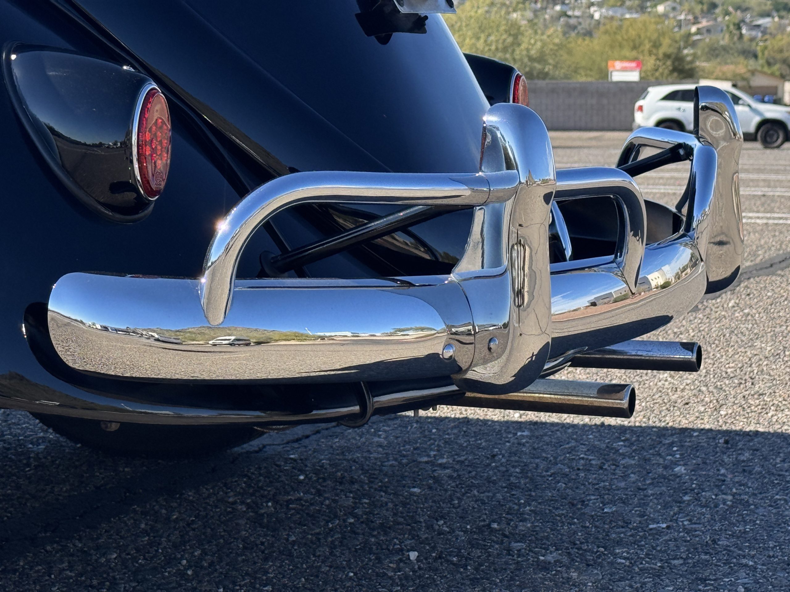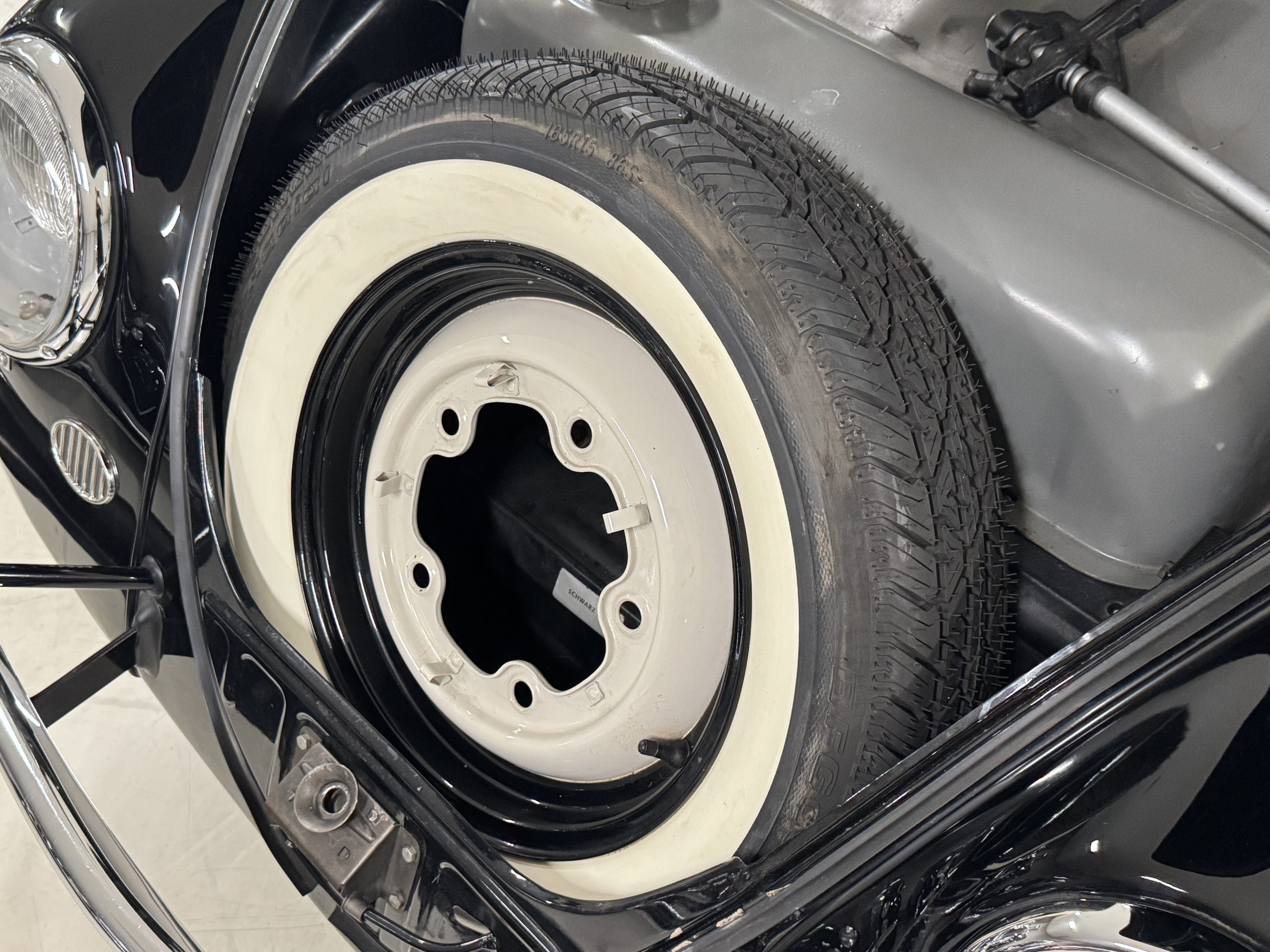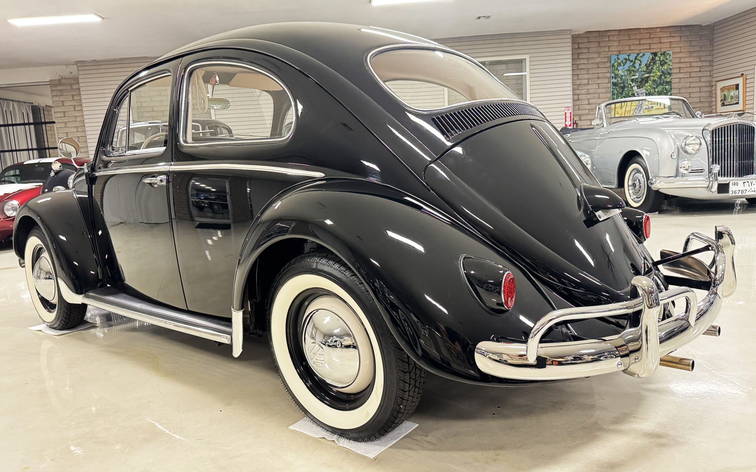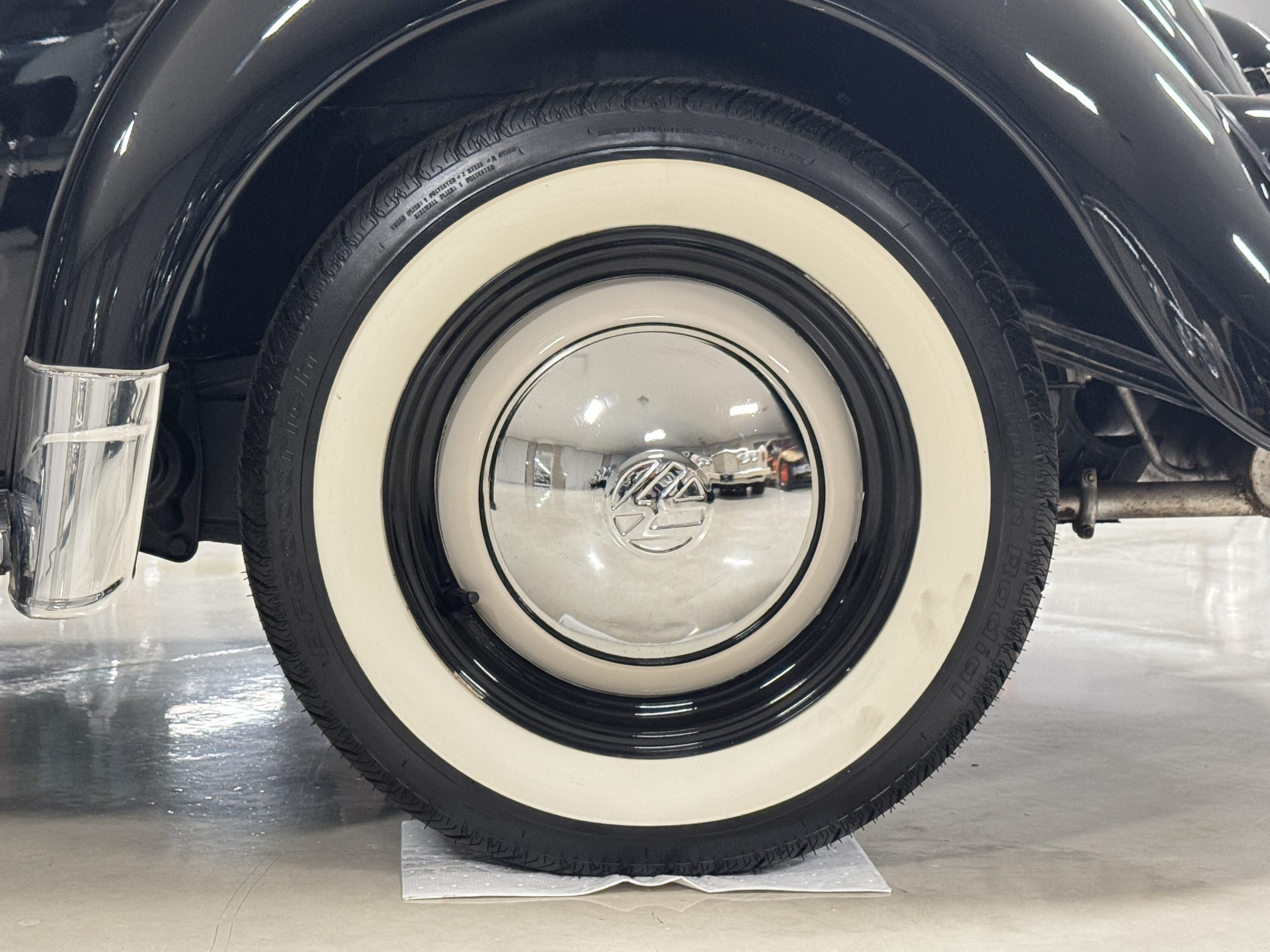 The exterior is finished in glossy black paint that presents with strong luster and consistent depth, showing only a few small rock chips in expected high-traffic areas. Chrome accents, including the front and rear bumpers and trim, remain in very good condition and complement the Wolfsburg crest hood emblem. Body panels are straight and well aligned, and the Beetle rides on four newer 165 R15 wide whitewall tires mounted with polished Volkswagen hubcaps, enhancing both visual appeal and period correctness.