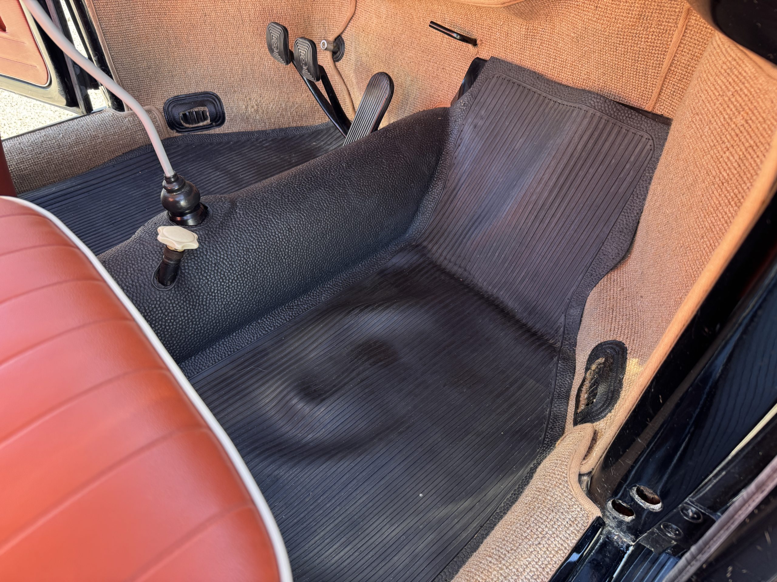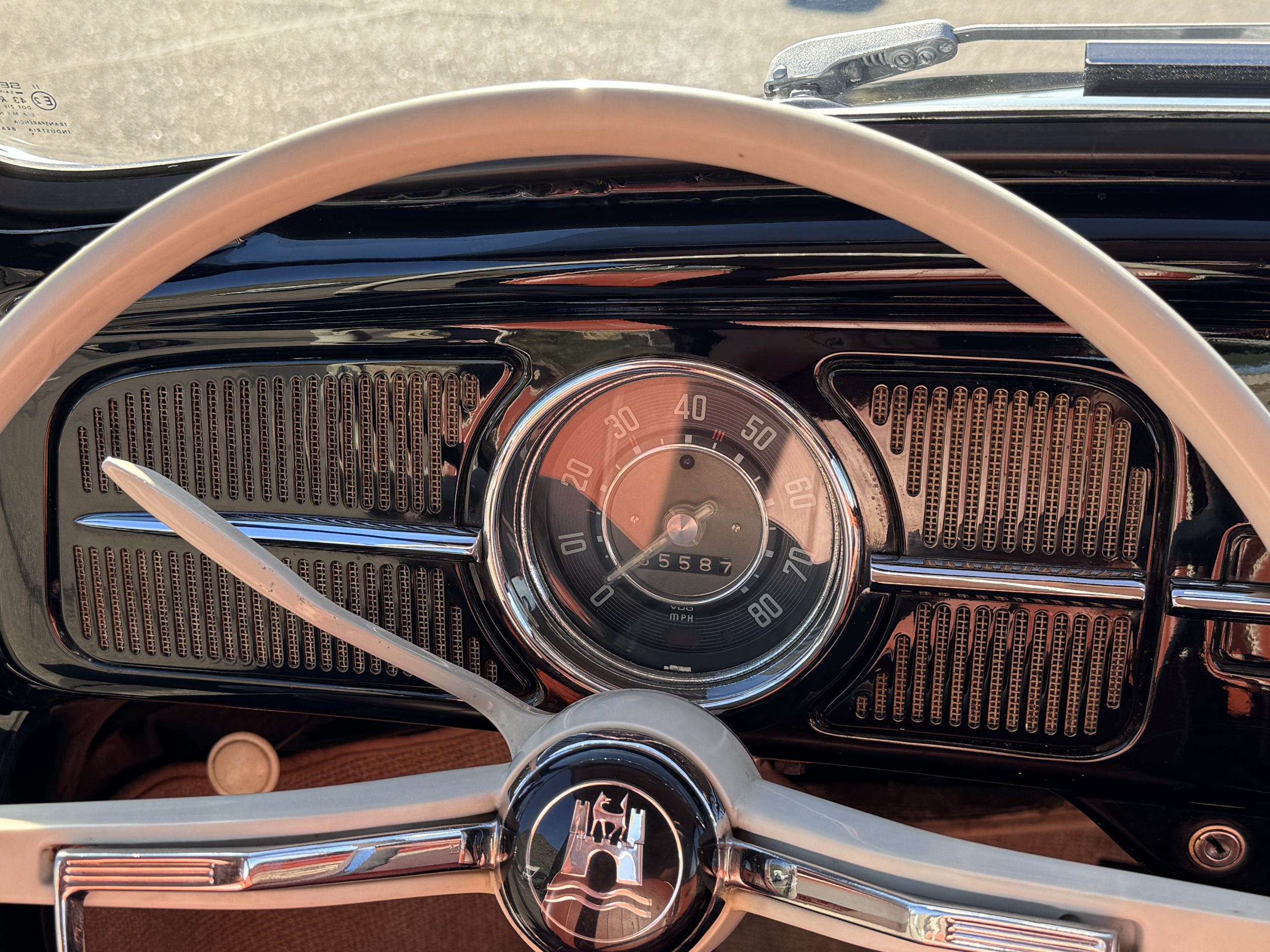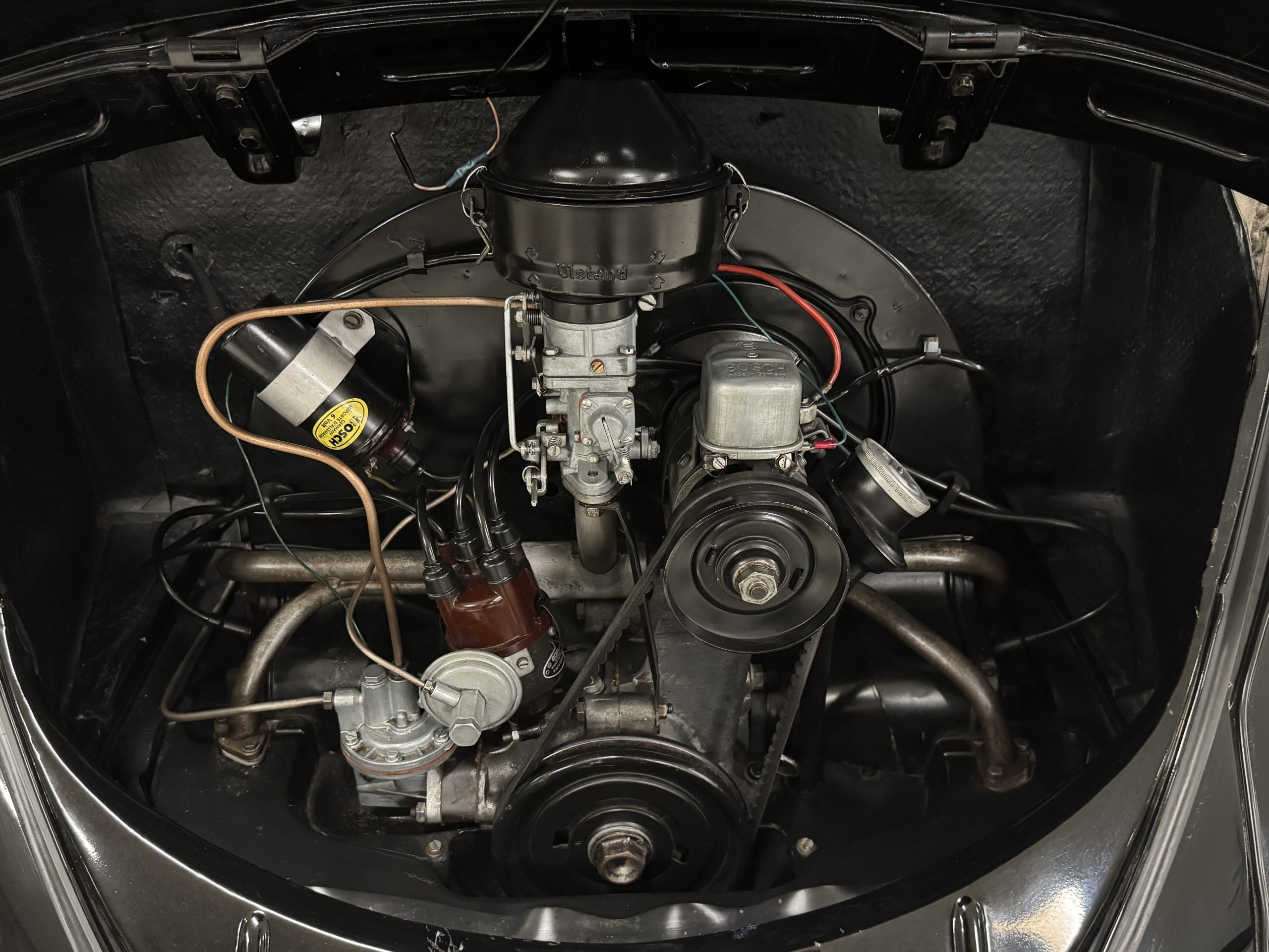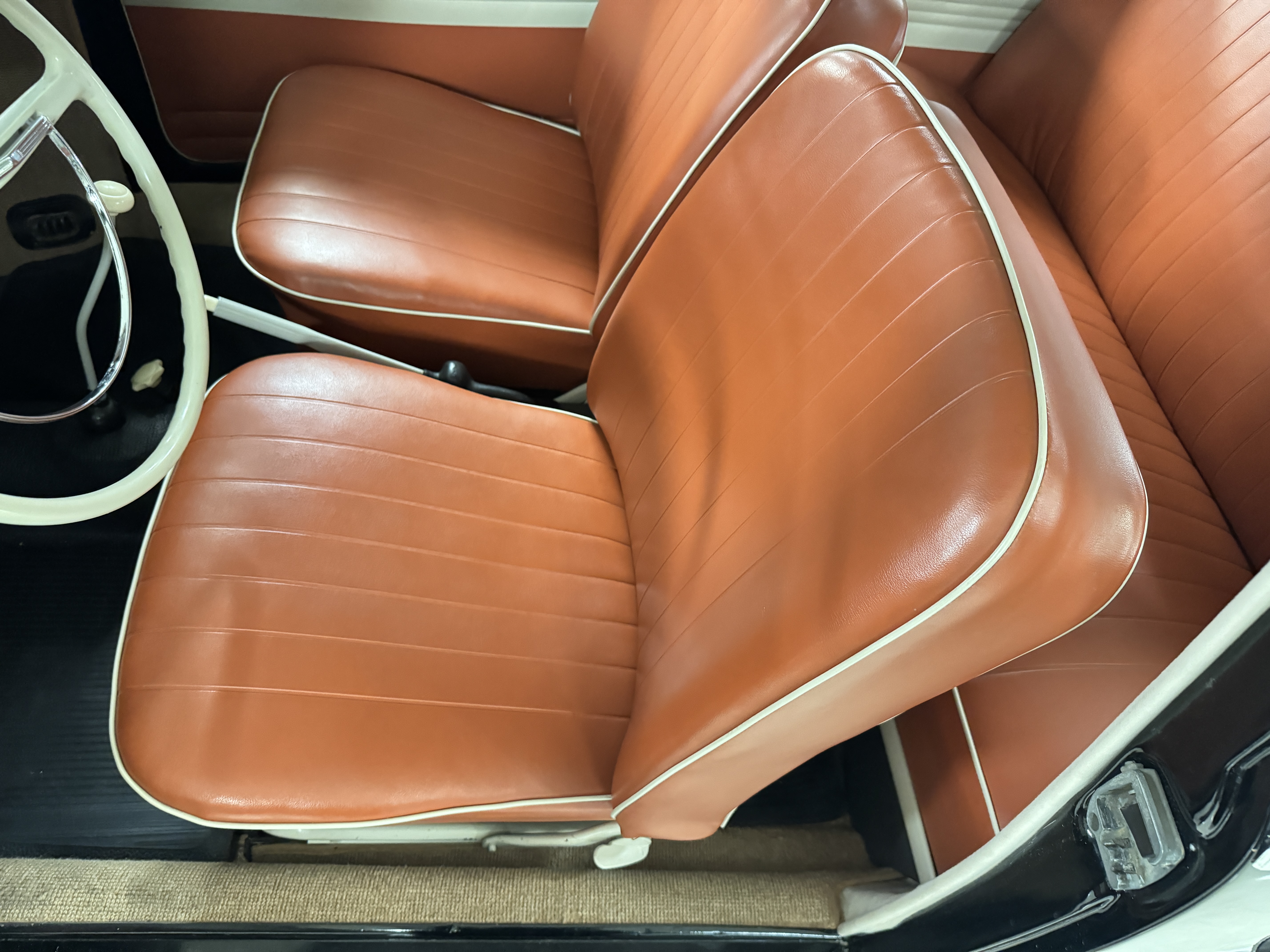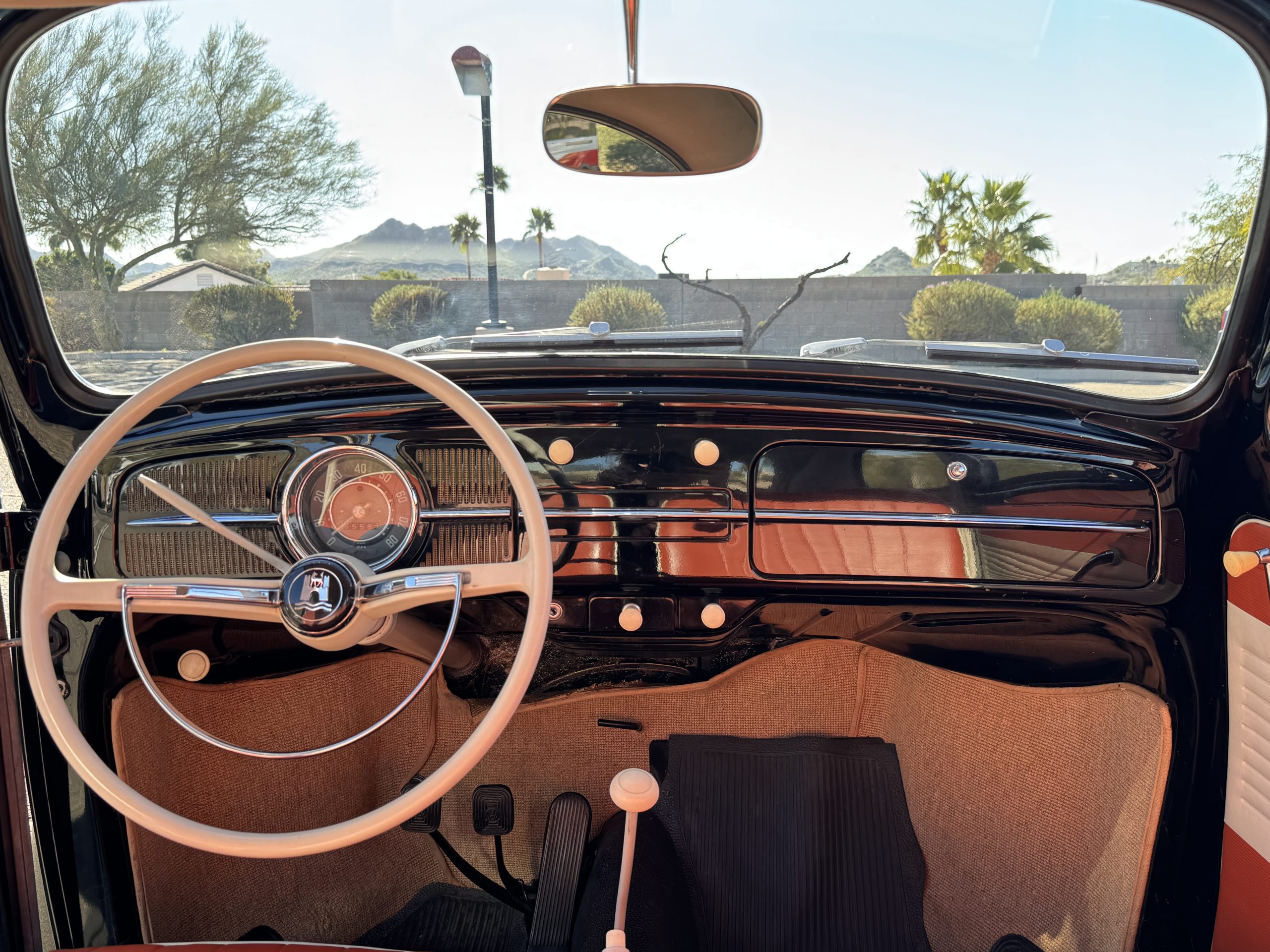 Inside, the cabin reflects Volkswagen’s thoughtful approach to efficient design. Red leatherette front bucket seats and a rear bench seat accommodate four passengers comfortably and remain in excellent condition, accented by Adobe Beige piping and matching door panels. Black and tan rolled-pile carpeting with rubber edging presents very well, reinforcing durability and ease of use. The left-hand-drive layout features the original-style steering wheel adorned with the Wolfsburg castle and wolf crest, anchoring the interior firmly in its German heritage. The simplified and vented dash features only an 80mph speedometer and glove box.