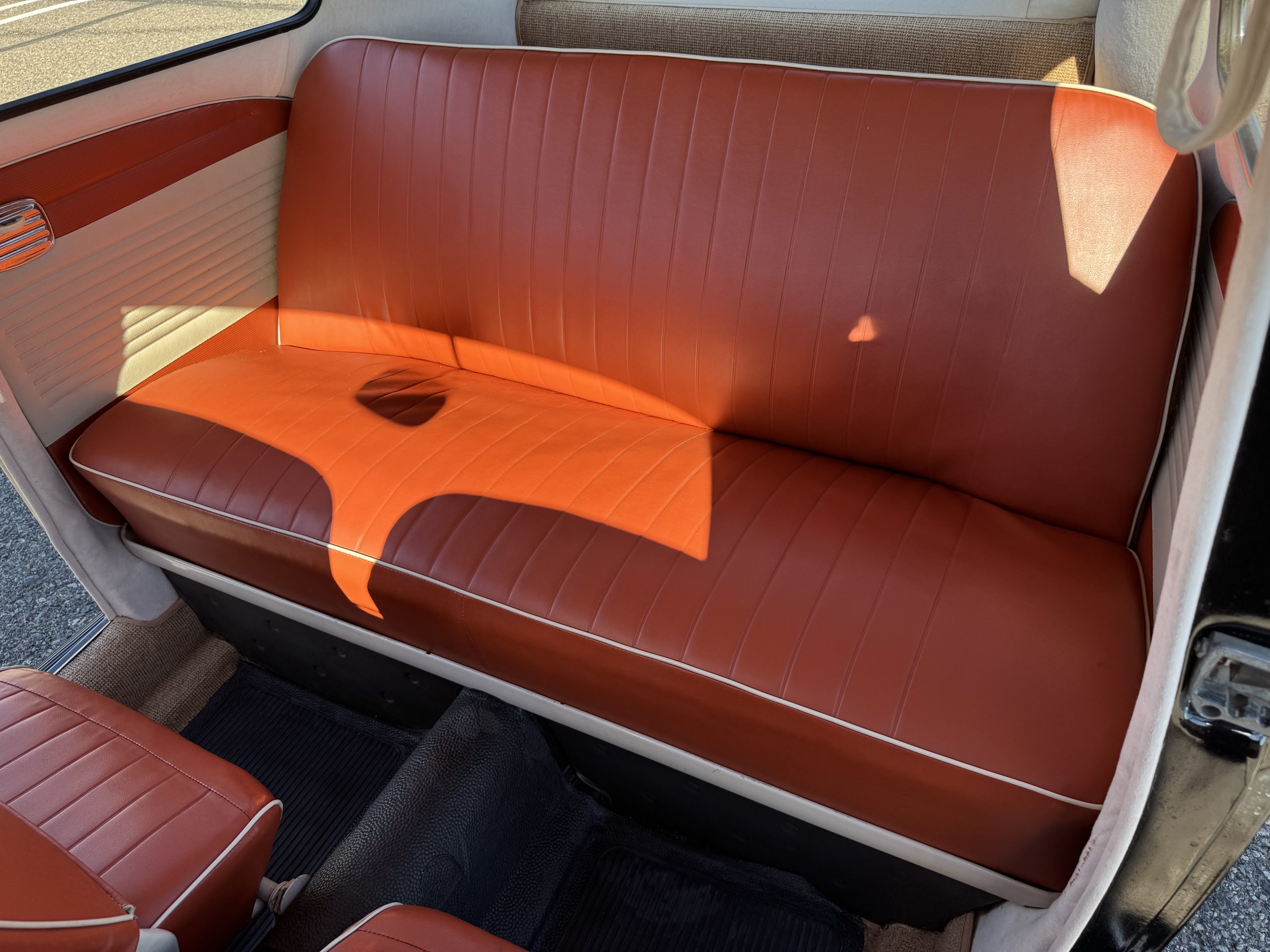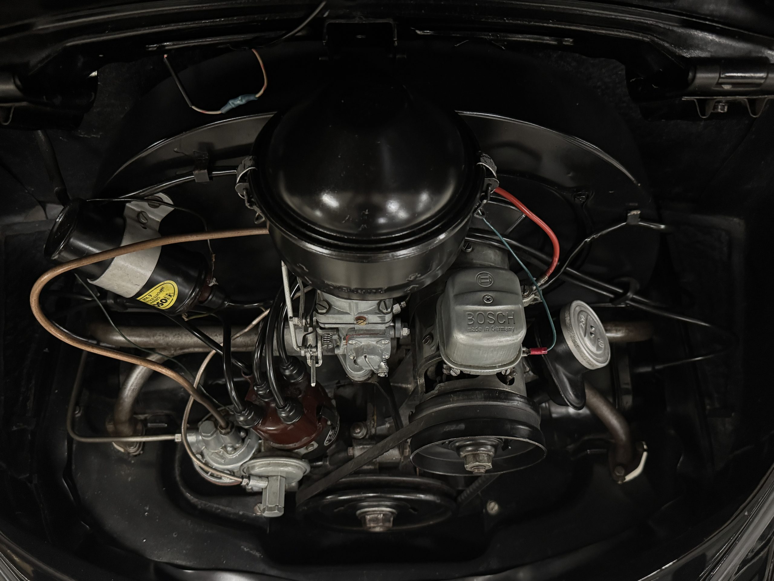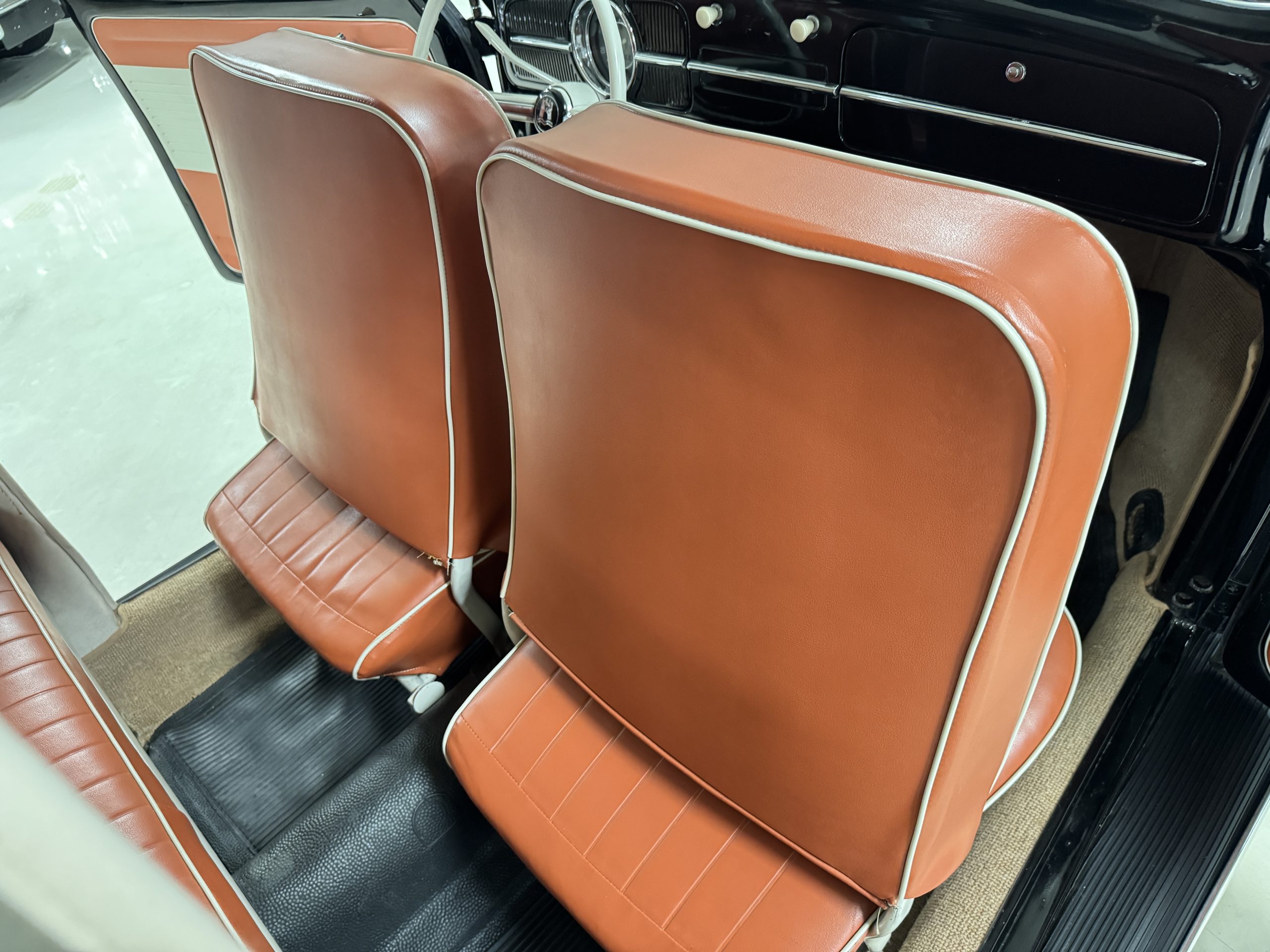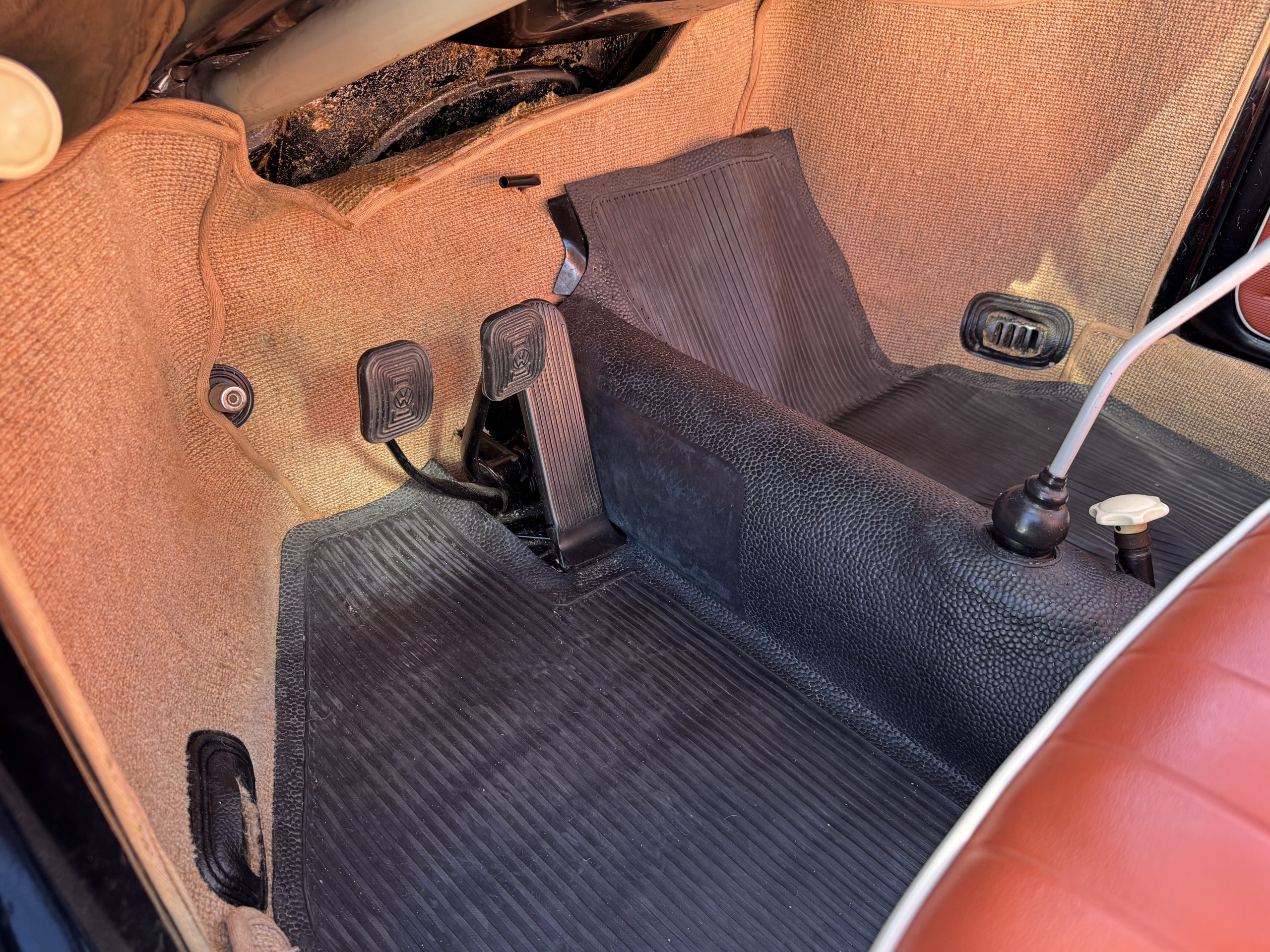 Inside, the cabin reflects Volkswagen’s thoughtful approach to efficient design. Red leatherette front bucket seats and a rear bench seat accommodate four passengers comfortably and remain in excellent condition, accented by Adobe Beige piping and matching door panels. Black and tan rolled-pile carpeting with rubber edging presents very well, reinforcing durability and ease of use. The left-hand-drive layout features the original-style steering wheel adorned with the Wolfsburg castle and wolf crest, anchoring the interior firmly in its German heritage. The simplified and vented dash features only an 80mph speedometer and glove box.