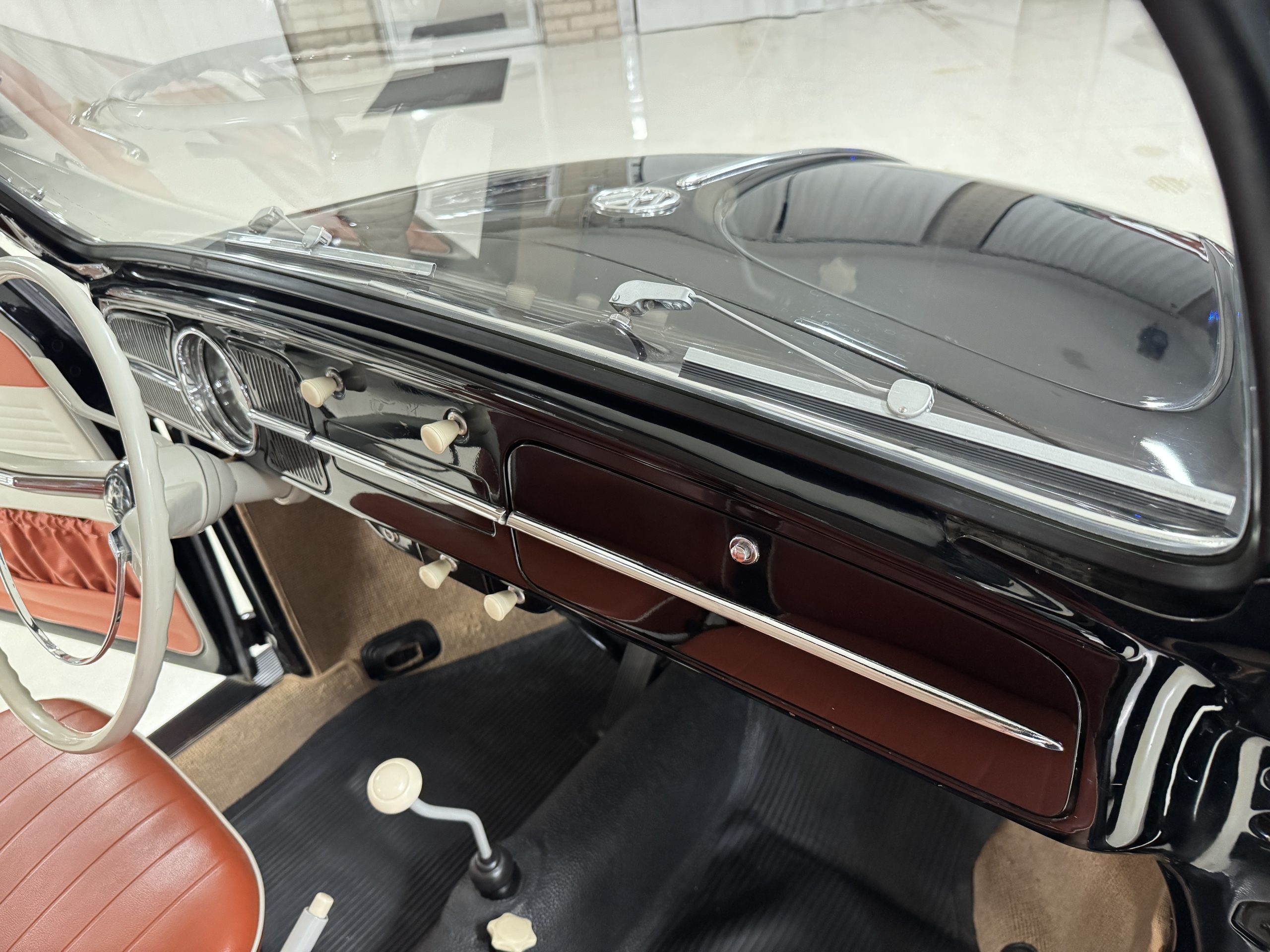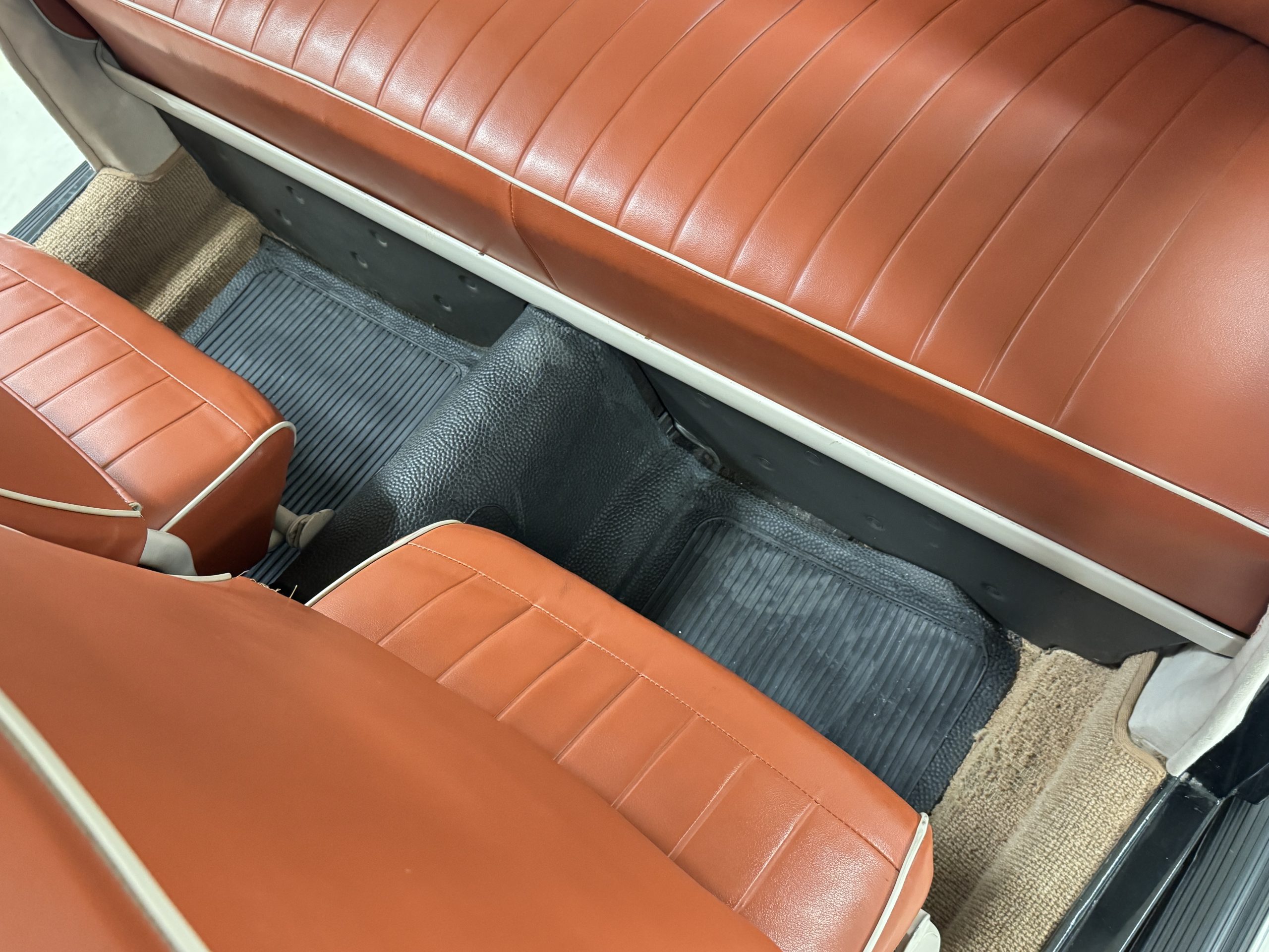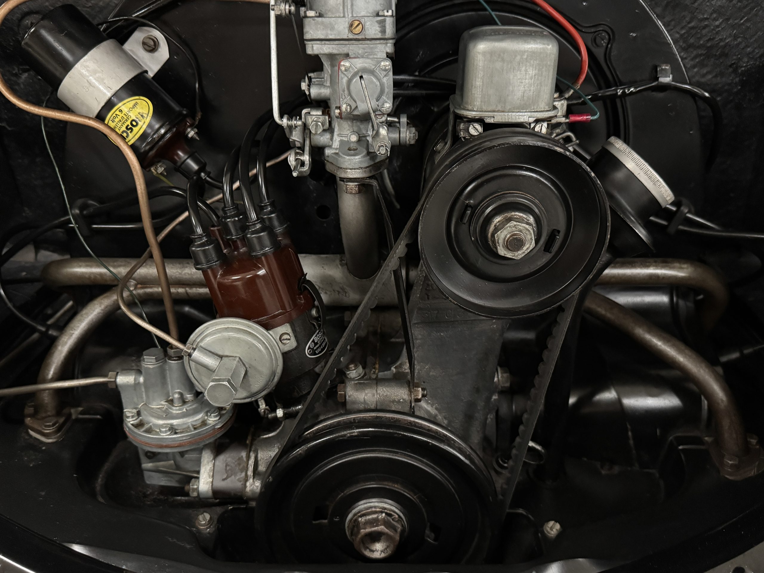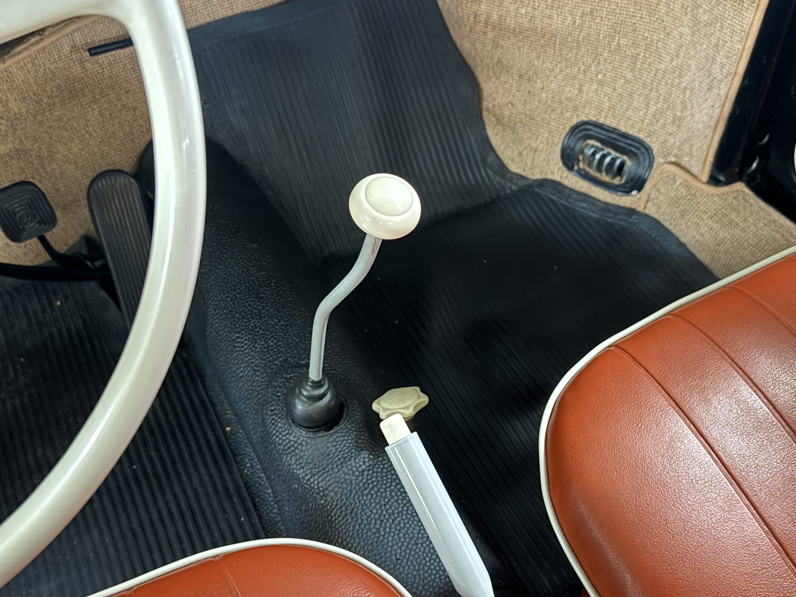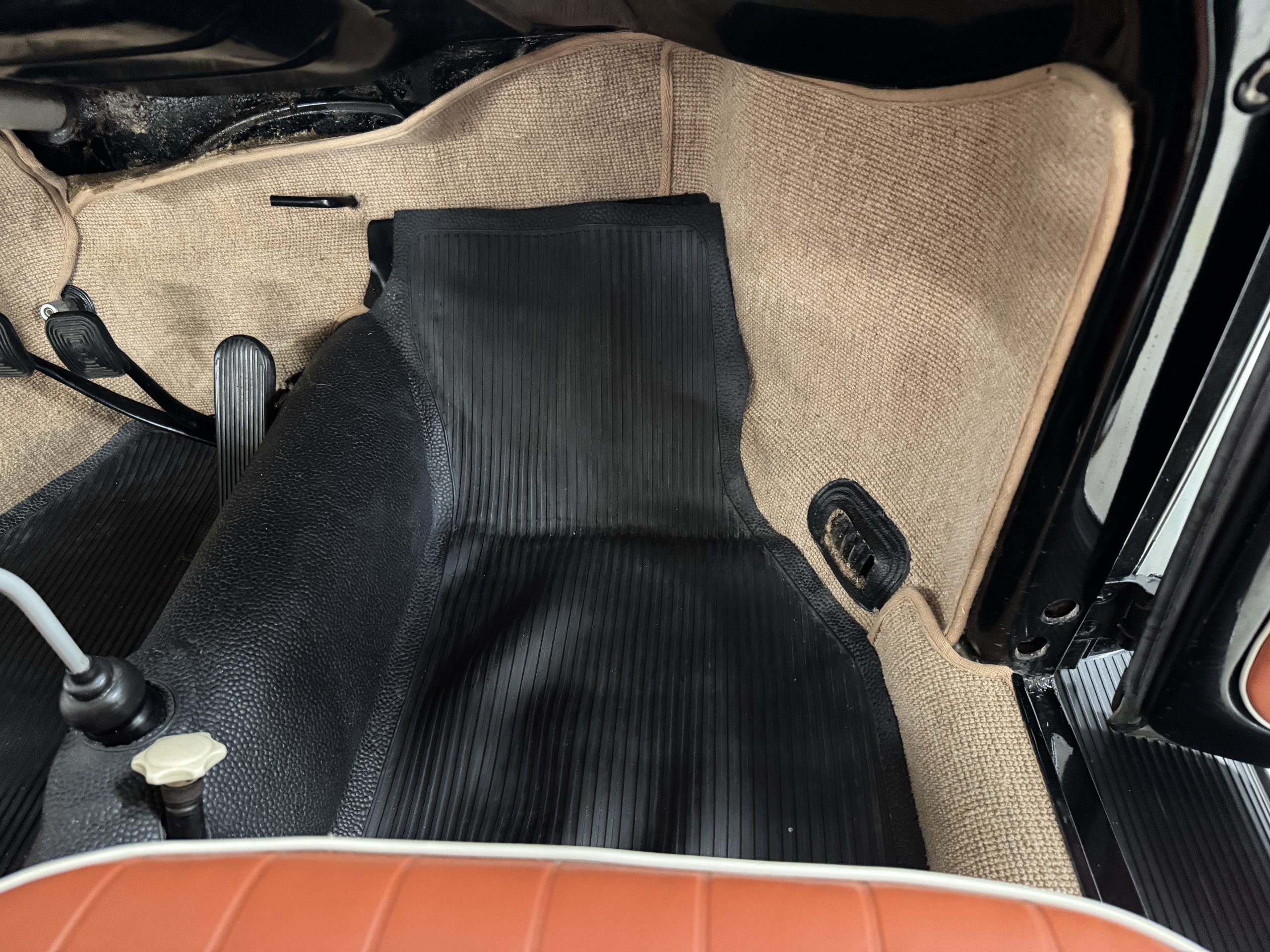 Inside, the cabin reflects Volkswagen’s thoughtful approach to efficient design. Red leatherette front bucket seats and a rear bench seat accommodate four passengers comfortably and remain in excellent condition, accented by Adobe Beige piping and matching door panels. Black and tan rolled-pile carpeting with rubber edging presents very well, reinforcing durability and ease of use. The left-hand-drive layout features the original-style steering wheel adorned with the Wolfsburg castle and wolf crest, anchoring the interior firmly in its German heritage. The simplified and vented dash features only an 80mph speedometer and glove box.