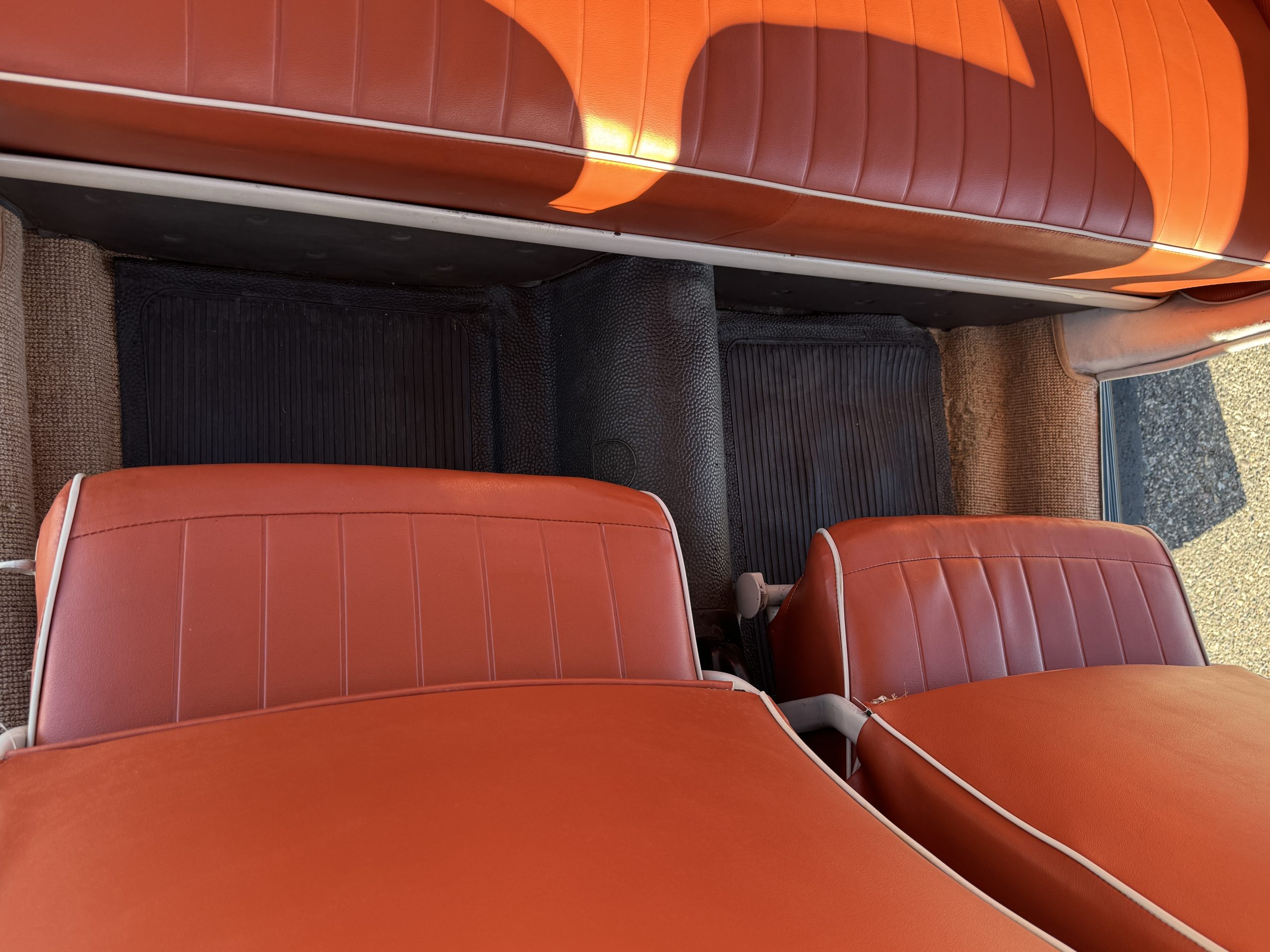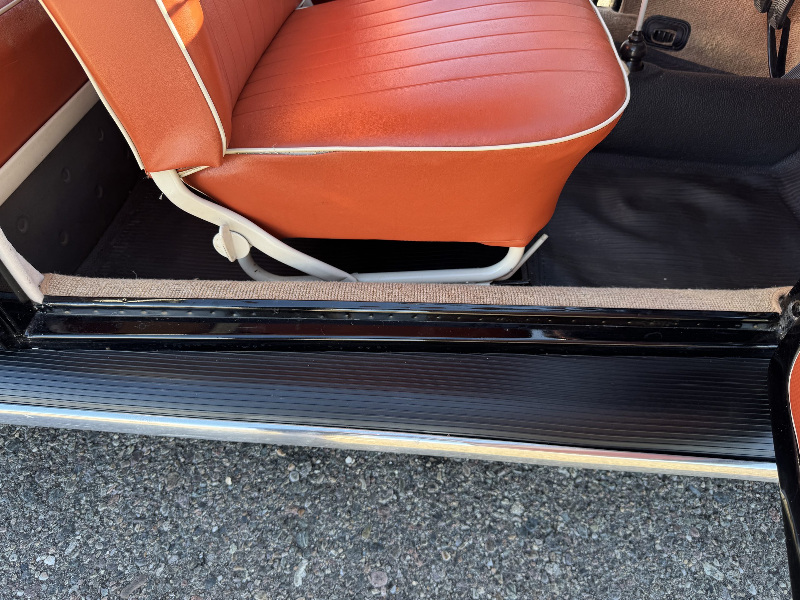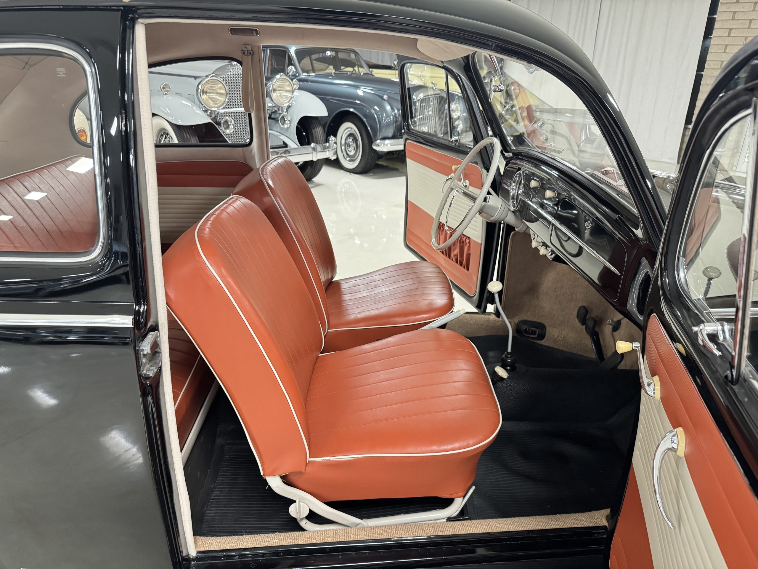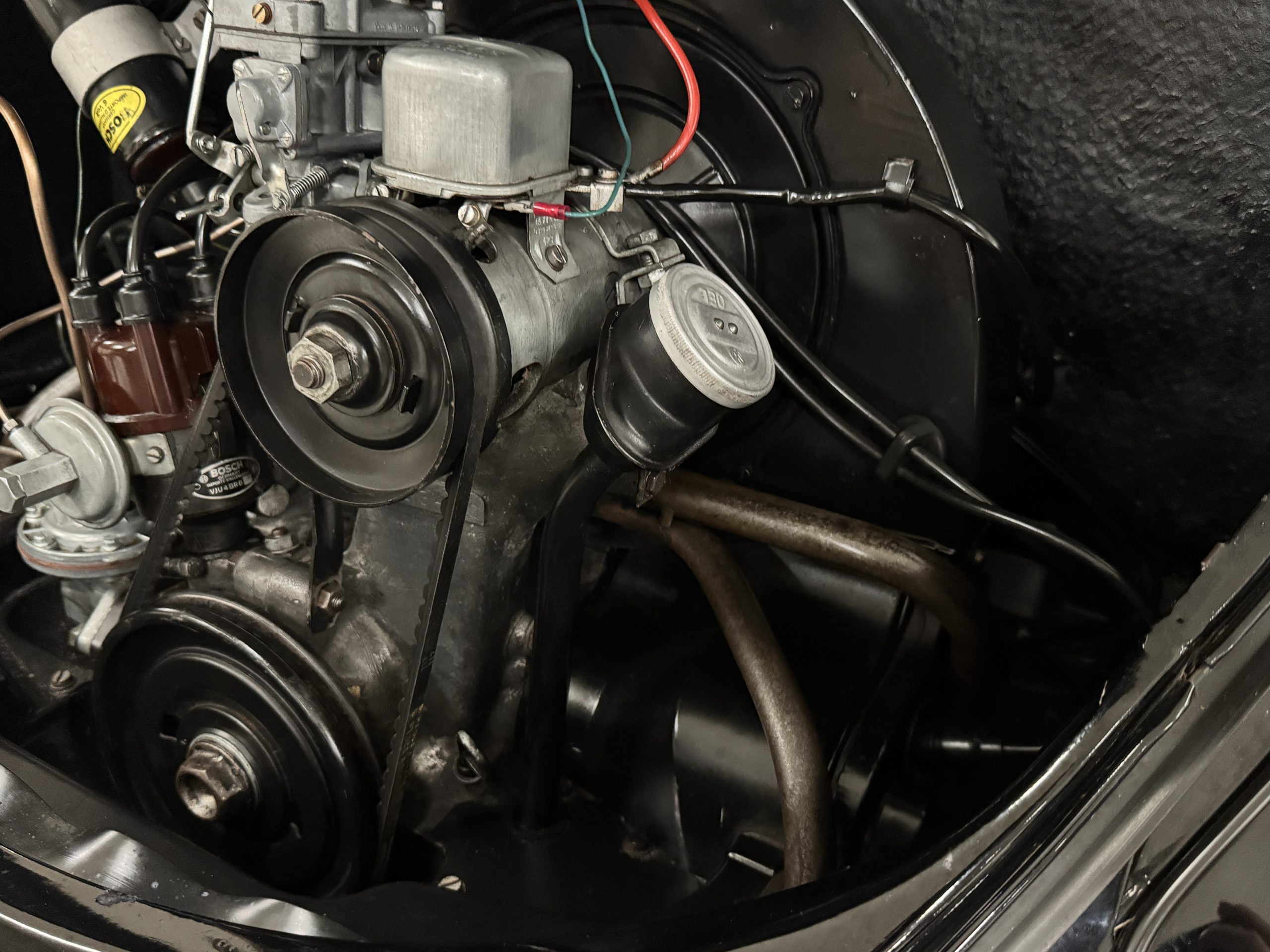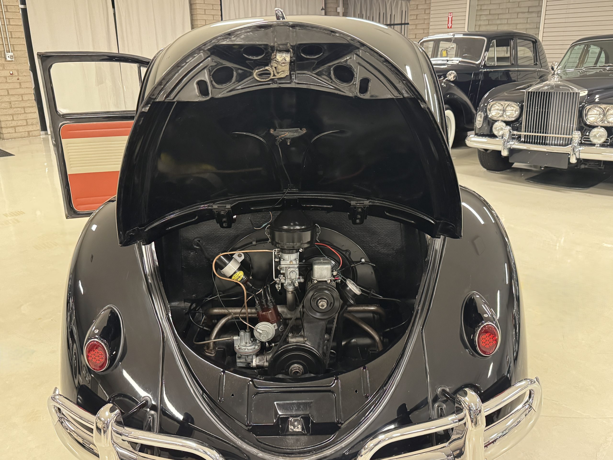 Inside, the cabin reflects Volkswagen’s thoughtful approach to efficient design. Red leatherette front bucket seats and a rear bench seat accommodate four passengers comfortably and remain in excellent condition, accented by Adobe Beige piping and matching door panels. Black and tan rolled-pile carpeting with rubber edging presents very well, reinforcing durability and ease of use. The left-hand-drive layout features the original-style steering wheel adorned with the Wolfsburg castle and wolf crest, anchoring the interior firmly in its German heritage. The simplified and vented dash features only an 80mph speedometer and glove box.