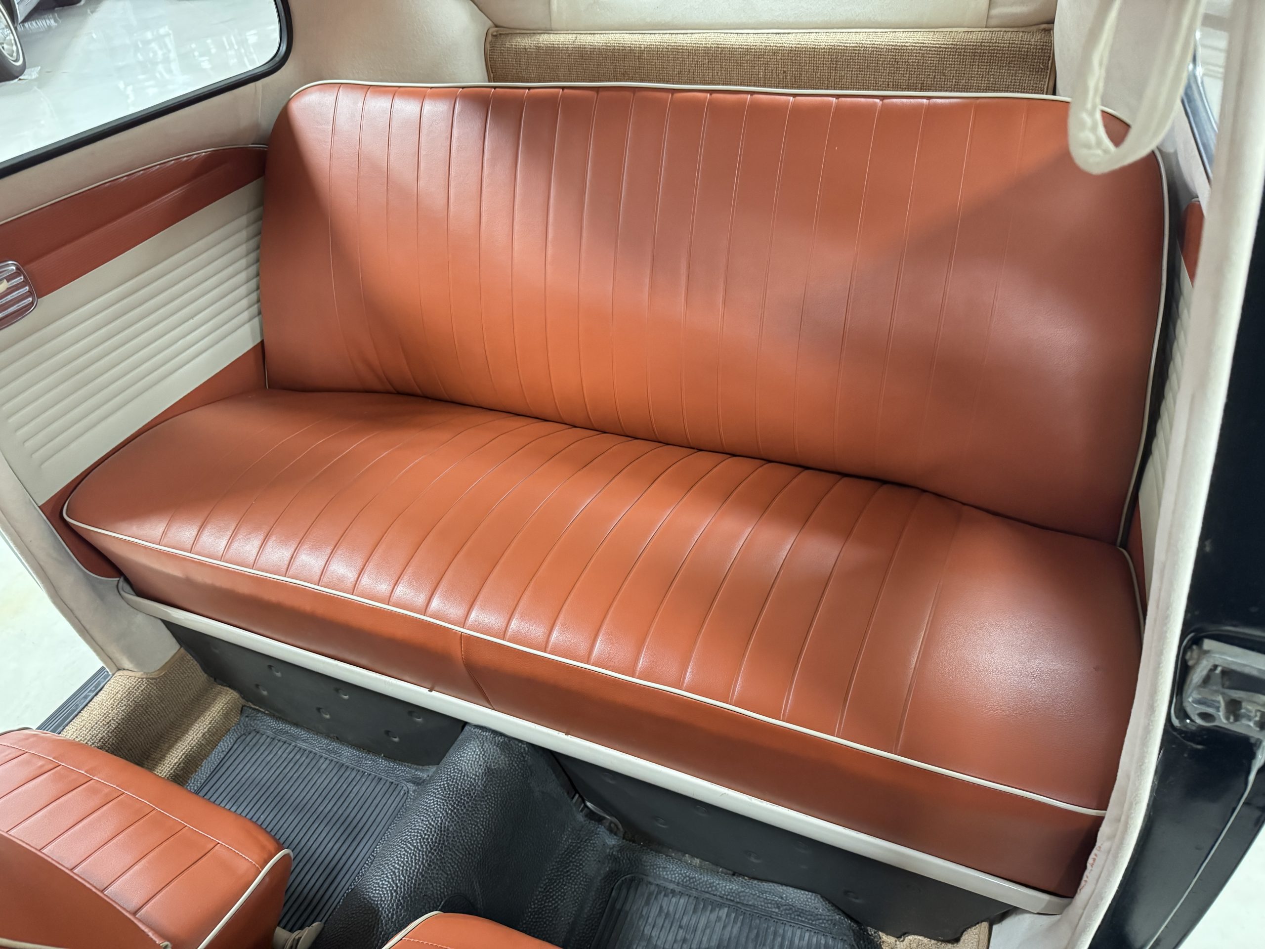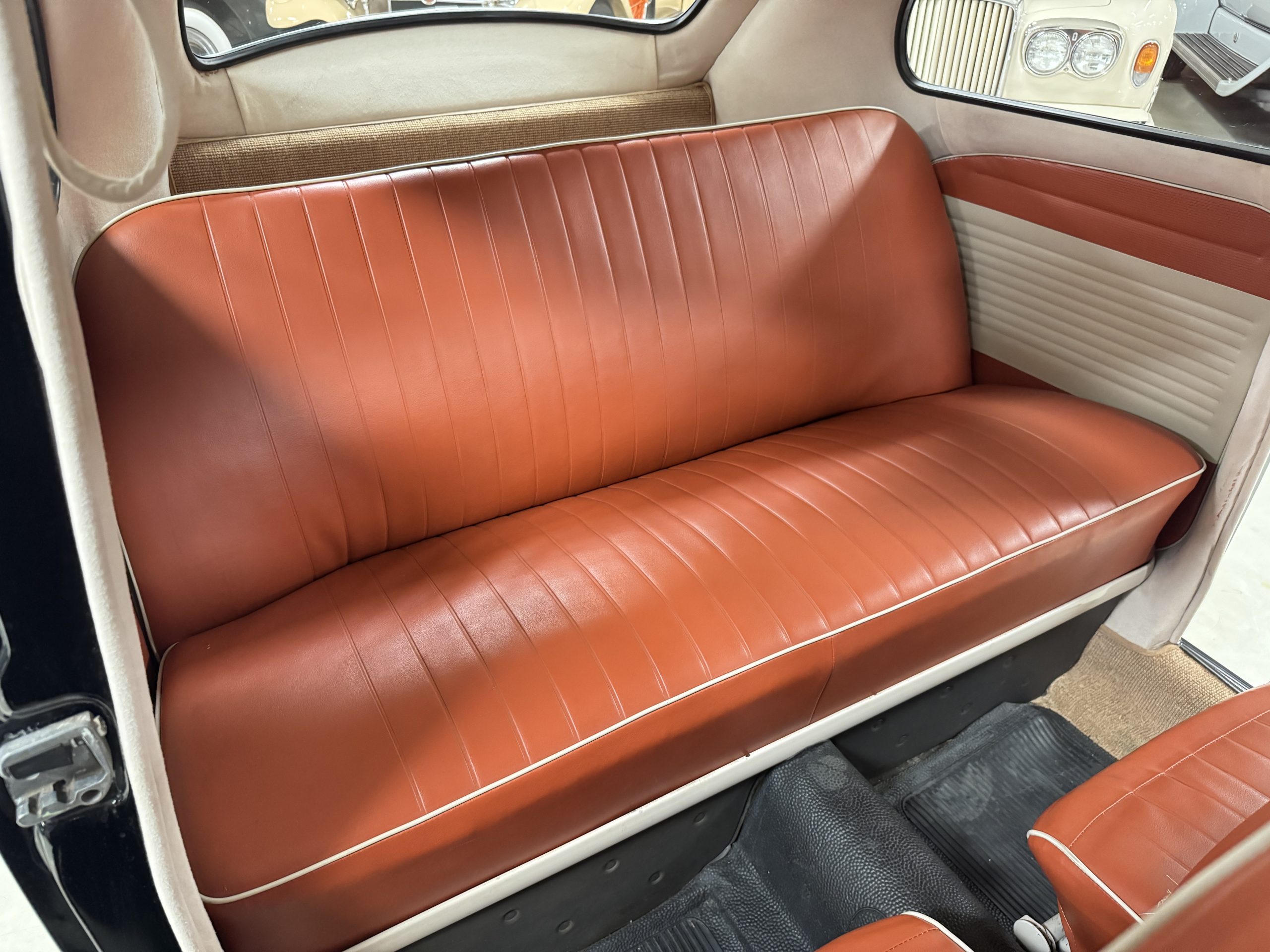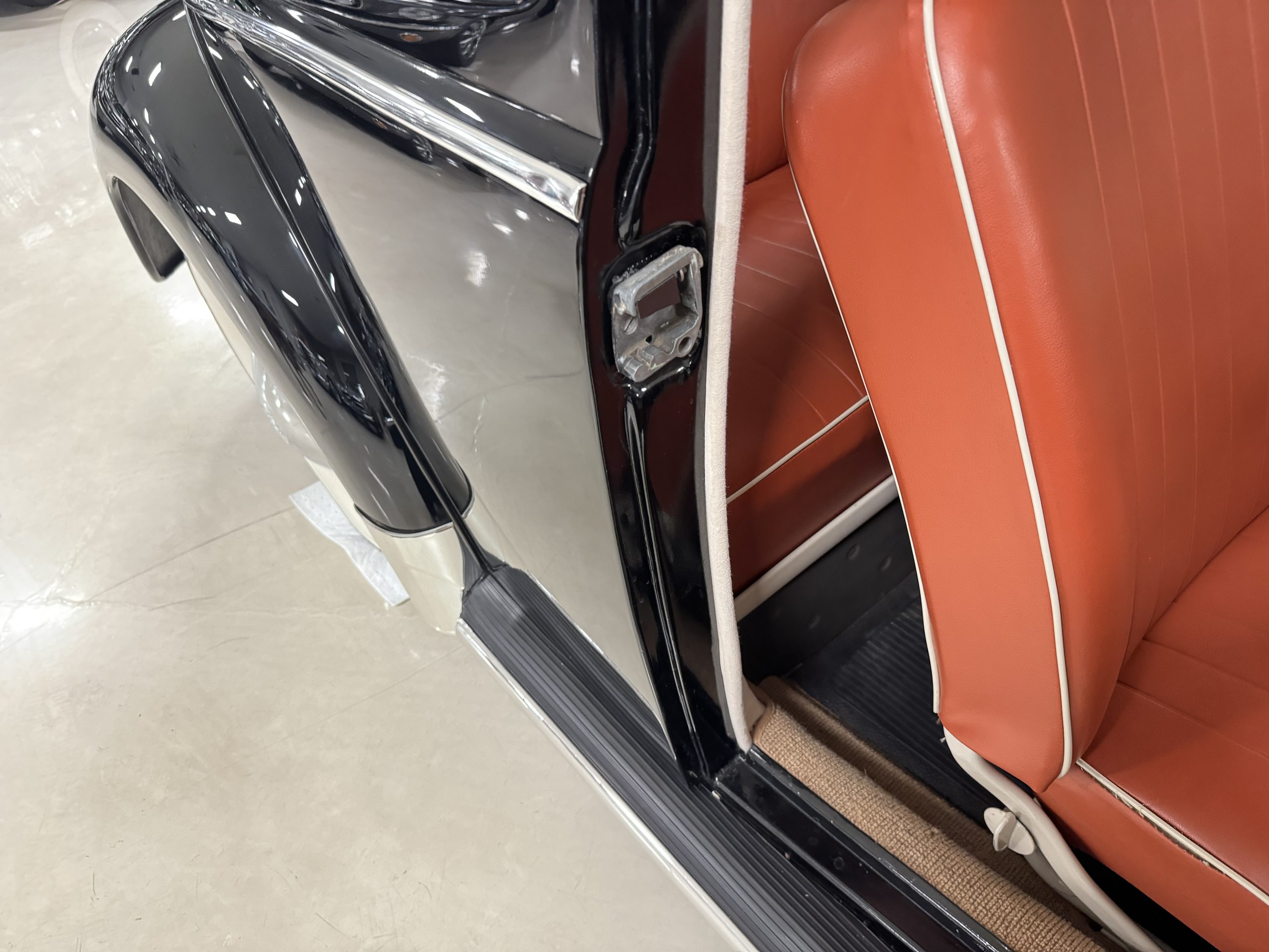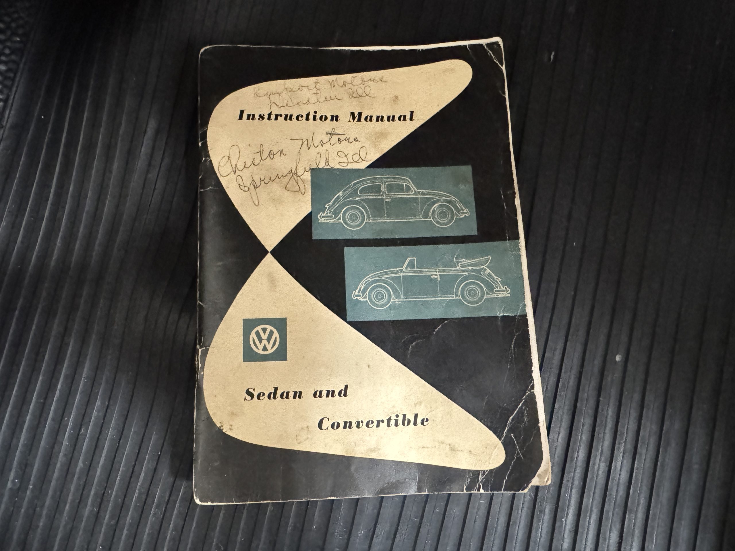 Inside, the cabin reflects Volkswagen’s thoughtful approach to efficient design. Red leatherette front bucket seats and a rear bench seat accommodate four passengers comfortably and remain in excellent condition, accented by Adobe Beige piping and matching door panels. Black and tan rolled-pile carpeting with rubber edging presents very well, reinforcing durability and ease of use. The left-hand-drive layout features the original-style steering wheel adorned with the Wolfsburg castle and wolf crest, anchoring the interior firmly in its German heritage. The simplified and vented dash features only an 80mph speedometer and glove box.