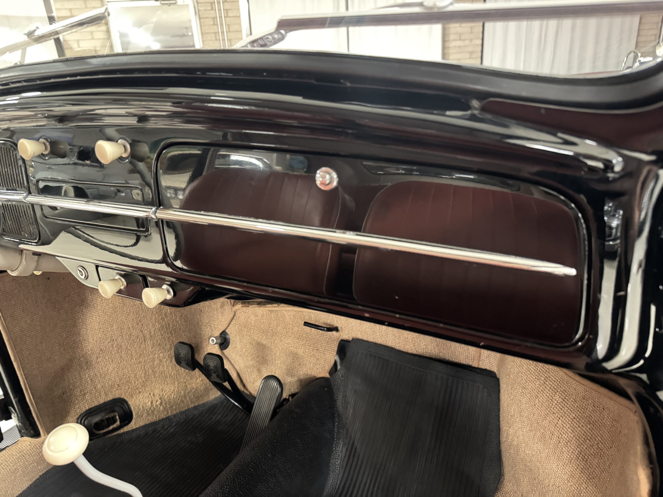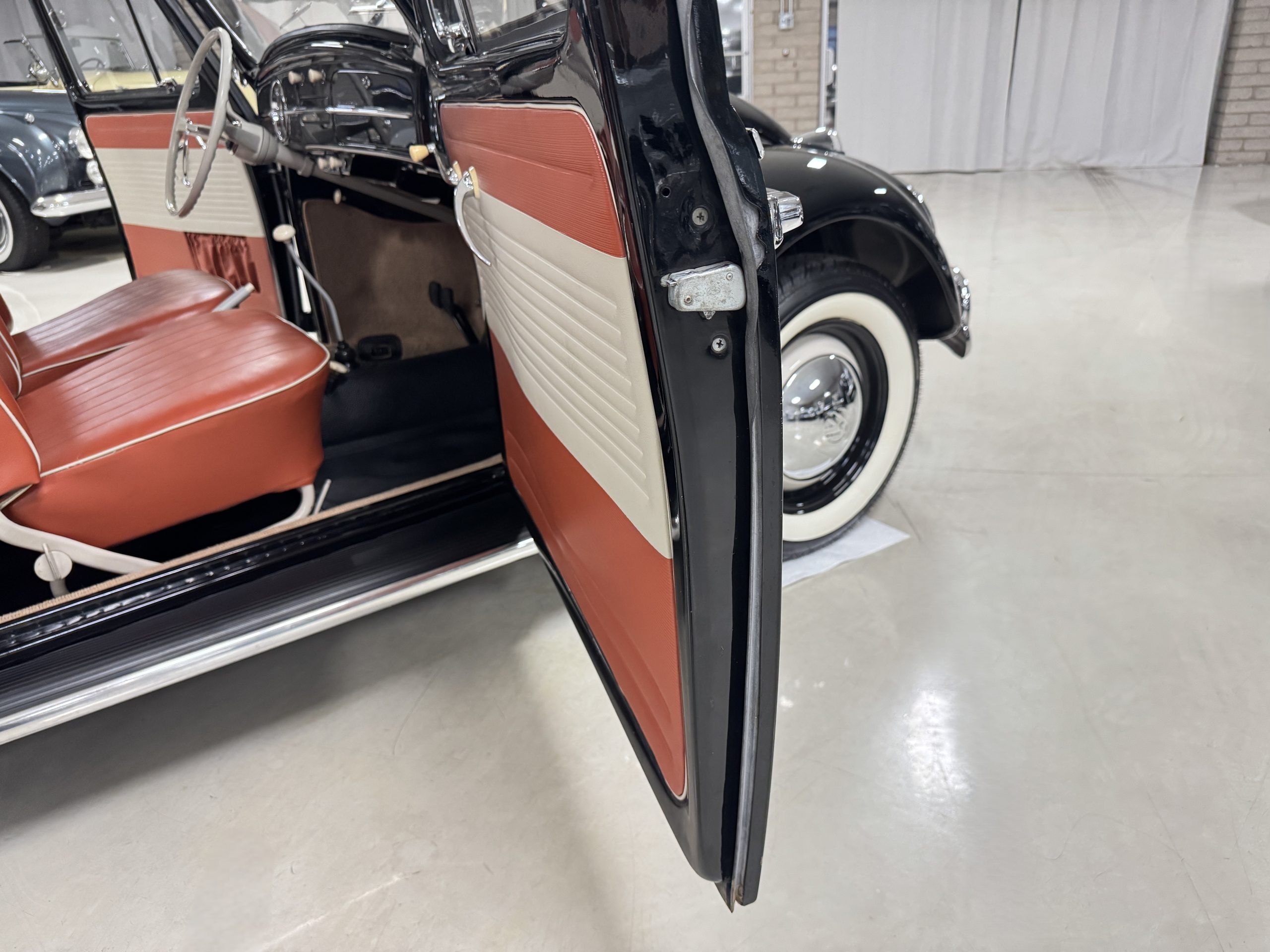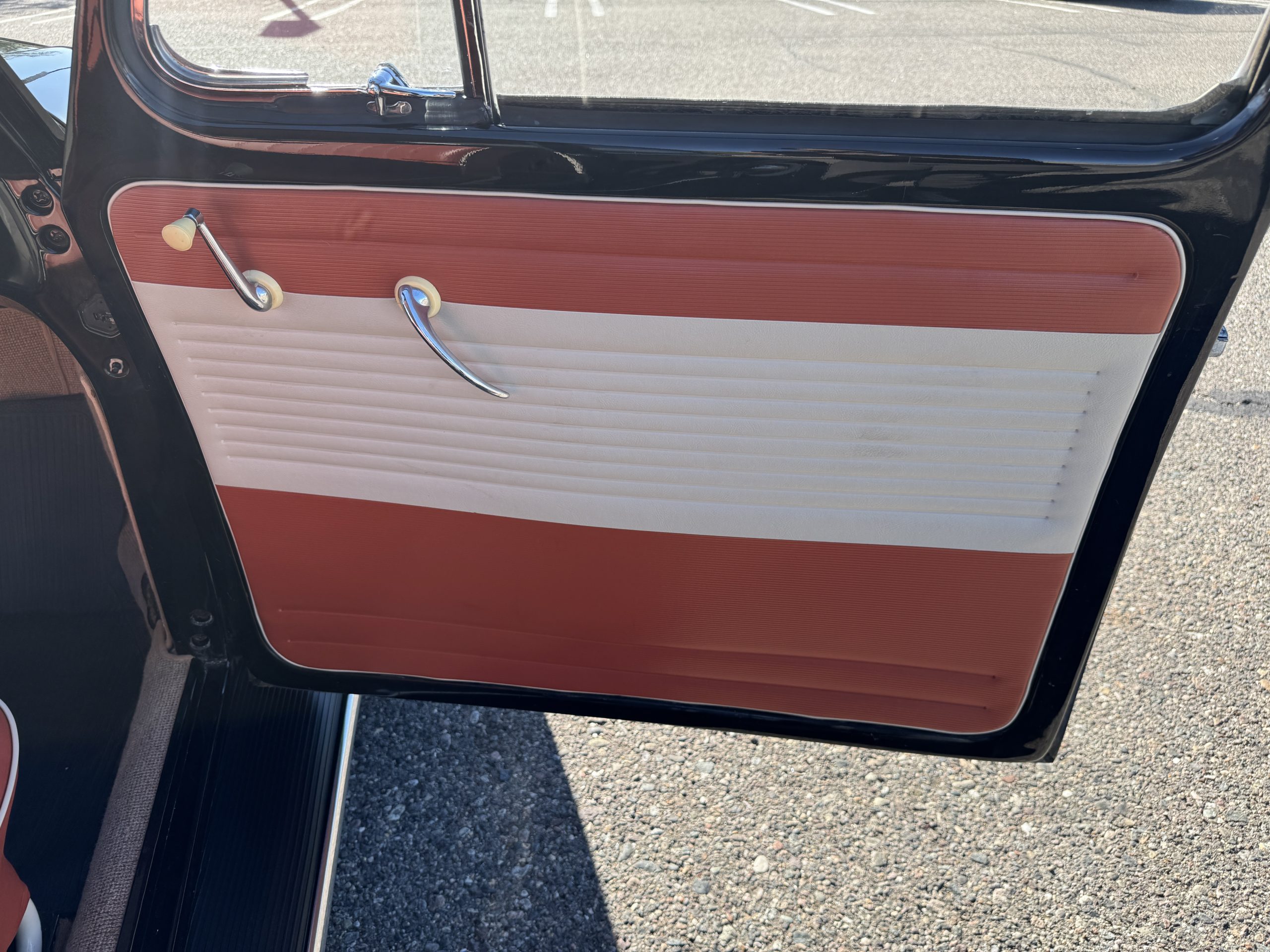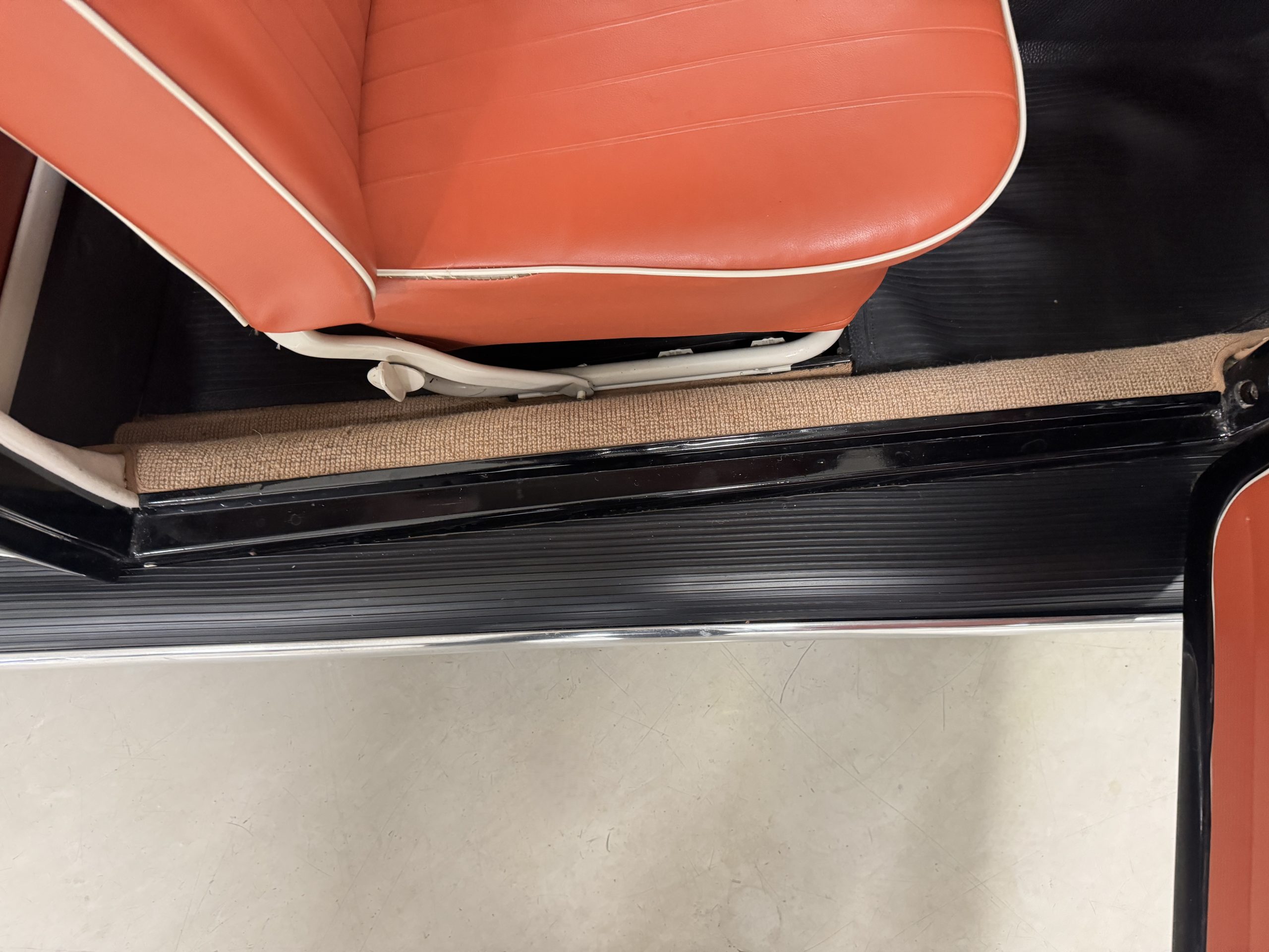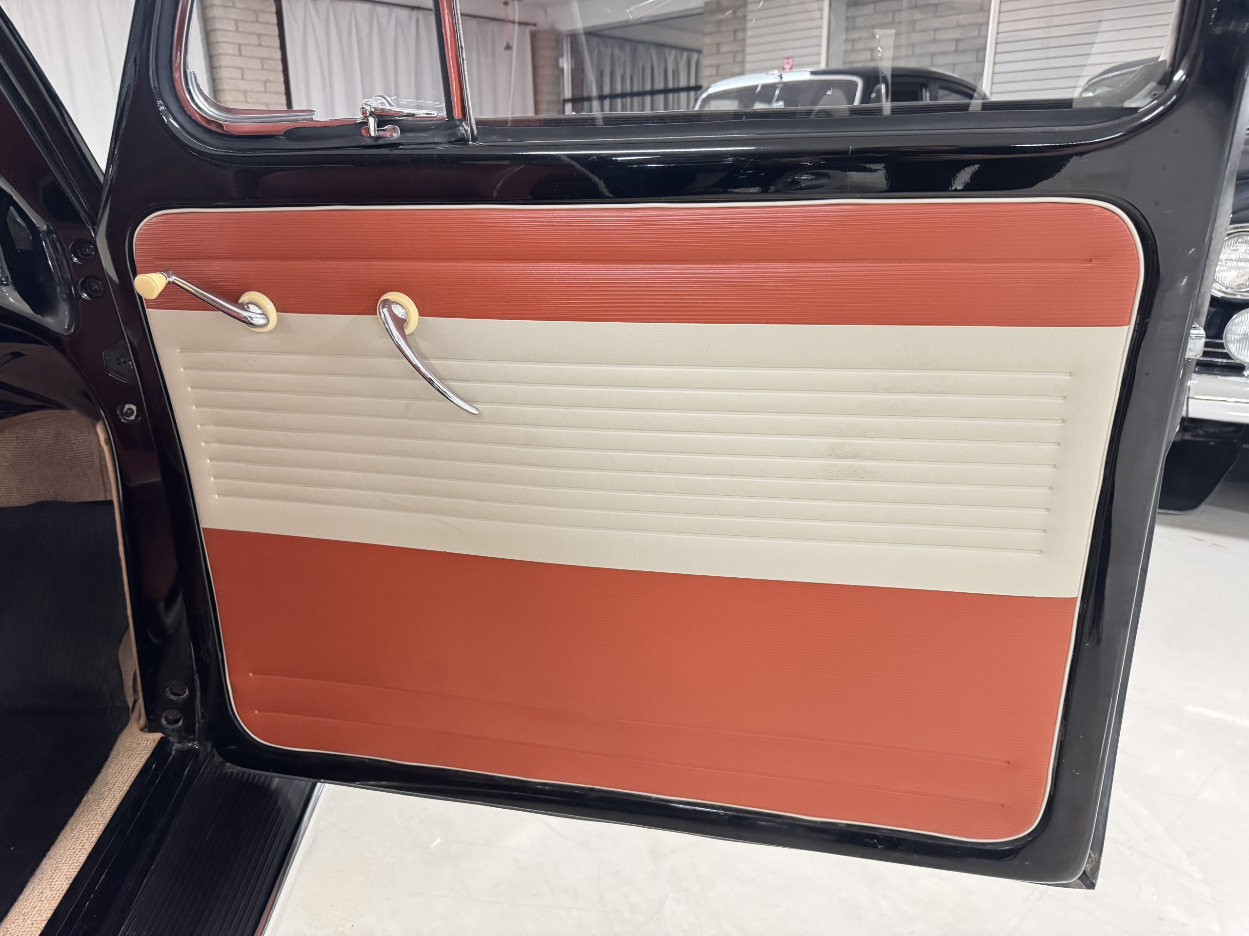 Inside, the cabin reflects Volkswagen’s thoughtful approach to efficient design. Red leatherette front bucket seats and a rear bench seat accommodate four passengers comfortably and remain in excellent condition, accented by Adobe Beige piping and matching door panels. Black and tan rolled-pile carpeting with rubber edging presents very well, reinforcing durability and ease of use. The left-hand-drive layout features the original-style steering wheel adorned with the Wolfsburg castle and wolf crest, anchoring the interior firmly in its German heritage. The simplified and vented dash features only an 80mph speedometer and glove box.
