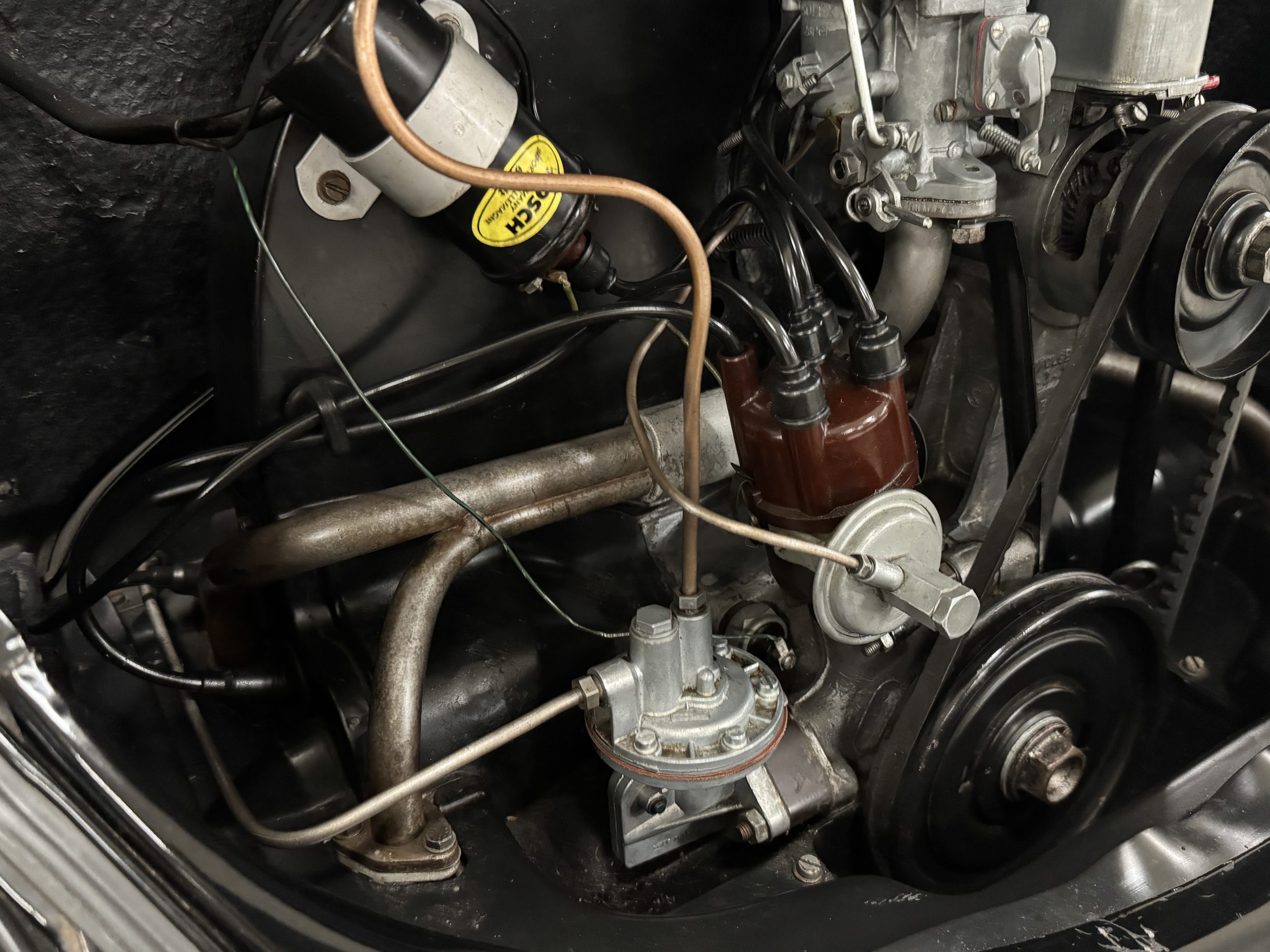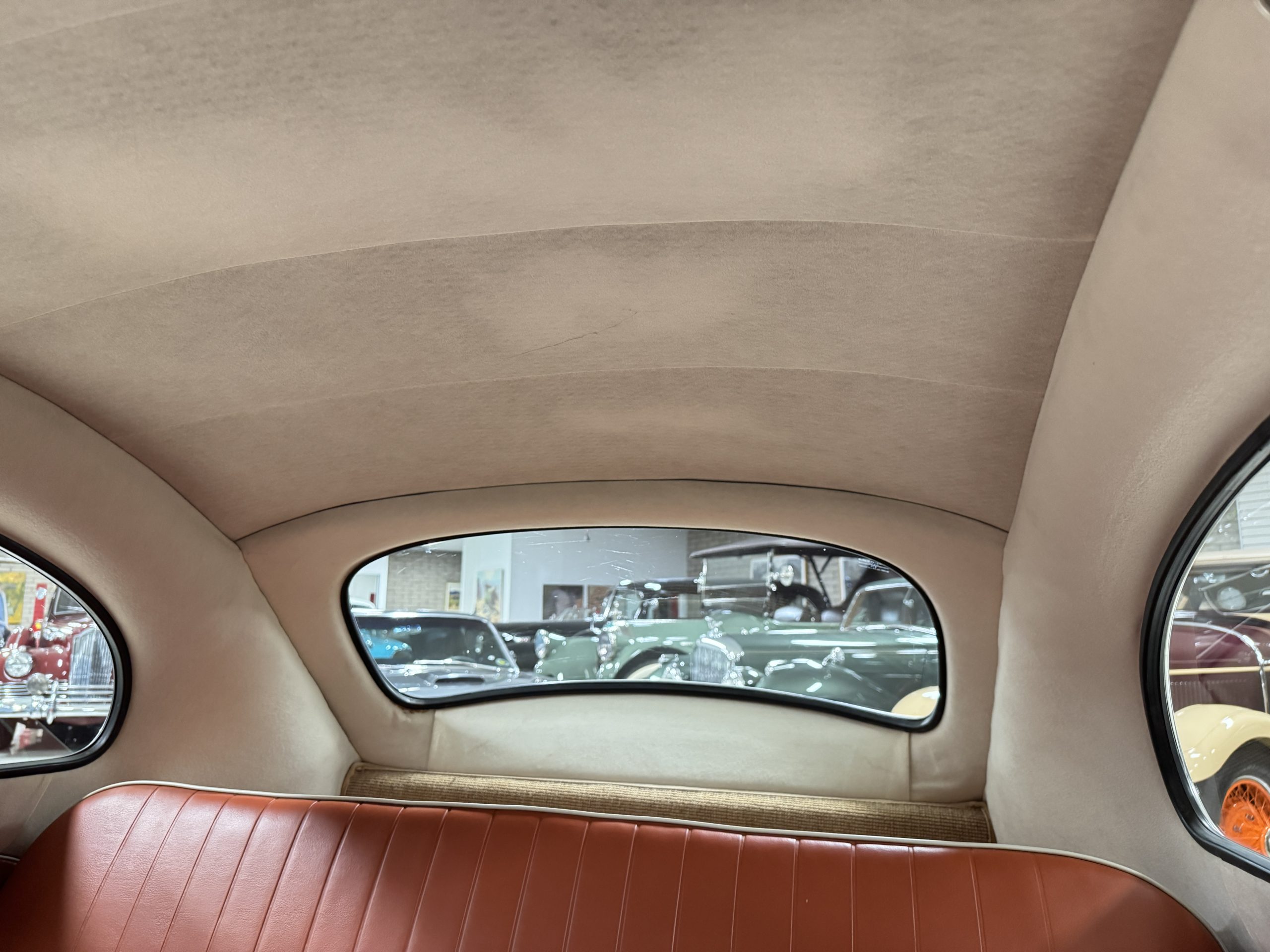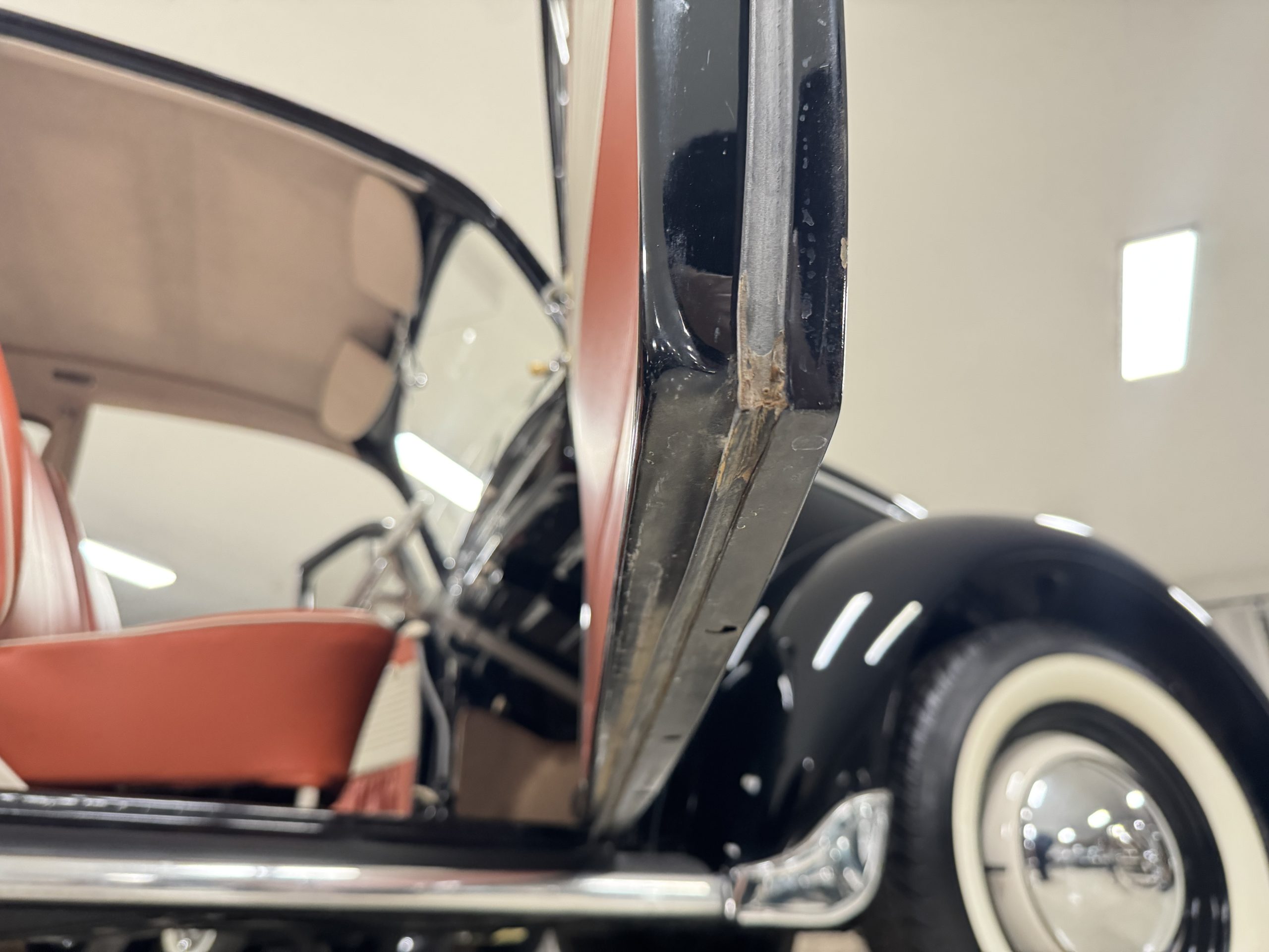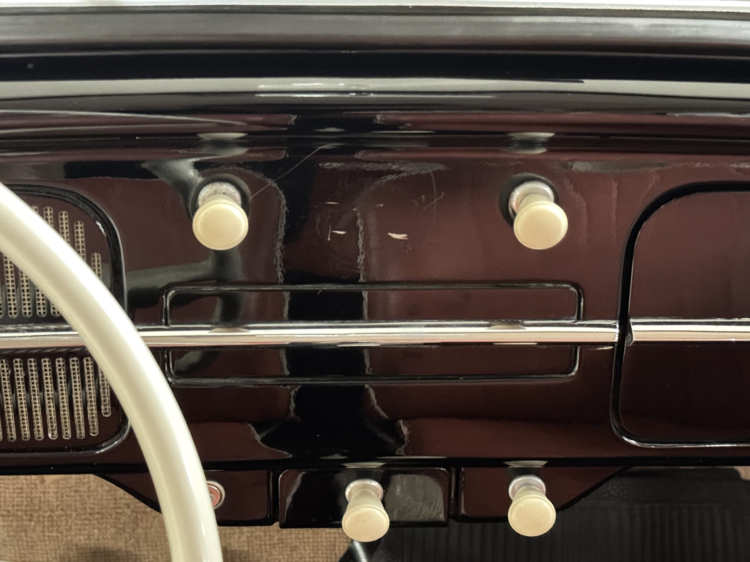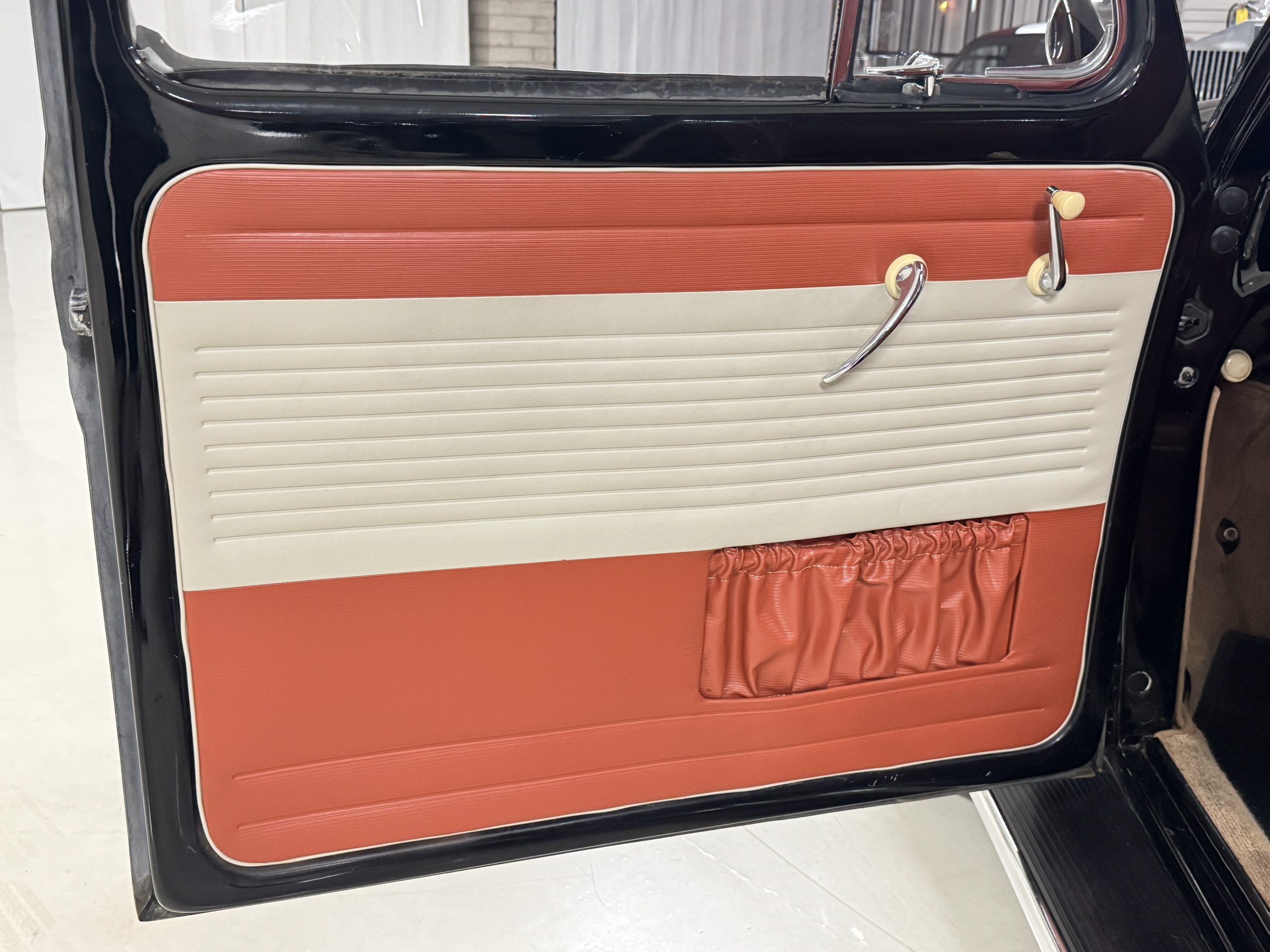 Inside, the cabin reflects Volkswagen’s thoughtful approach to efficient design. Red leatherette front bucket seats and a rear bench seat accommodate four passengers comfortably and remain in excellent condition, accented by Adobe Beige piping and matching door panels. Black and tan rolled-pile carpeting with rubber edging presents very well, reinforcing durability and ease of use. The left-hand-drive layout features the original-style steering wheel adorned with the Wolfsburg castle and wolf crest, anchoring the interior firmly in its German heritage. The simplified and vented dash features only an 80mph speedometer and glove box.