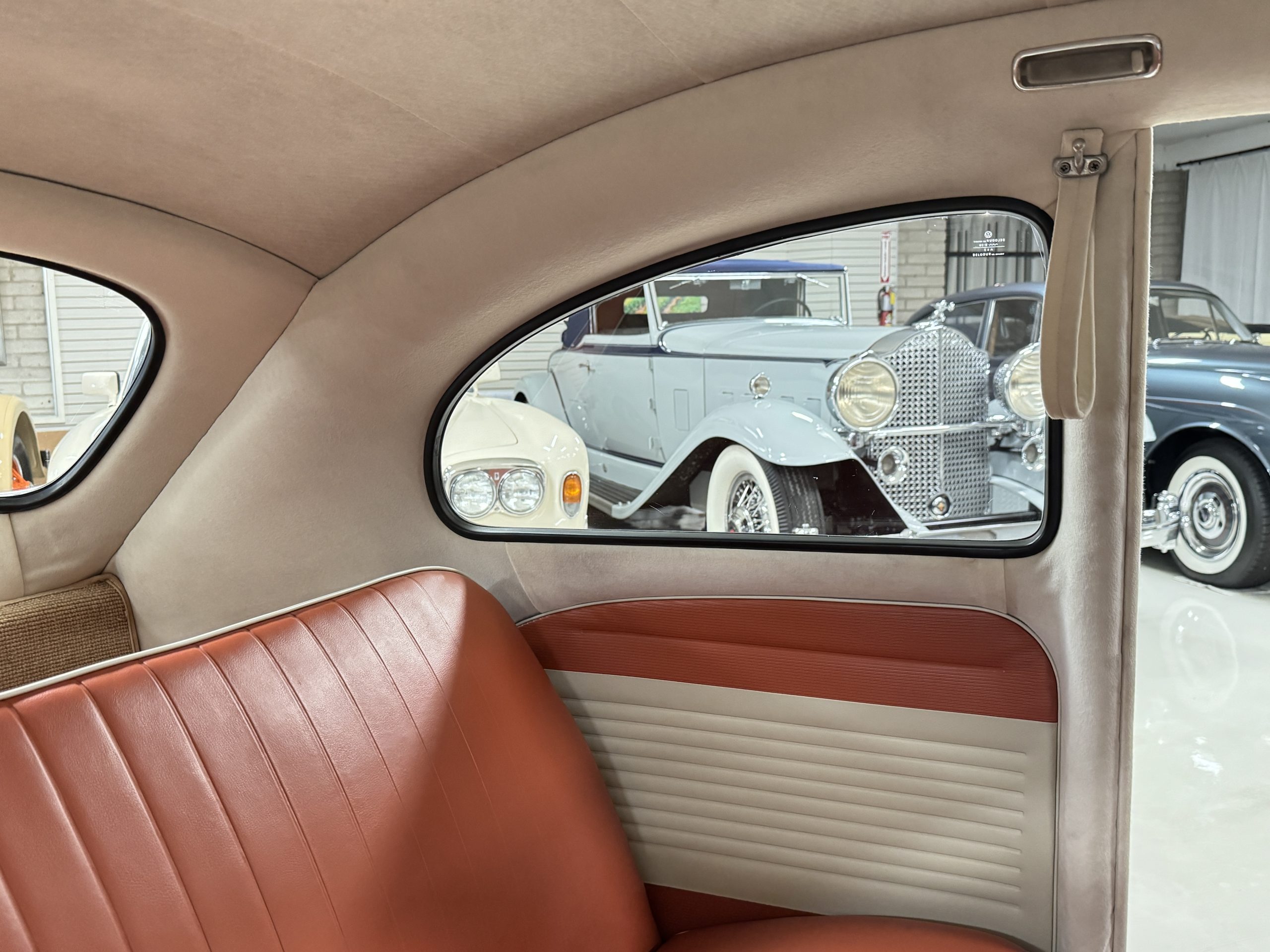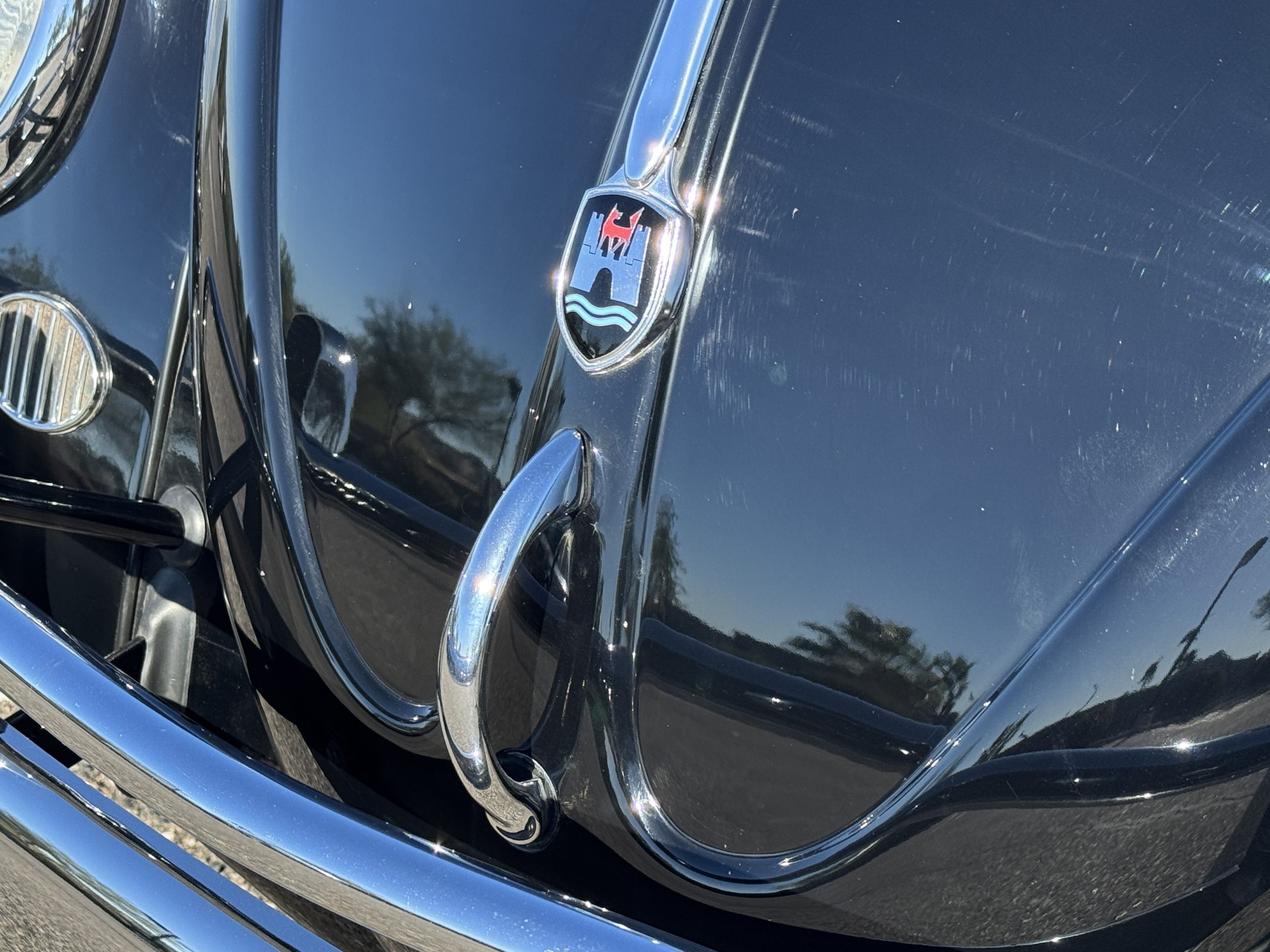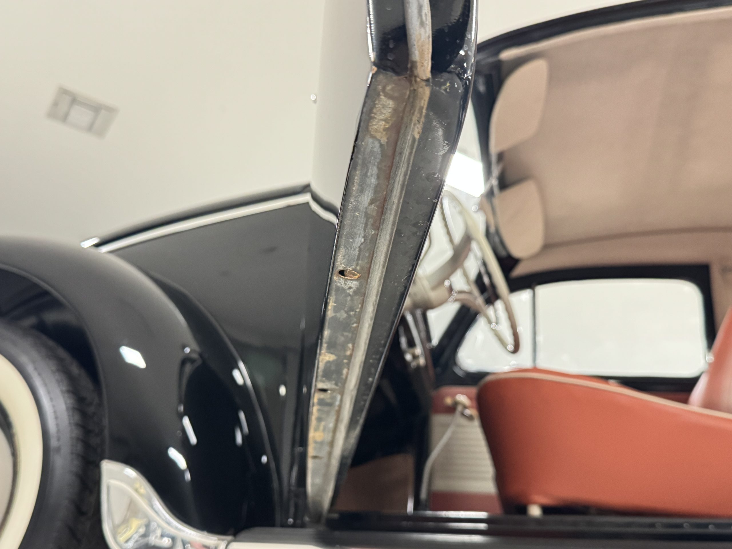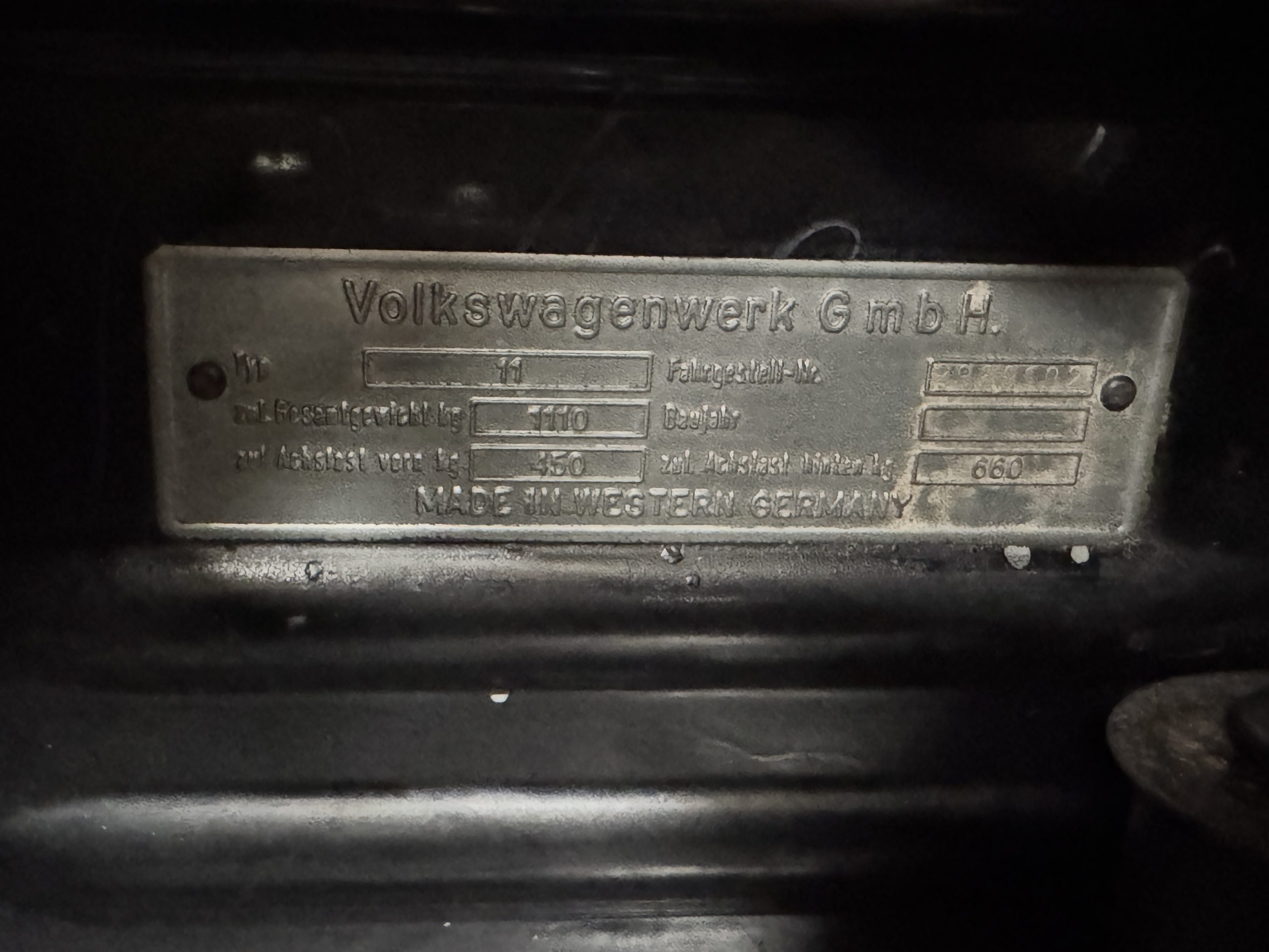 Inside, the cabin reflects Volkswagen’s thoughtful approach to efficient design. Red leatherette front bucket seats and a rear bench seat accommodate four passengers comfortably and remain in excellent condition, accented by Adobe Beige piping and matching door panels. Black and tan rolled-pile carpeting with rubber edging presents very well, reinforcing durability and ease of use. The left-hand-drive layout features the original-style steering wheel adorned with the Wolfsburg castle and wolf crest, anchoring the interior firmly in its German heritage. The simplified and vented dash features only an 80mph speedometer and glove box.