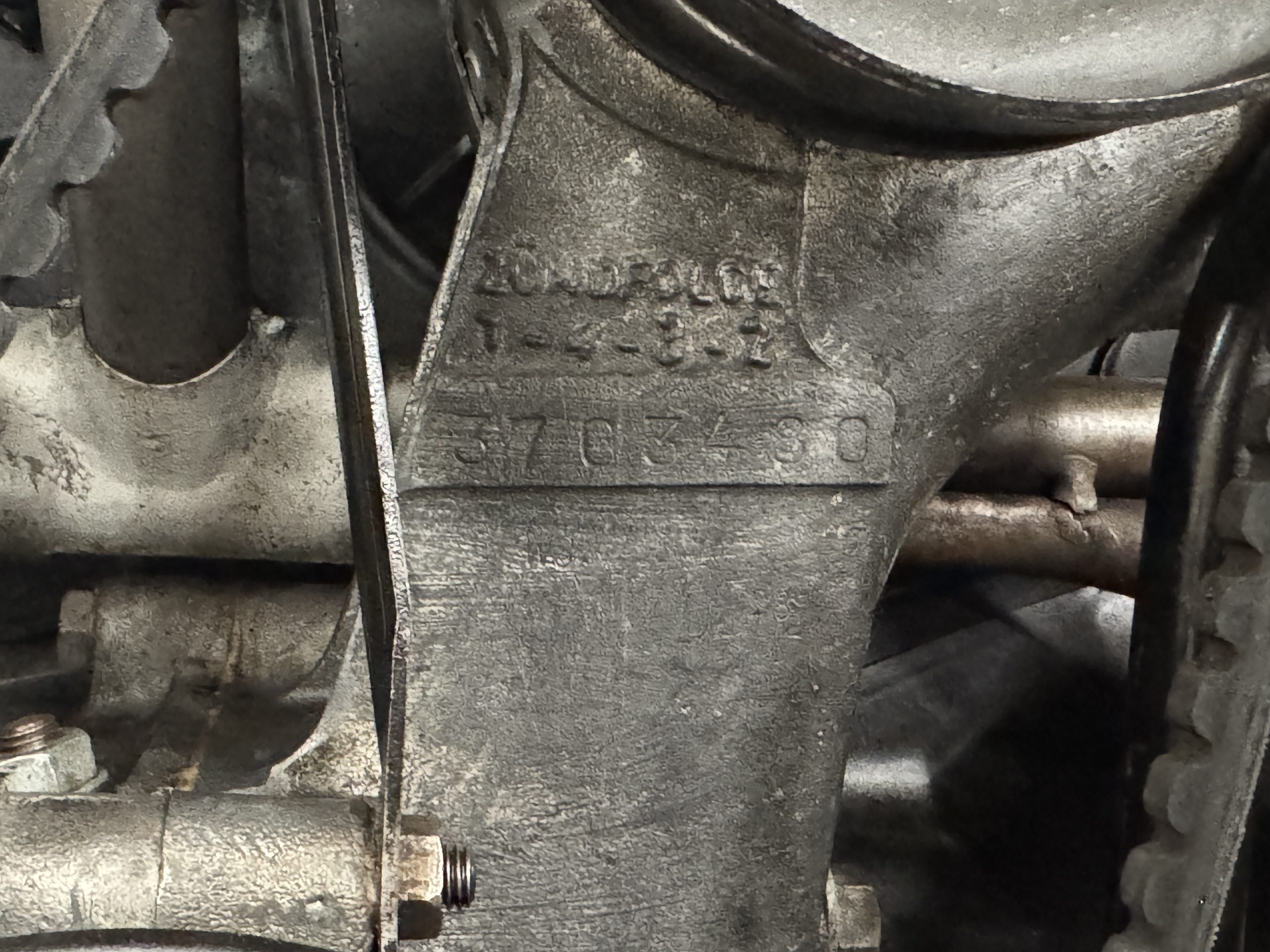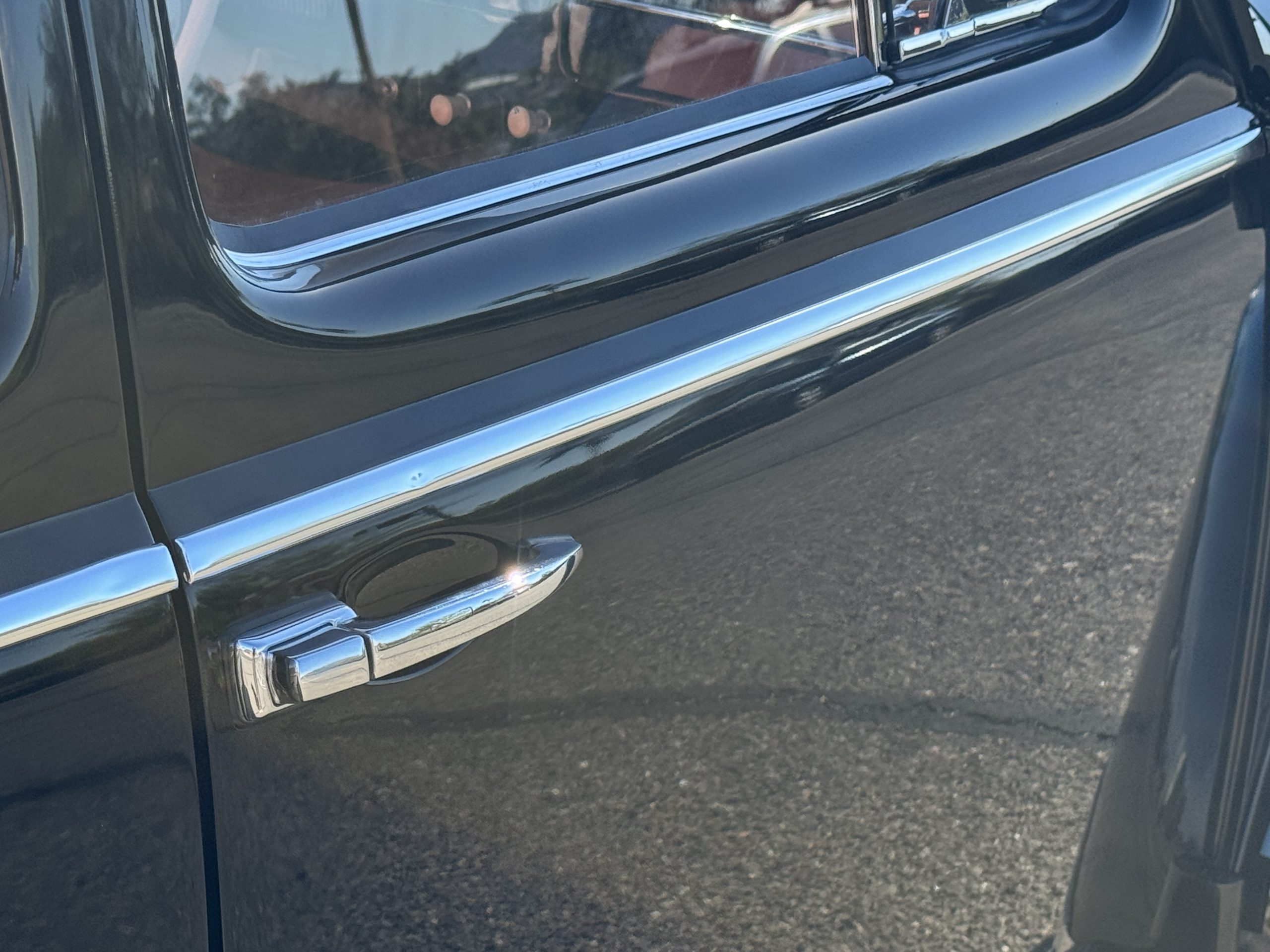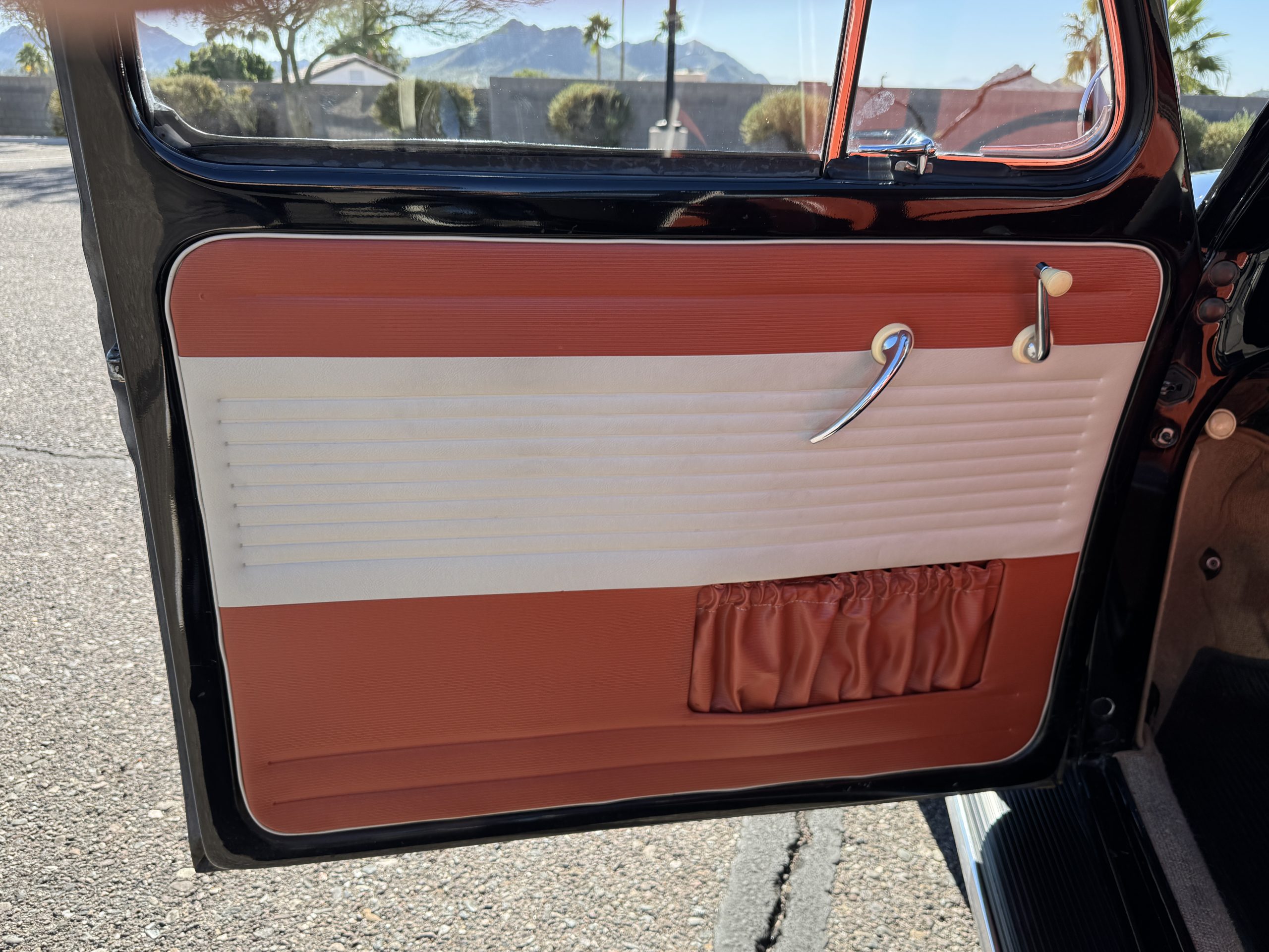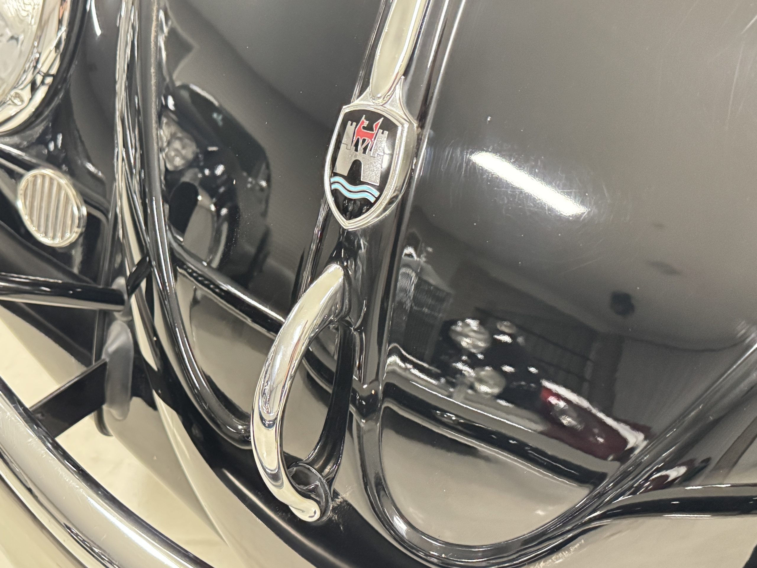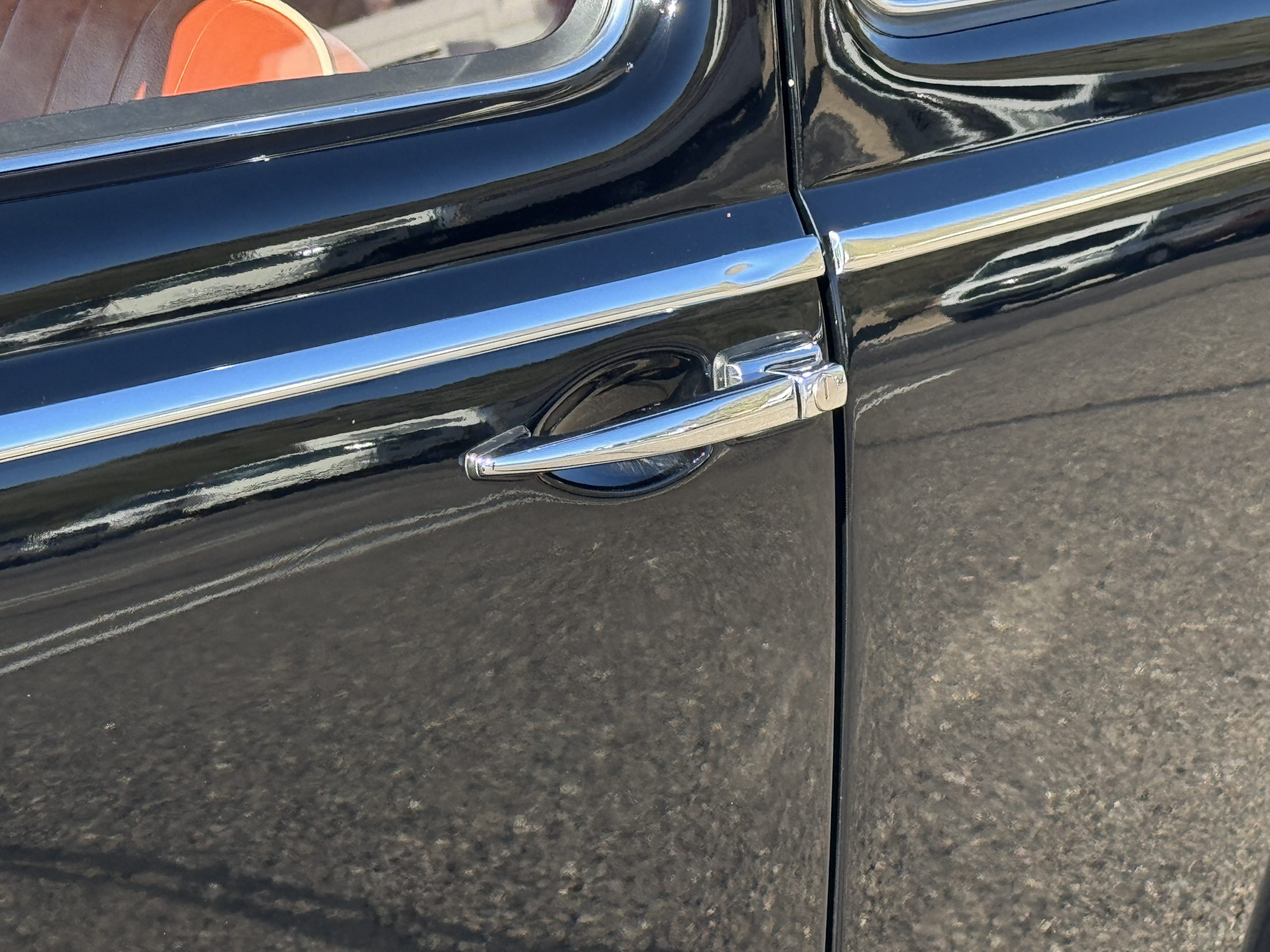 Inside, the cabin reflects Volkswagen’s thoughtful approach to efficient design. Red leatherette front bucket seats and a rear bench seat accommodate four passengers comfortably and remain in excellent condition, accented by Adobe Beige piping and matching door panels. Black and tan rolled-pile carpeting with rubber edging presents very well, reinforcing durability and ease of use. The left-hand-drive layout features the original-style steering wheel adorned with the Wolfsburg castle and wolf crest, anchoring the interior firmly in its German heritage. The simplified and vented dash features only an 80mph speedometer and glove box.