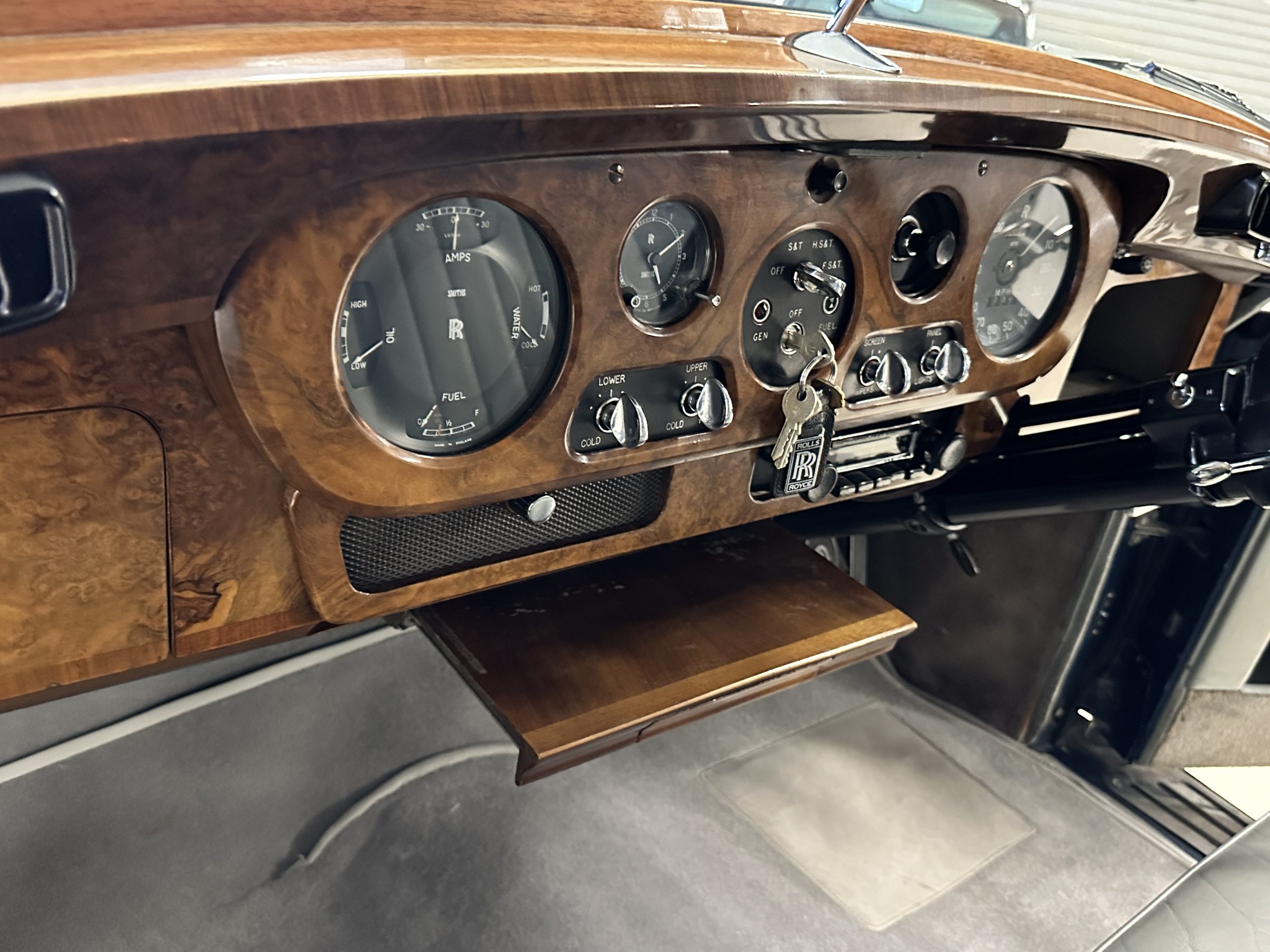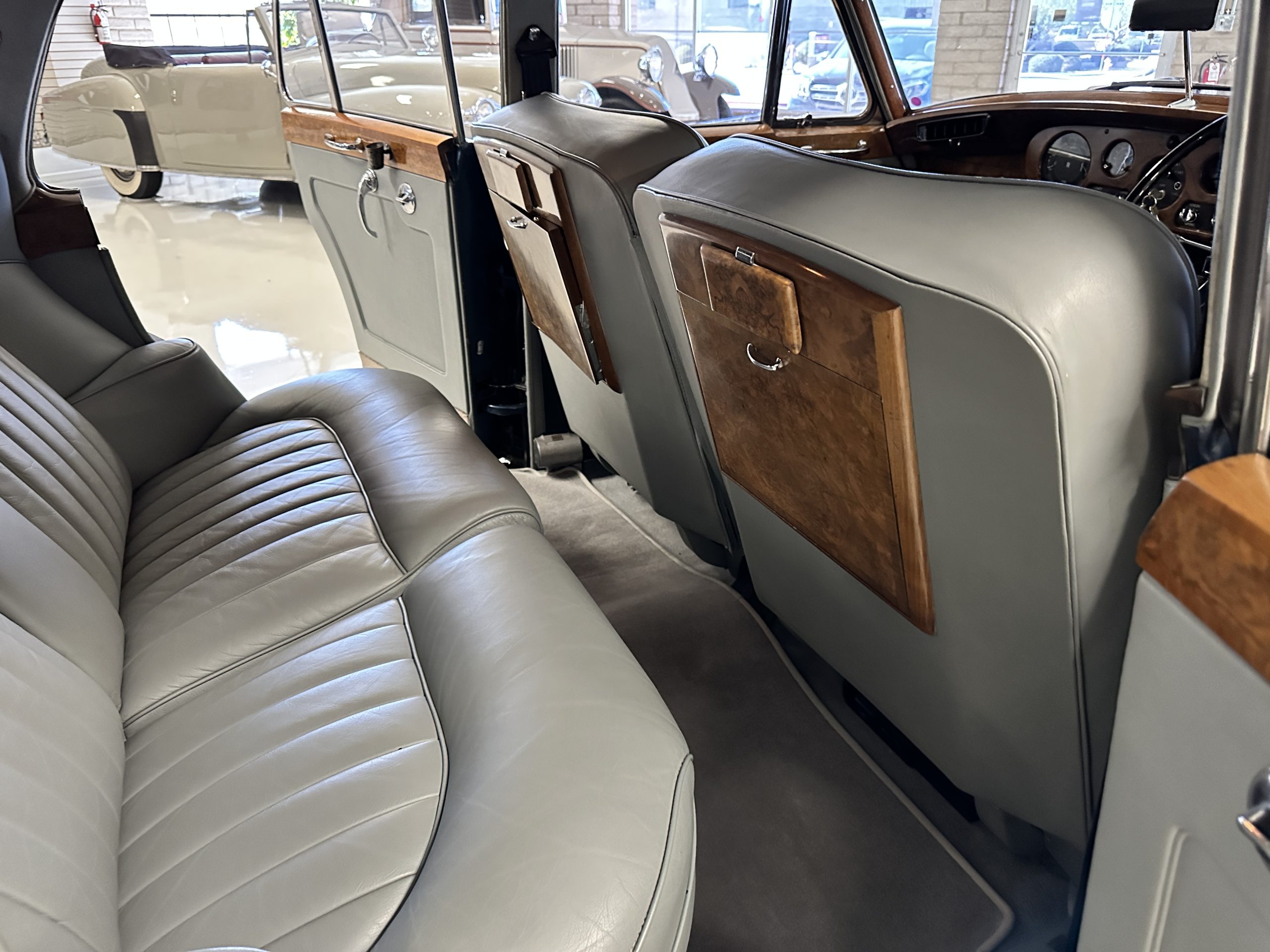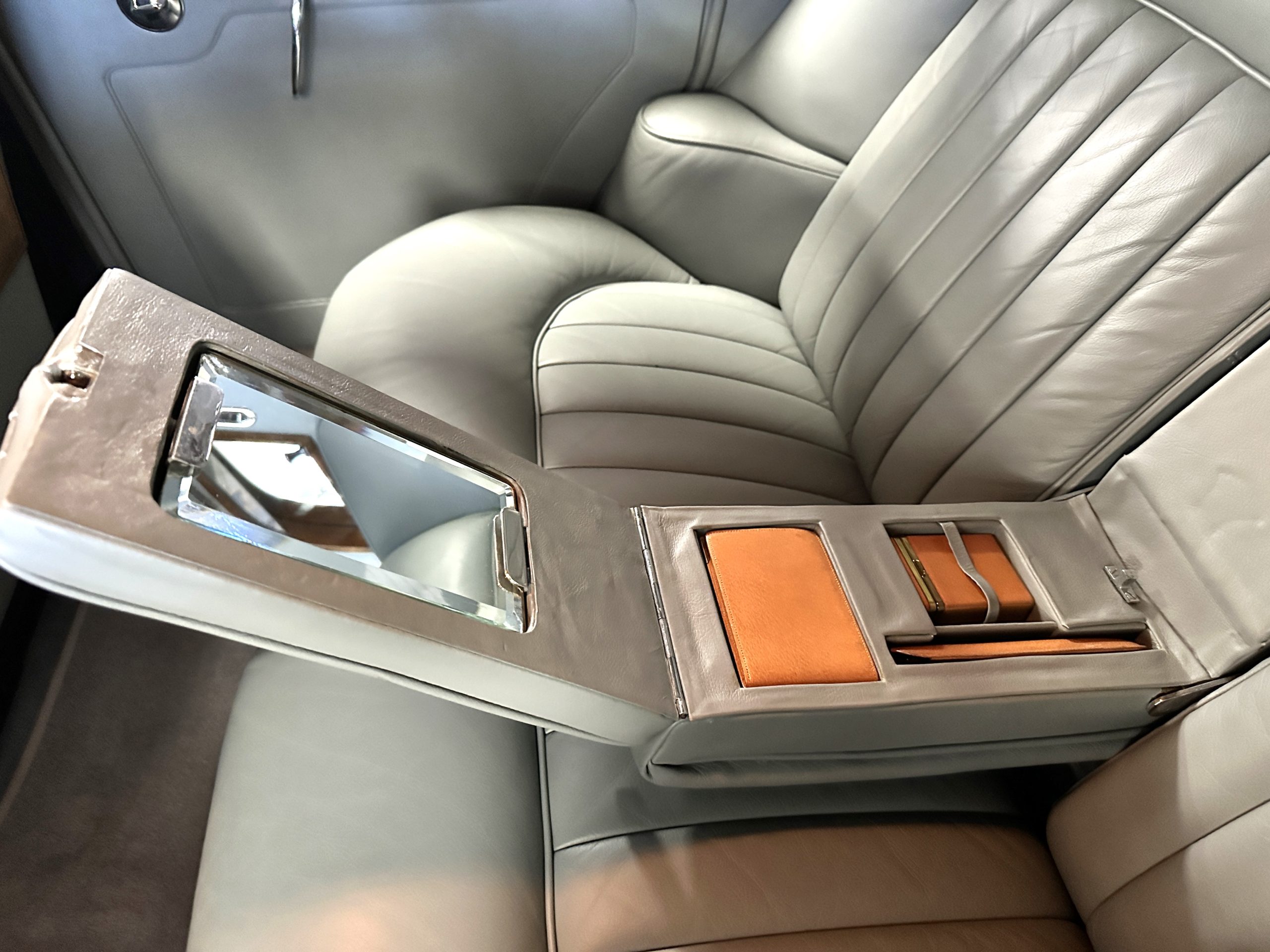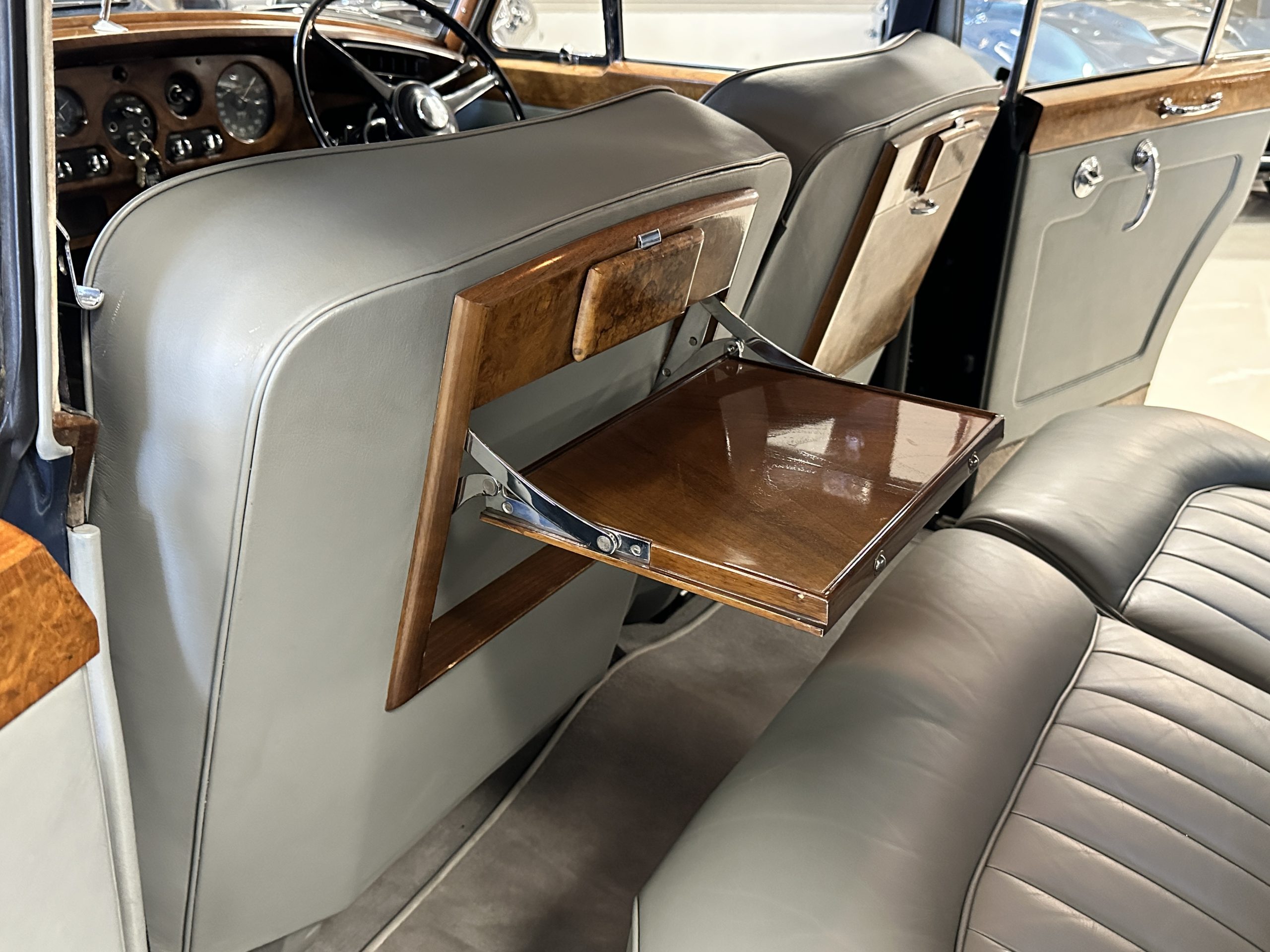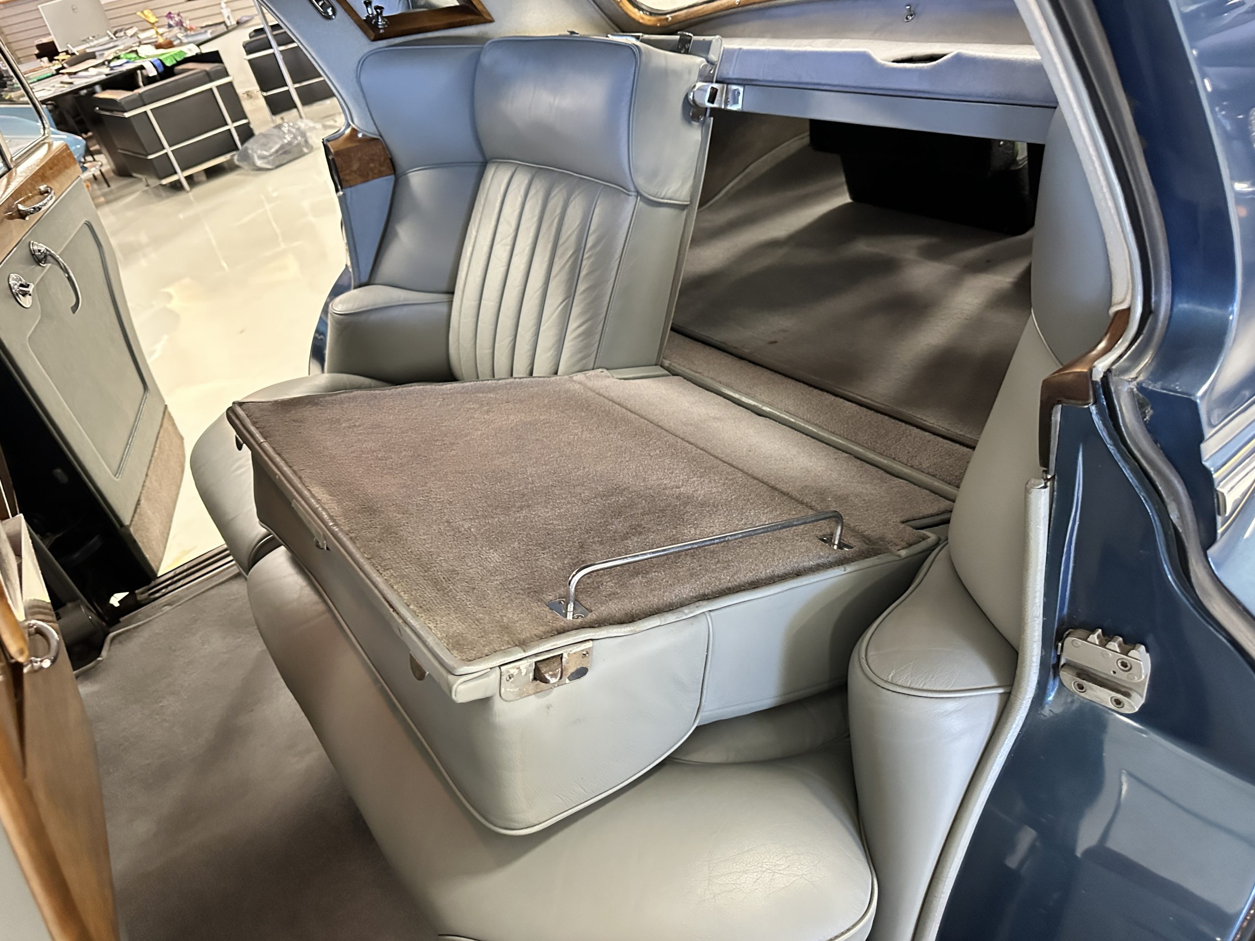 This Cloud was sent from the factory to Harold Radford Coachbuilders on September 22, 1961. Harold Radford was a custom coachbuilder that specialized in Rolls-Royce, Bentley and Mini’s. His coachbuilders would customize these cars bespoke for his well to do clientele. The “Countryman” Adaptations were designed to make longer tours more enjoyable and to make the cars more useful in the countryside. This Clouds adaptations were completed by Radford by January 11, 1961. Her original owner was a principal of C.D. Productions Ltd in London. The Radford adaptations on her include the rare and desirable full picnic table and cushions for the boot, fold-down rear seats with a full vanity for the rear armrest (including a swiveling beveled mirror, combs, notebook and a cigarette case), three reading lights, a locking cabinet with a tea kettle, cups and other items, a bud vase, and a mirror and two sunglass cases built into the sun visors, seat belts, and a rare Rotaflare swiveling driving lamp. This Radford was built for touring and enjoying life to the fullest.