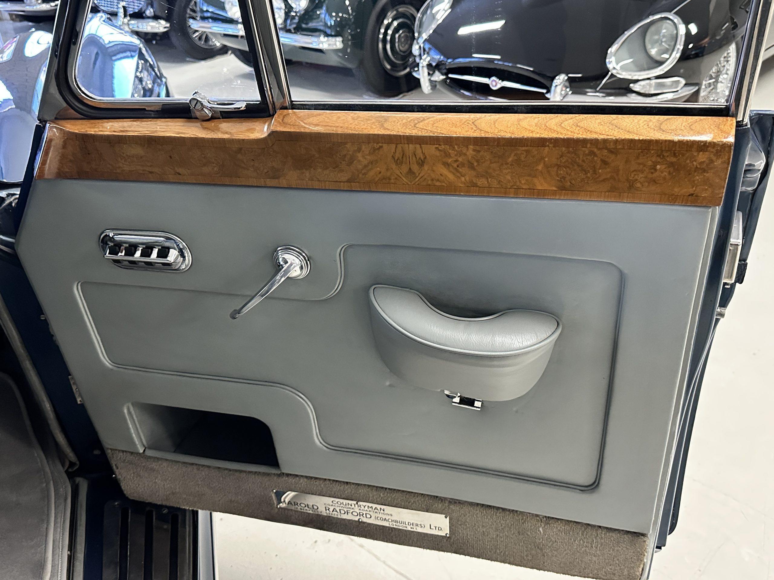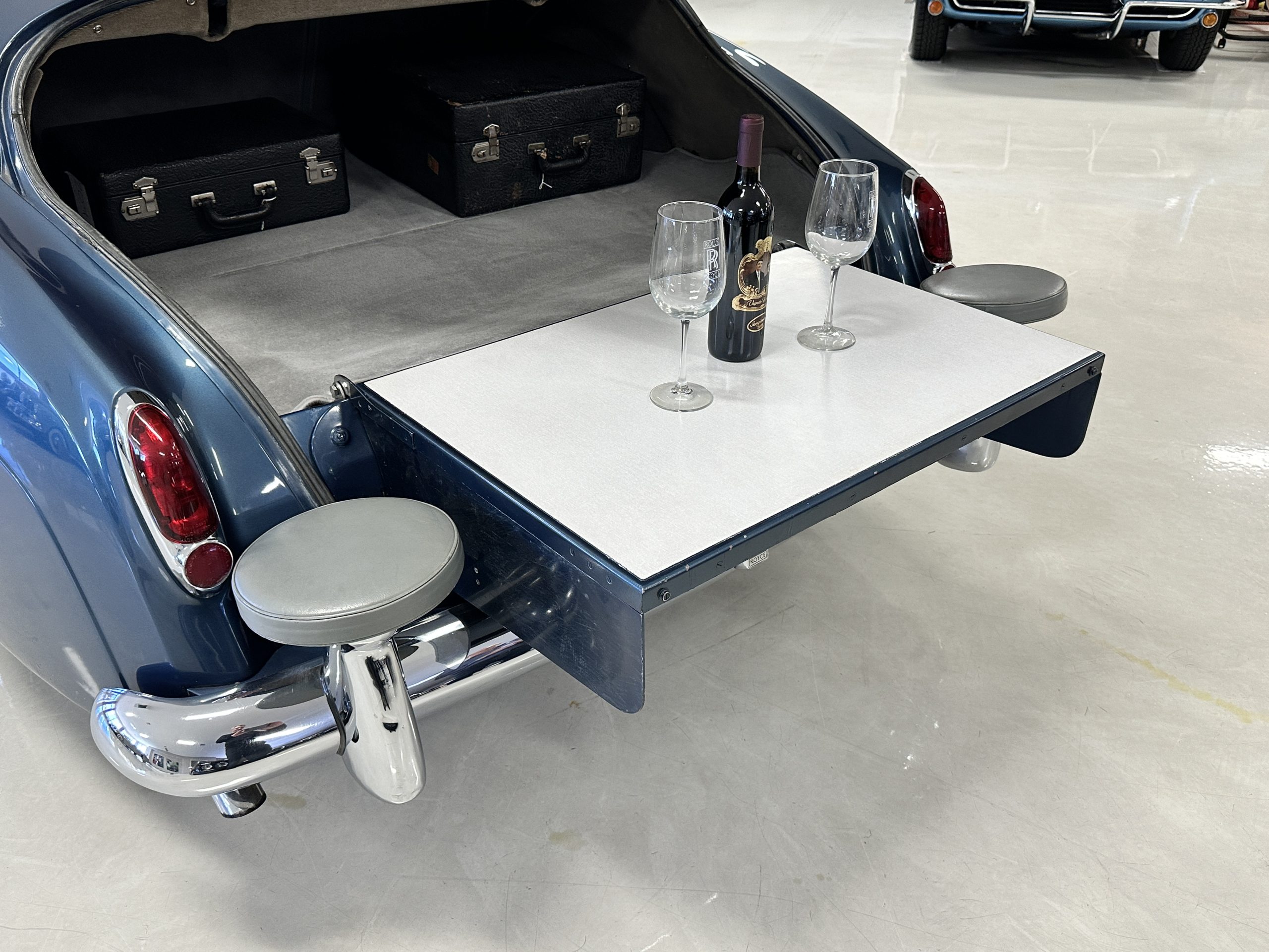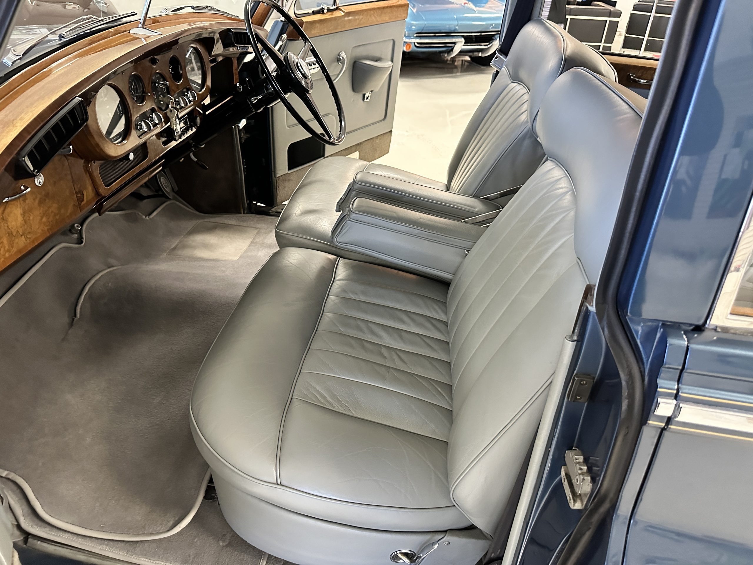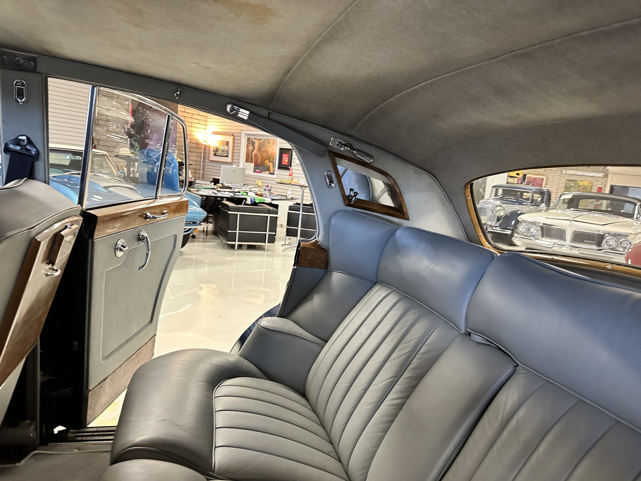 This Cloud was sent from the factory to Harold Radford Coachbuilders on September 22, 1961. Harold Radford was a custom coachbuilder that specialized in Rolls-Royce, Bentley and Mini’s. His coachbuilders would customize these cars bespoke for his well to do clientele. The “Countryman” Adaptations were designed to make longer tours more enjoyable and to make the cars more useful in the countryside. This Clouds adaptations were completed by Radford by January 11, 1961. Her original owner was a principal of C.D. Productions Ltd in London. The Radford adaptations on her include the rare and desirable full picnic table and cushions for the boot, fold-down rear seats with a full vanity for the rear armrest (including a swiveling beveled mirror, combs, notebook and a cigarette case), three reading lights, a locking cabinet with a tea kettle, cups and other items, a bud vase, and a mirror and two sunglass cases built into the sun visors, seat belts, and a rare Rotaflare swiveling driving lamp. This Radford was built for touring and enjoying life to the fullest.