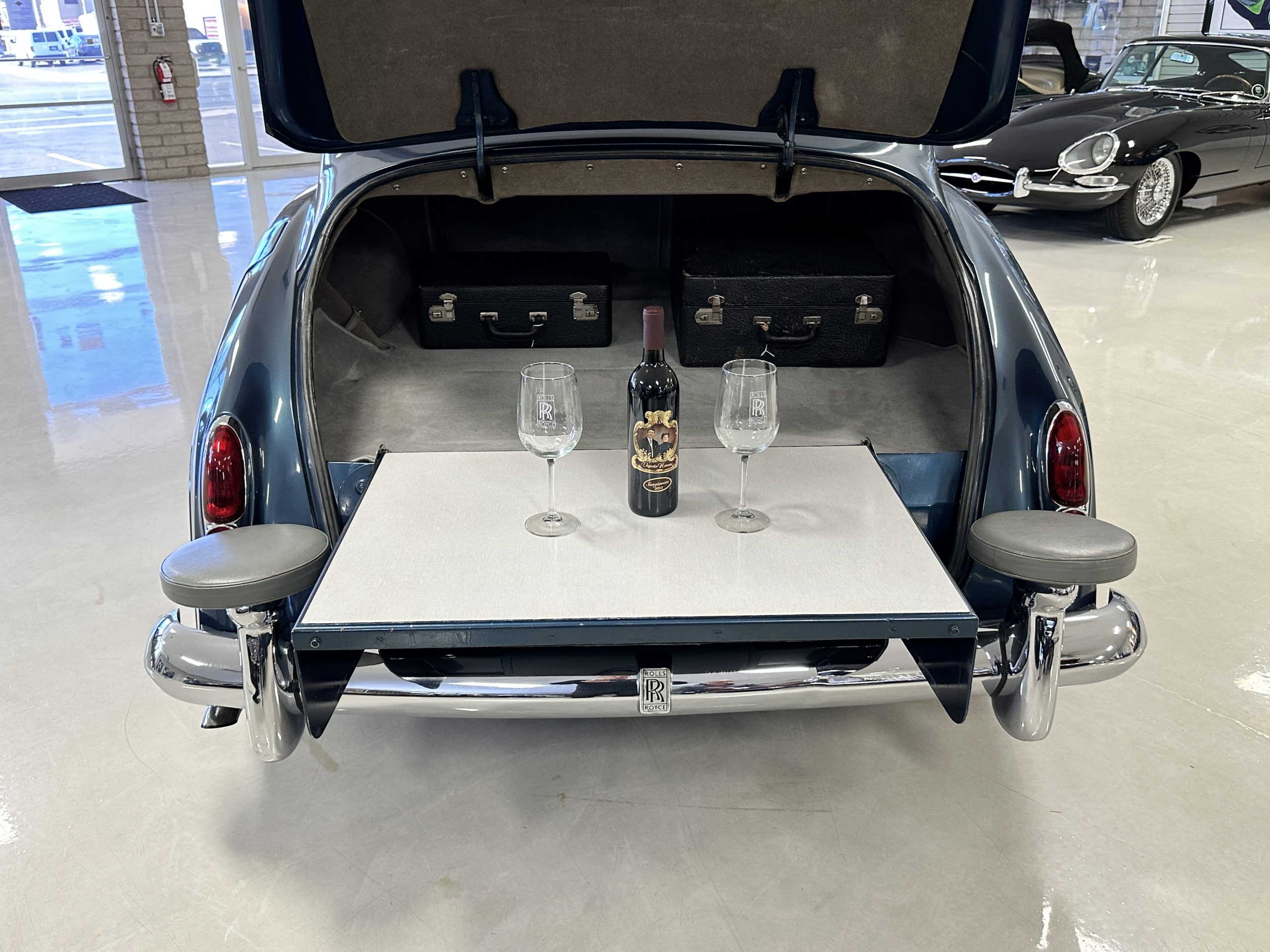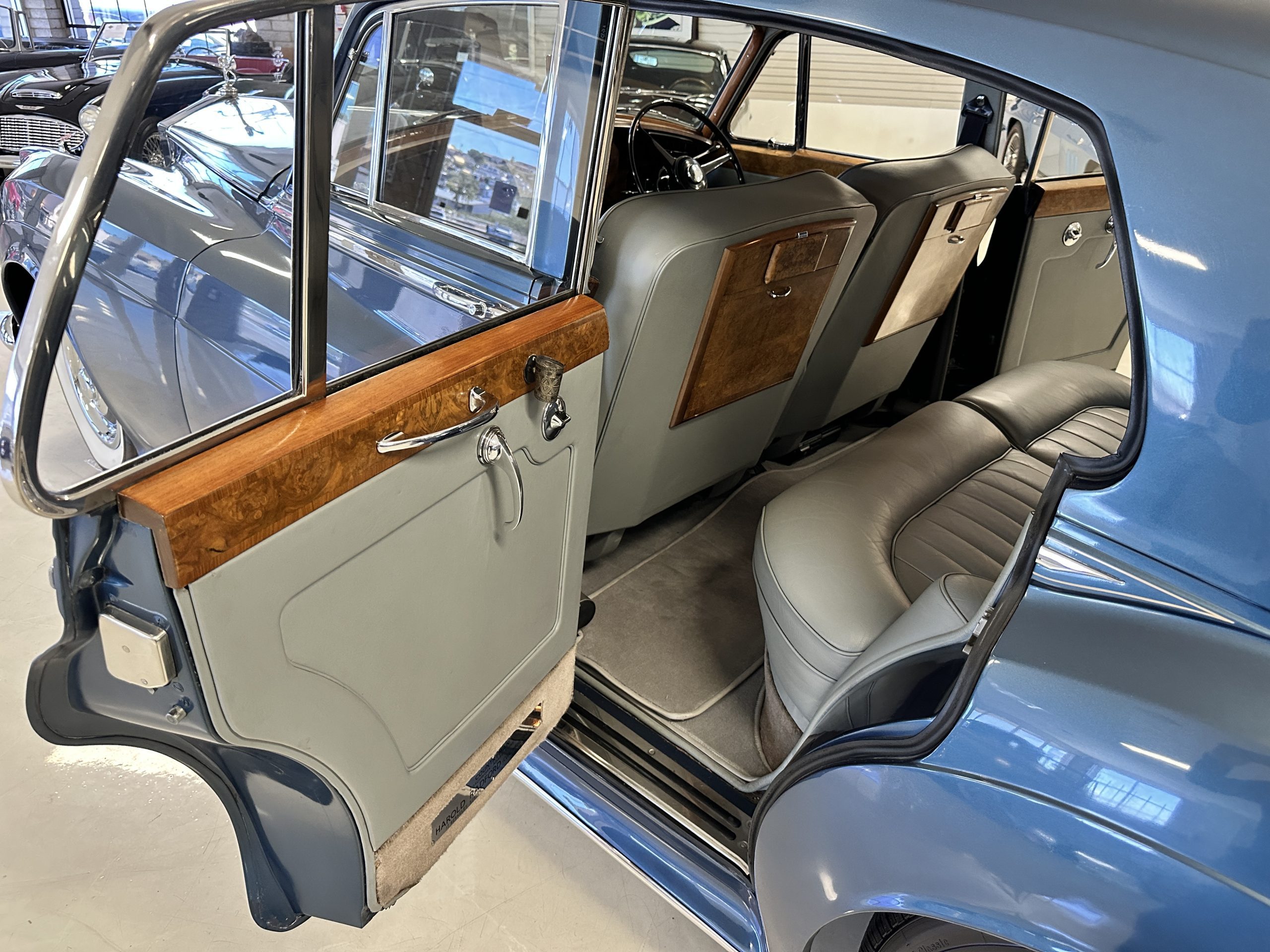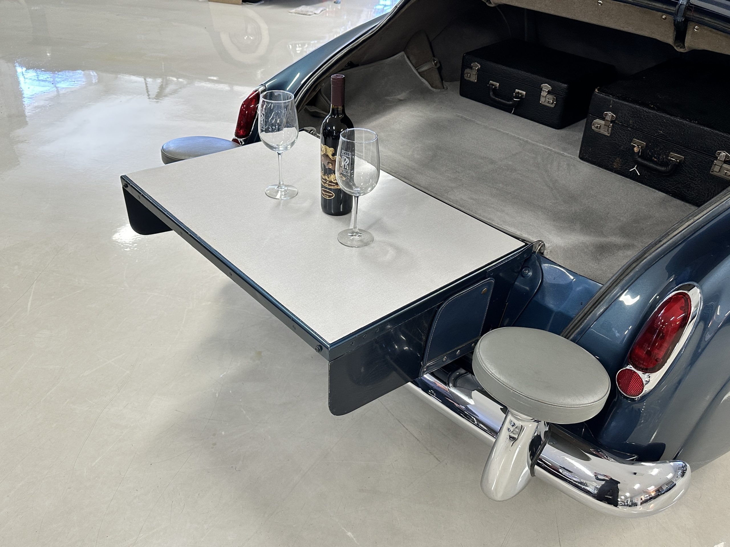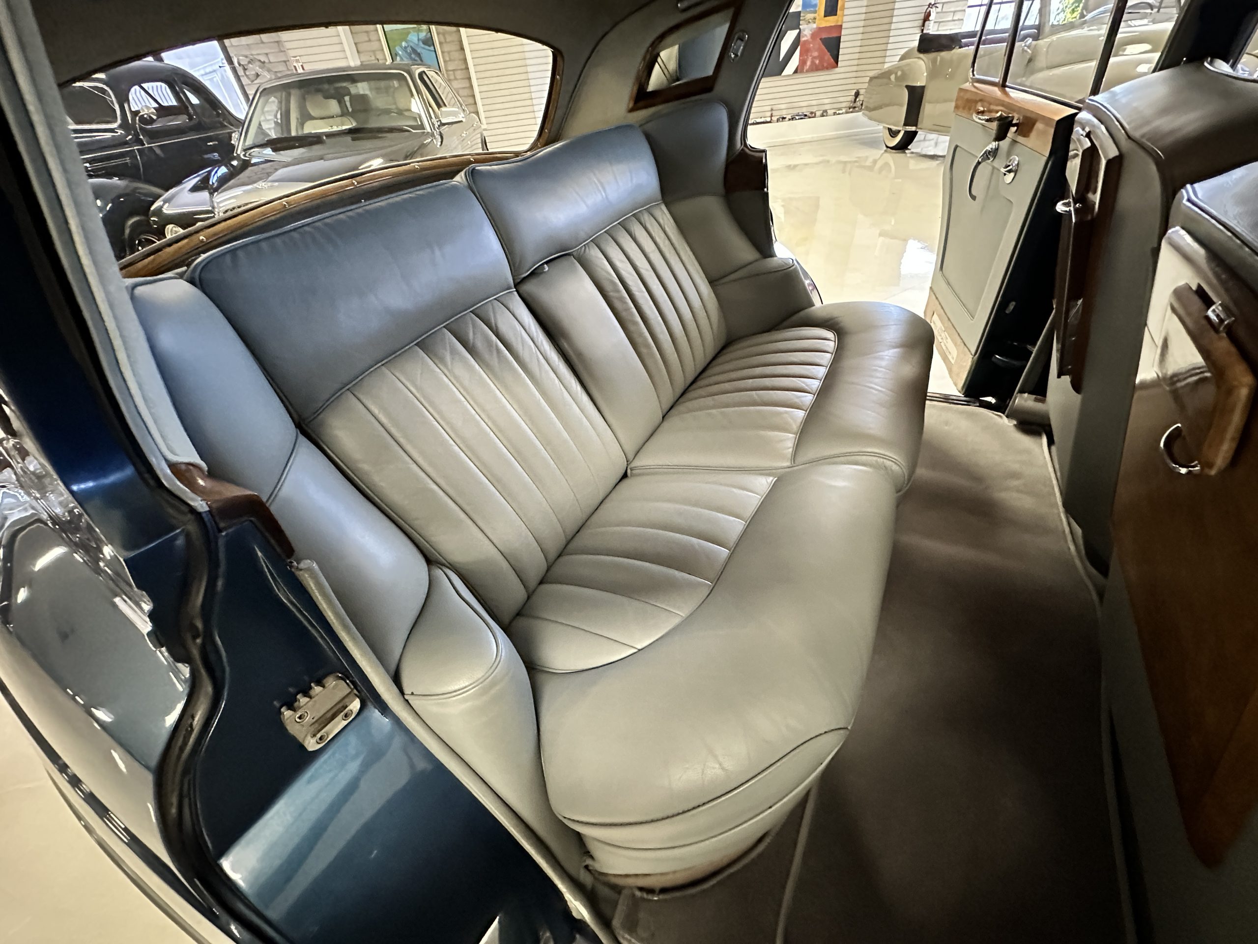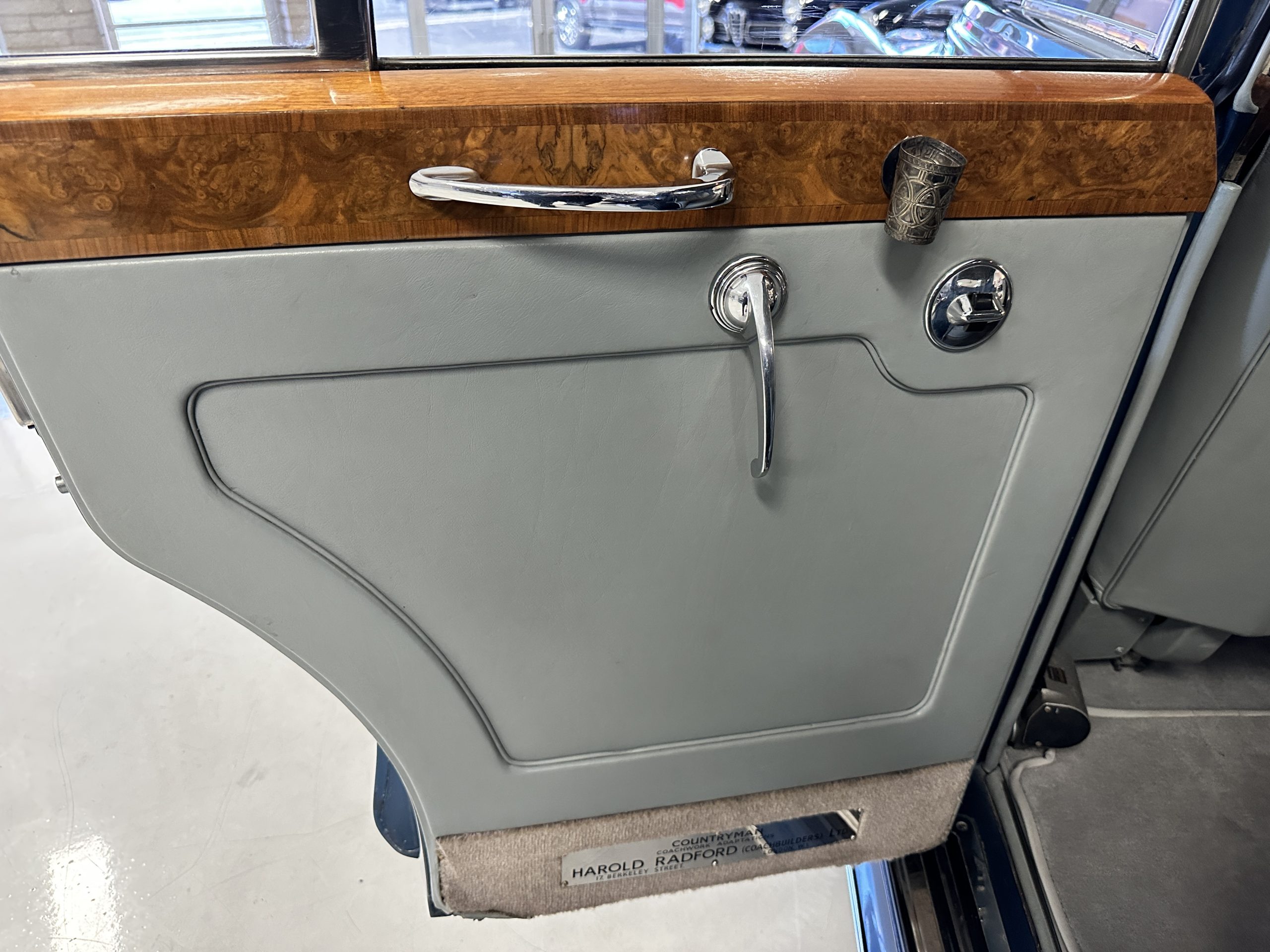 This Cloud was sent from the factory to Harold Radford Coachbuilders on September 22, 1961. Harold Radford was a custom coachbuilder that specialized in Rolls-Royce, Bentley and Mini’s. His coachbuilders would customize these cars bespoke for his well to do clientele. The “Countryman” Adaptations were designed to make longer tours more enjoyable and to make the cars more useful in the countryside. This Clouds adaptations were completed by Radford by January 11, 1961. Her original owner was a principal of C.D. Productions Ltd in London. The Radford adaptations on her include the rare and desirable full picnic table and cushions for the boot, fold-down rear seats with a full vanity for the rear armrest (including a swiveling beveled mirror, combs, notebook and a cigarette case), three reading lights, a locking cabinet with a tea kettle, cups and other items, a bud vase, and a mirror and two sunglass cases built into the sun visors, seat belts, and a rare Rotaflare swiveling driving lamp. This Radford was built for touring and enjoying life to the fullest.
