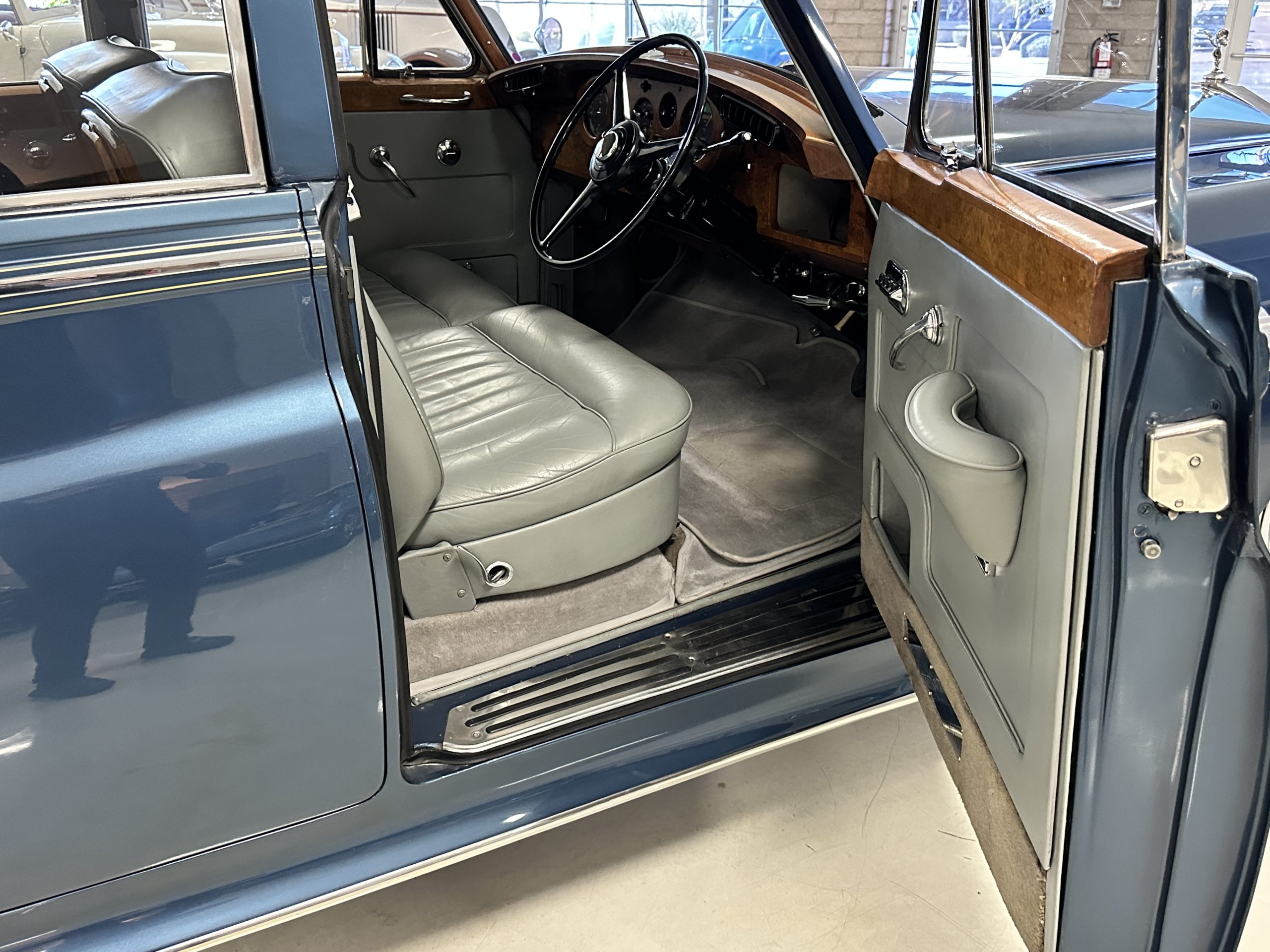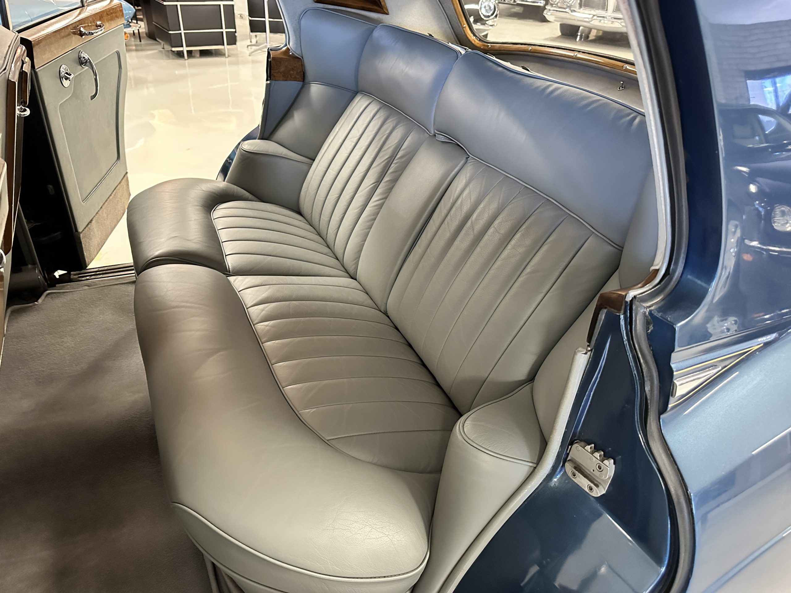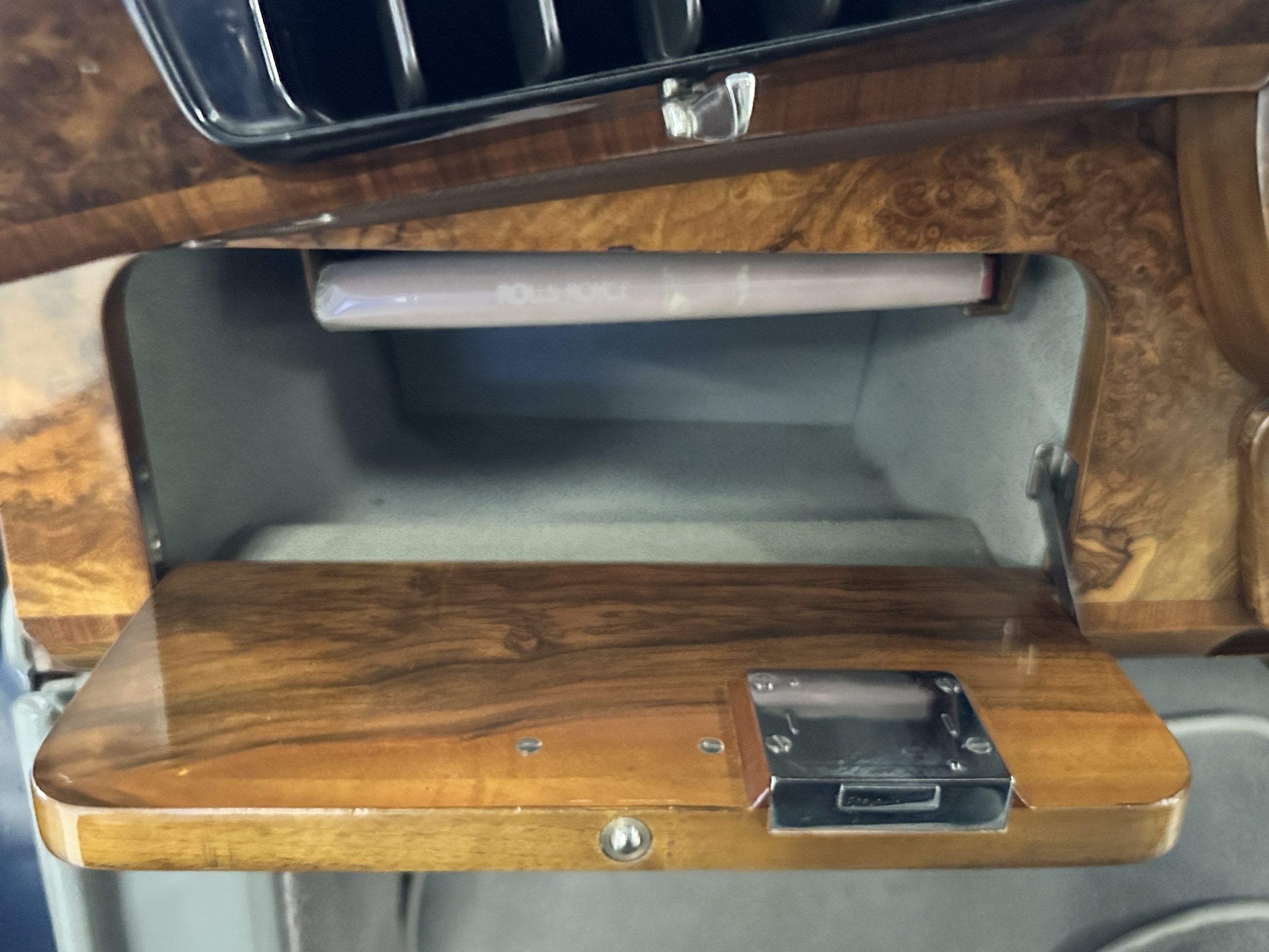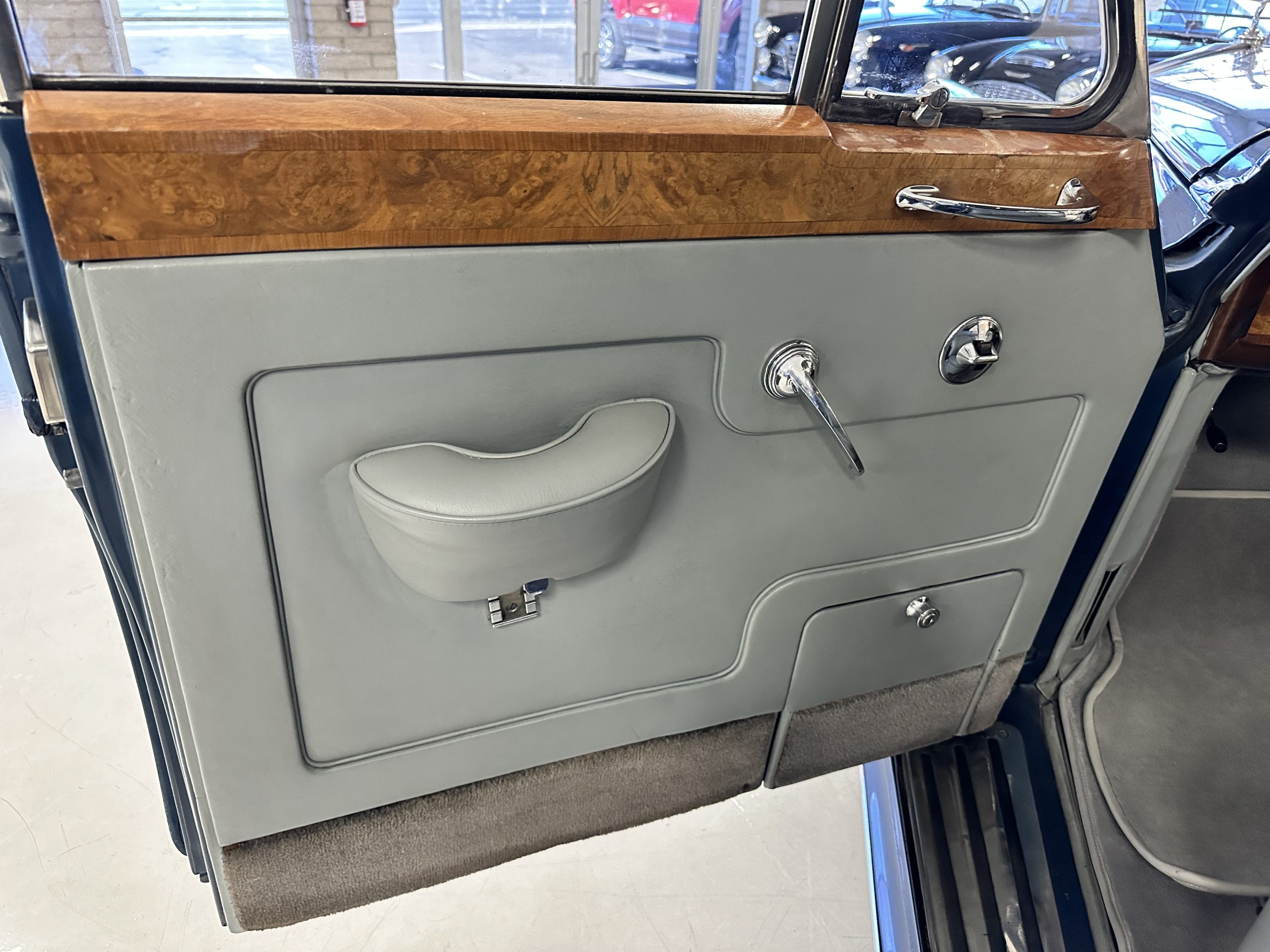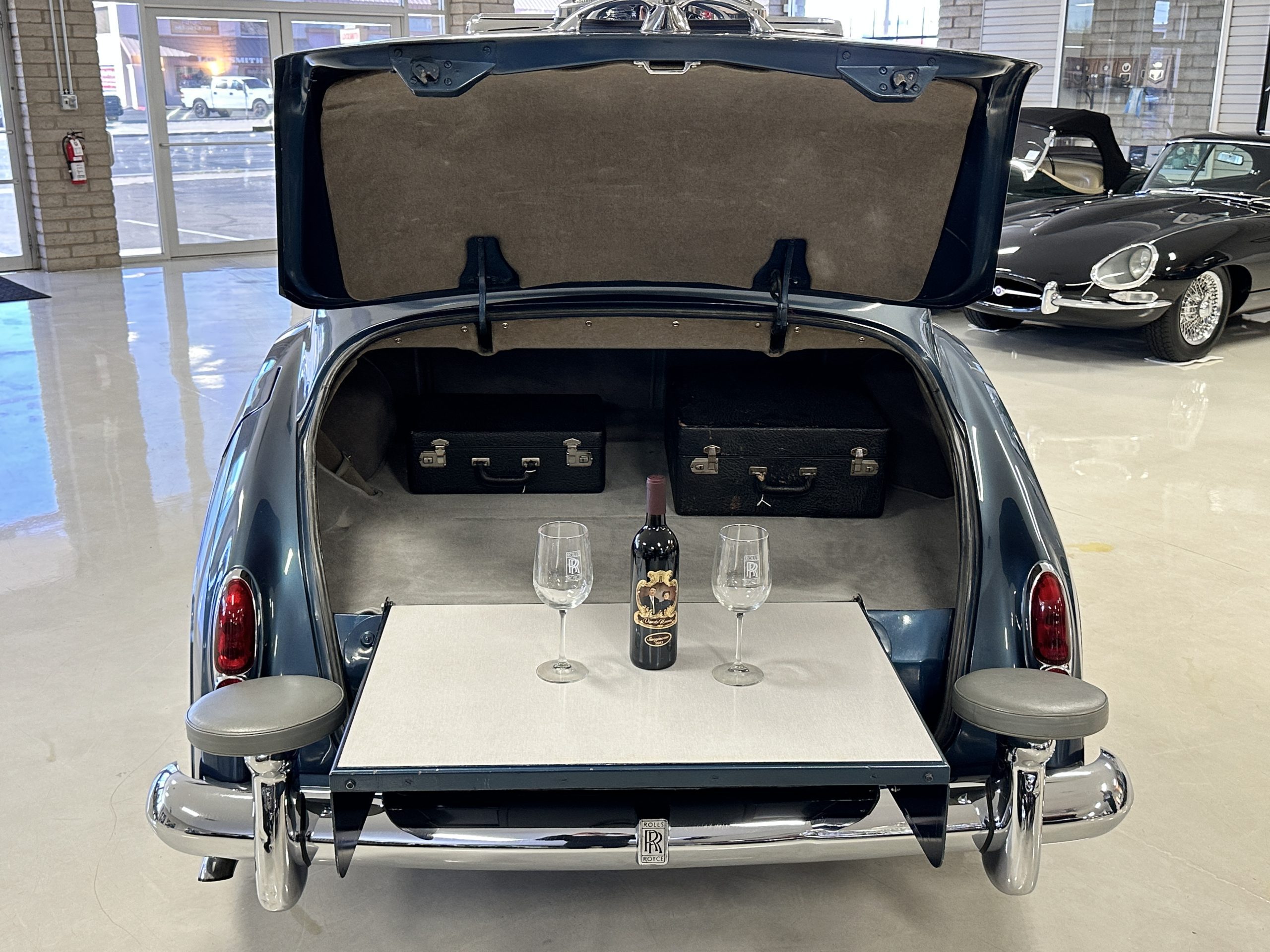 This Cloud was sent from the factory to Harold Radford Coachbuilders on September 22, 1961. Harold Radford was a custom coachbuilder that specialized in Rolls-Royce, Bentley and Mini’s. His coachbuilders would customize these cars bespoke for his well to do clientele. The “Countryman” Adaptations were designed to make longer tours more enjoyable and to make the cars more useful in the countryside. This Clouds adaptations were completed by Radford by January 11, 1961. Her original owner was a principal of C.D. Productions Ltd in London. The Radford adaptations on her include the rare and desirable full picnic table and cushions for the boot, fold-down rear seats with a full vanity for the rear armrest (including a swiveling beveled mirror, combs, notebook and a cigarette case), three reading lights, a locking cabinet with a tea kettle, cups and other items, a bud vase, and a mirror and two sunglass cases built into the sun visors, seat belts, and a rare Rotaflare swiveling driving lamp. This Radford was built for touring and enjoying life to the fullest.