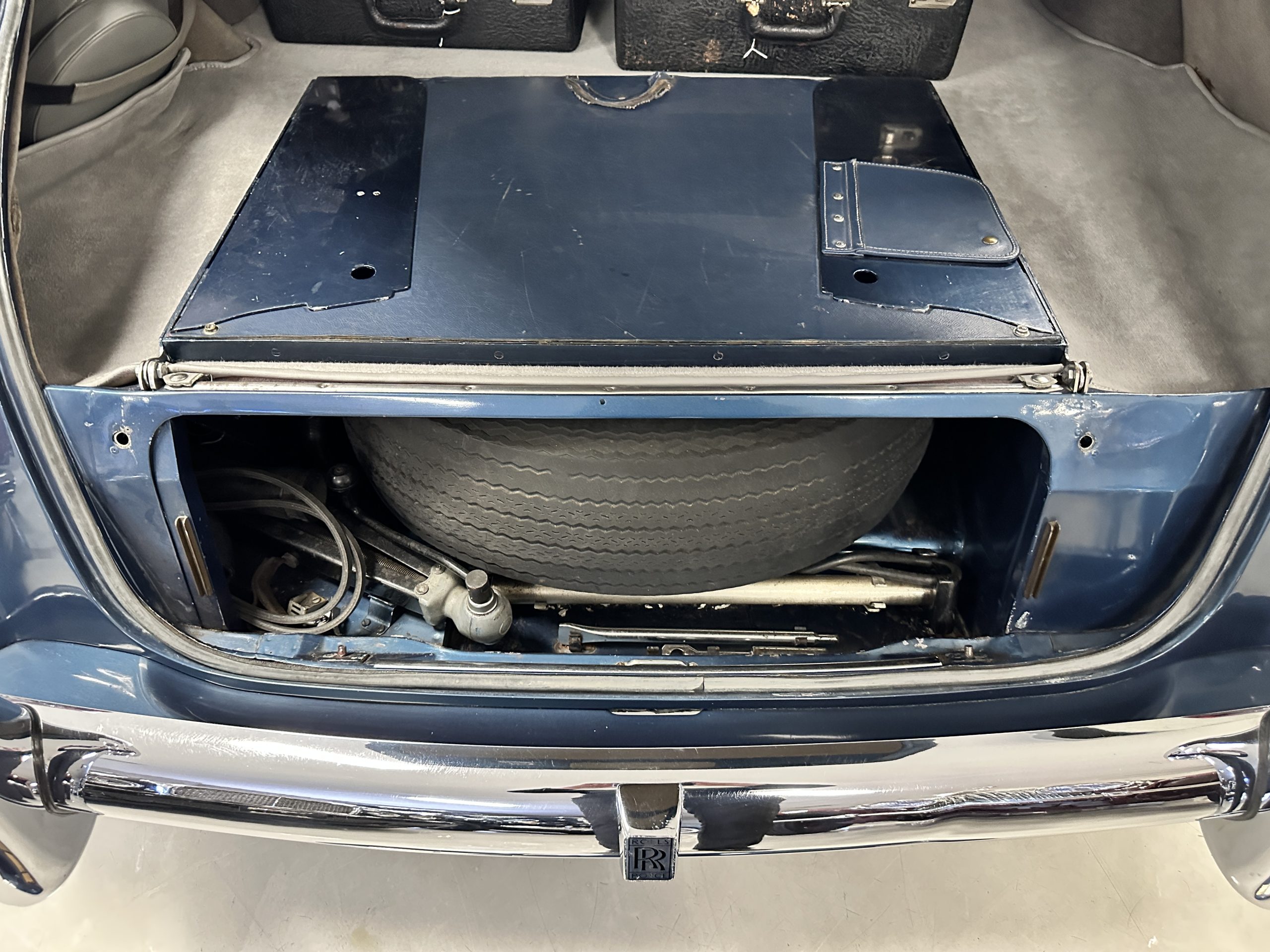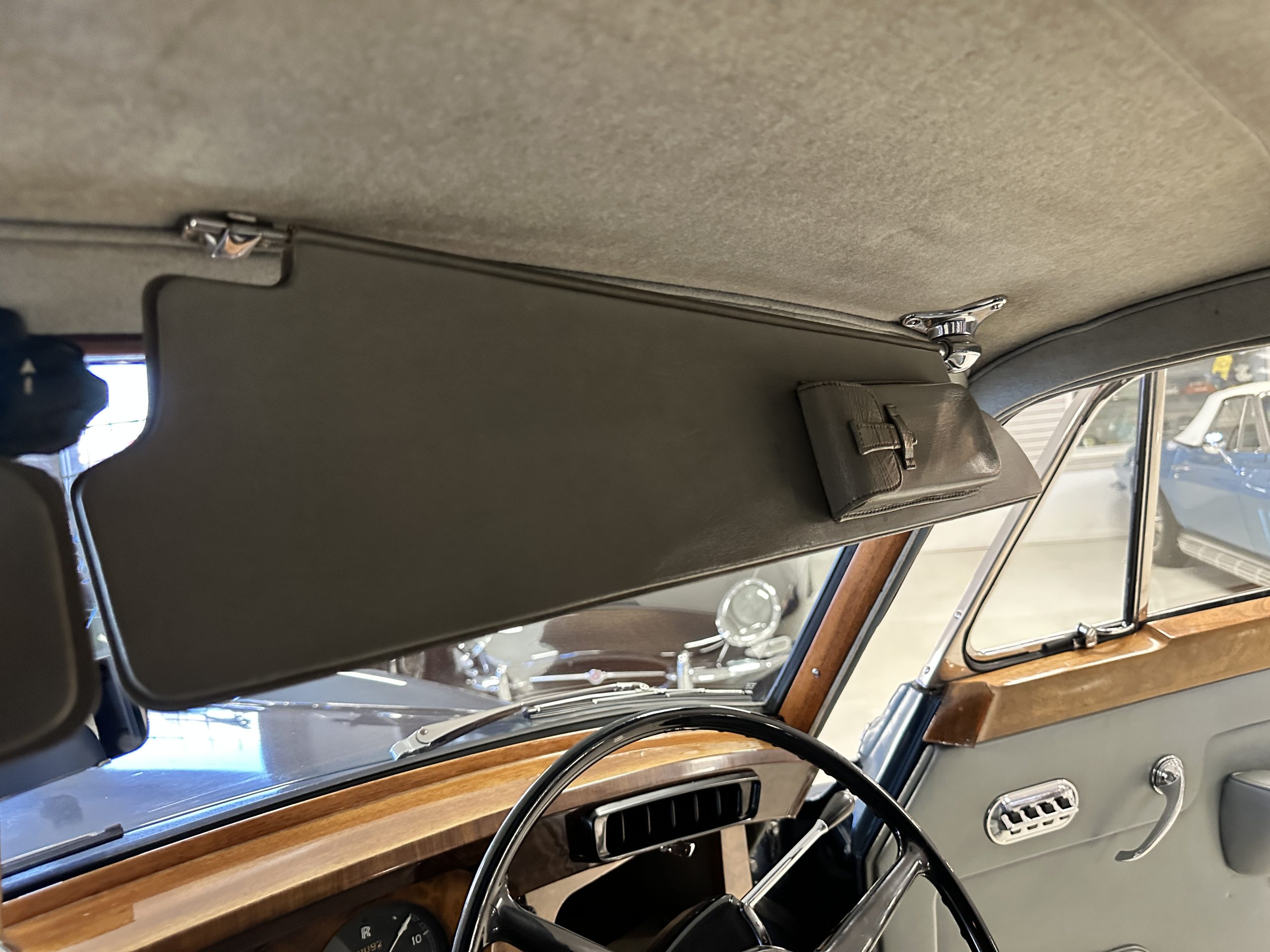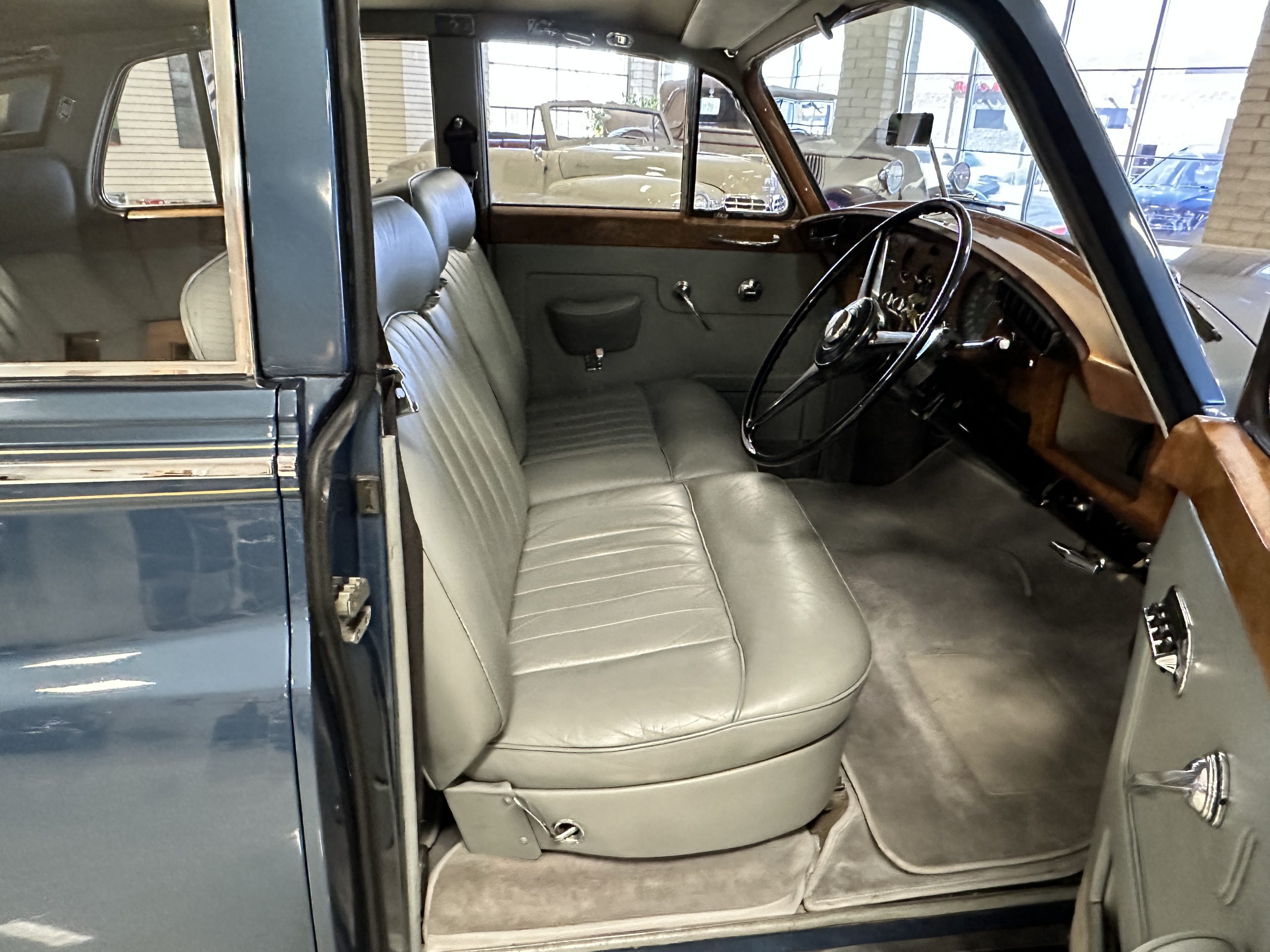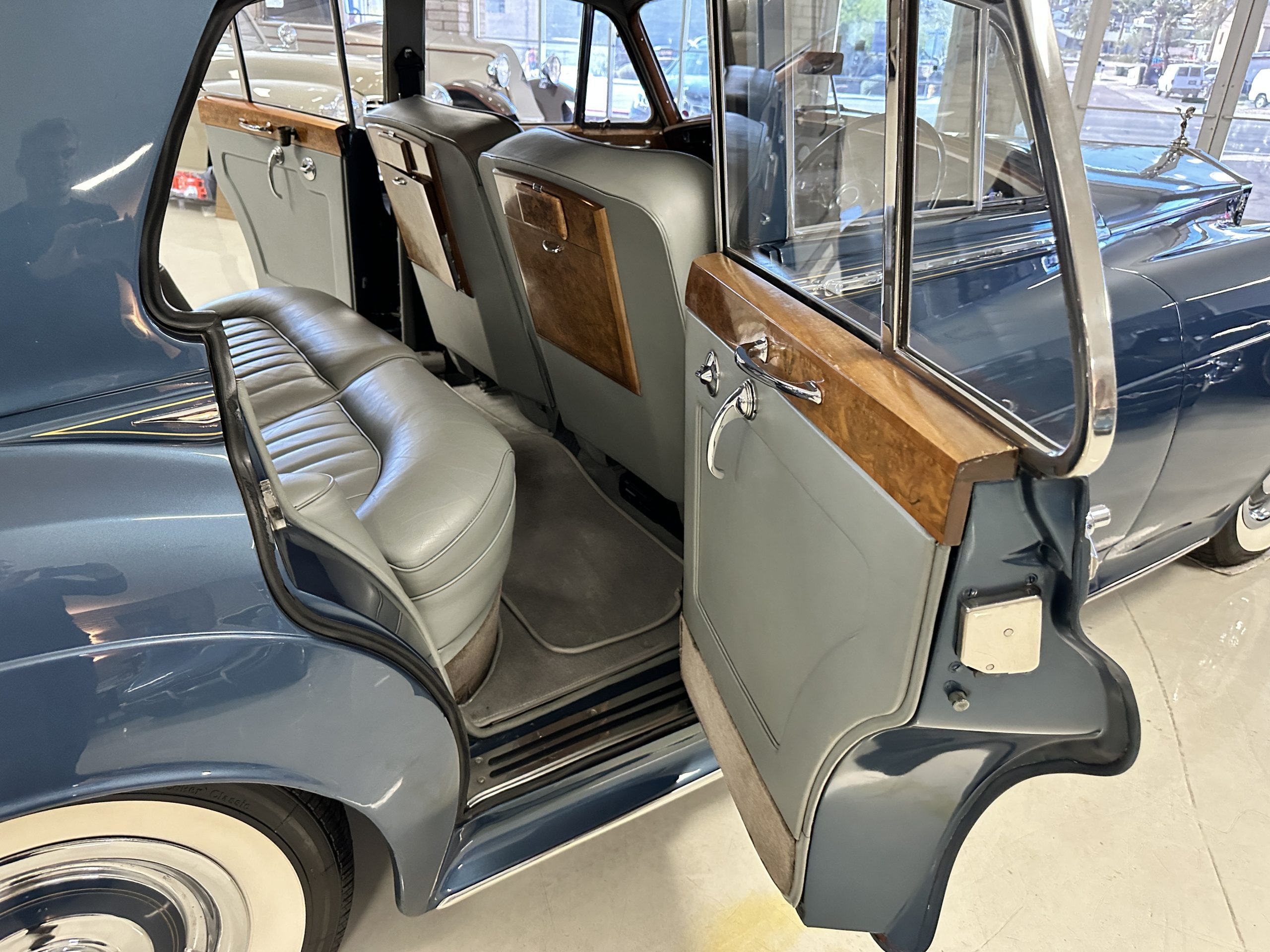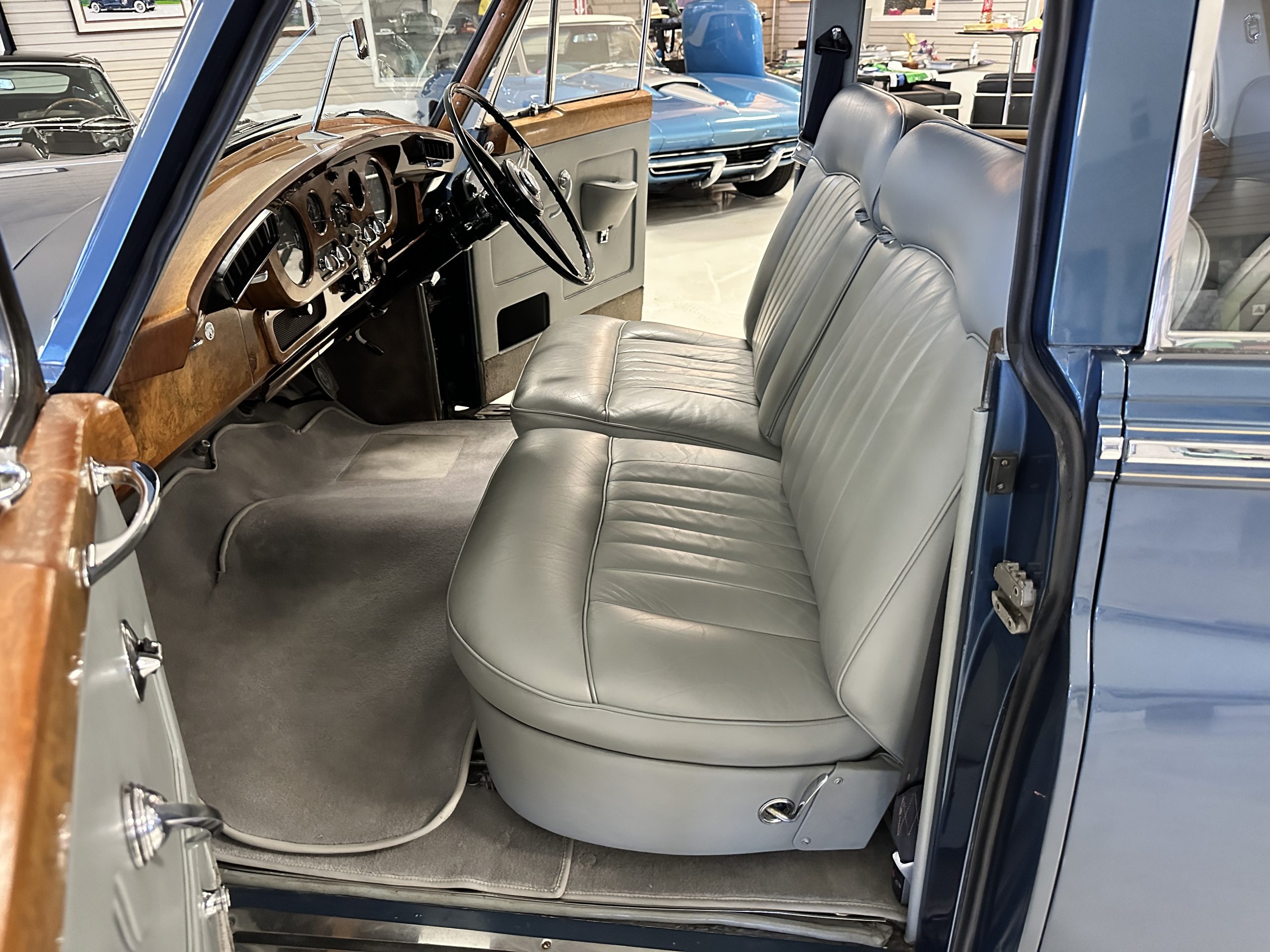 This Cloud was sent from the factory to Harold Radford Coachbuilders on September 22, 1961. Harold Radford was a custom coachbuilder that specialized in Rolls-Royce, Bentley and Mini’s. His coachbuilders would customize these cars bespoke for his well to do clientele. The “Countryman” Adaptations were designed to make longer tours more enjoyable and to make the cars more useful in the countryside. This Clouds adaptations were completed by Radford by January 11, 1961. Her original owner was a principal of C.D. Productions Ltd in London. The Radford adaptations on her include the rare and desirable full picnic table and cushions for the boot, fold-down rear seats with a full vanity for the rear armrest (including a swiveling beveled mirror, combs, notebook and a cigarette case), three reading lights, a locking cabinet with a tea kettle, cups and other items, a bud vase, and a mirror and two sunglass cases built into the sun visors, seat belts, and a rare Rotaflare swiveling driving lamp. This Radford was built for touring and enjoying life to the fullest.