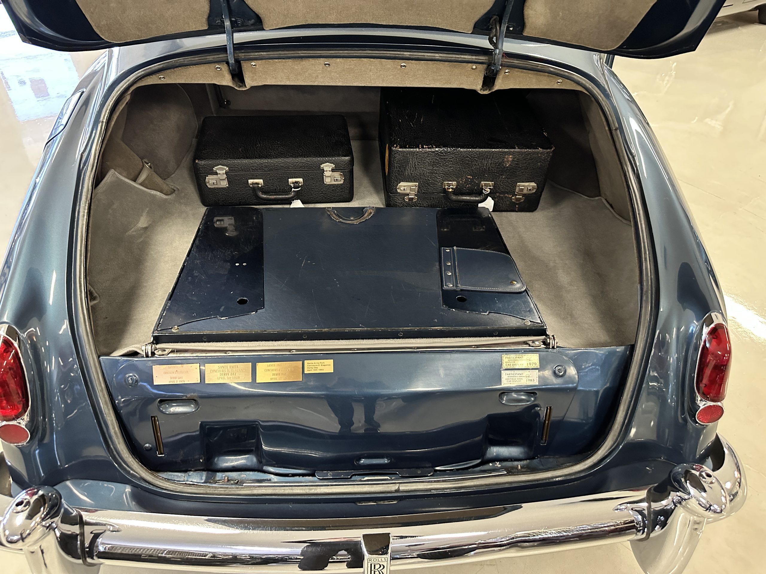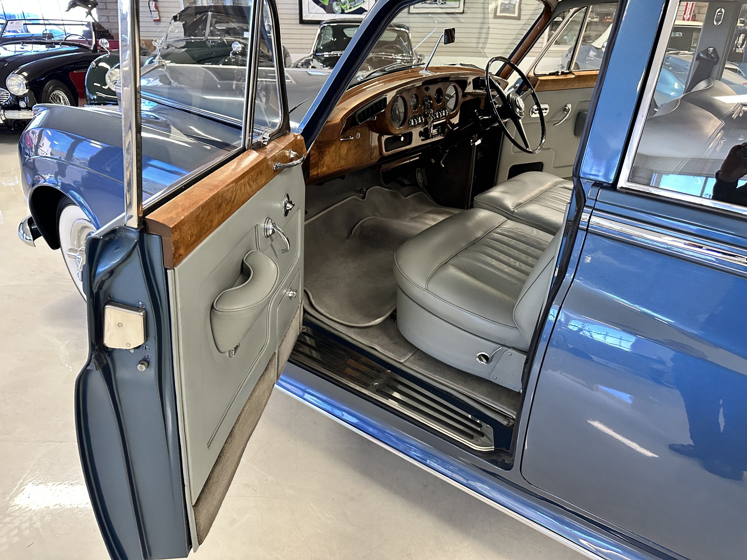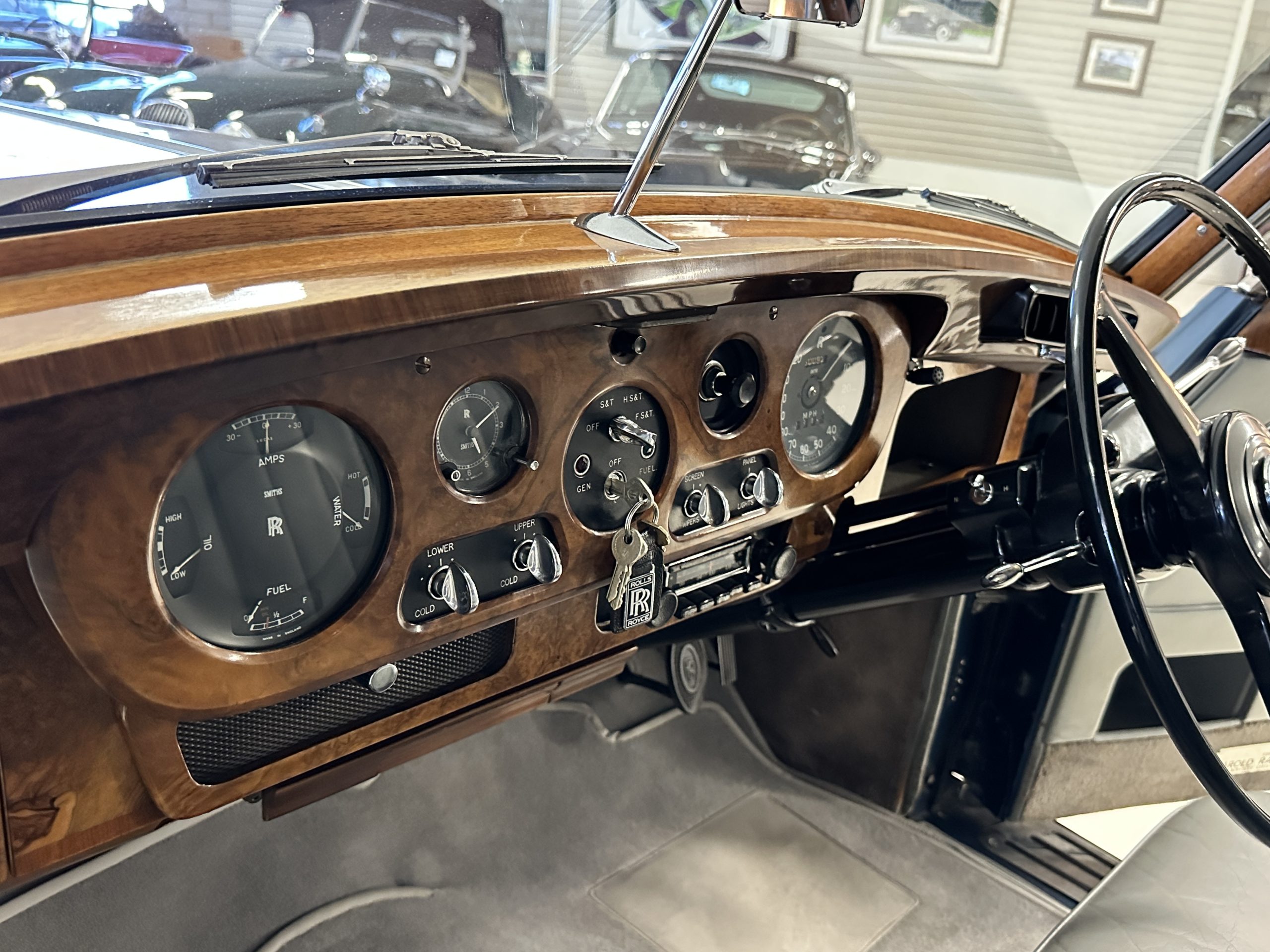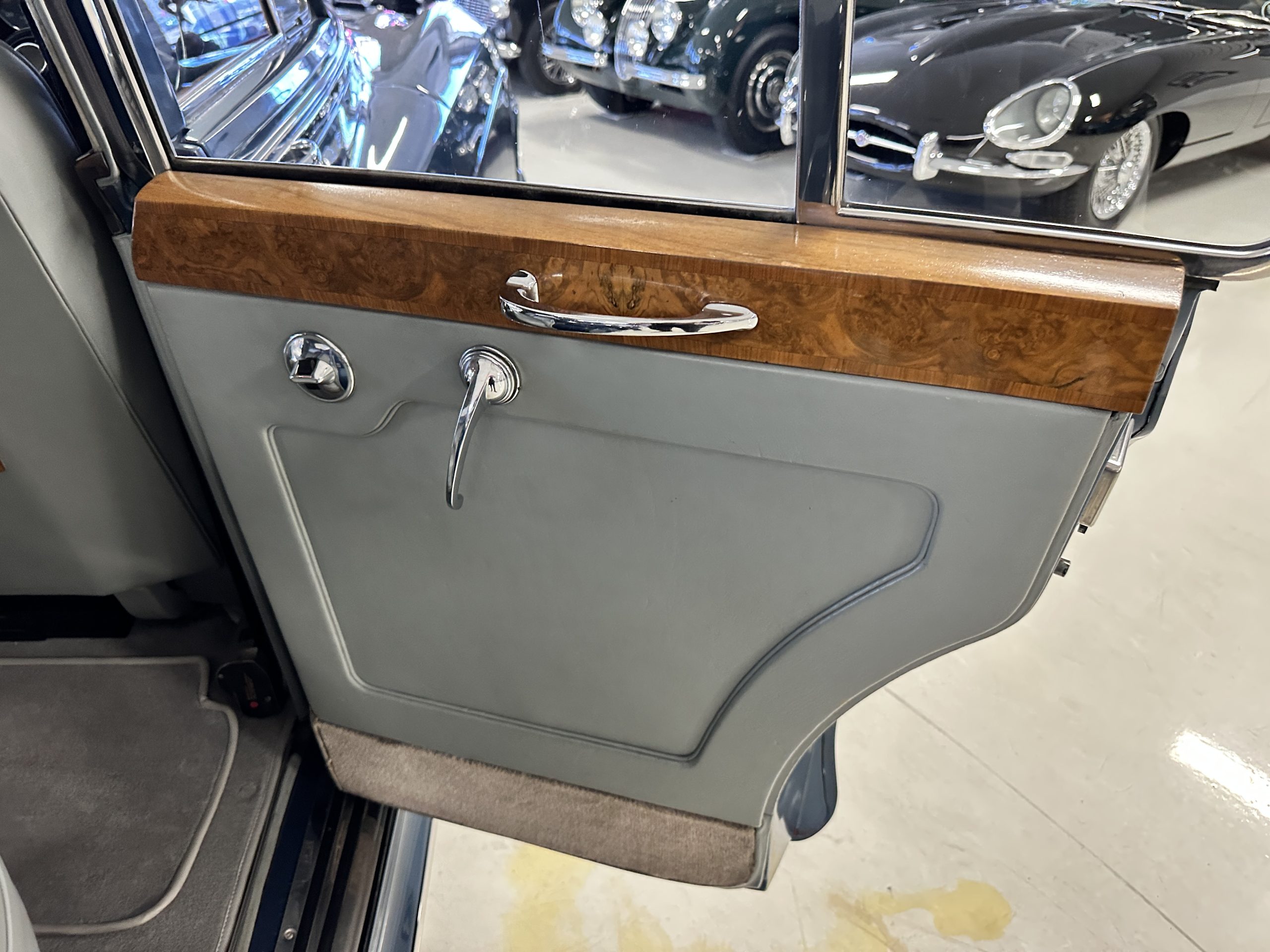 This Cloud was sent from the factory to Harold Radford Coachbuilders on September 22, 1961. Harold Radford was a custom coachbuilder that specialized in Rolls-Royce, Bentley and Mini’s. His coachbuilders would customize these cars bespoke for his well to do clientele. The “Countryman” Adaptations were designed to make longer tours more enjoyable and to make the cars more useful in the countryside. This Clouds adaptations were completed by Radford by January 11, 1961. Her original owner was a principal of C.D. Productions Ltd in London. The Radford adaptations on her include the rare and desirable full picnic table and cushions for the boot, fold-down rear seats with a full vanity for the rear armrest (including a swiveling beveled mirror, combs, notebook and a cigarette case), three reading lights, a locking cabinet with a tea kettle, cups and other items, a bud vase, and a mirror and two sunglass cases built into the sun visors, seat belts, and a rare Rotaflare swiveling driving lamp. This Radford was built for touring and enjoying life to the fullest.
