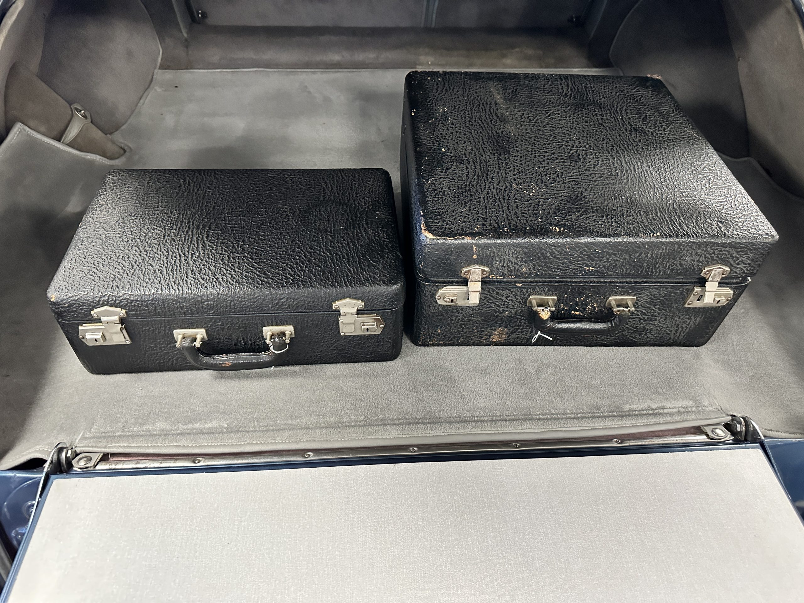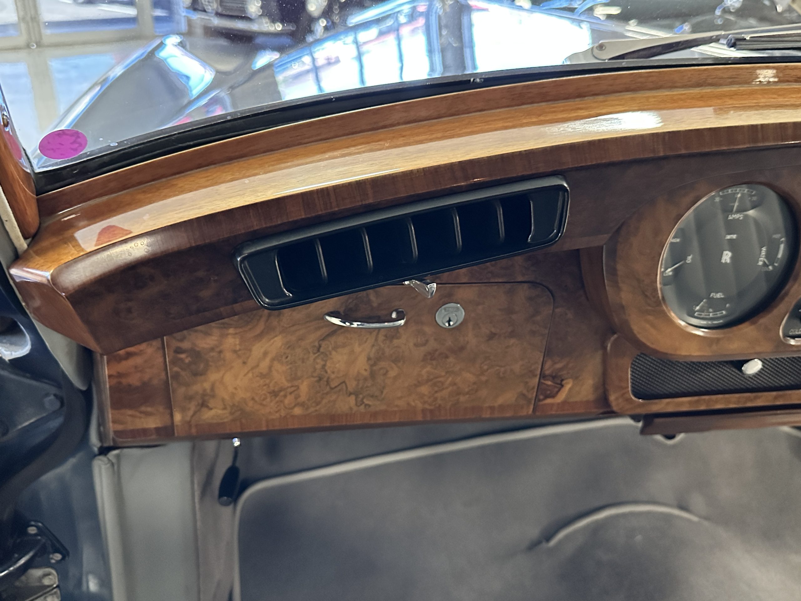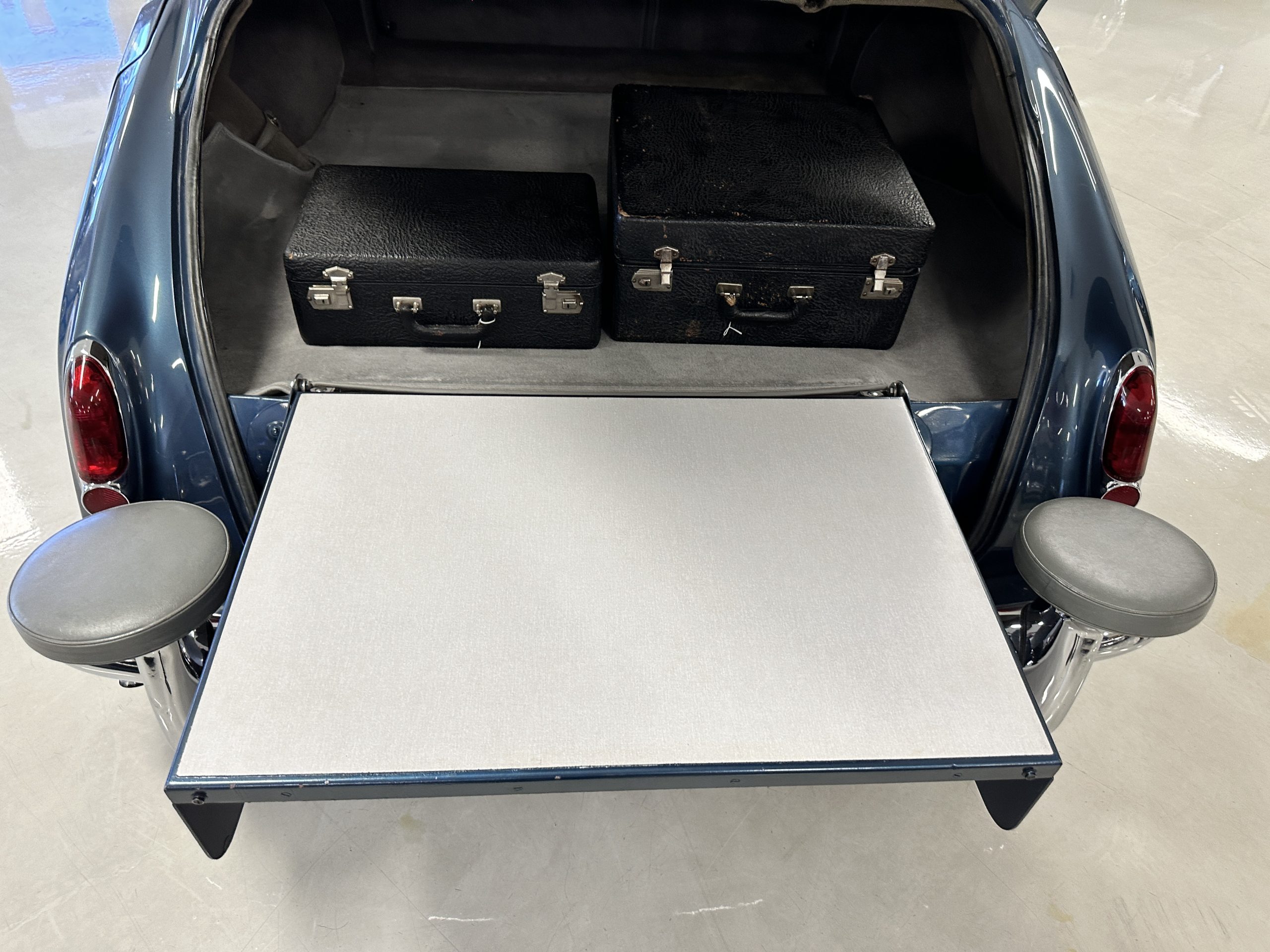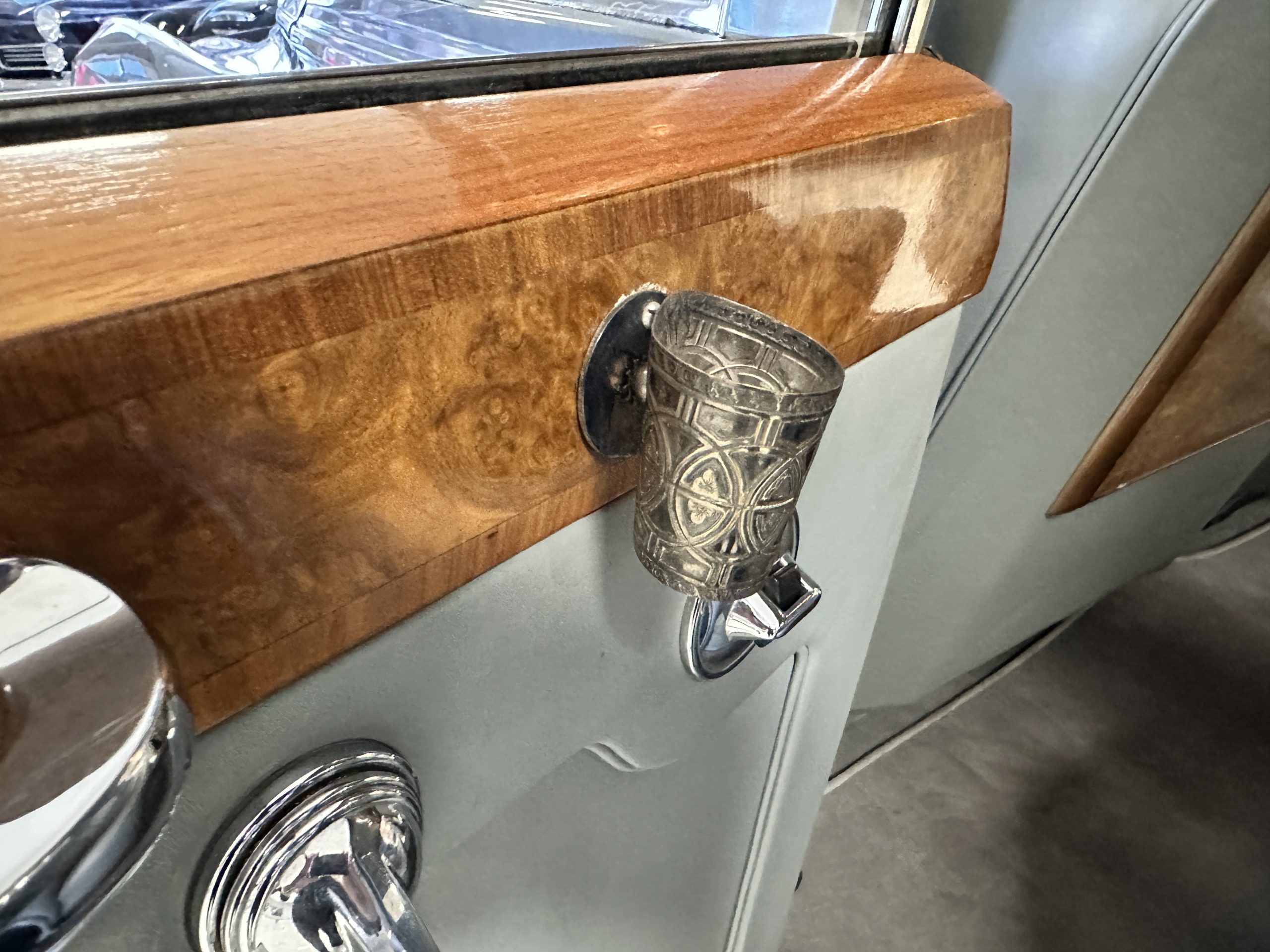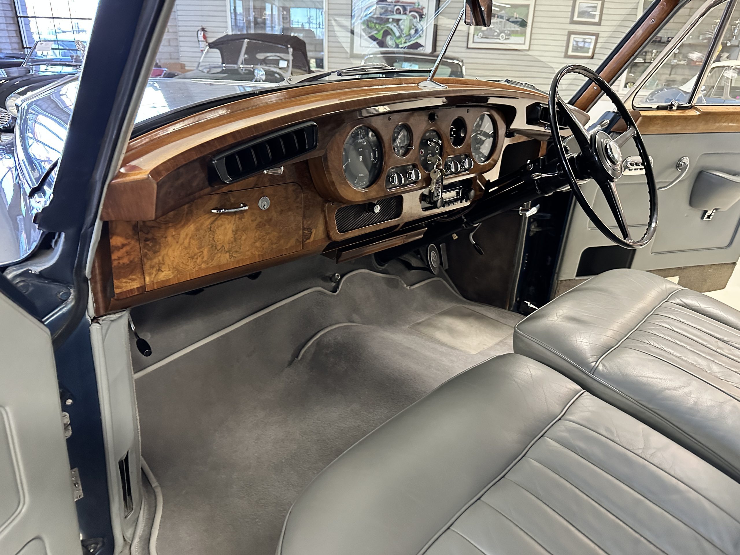 This Cloud was sent from the factory to Harold Radford Coachbuilders on September 22, 1961. Harold Radford was a custom coachbuilder that specialized in Rolls-Royce, Bentley and Mini’s. His coachbuilders would customize these cars bespoke for his well to do clientele. The “Countryman” Adaptations were designed to make longer tours more enjoyable and to make the cars more useful in the countryside. This Clouds adaptations were completed by Radford by January 11, 1961. Her original owner was a principal of C.D. Productions Ltd in London. The Radford adaptations on her include the rare and desirable full picnic table and cushions for the boot, fold-down rear seats with a full vanity for the rear armrest (including a swiveling beveled mirror, combs, notebook and a cigarette case), three reading lights, a locking cabinet with a tea kettle, cups and other items, a bud vase, and a mirror and two sunglass cases built into the sun visors, seat belts, and a rare Rotaflare swiveling driving lamp. This Radford was built for touring and enjoying life to the fullest.