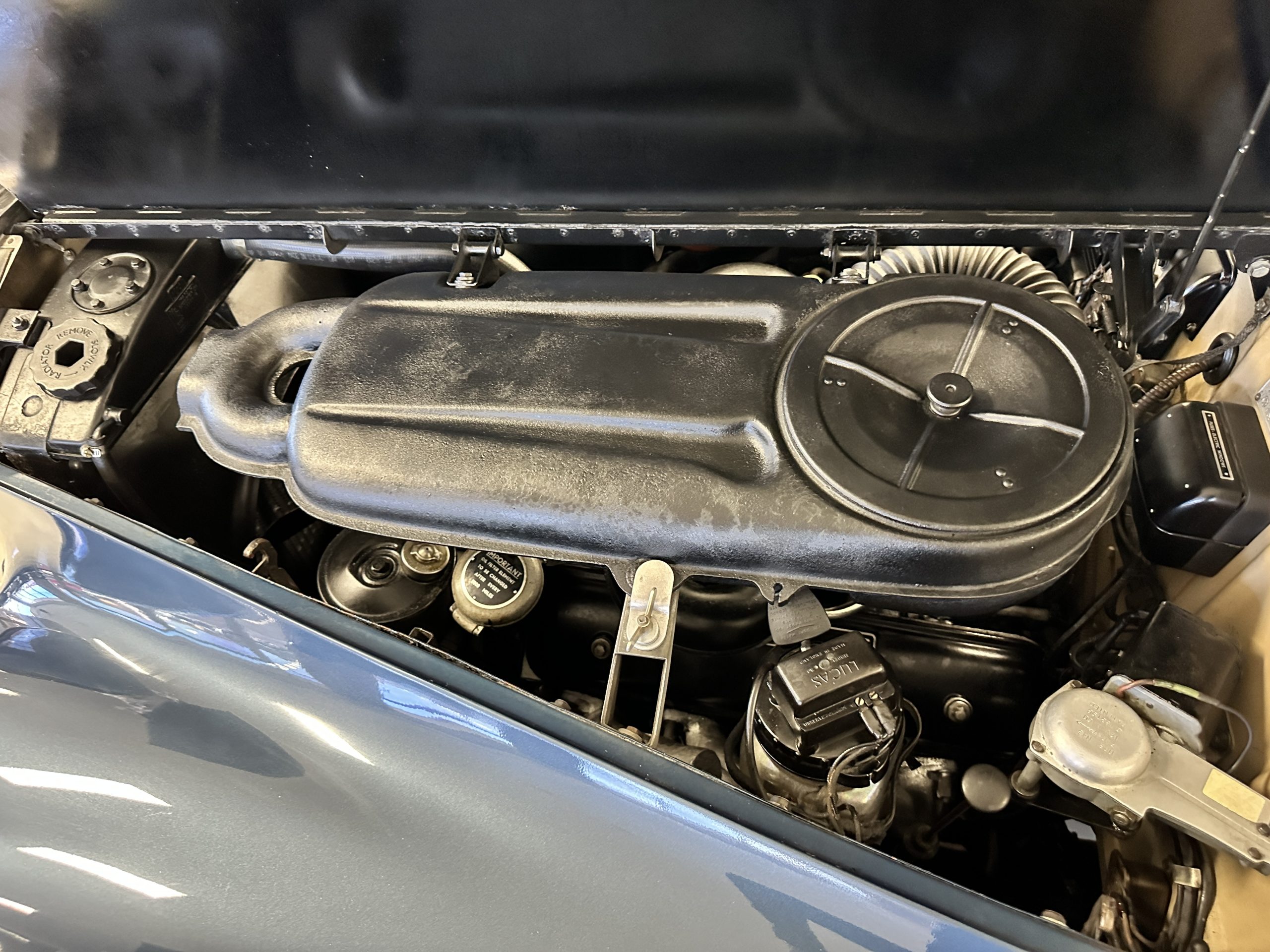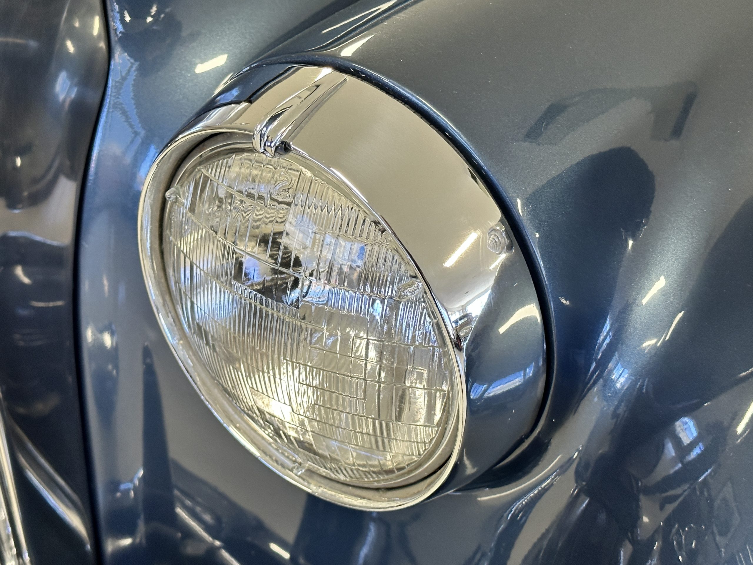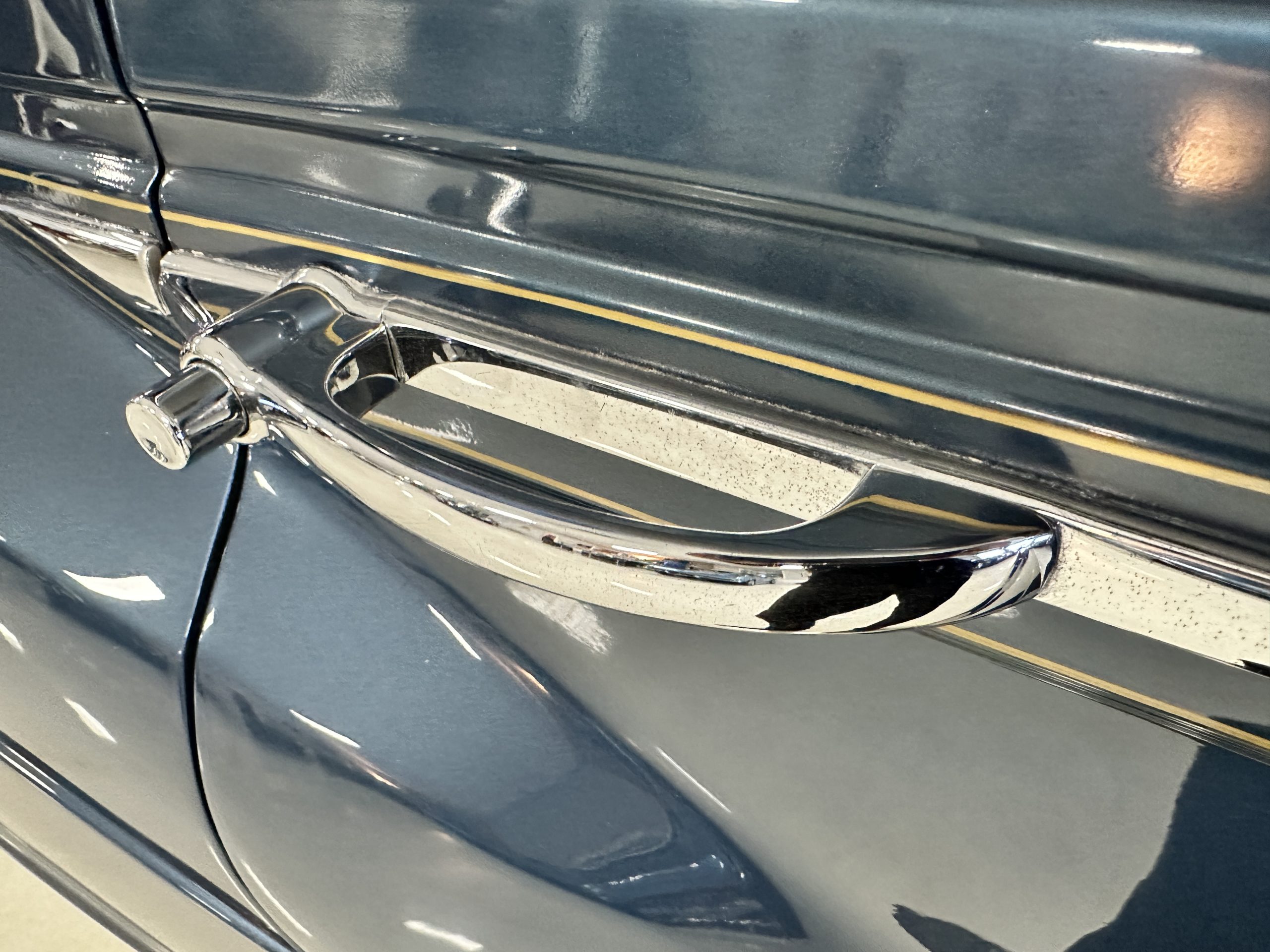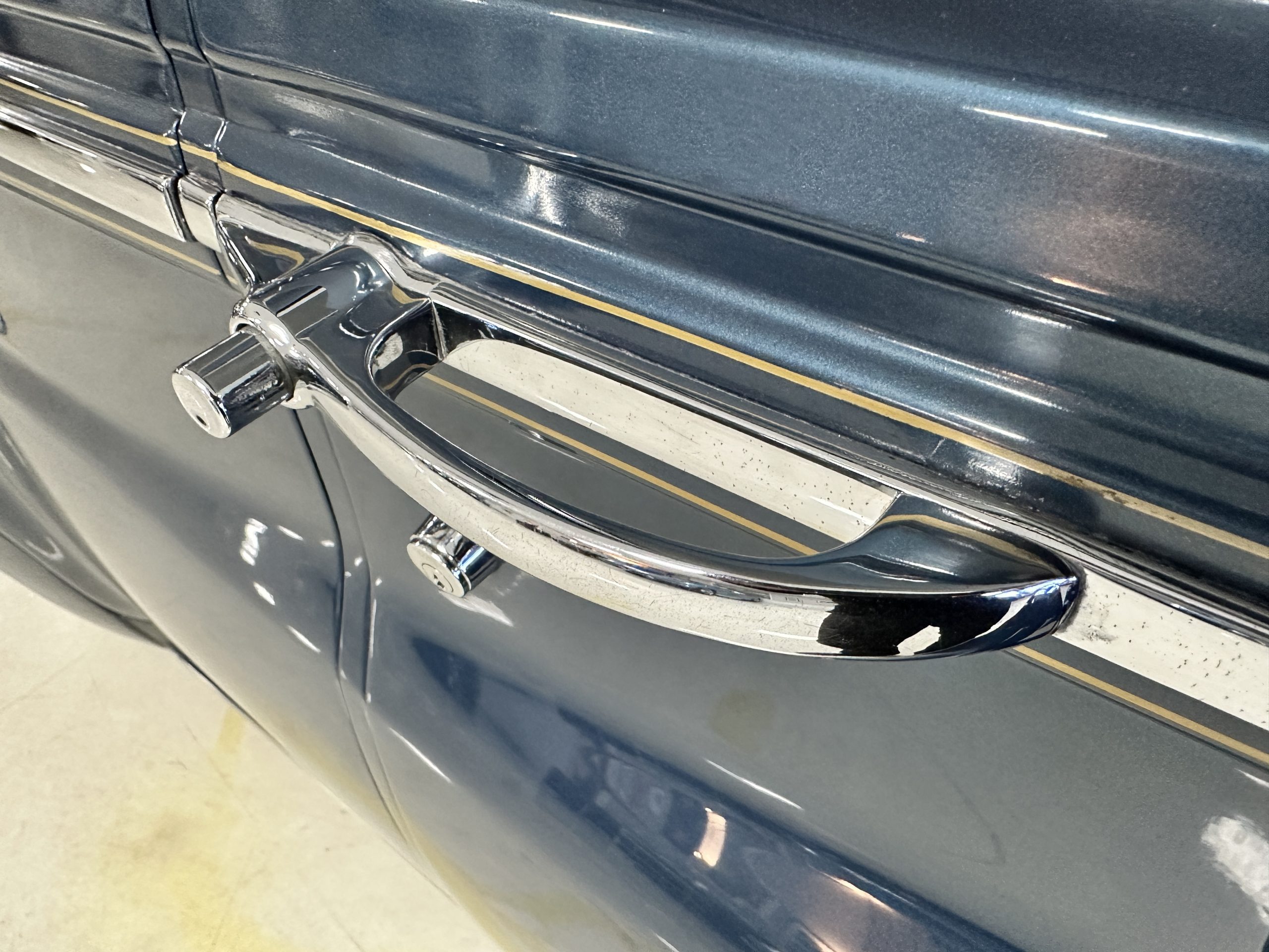 The livery was a special order “Special Blue” (Code 9500564) which is a steel blue metallic. The paint is in overall very good original condition and has beautiful shine and luster. There are some areas of fine lacquer crazing, but overall, it presents beautifully. The Special Blue is complimented by tan coachstripes. The chrome and stainless-steel trim are in overall nice condition. Mounted on the front valance are the normal dual fog lights along with a rare Rotaflare swiveling driving lamp. The Coker Classic wide white wall radials make this a joy to drive and look terrific.