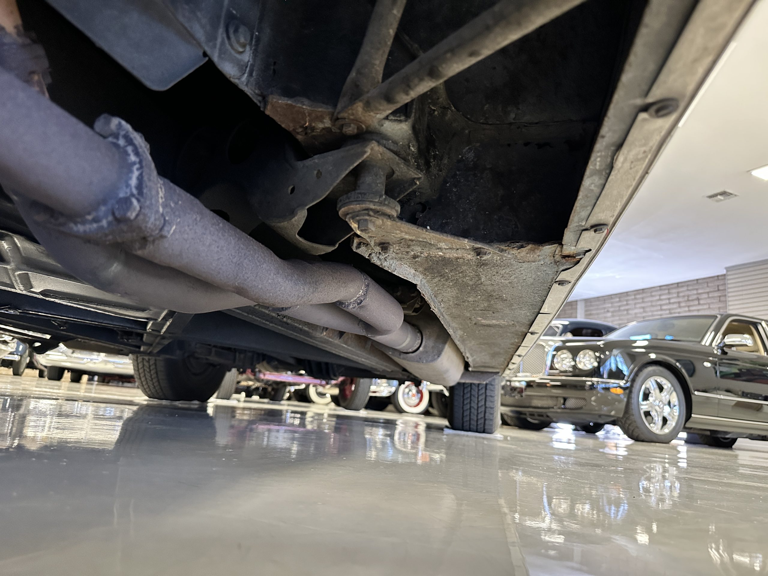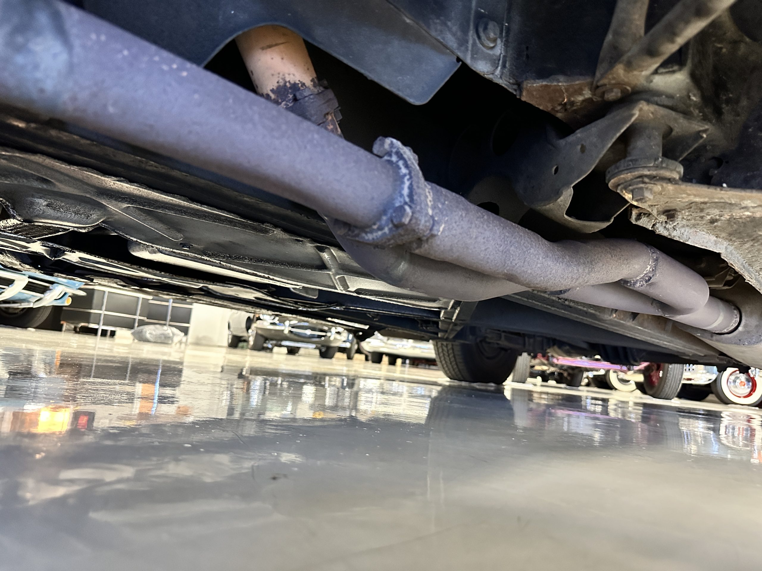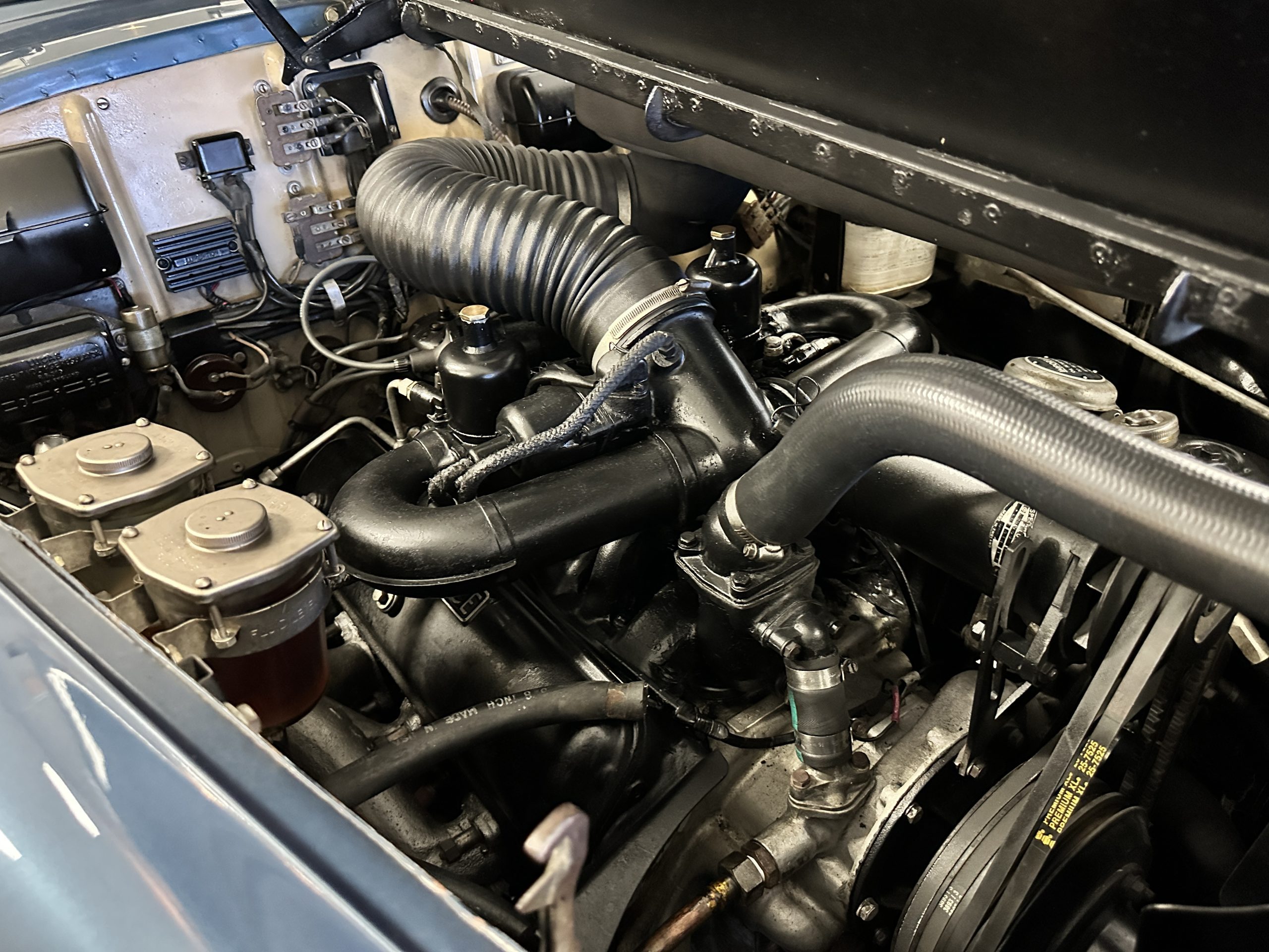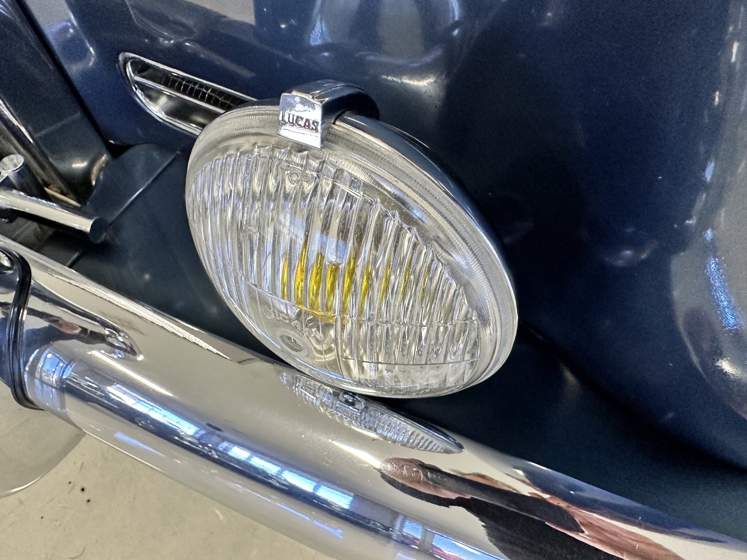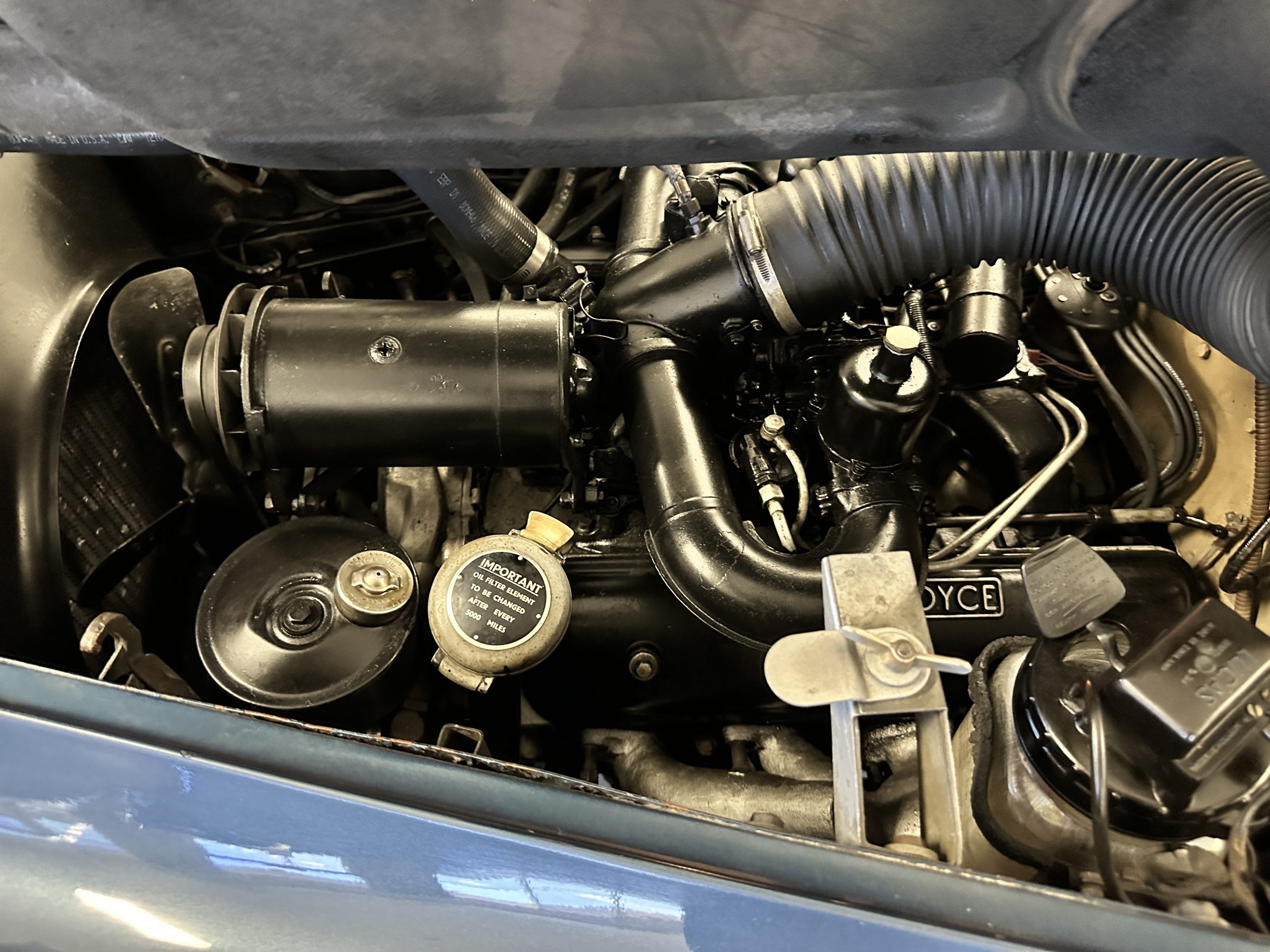 The livery was a special order “Special Blue” (Code 9500564) which is a steel blue metallic. The paint is in overall very good original condition and has beautiful shine and luster. There are some areas of fine lacquer crazing, but overall, it presents beautifully. The Special Blue is complimented by tan coachstripes. The chrome and stainless-steel trim are in overall nice condition. Mounted on the front valance are the normal dual fog lights along with a rare Rotaflare swiveling driving lamp. The Coker Classic wide white wall radials make this a joy to drive and look terrific.