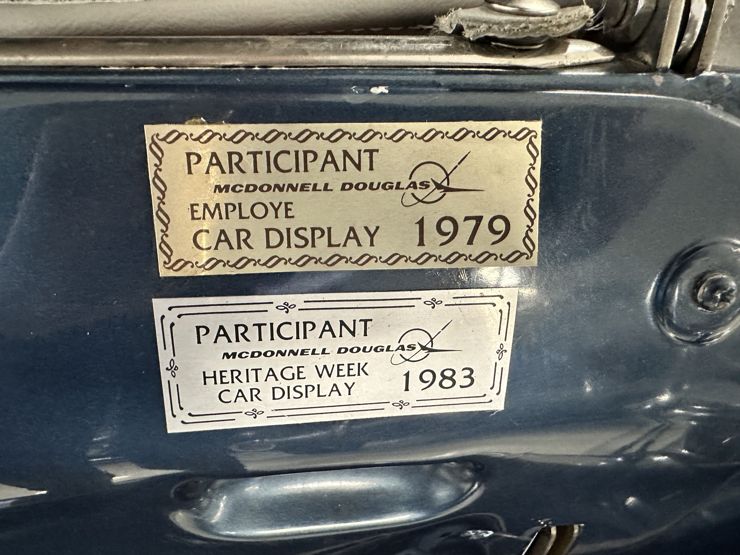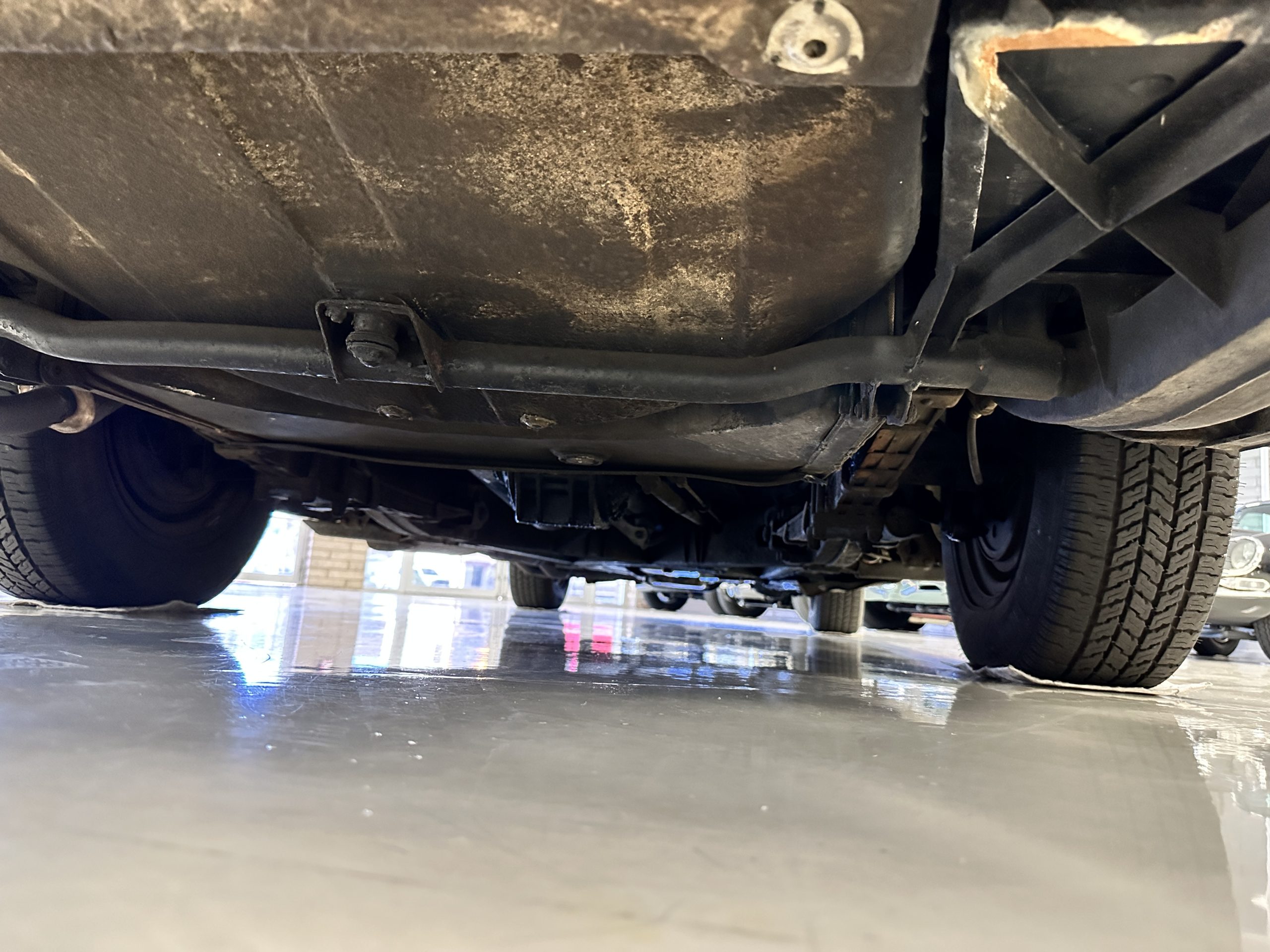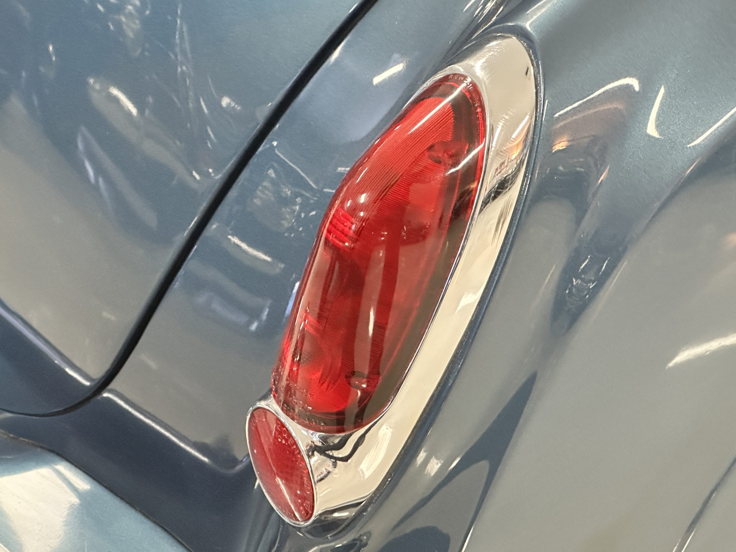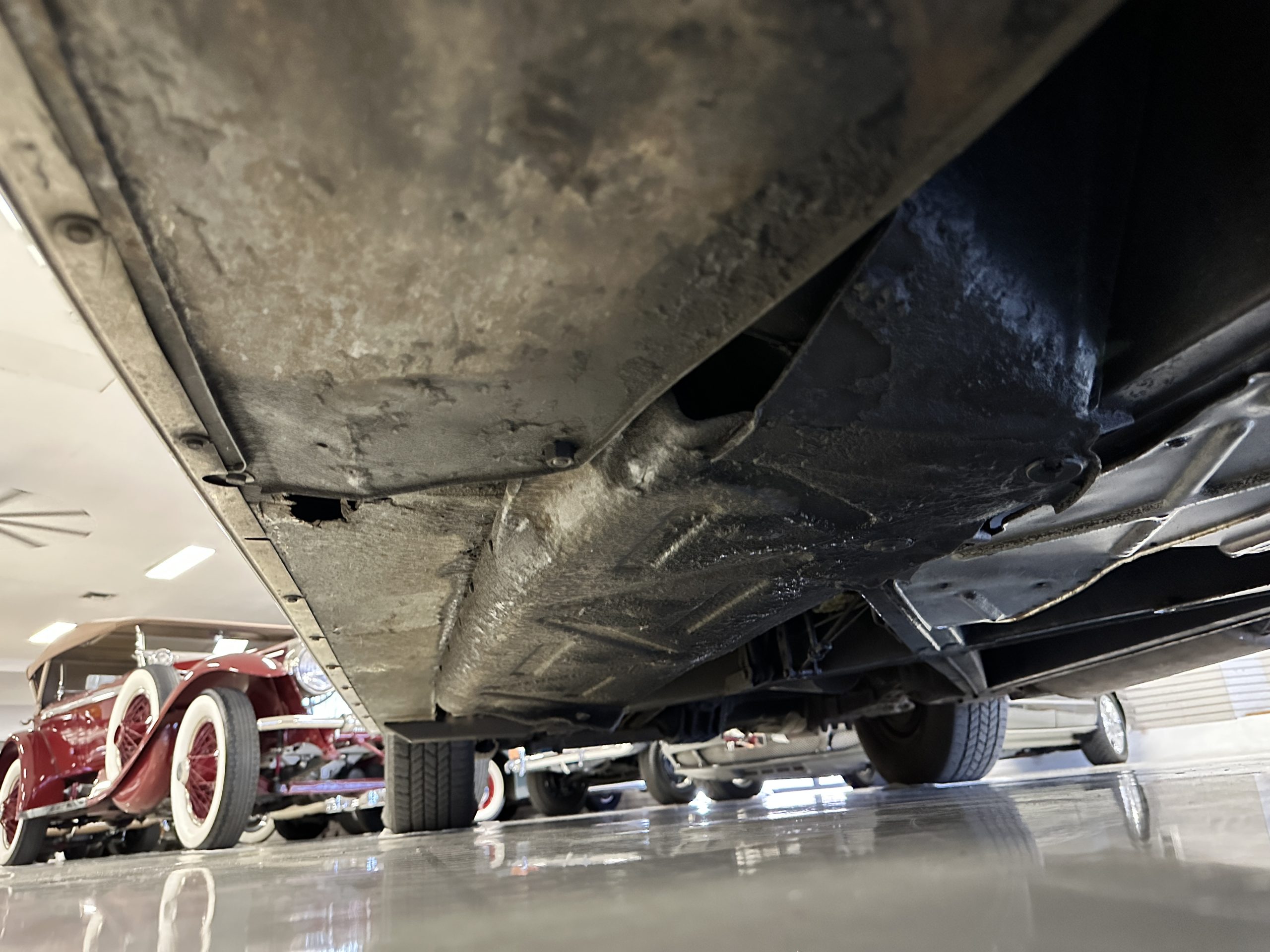 The livery was a special order “Special Blue” (Code 9500564) which is a steel blue metallic. The paint is in overall very good original condition and has beautiful shine and luster. There are some areas of fine lacquer crazing, but overall, it presents beautifully. The Special Blue is complimented by tan coachstripes. The chrome and stainless-steel trim are in overall nice condition. Mounted on the front valance are the normal dual fog lights along with a rare Rotaflare swiveling driving lamp. The Coker Classic wide white wall radials make this a joy to drive and look terrific.