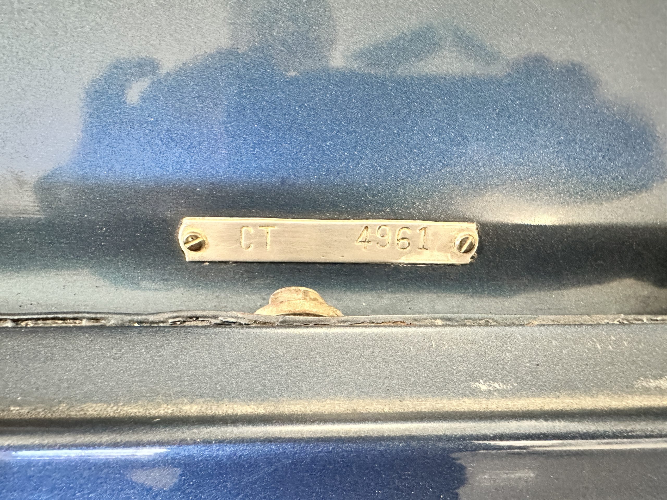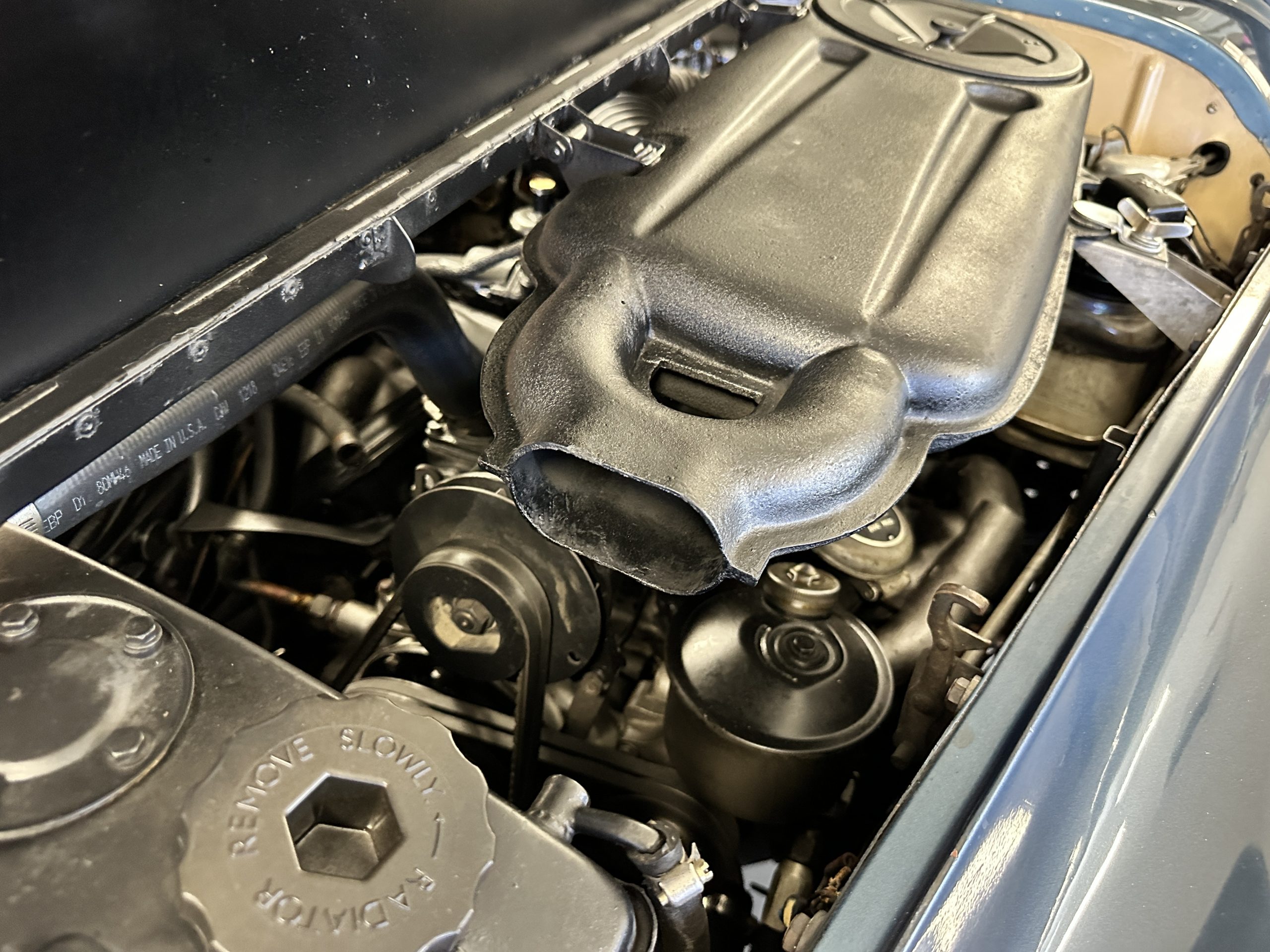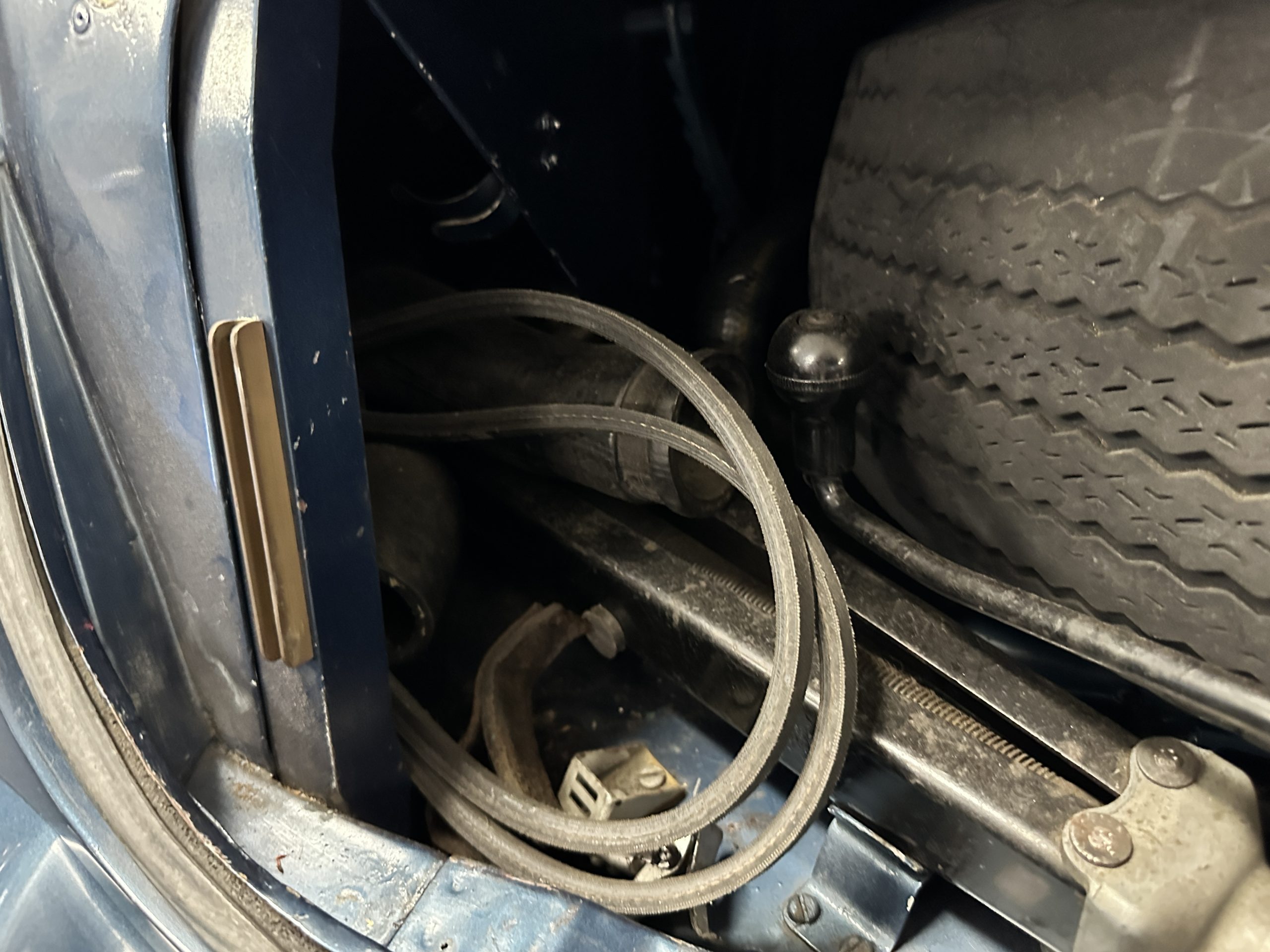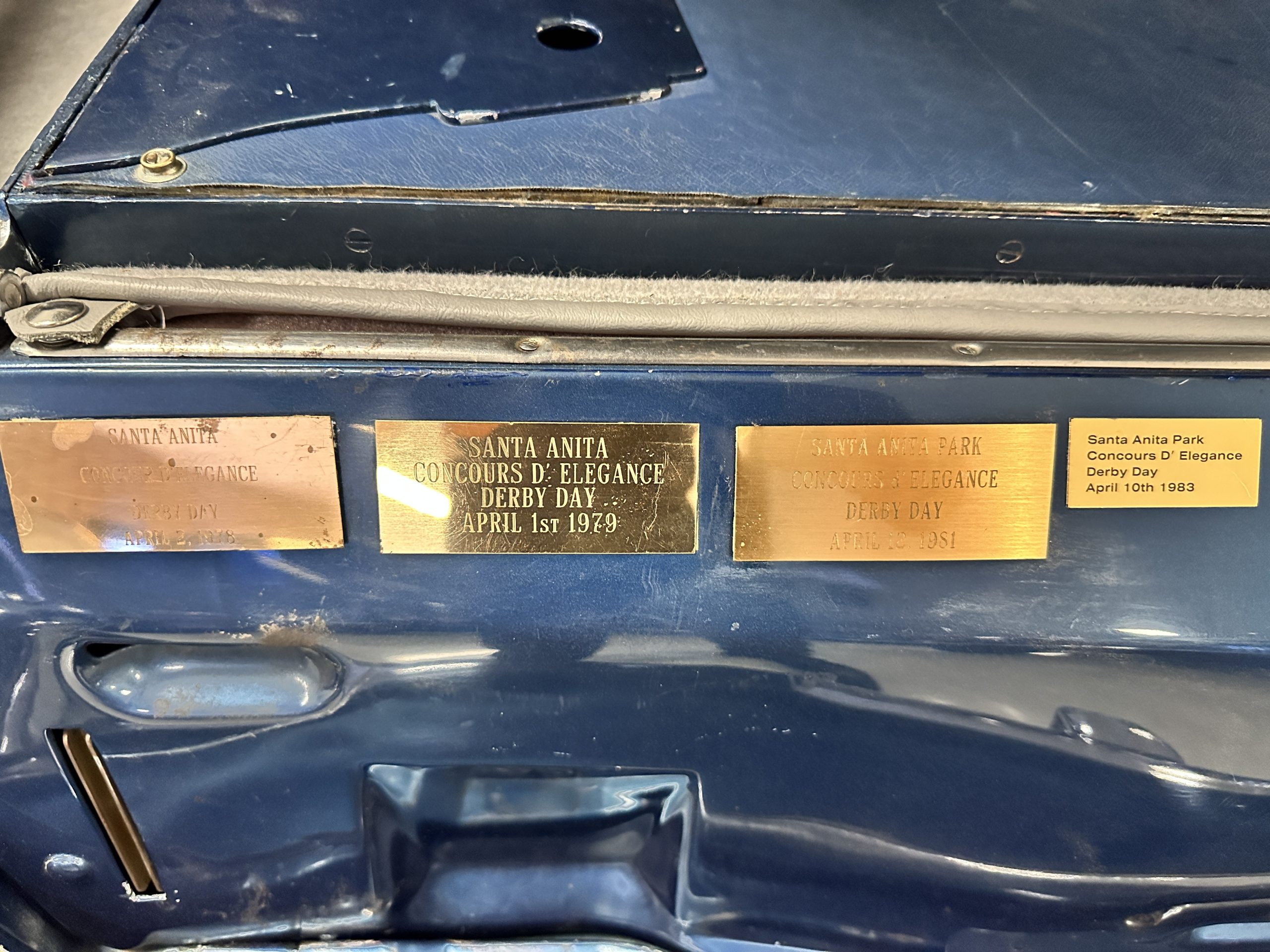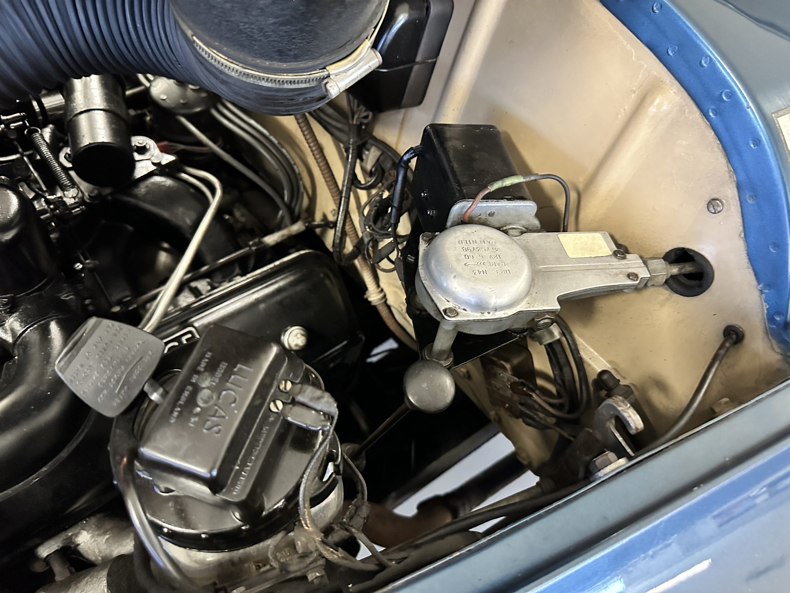 The livery was a special order “Special Blue” (Code 9500564) which is a steel blue metallic. The paint is in overall very good original condition and has beautiful shine and luster. There are some areas of fine lacquer crazing, but overall, it presents beautifully. The Special Blue is complimented by tan coachstripes. The chrome and stainless-steel trim are in overall nice condition. Mounted on the front valance are the normal dual fog lights along with a rare Rotaflare swiveling driving lamp. The Coker Classic wide white wall radials make this a joy to drive and look terrific.