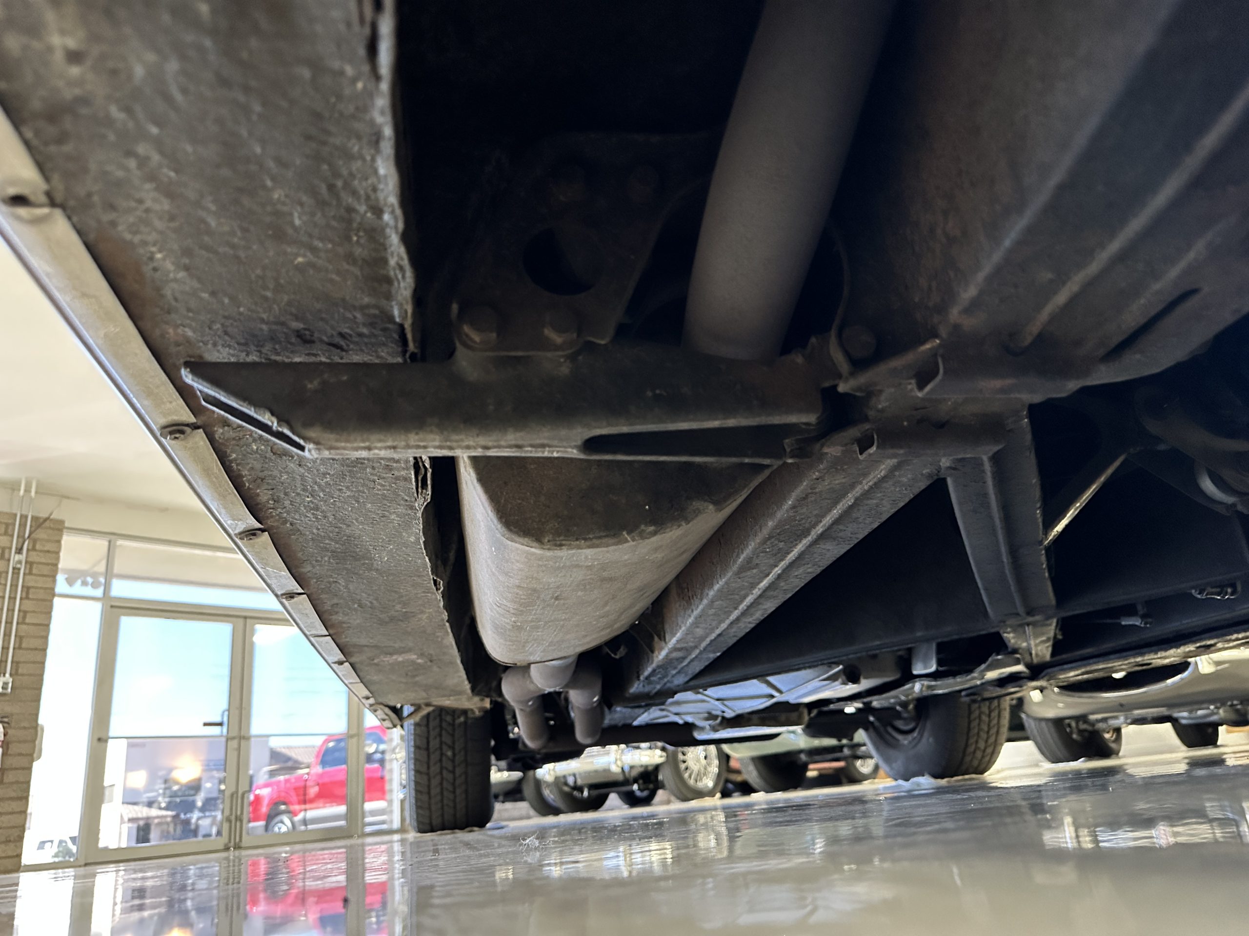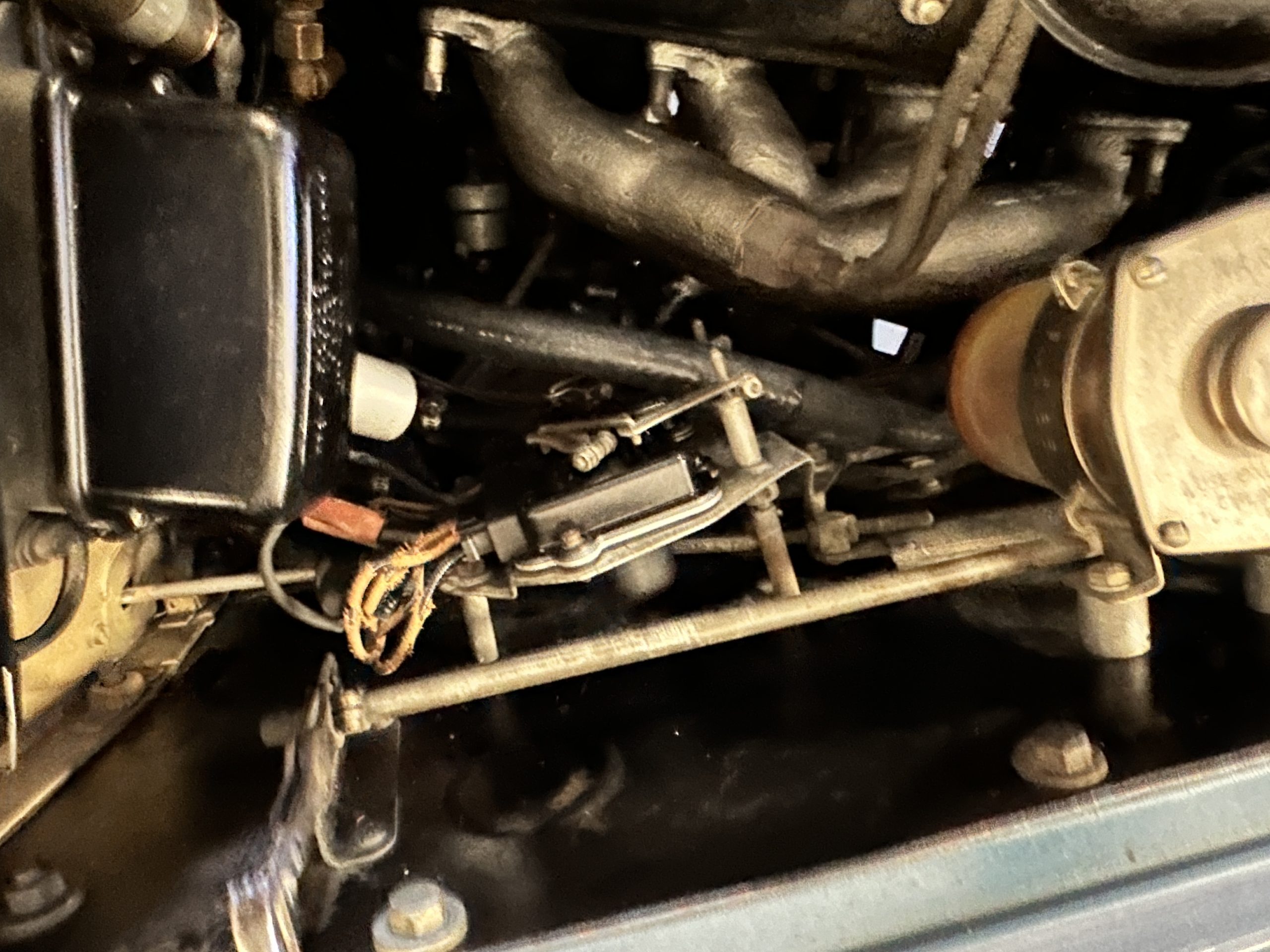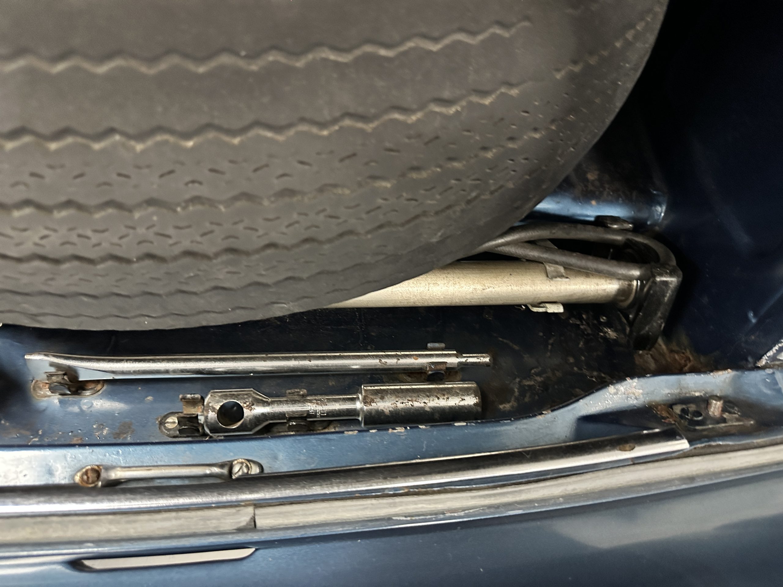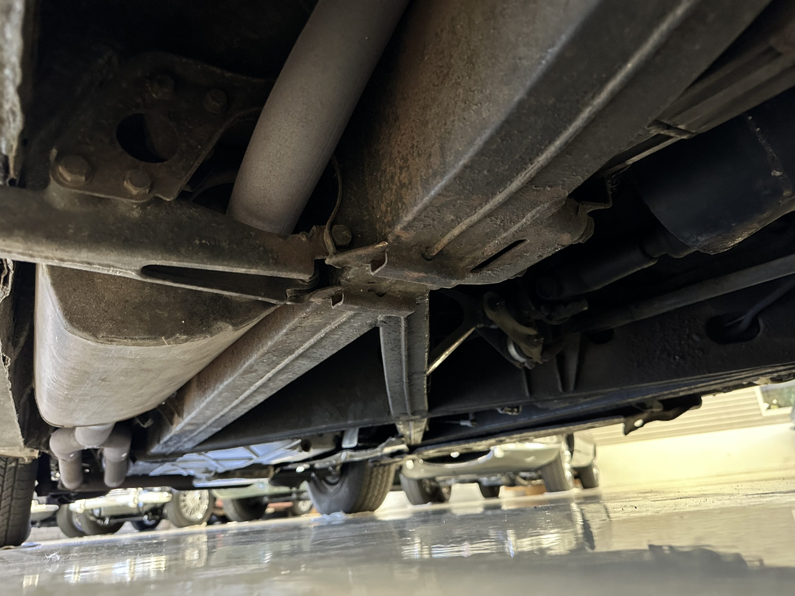 The livery was a special order “Special Blue” (Code 9500564) which is a steel blue metallic. The paint is in overall very good original condition and has beautiful shine and luster. There are some areas of fine lacquer crazing, but overall, it presents beautifully. The Special Blue is complimented by tan coachstripes. The chrome and stainless-steel trim are in overall nice condition. Mounted on the front valance are the normal dual fog lights along with a rare Rotaflare swiveling driving lamp. The Coker Classic wide white wall radials make this a joy to drive and look terrific.