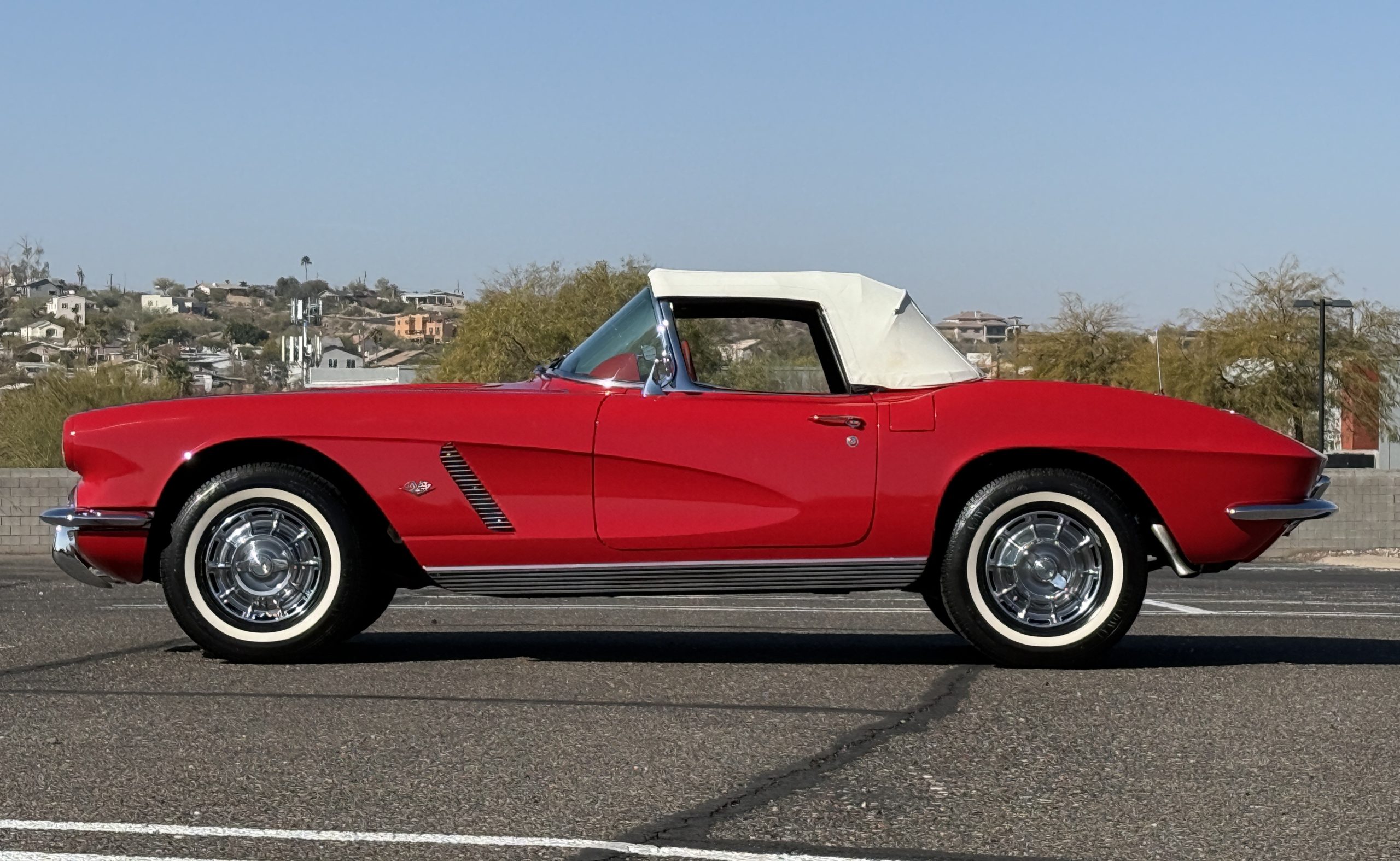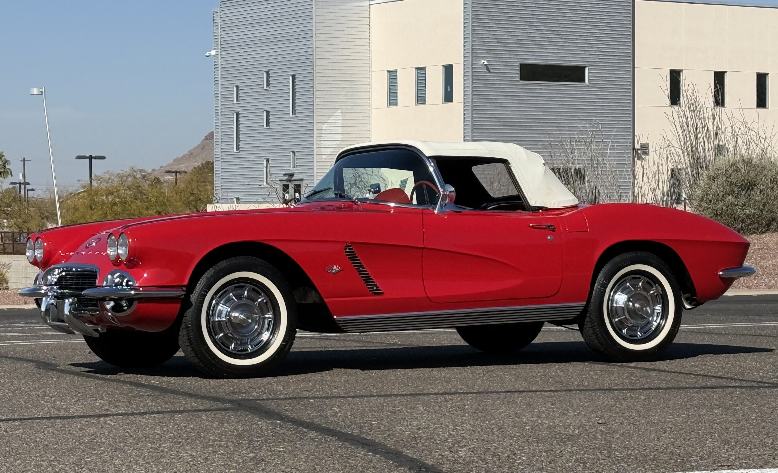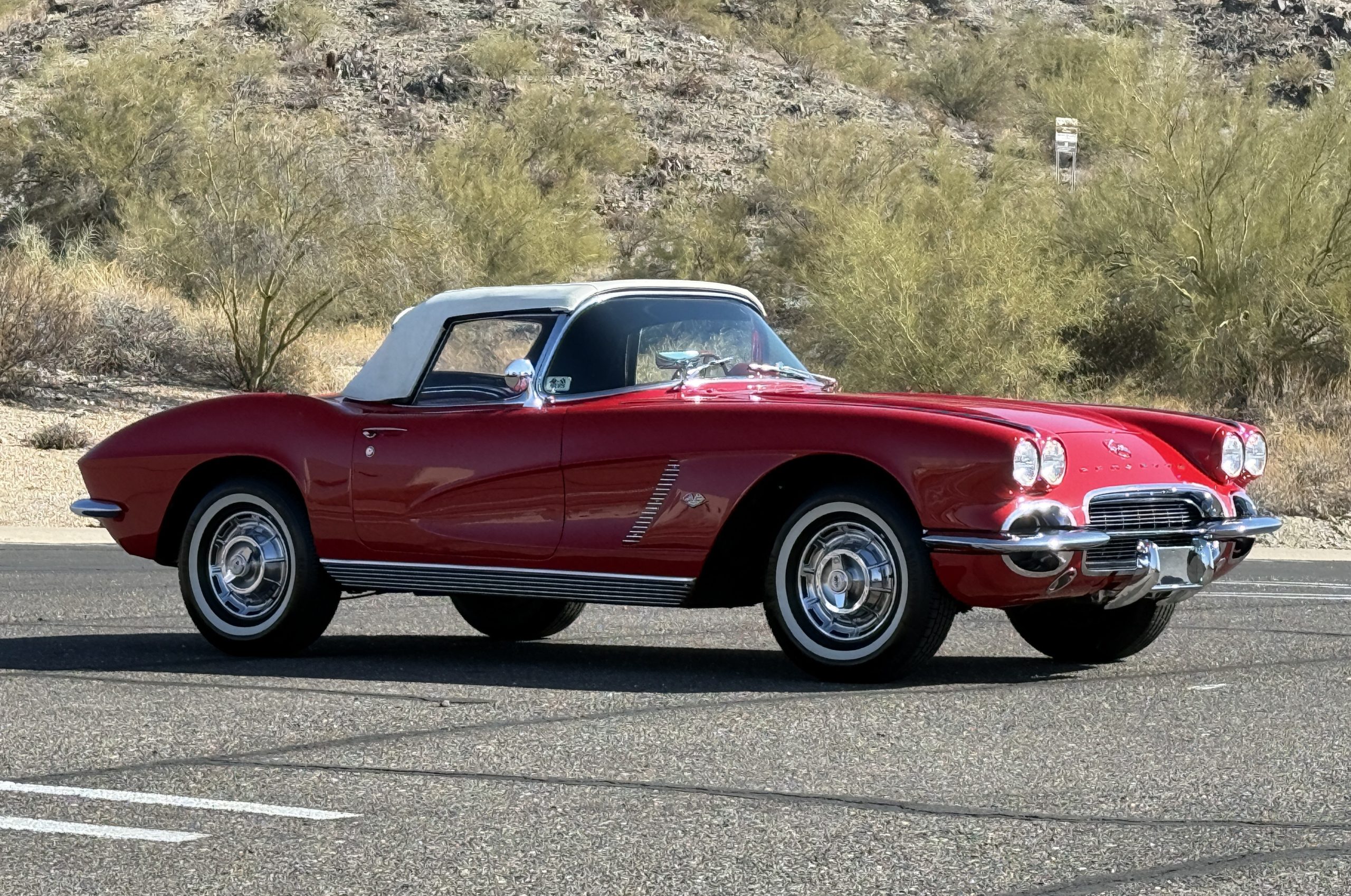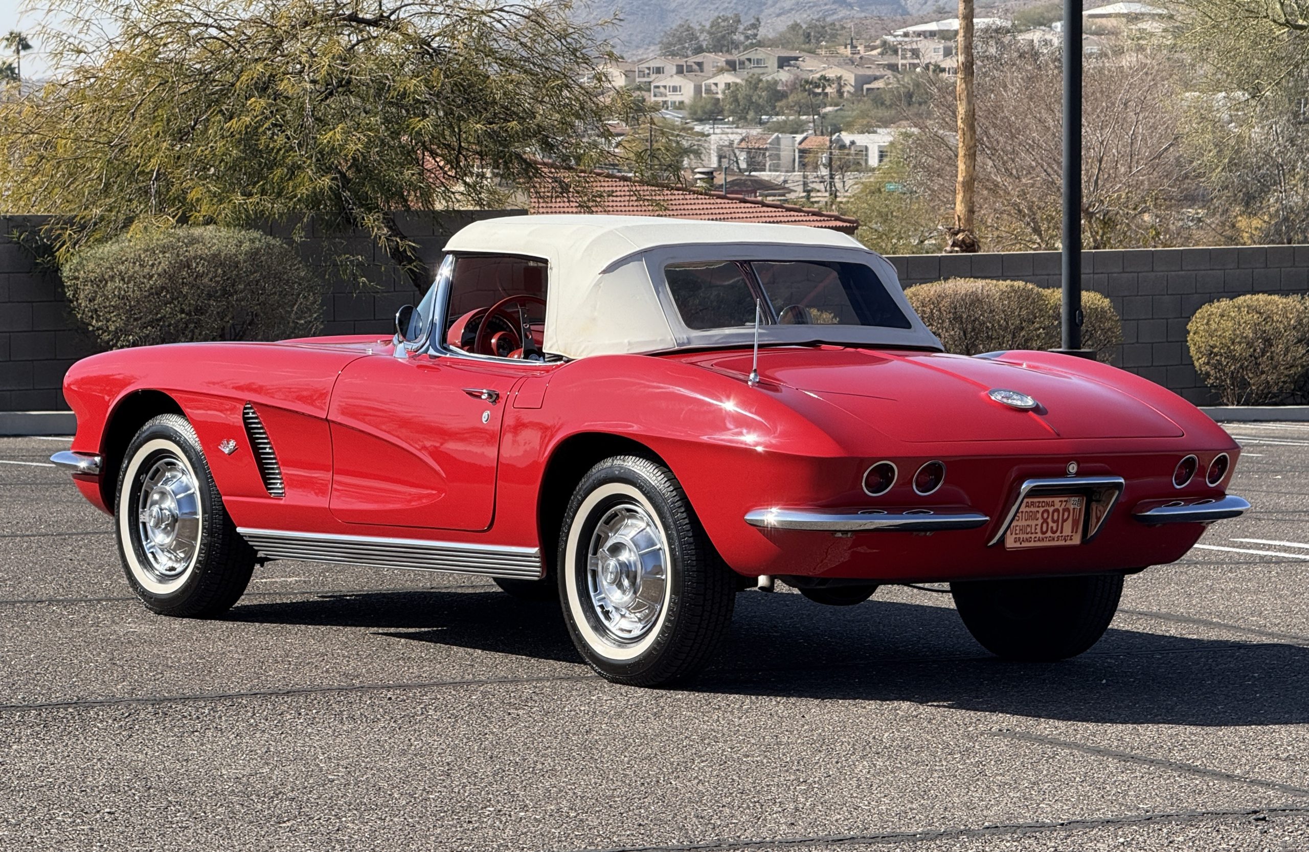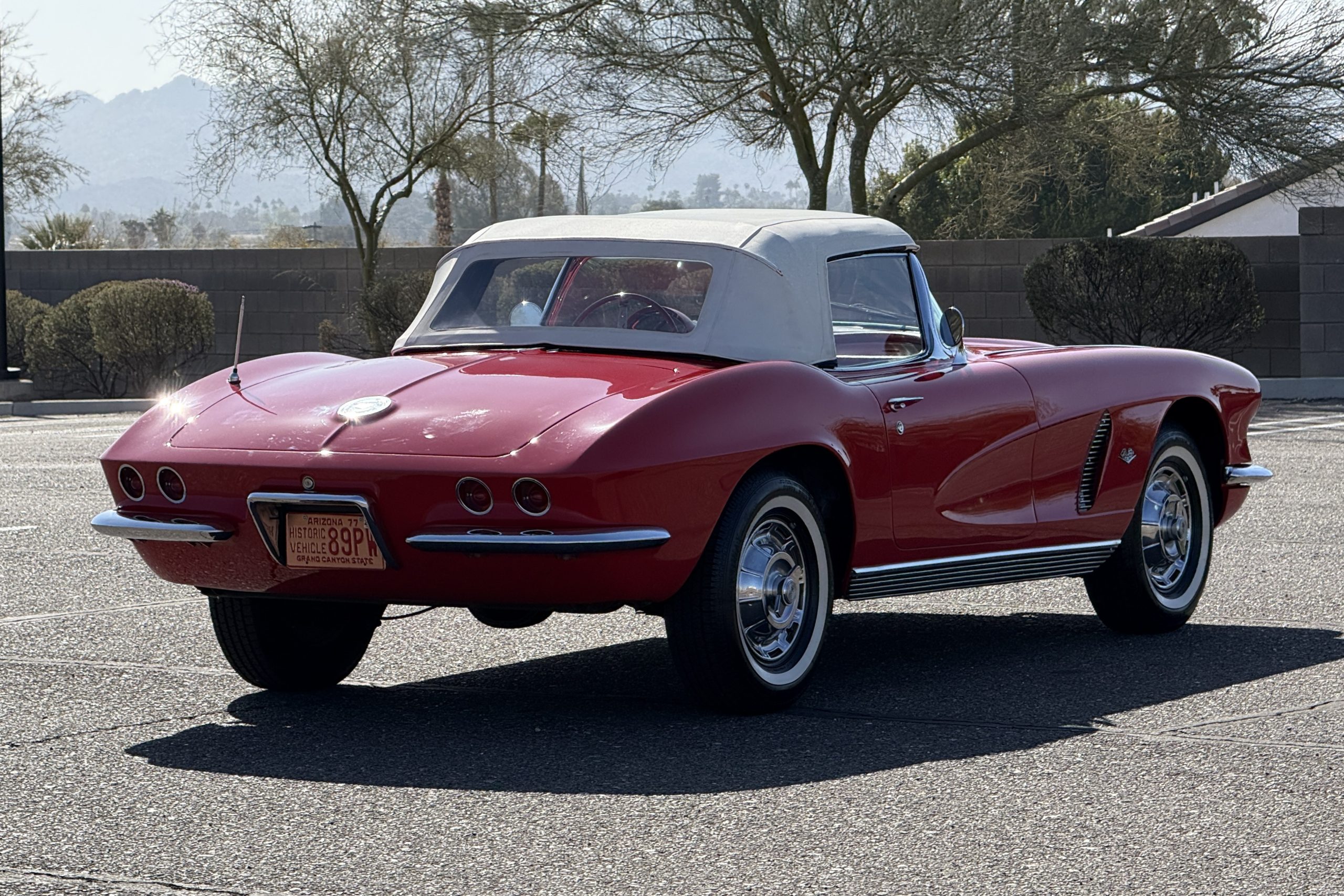 This 1962 Chevrolet Corvette convertible was sold new by Ross Chevrolet in Saint Petersburg, Florida and moved to Canada in the early 1980s. It was offered on BaT in 2019 and eventually made its way to Arizona. The car is finished in red with a white soft top and a red interior. Power comes from a 327ci V8 mated to a Muncie four-speed manual gearbox and a 3.36:1 Positraction rear end. The owner acquired the car in 2020 and it is now offered on dealer consignment with the owner’s manual, service records, and a clean Arizona title.