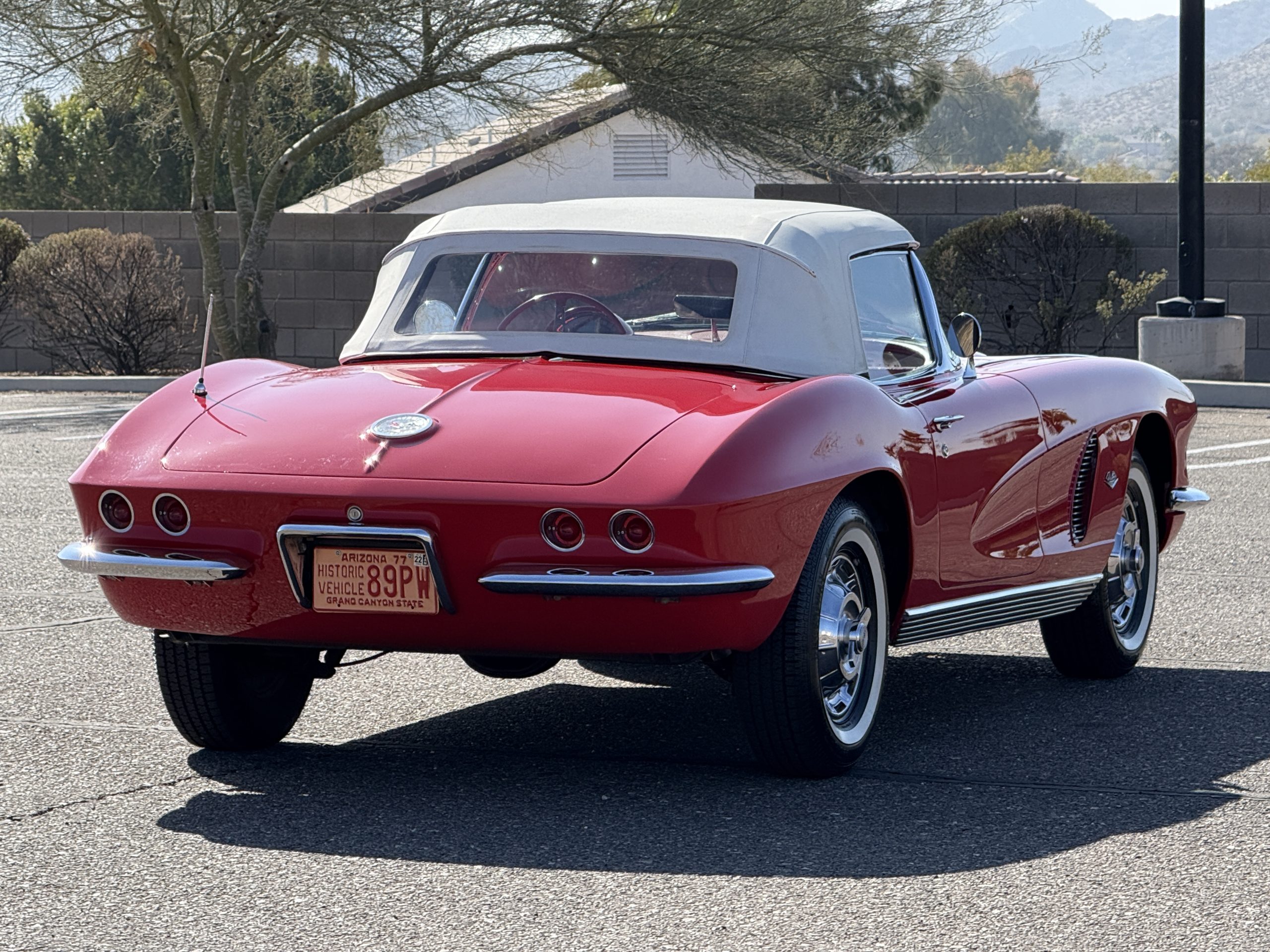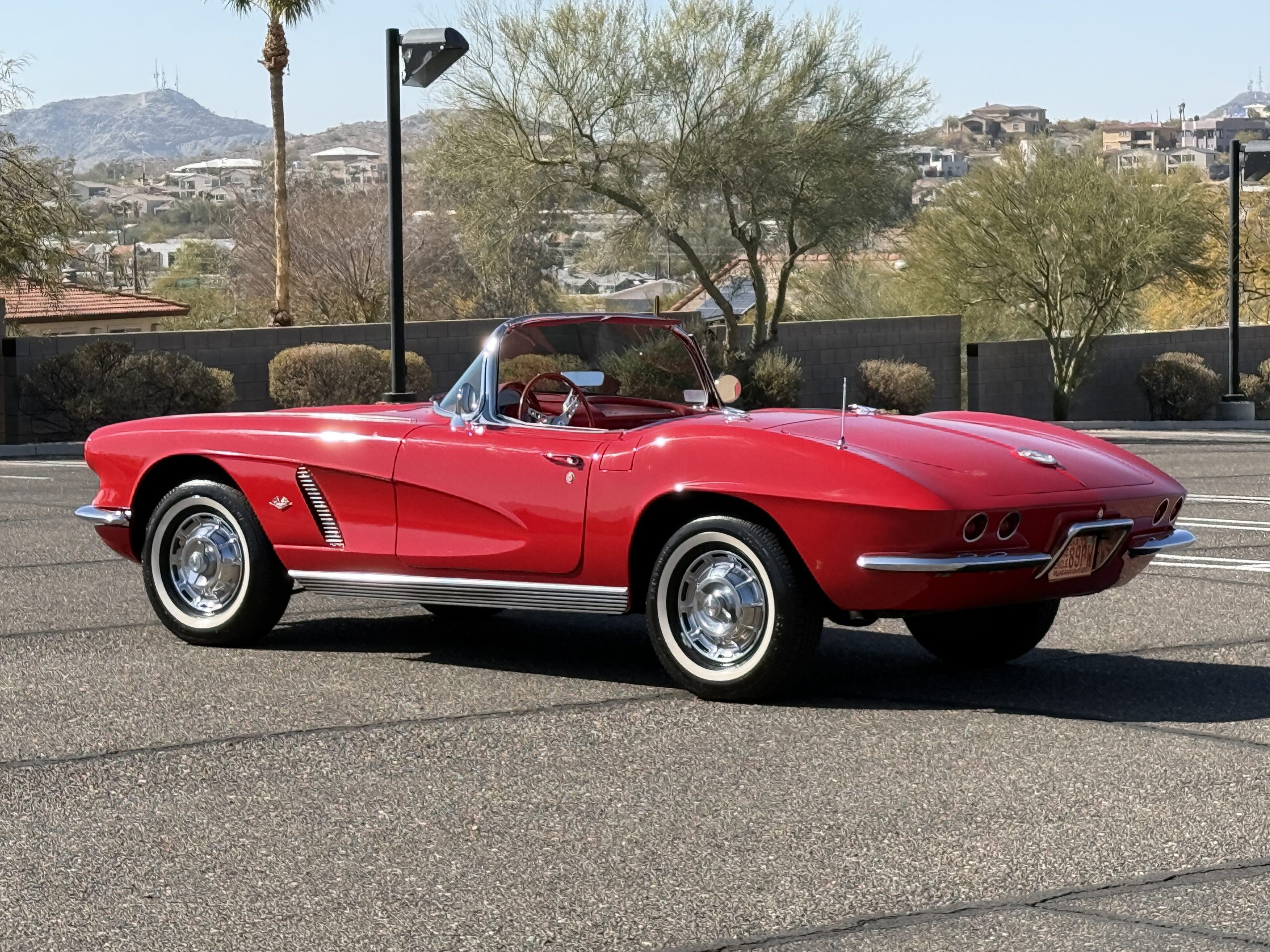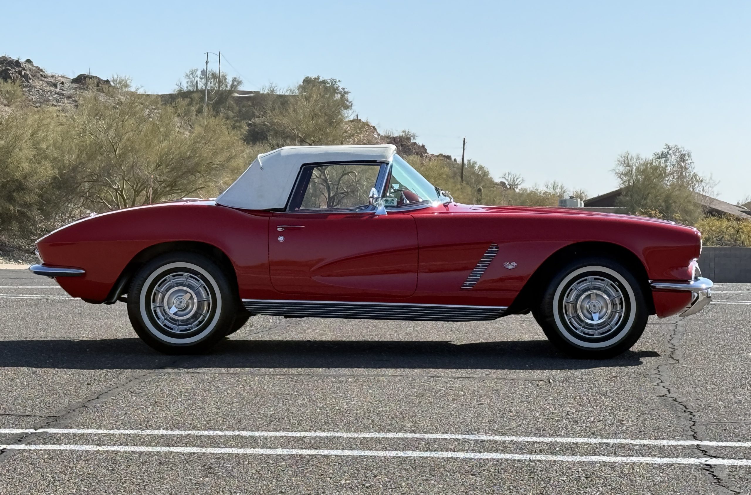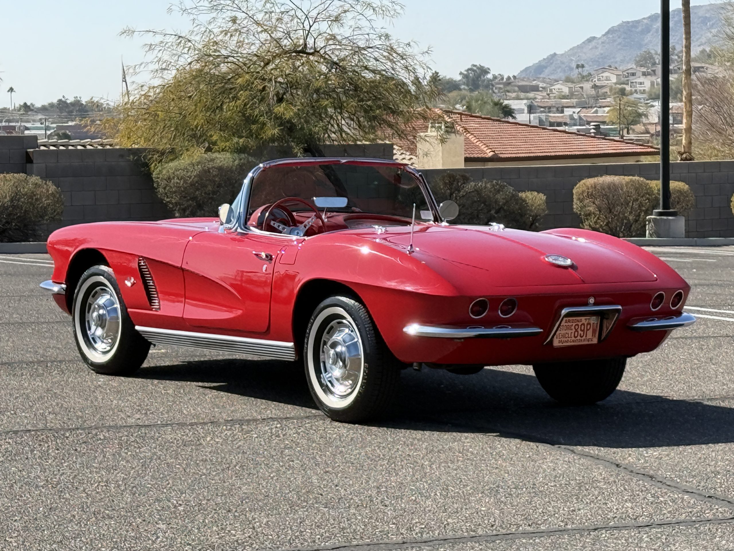 This 1962 Chevrolet Corvette convertible was sold new by Ross Chevrolet in Saint Petersburg, Florida and moved to Canada in the early 1980s. It was offered on BaT in 2019 and eventually made its way to Arizona. The car is finished in red with a white soft top and a red interior. Power comes from a 327ci V8 mated to a Muncie four-speed manual gearbox and a 3.36:1 Positraction rear end. The owner acquired the car in 2020 and it is now offered on dealer consignment with the owner’s manual, service records, and a clean Arizona title.