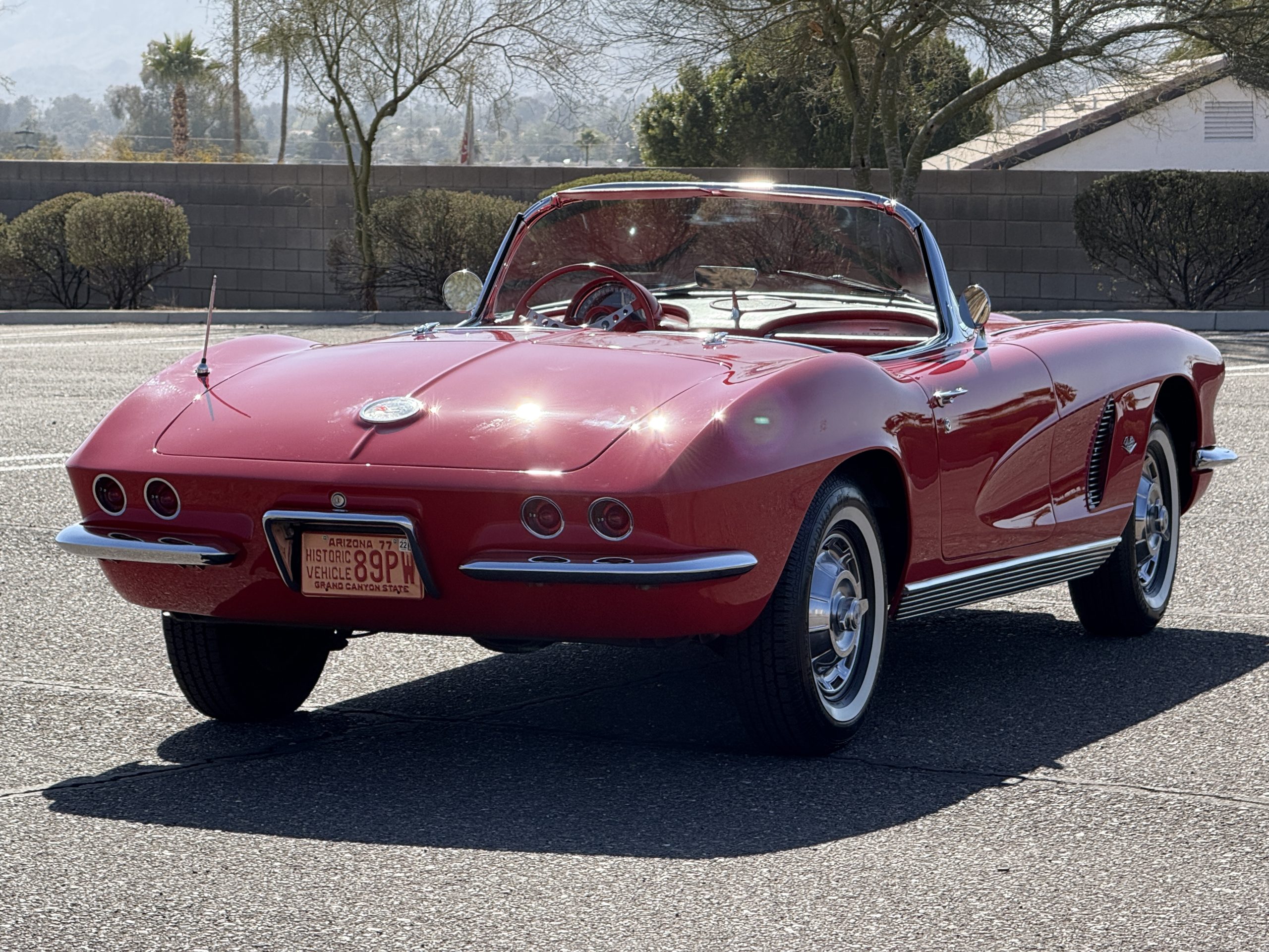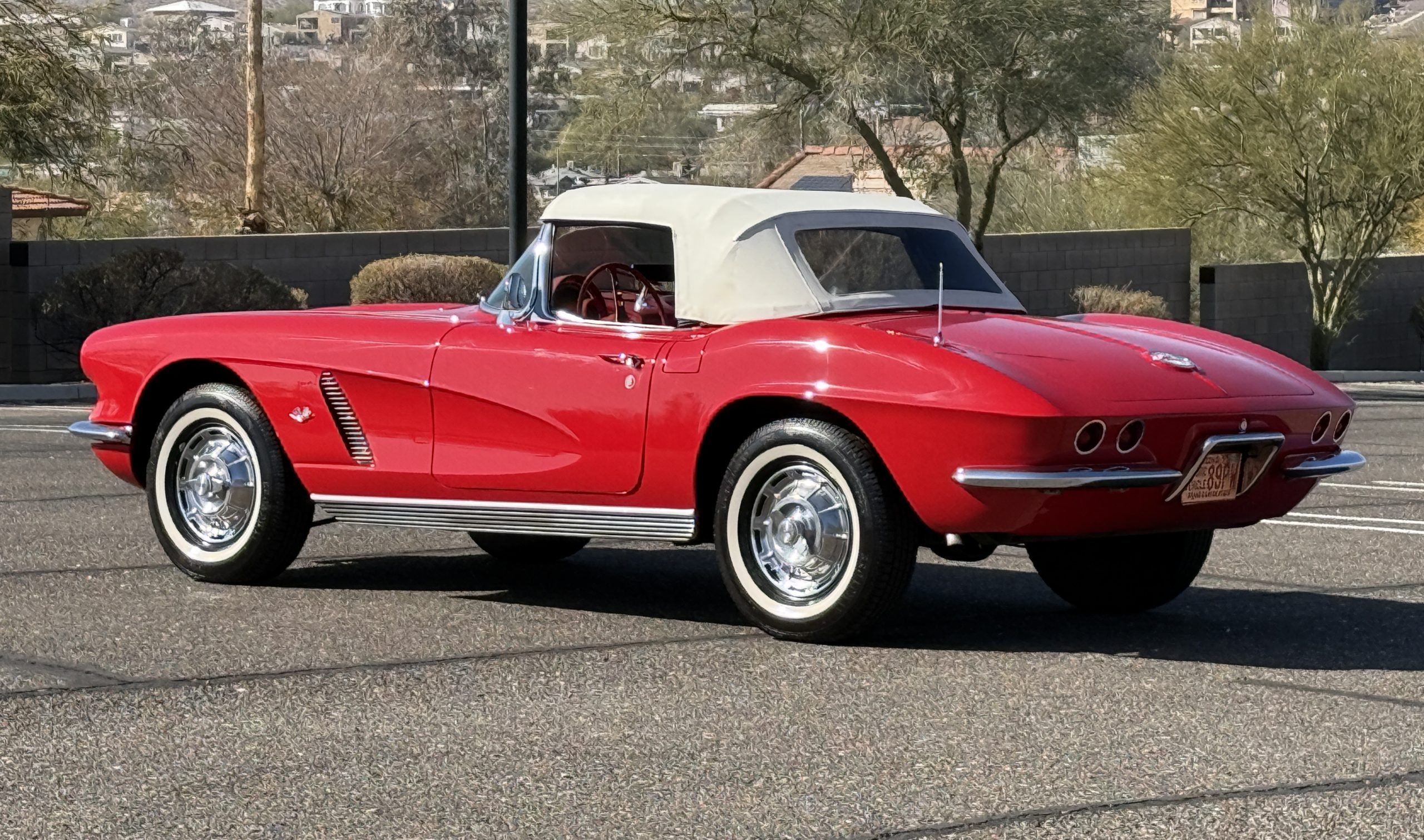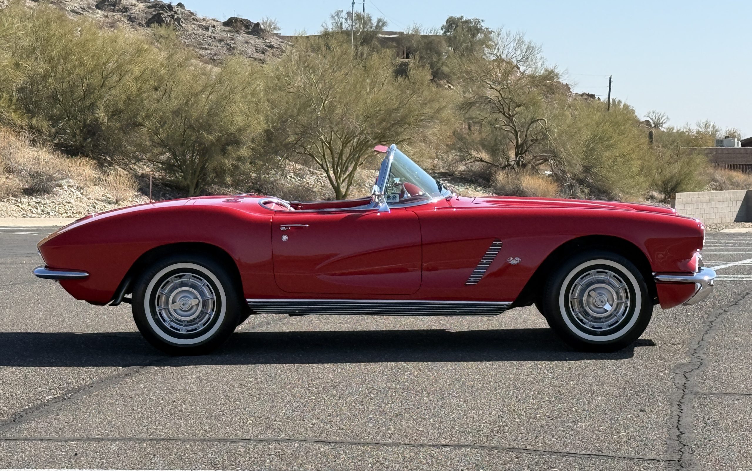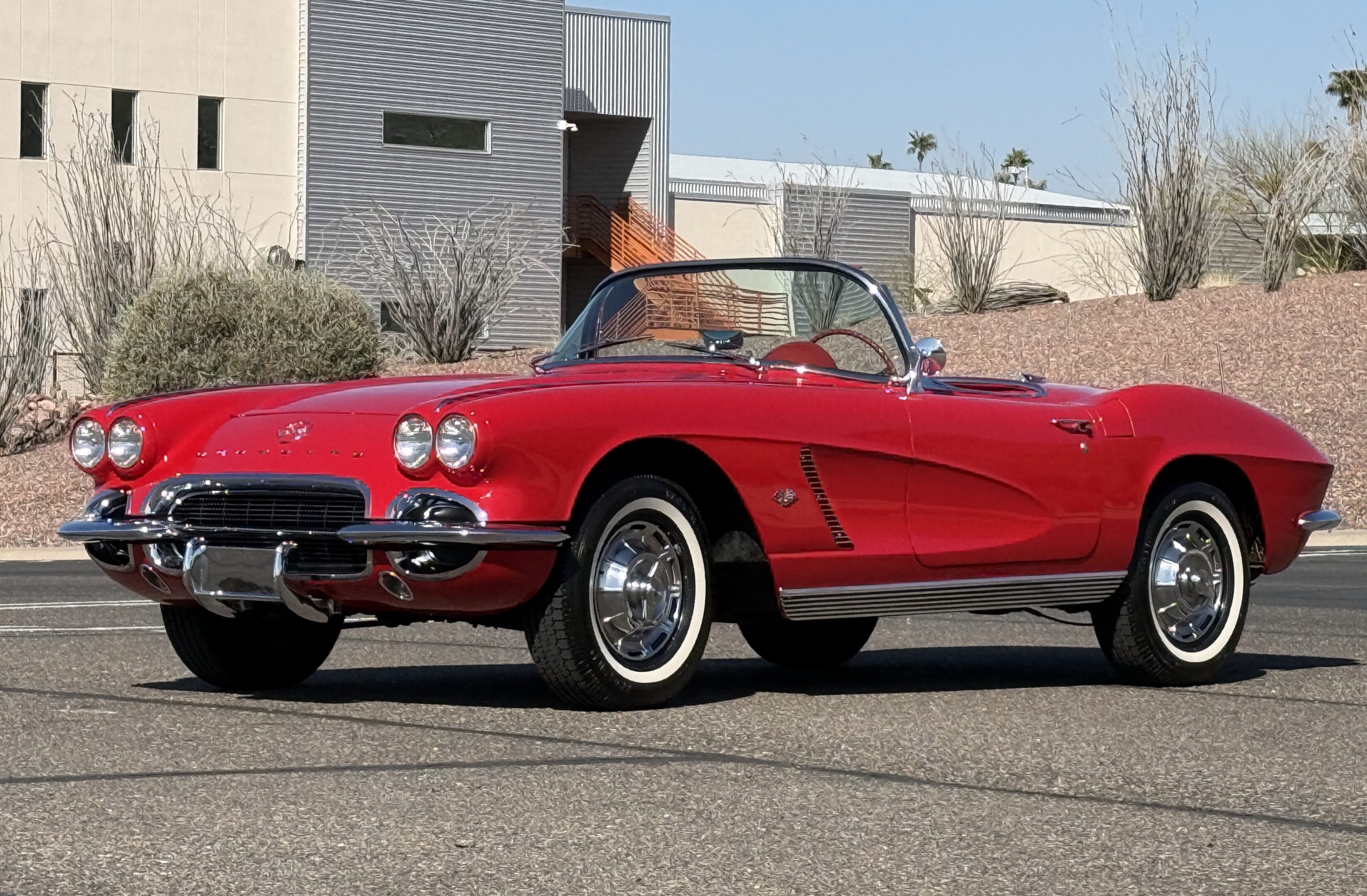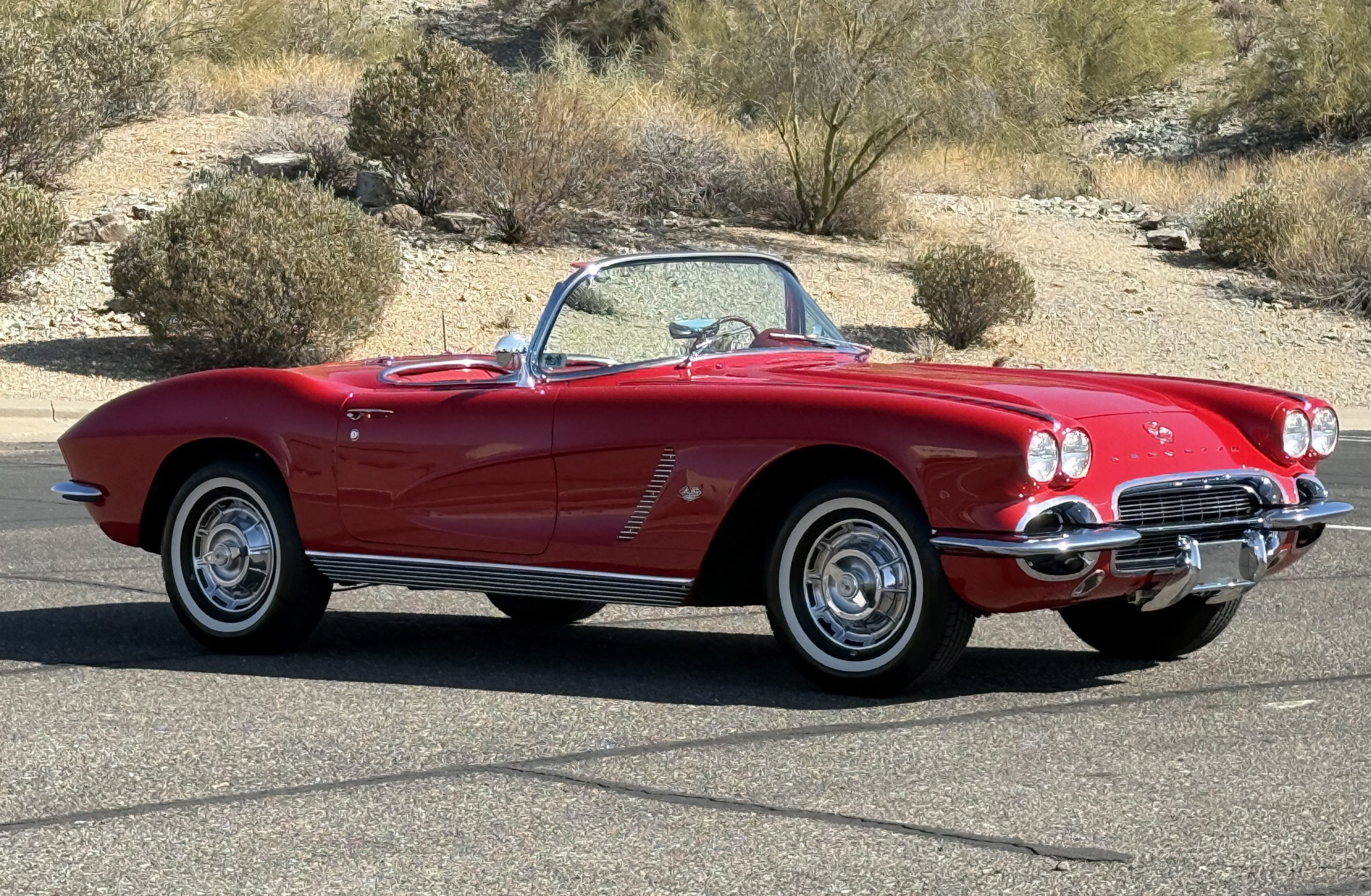 This 1962 Chevrolet Corvette convertible was sold new by Ross Chevrolet in Saint Petersburg, Florida and moved to Canada in the early 1980s. It was offered on BaT in 2019 and eventually made its way to Arizona. The car is finished in red with a white soft top and a red interior. Power comes from a 327ci V8 mated to a Muncie four-speed manual gearbox and a 3.36:1 Positraction rear end. The owner acquired the car in 2020 and it is now offered on dealer consignment with the owner’s manual, service records, and a clean Arizona title.