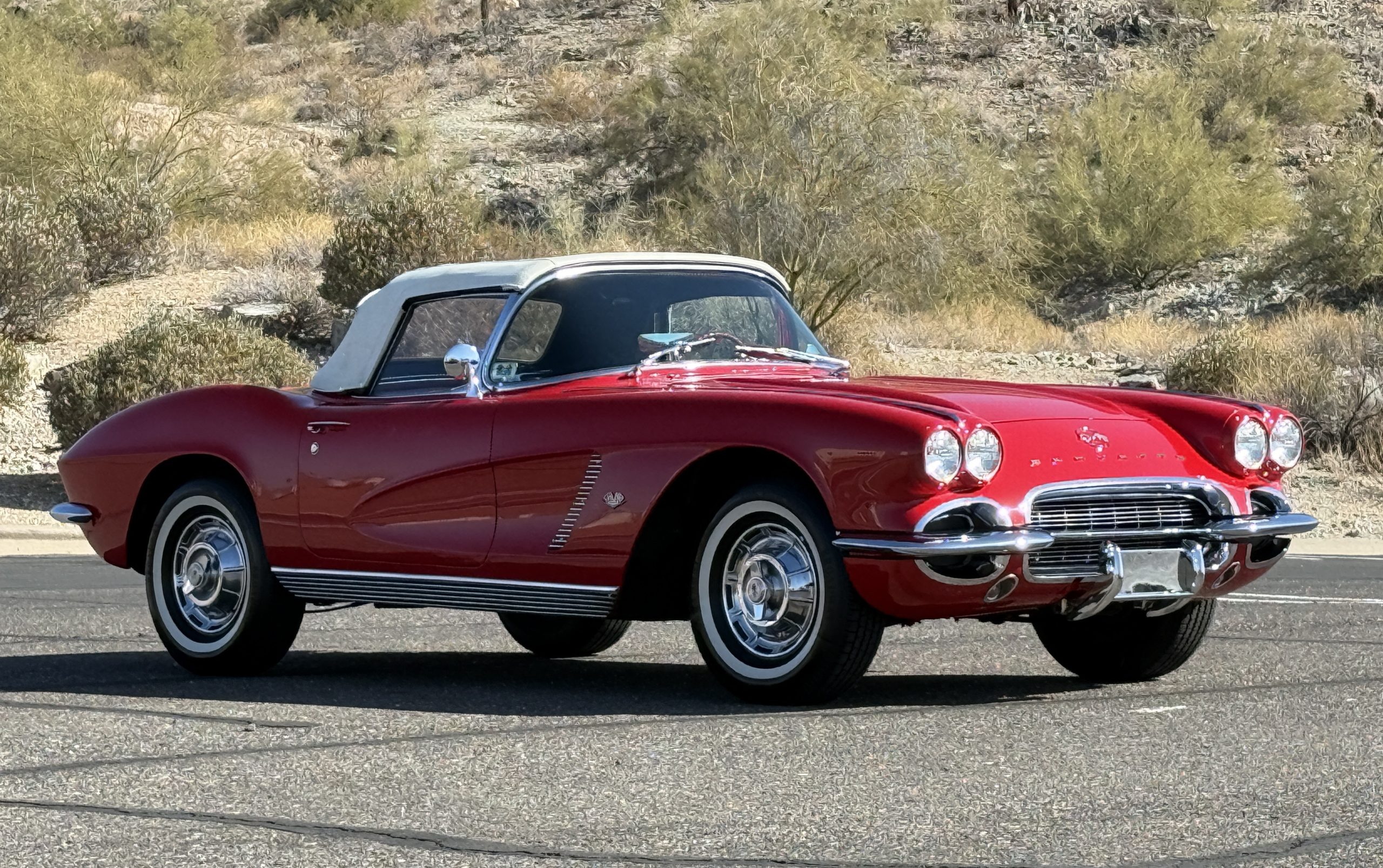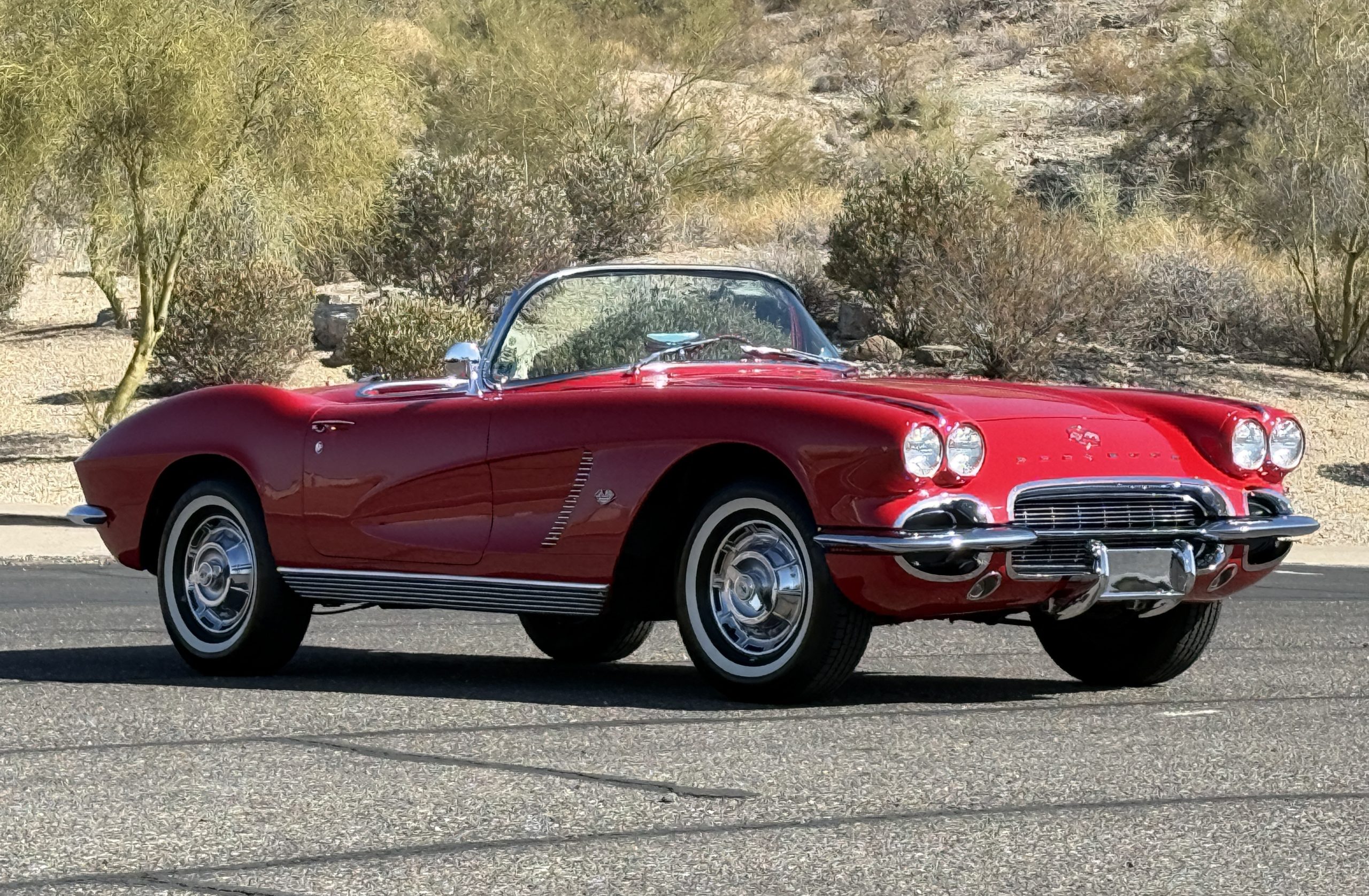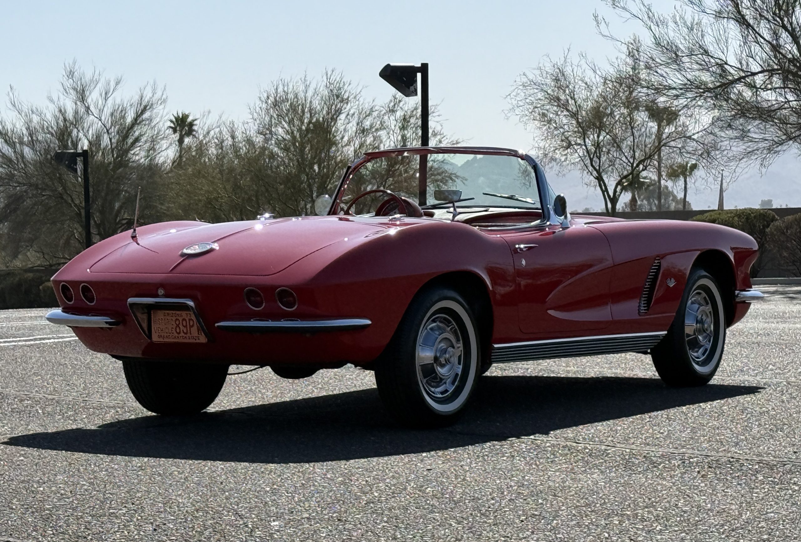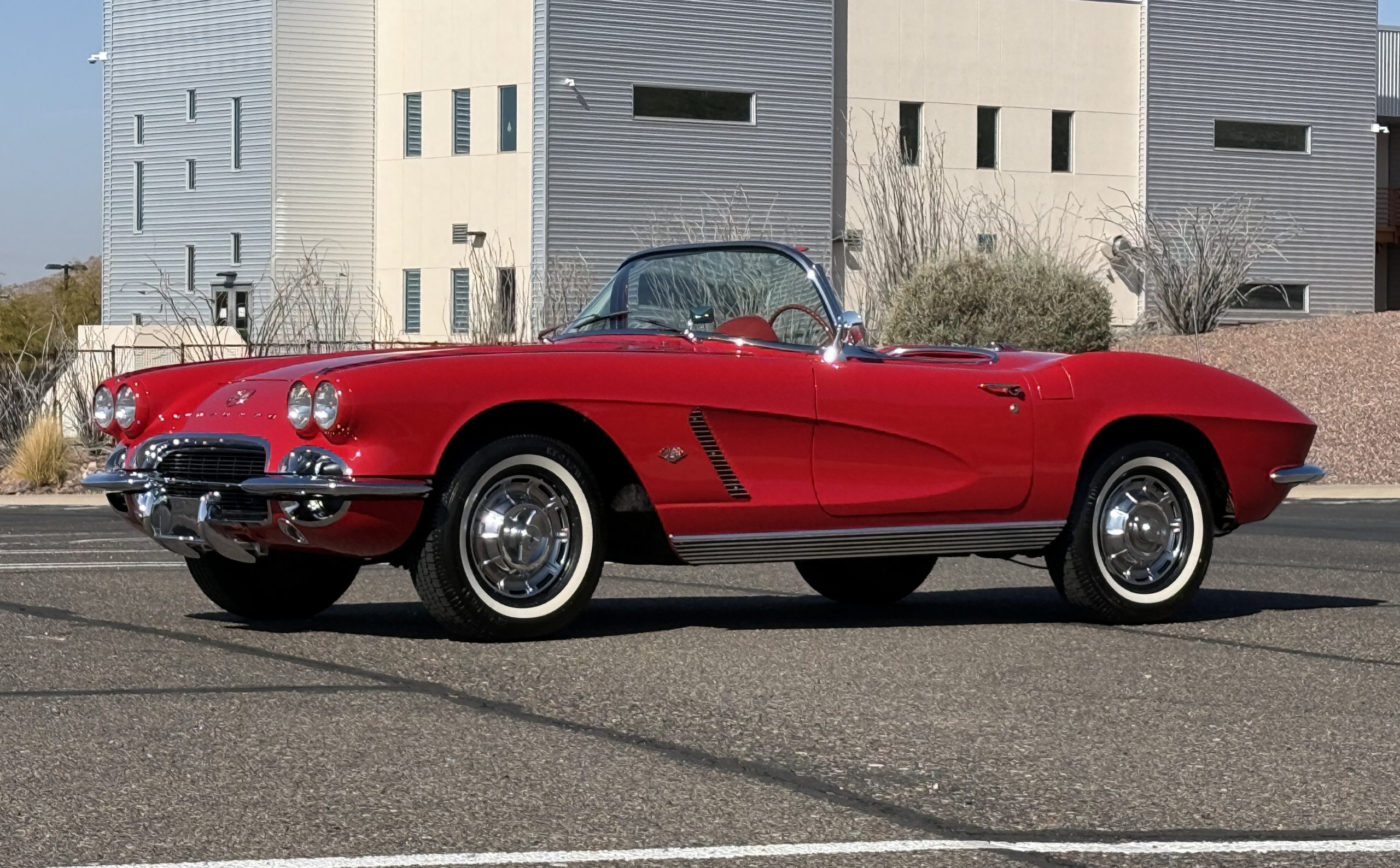 This 1962 Chevrolet Corvette convertible was sold new by Ross Chevrolet in Saint Petersburg, Florida and moved to Canada in the early 1980s. It was offered on BaT in 2019 and eventually made its way to Arizona. The car is finished in red with a white soft top and a red interior. Power comes from a 327ci V8 mated to a Muncie four-speed manual gearbox and a 3.36:1 Positraction rear end. The owner acquired the car in 2020 and it is now offered on dealer consignment with the owner’s manual, service records, and a clean Arizona title.