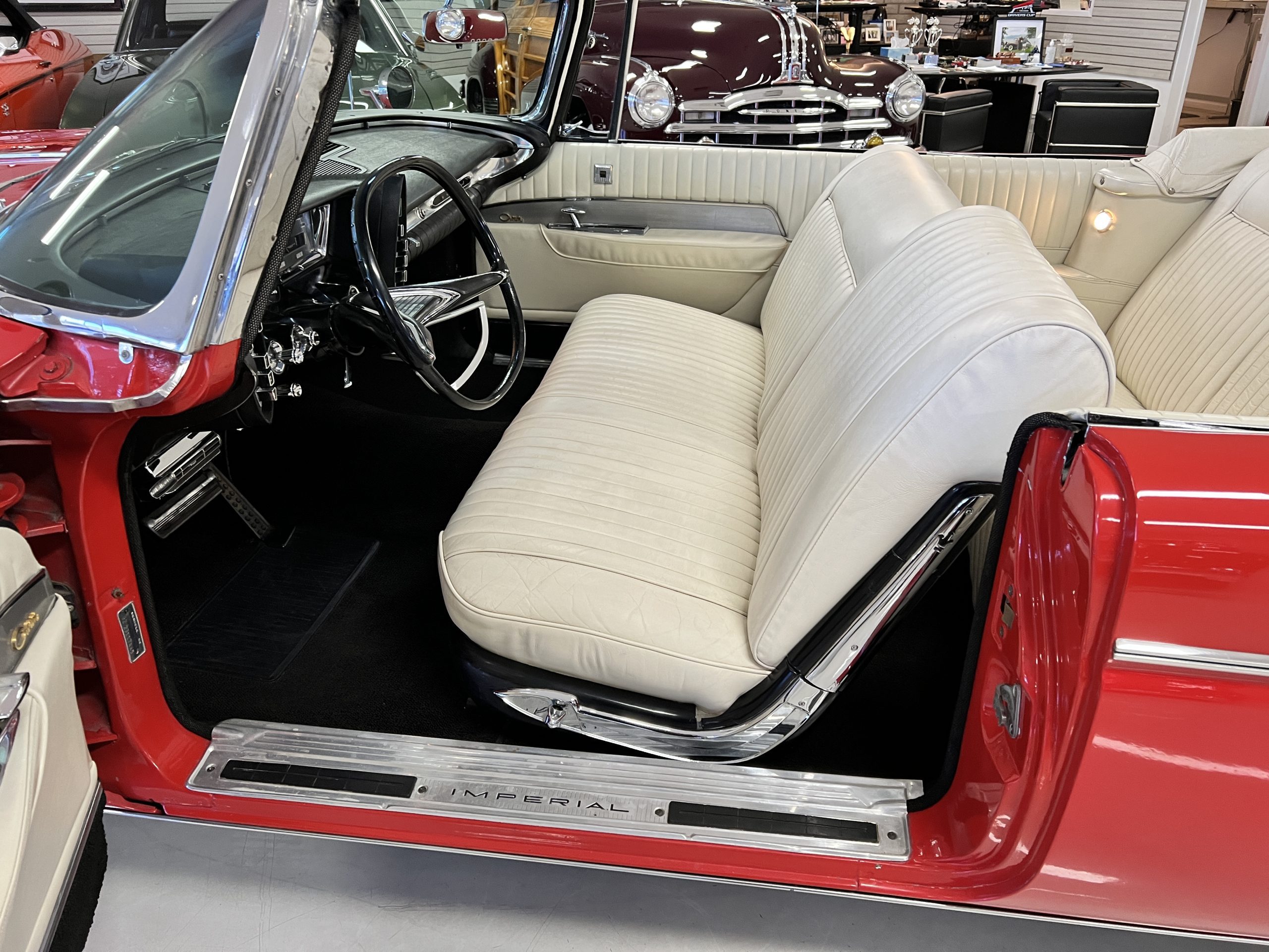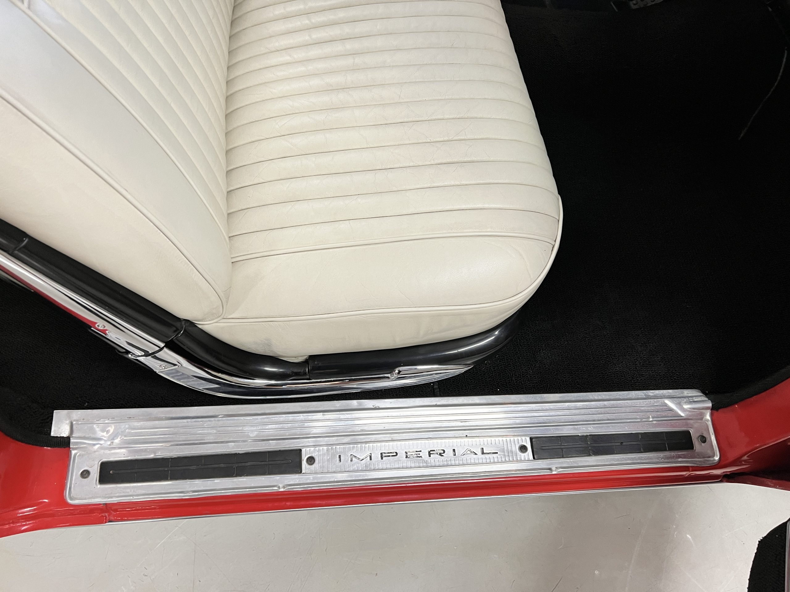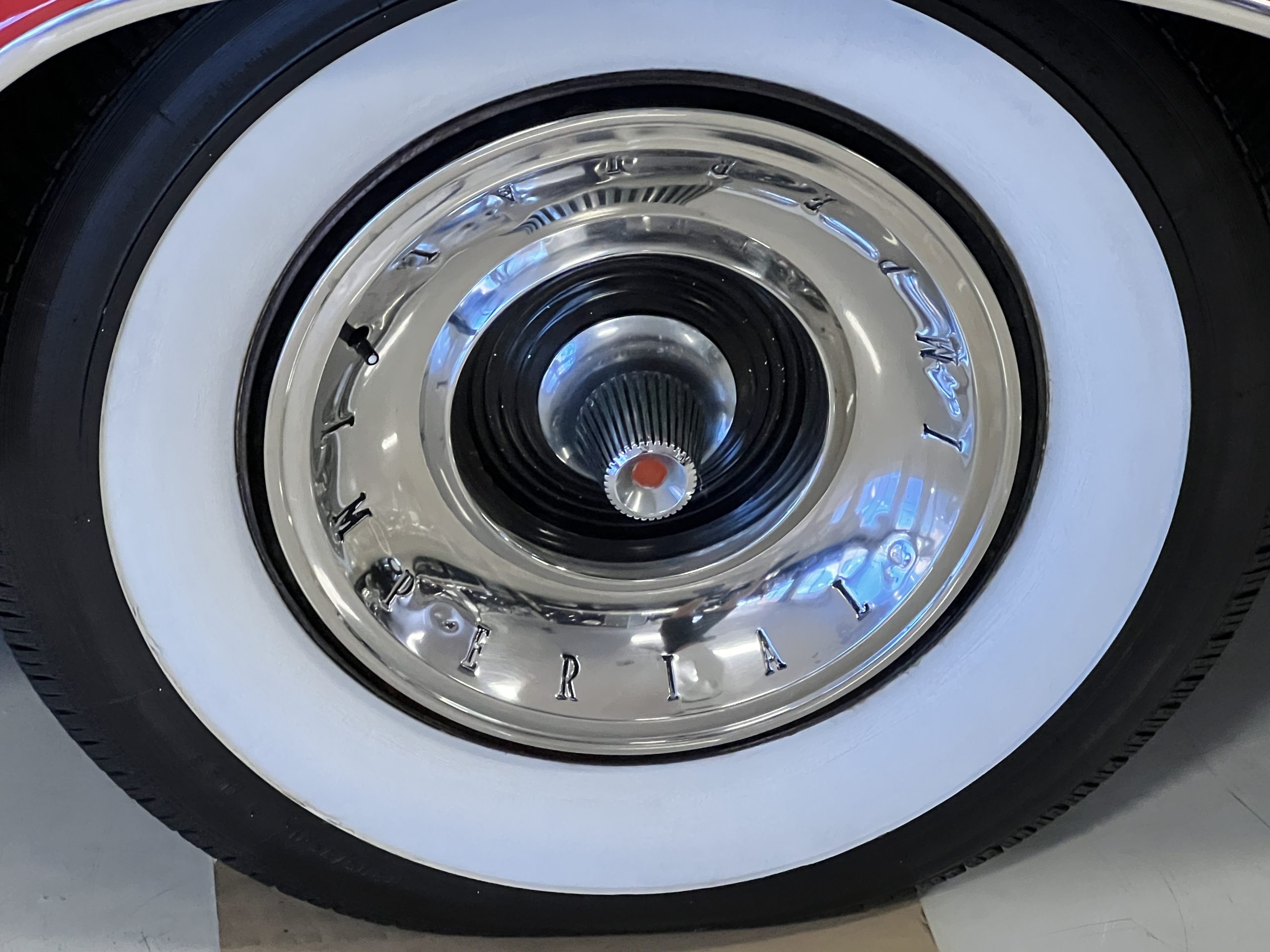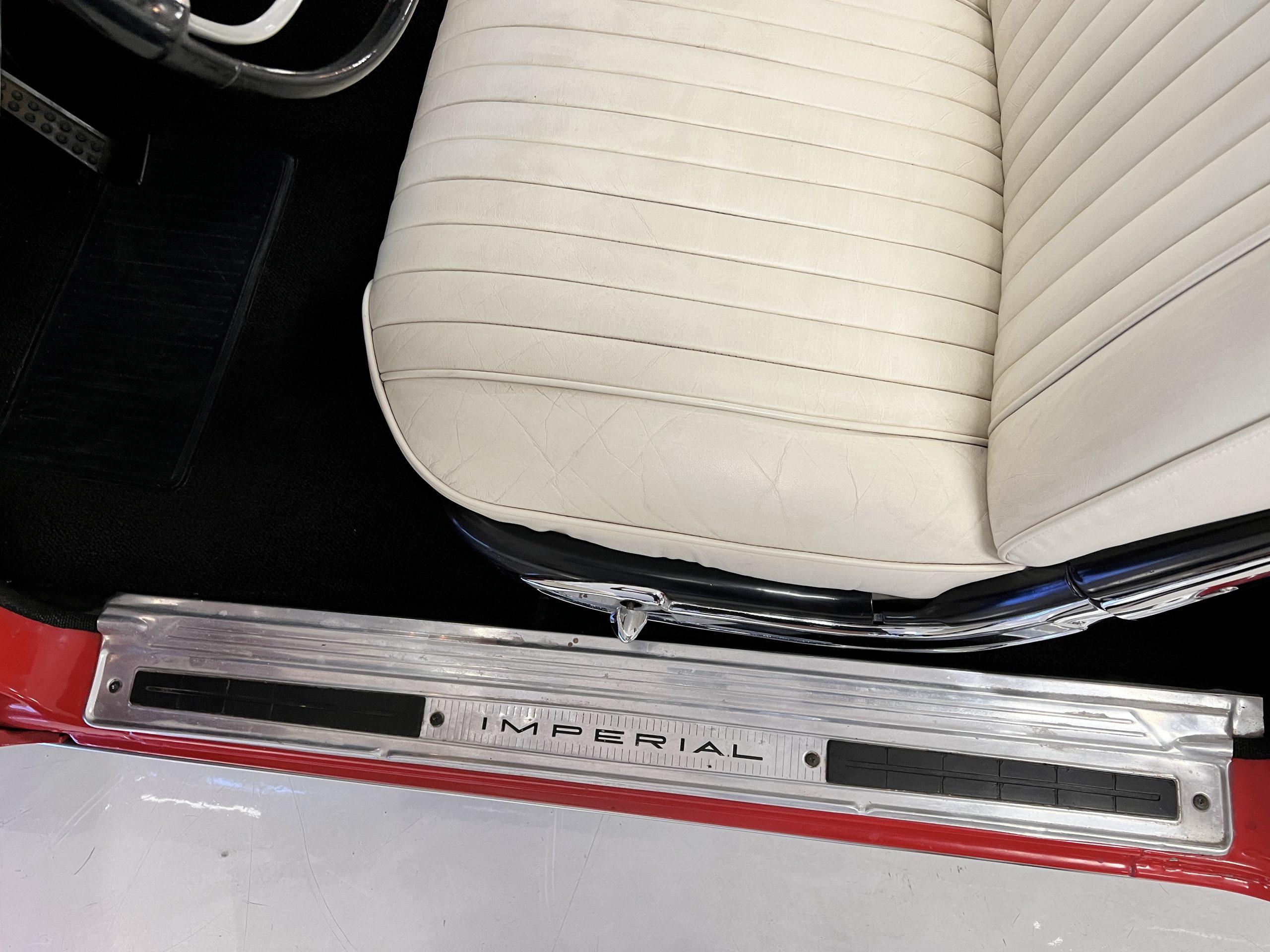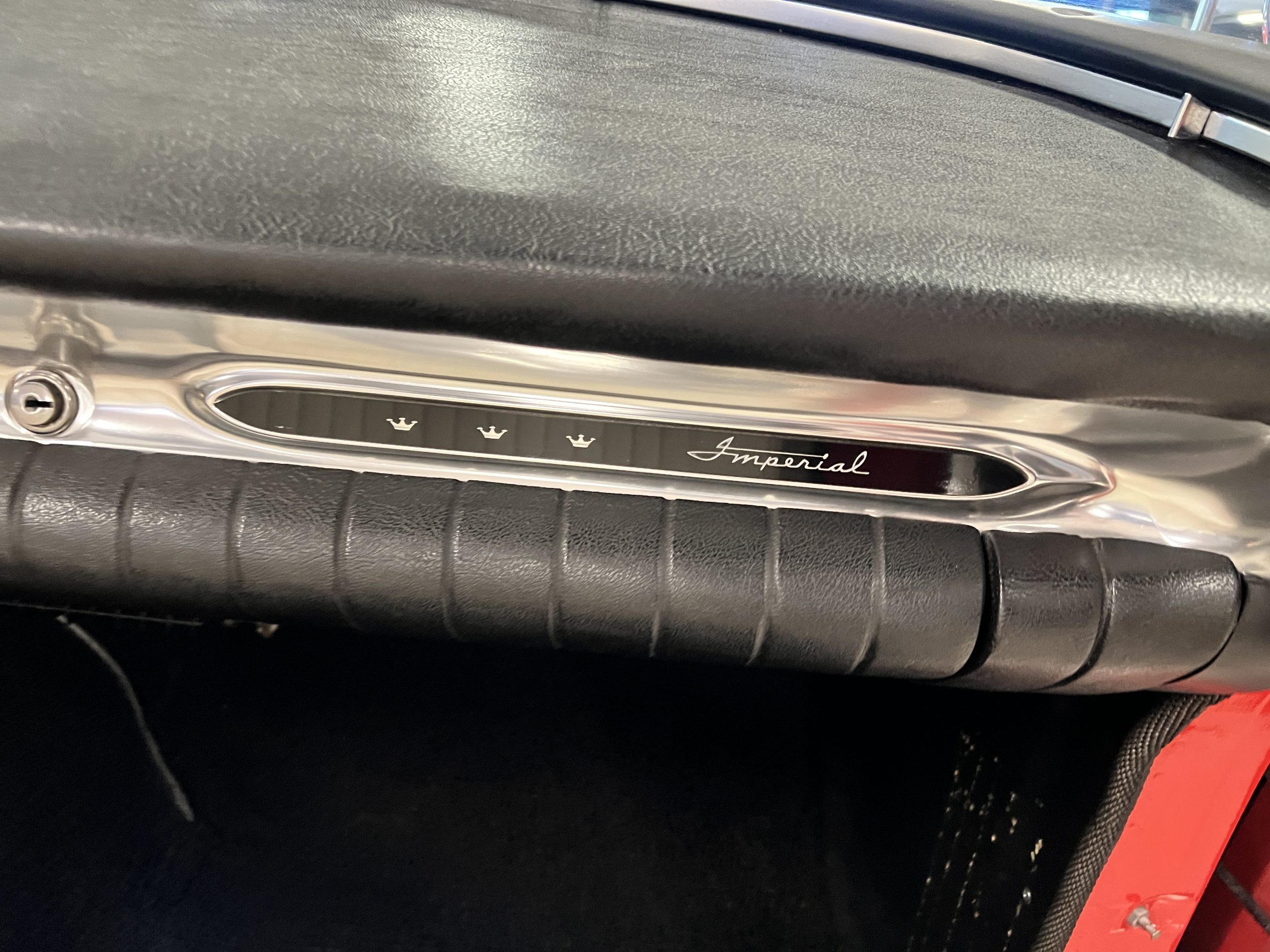 This Imperial features Festival Red (Paint Code A-1264R) livery with its correct white vinyl power convertible top. The paint is in overall excellent touring and show condition, with several small touched up chips from normal use since its restoration. The chrome and stainless are in overall excellent condition with a couple areas with small imperfections. The Imperial wheel covers are in very nice condition and the Coker wide white walled radials look perfect. Overall, the exterior is stunning and while not perfect, in excellent touring and show condition for most all regional and local shows and events.